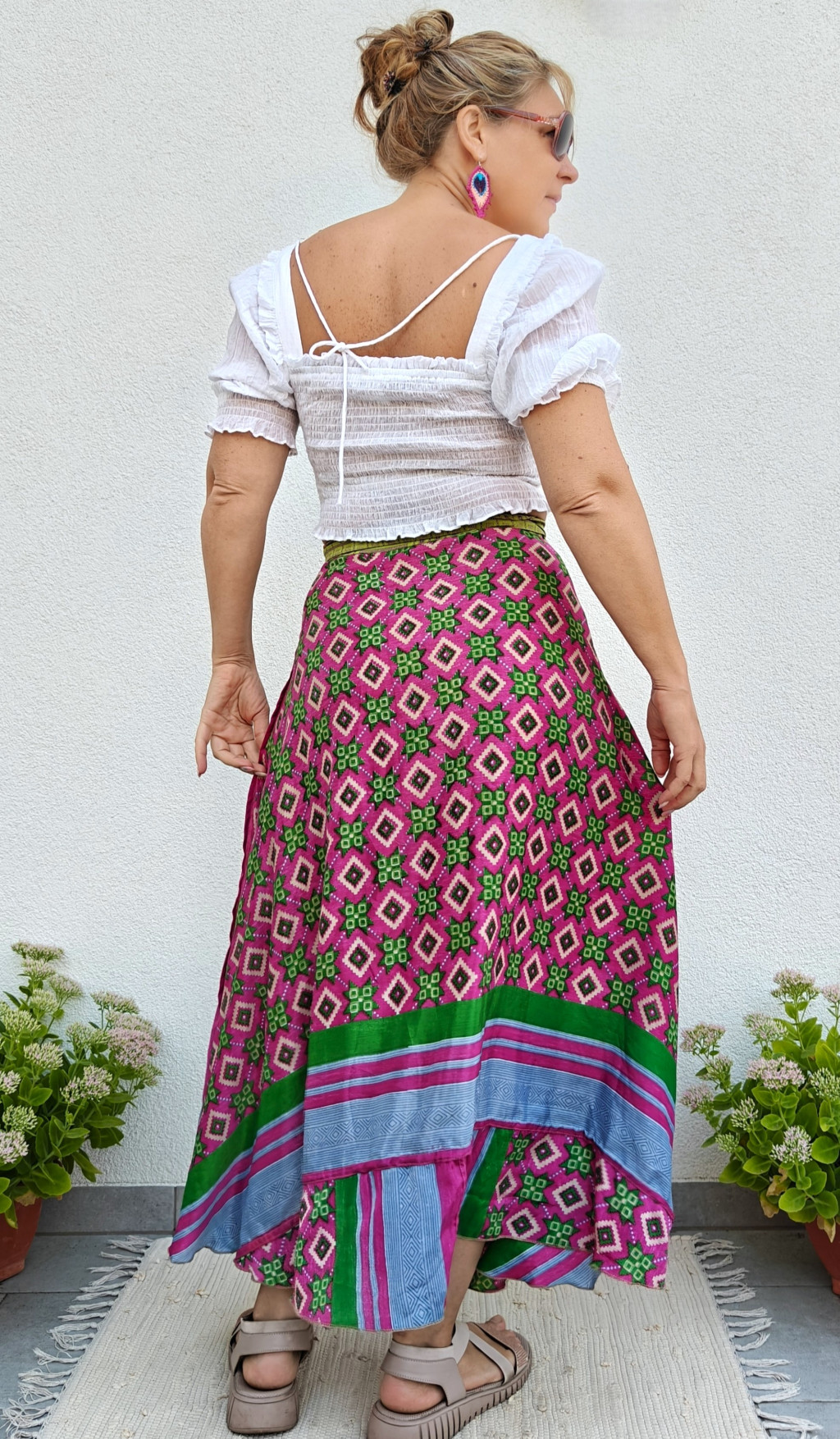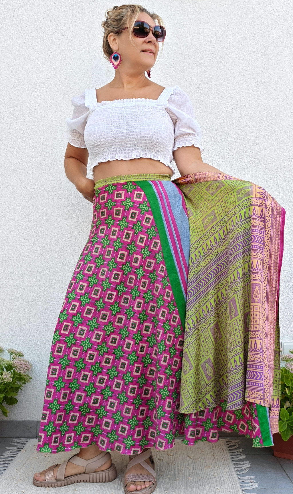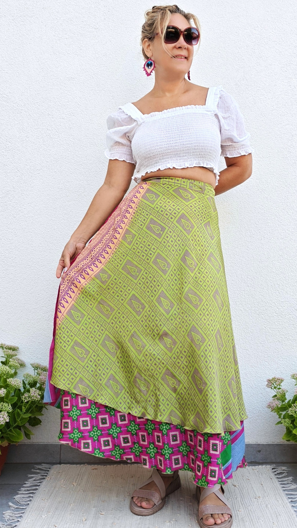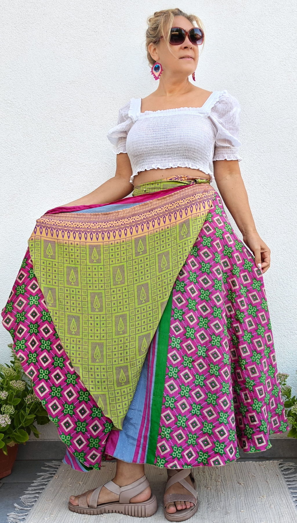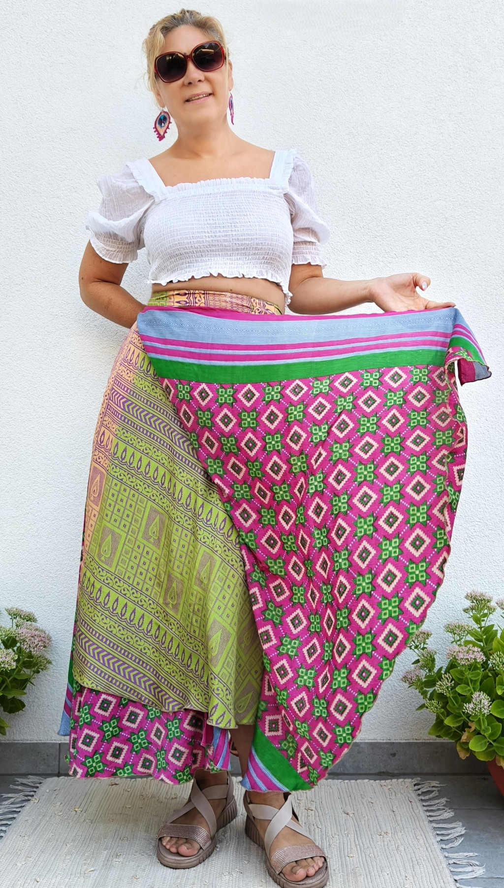 Lapszoknyáink újrahasznosított szárikból készülnek Indiában, egy hosszabb és egy rövidebb anyag derékban összevarrva! Két oldalú, kifordítható, mindkét oldala hordható, sokféleképpen köthető, variálható. Szoknyáinkból nincs két egyforma, mindegyikből csak EGY darab van, ha megtetszik, csapj le rá!