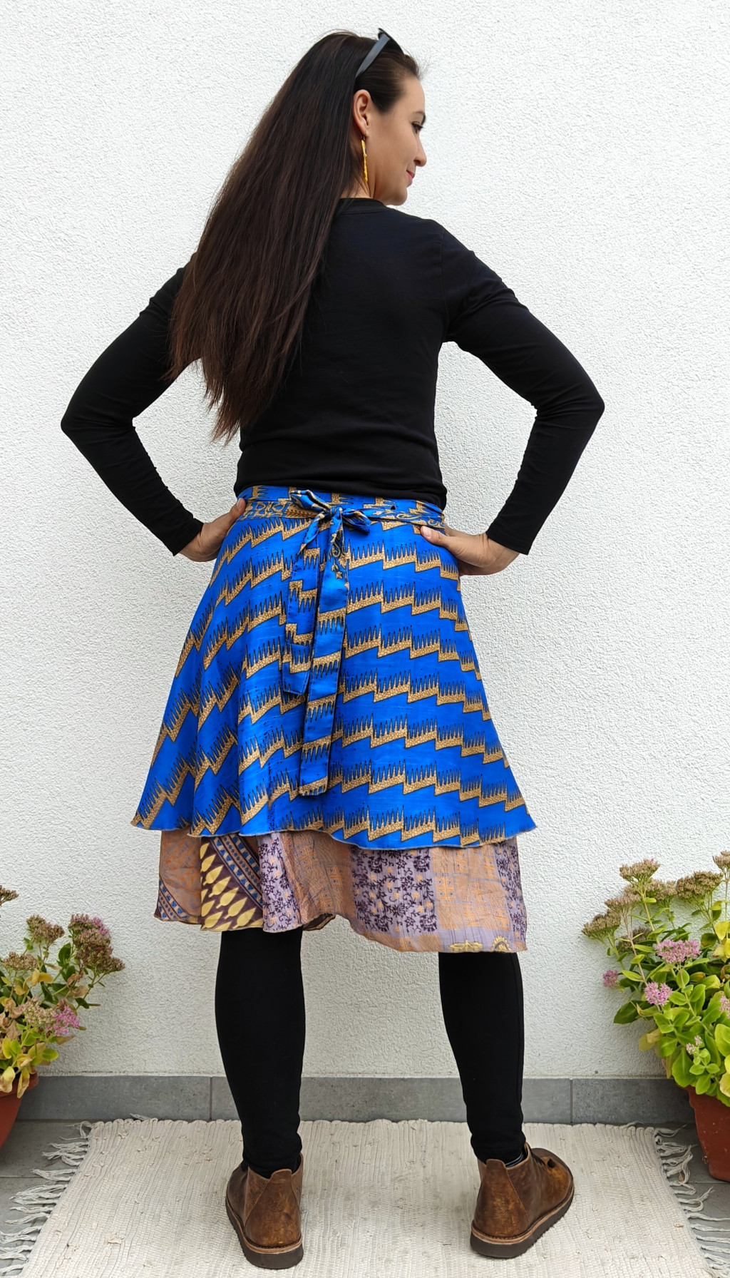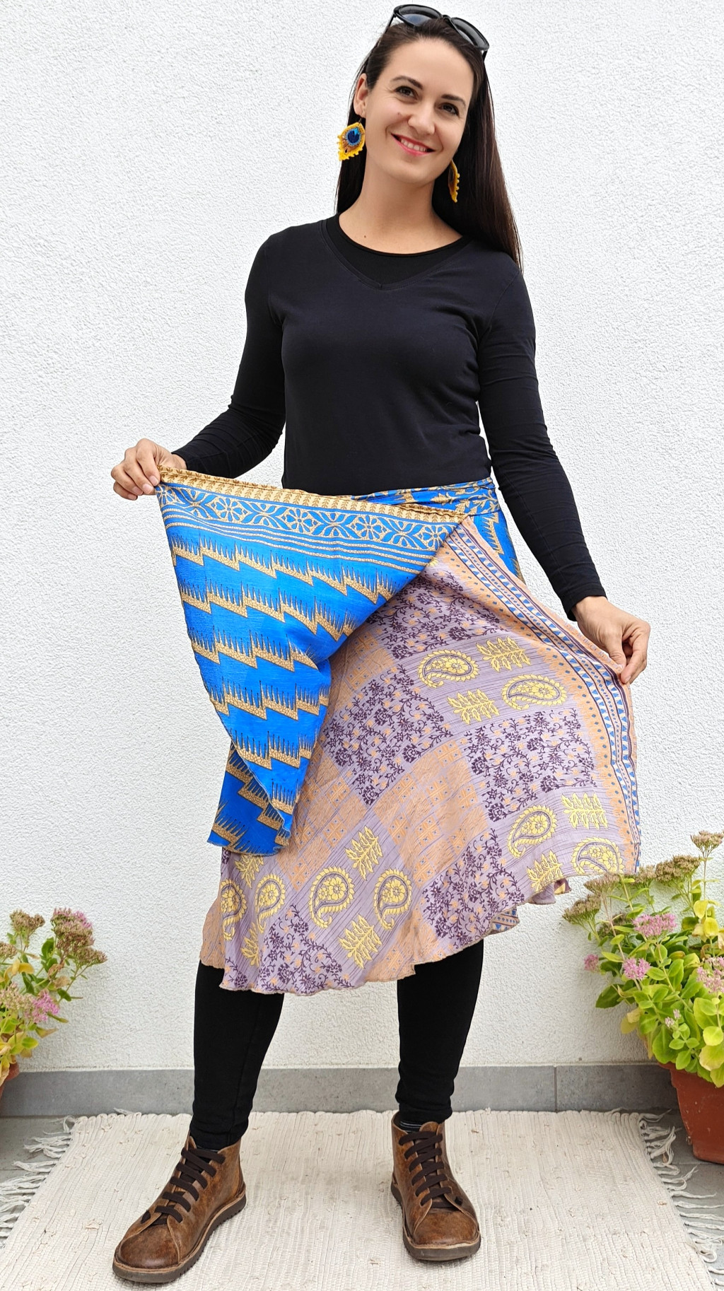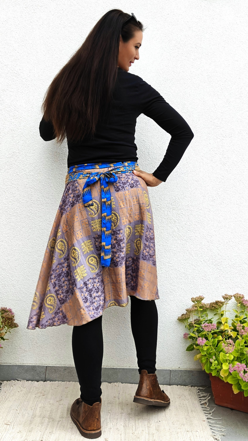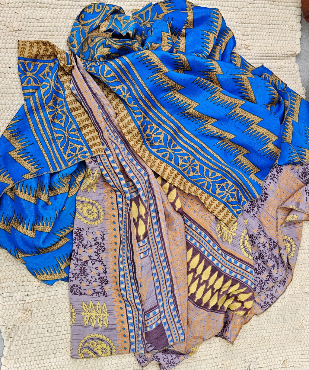 Lapszoknyáink újrahasznosított szárikból készülnek Indiában, egy hosszabb és egy rövidebb anyag derékban összevarrva! Két oldalú, kifordítható, mindkét oldala hordható, sokféleképpen köthető, variálható. Szoknyáinkból nincs két egyforma, mindegyikből csak EGY darab van, ha megtetszik, csapj le rá!
