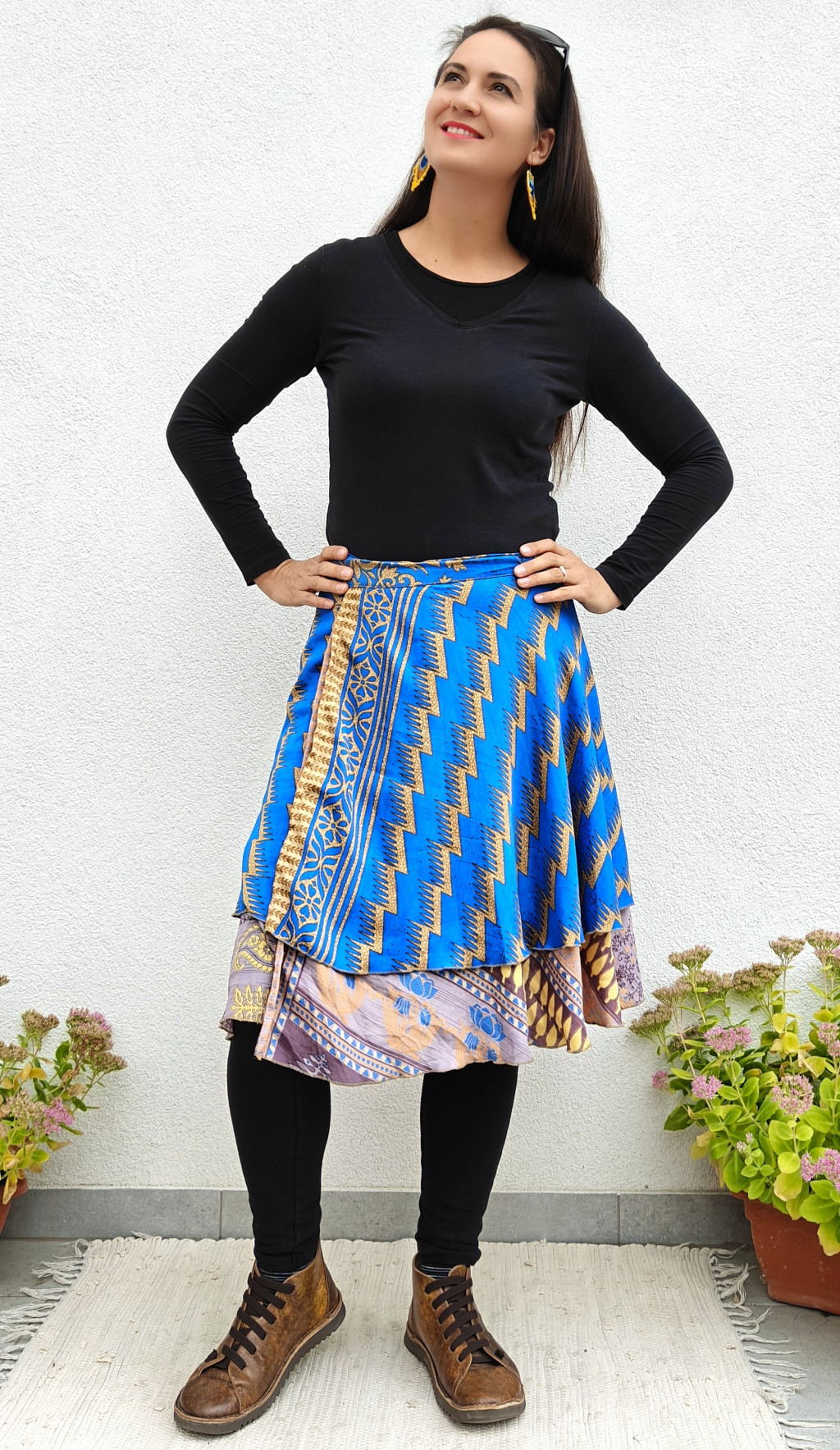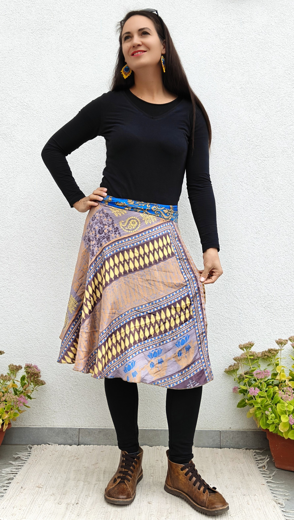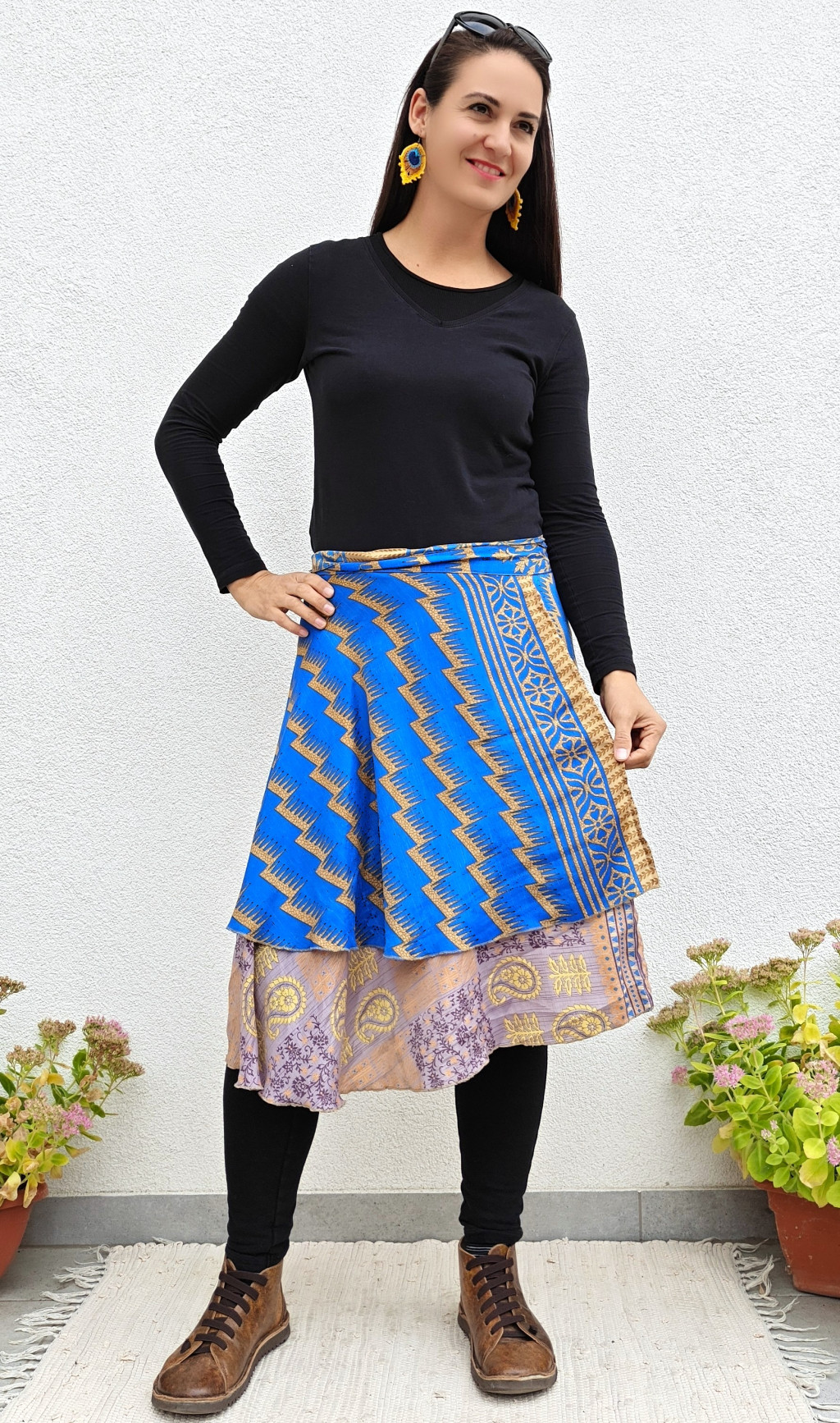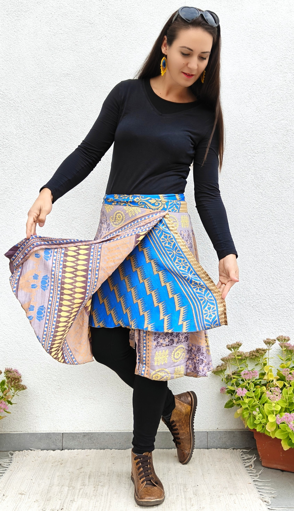 Lapszoknyáink újrahasznosított szárikból készülnek Indiában, egy hosszabb és egy rövidebb anyag derékban összevarrva! Két oldalú, kifordítható, mindkét oldala hordható, sokféleképpen köthető, variálható. Szoknyáinkból nincs két egyforma, mindegyikből csak EGY darab van, ha megtetszik, csapj le rá!