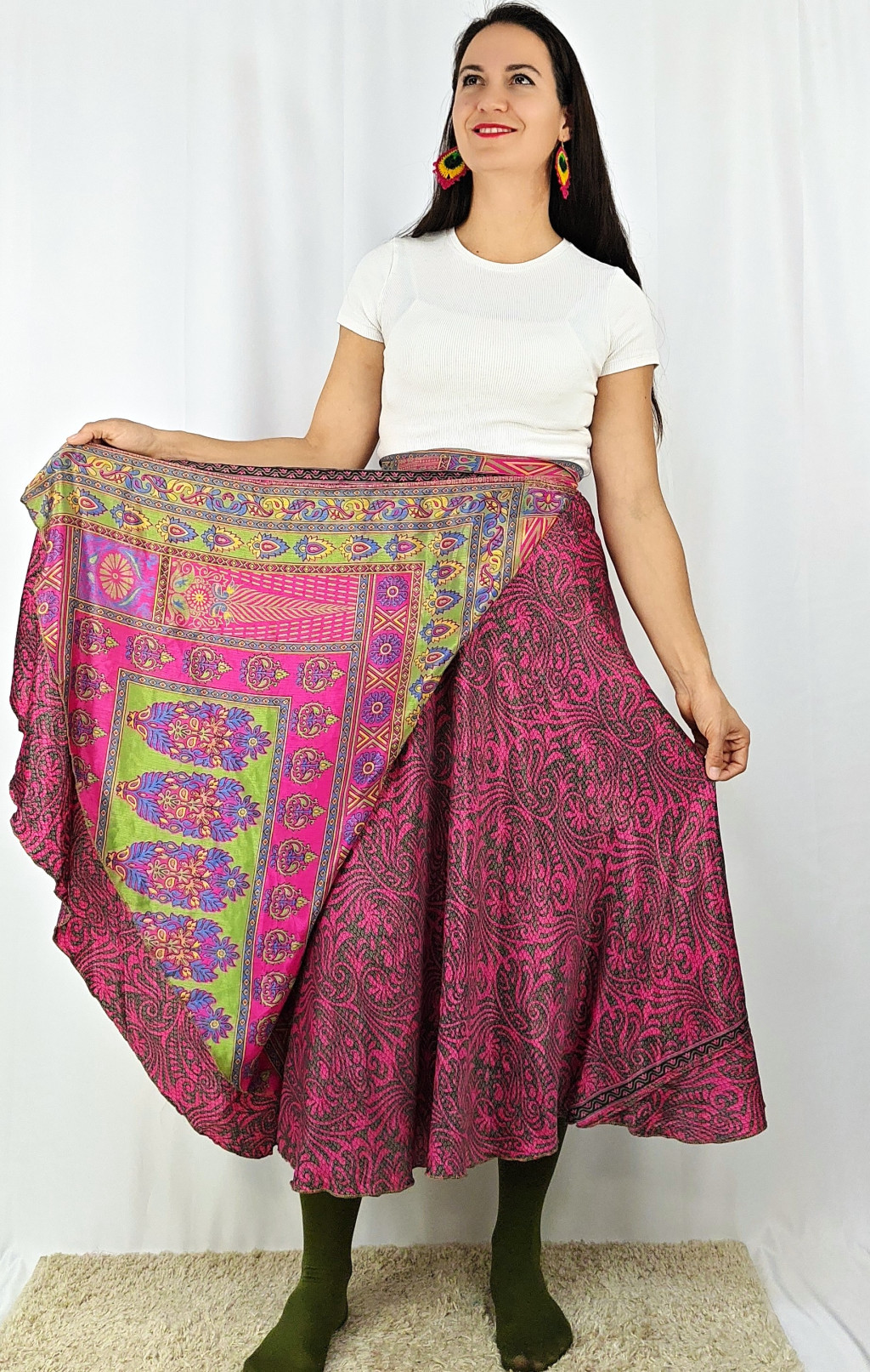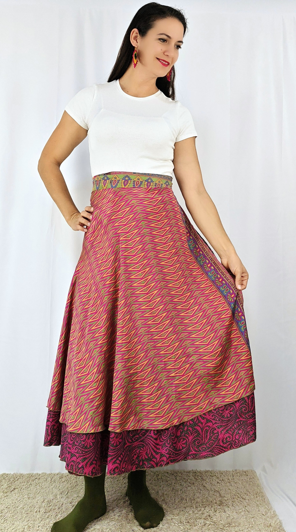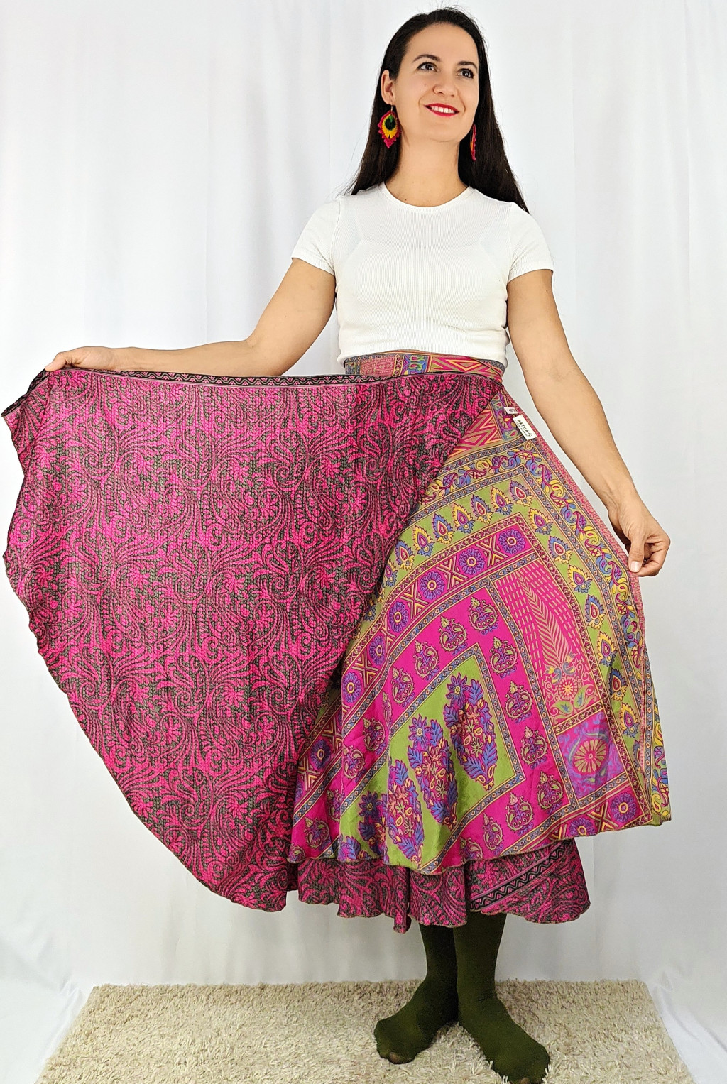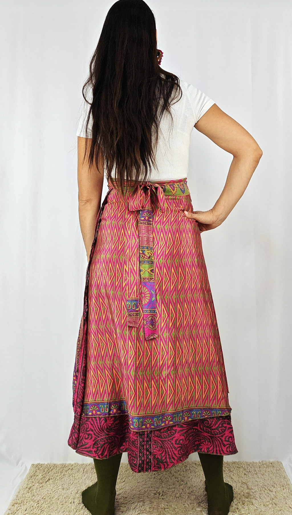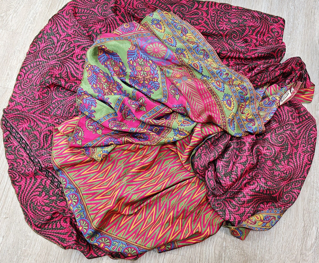 Lapszoknyáink újrahasznosított szárikból készülnek Indiában, egy hosszabb és egy rövidebb anyag derékban összevarrva! Két oldalú, kifordítható, mindkét oldala hordható, sokféleképpen köthető, variálható. Szoknyáinkból nincs két egyforma, mindegyikből csak EGY darab van, ha megtetszik, csapj le rá!
