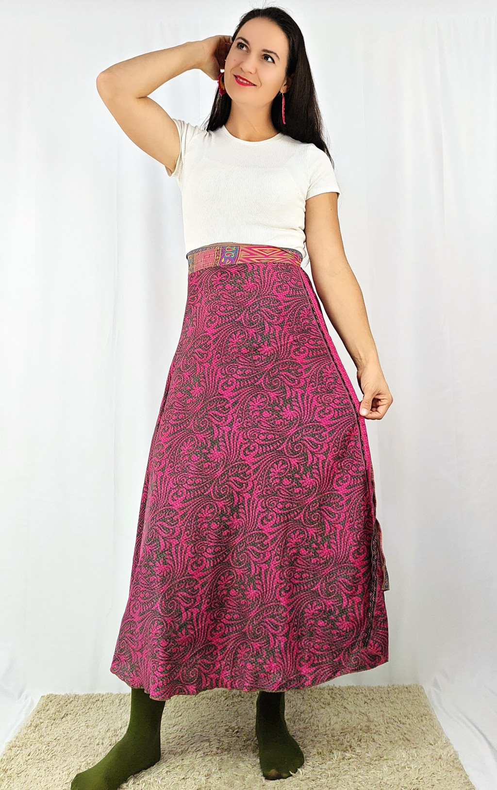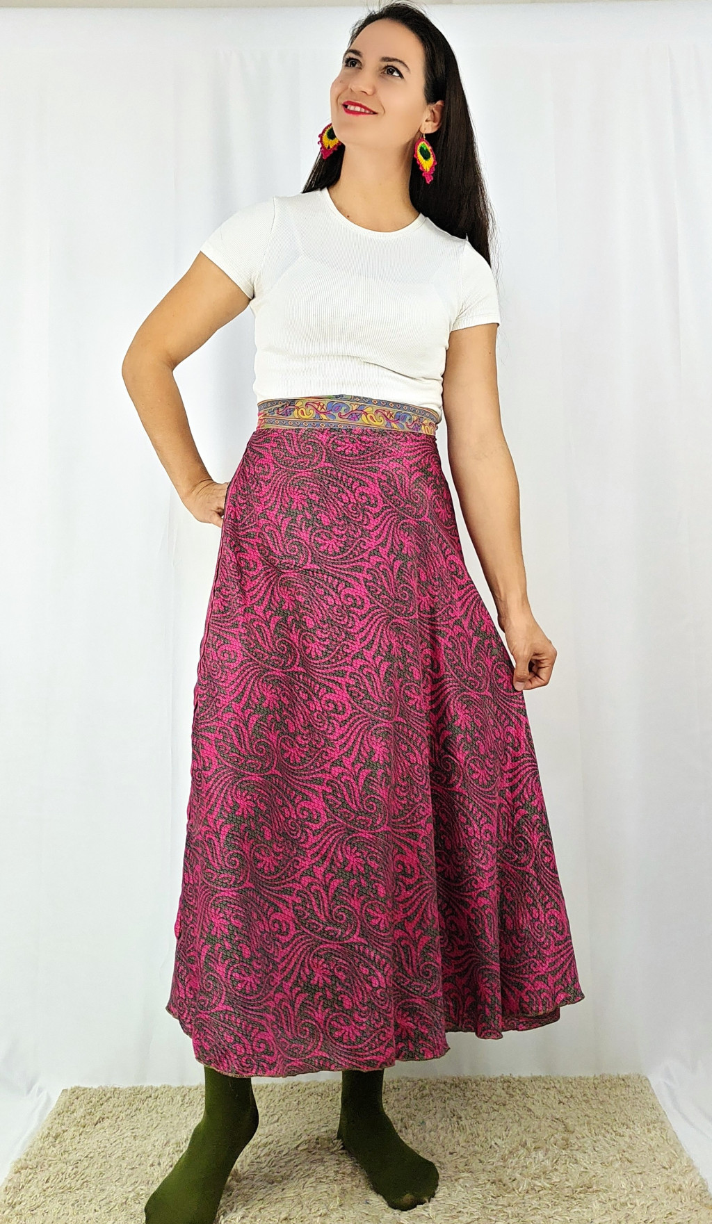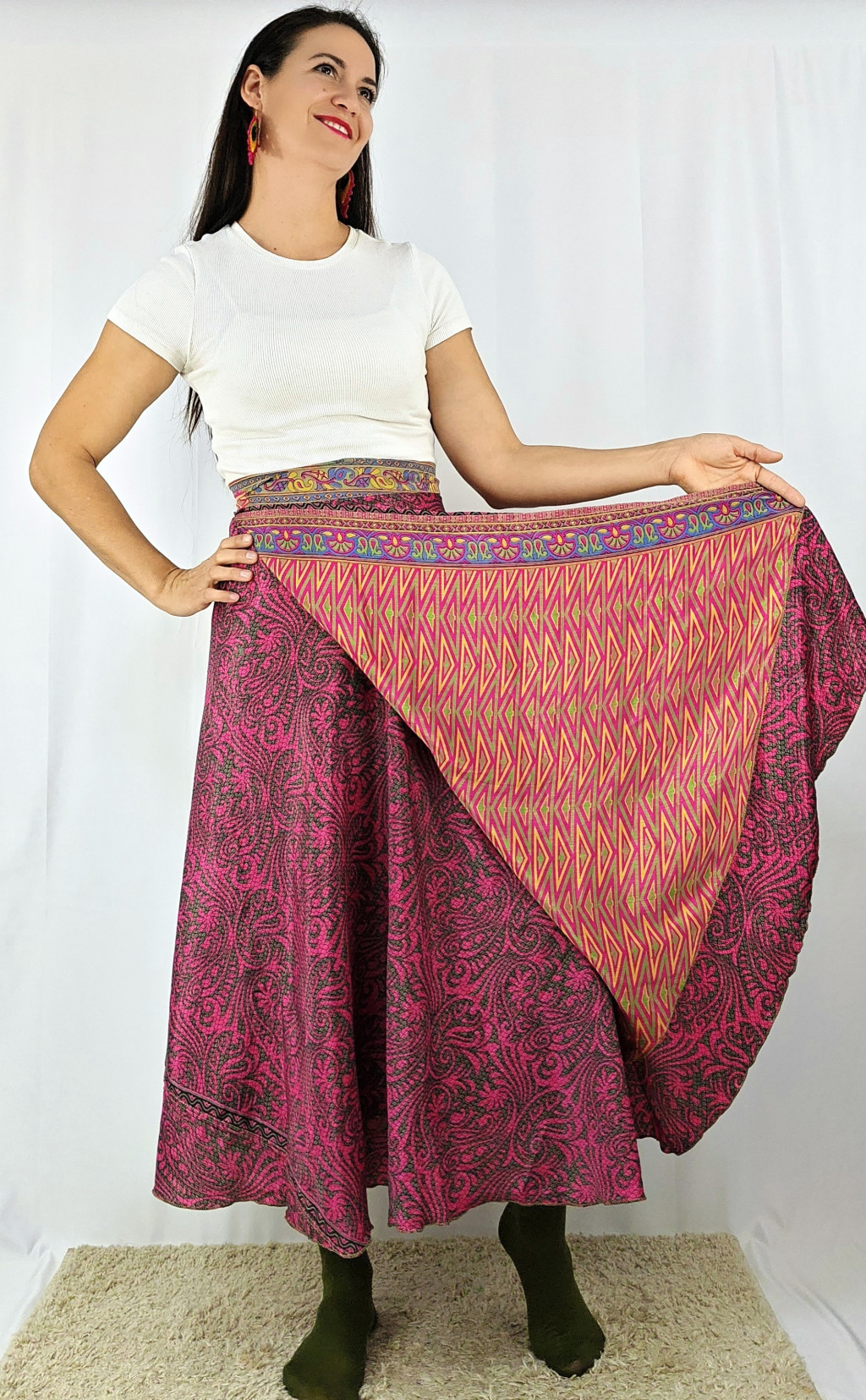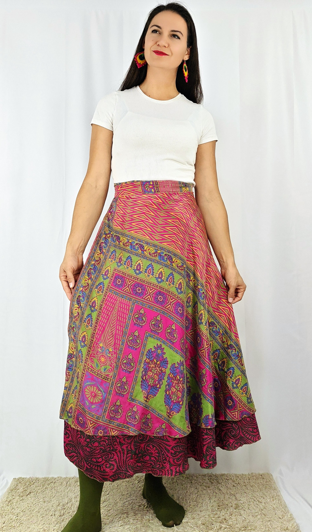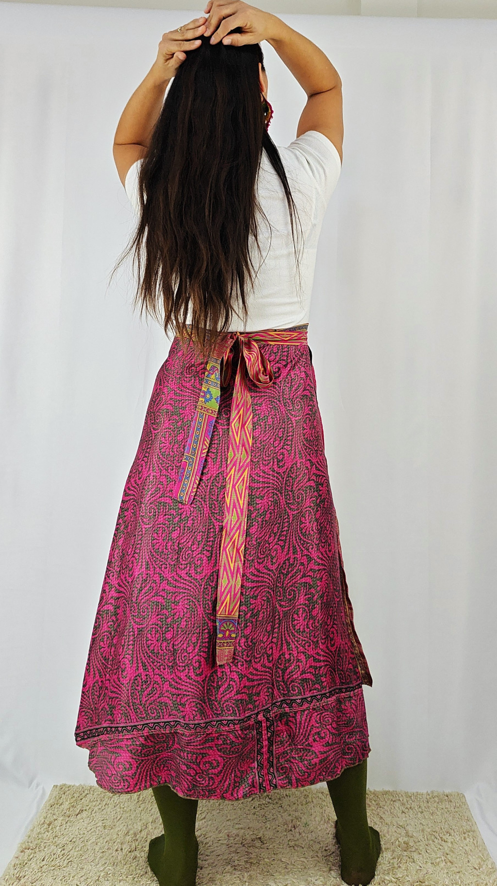 Lapszoknyáink újrahasznosított szárikból készülnek Indiában, egy hosszabb és egy rövidebb anyag derékban összevarrva! Két oldalú, kifordítható, mindkét oldala hordható, sokféleképpen köthető, variálható. Szoknyáinkból nincs két egyforma, mindegyikből csak EGY darab van, ha megtetszik, csapj le rá!