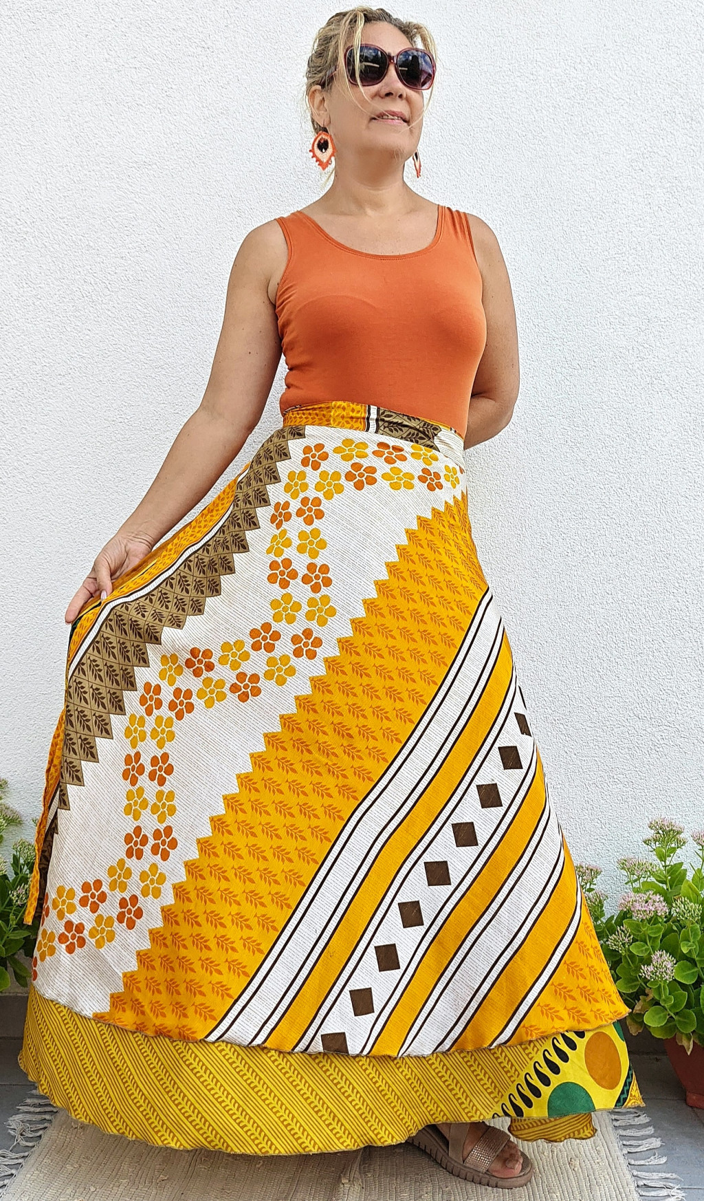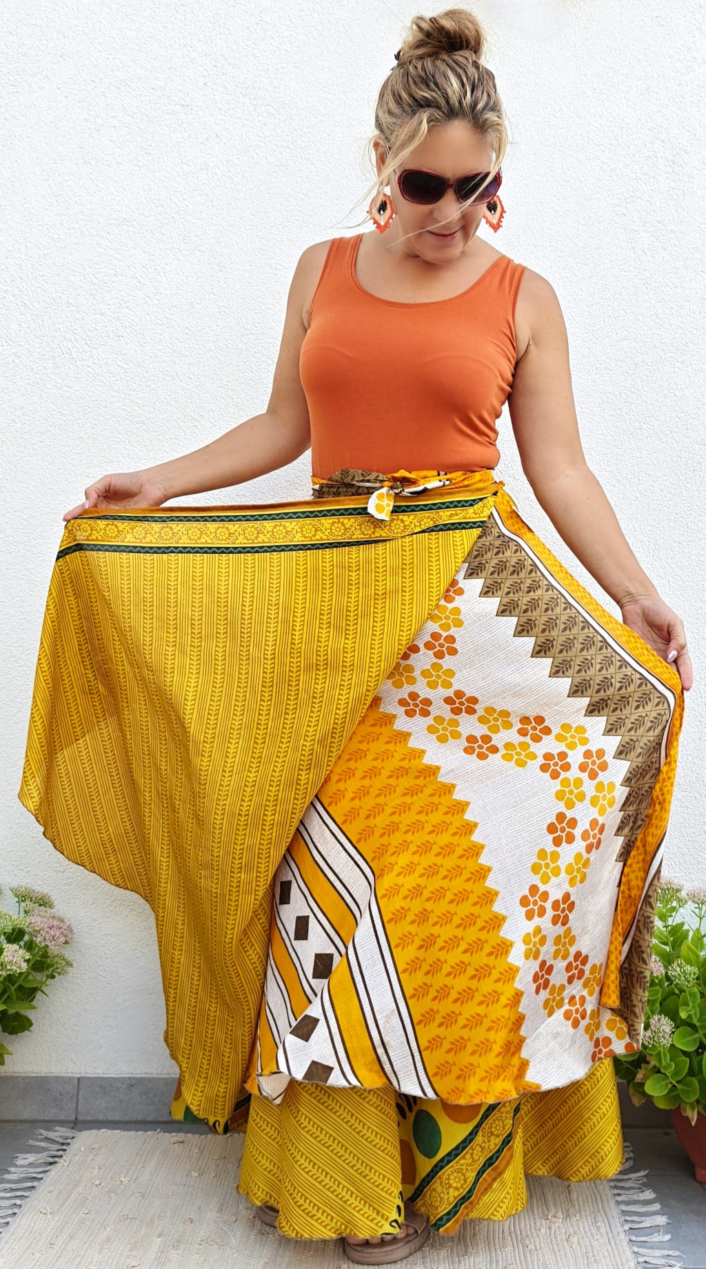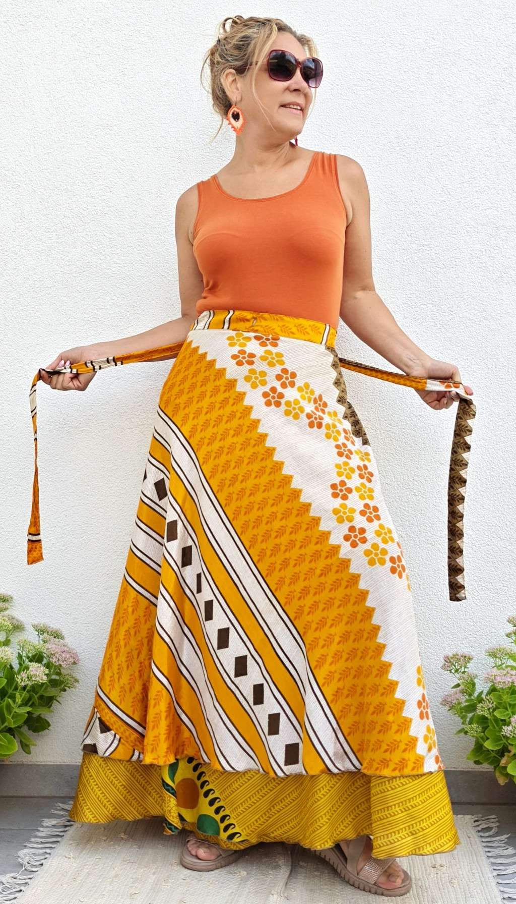 Lapszoknyáink újrahasznosított szárikból készülnek Indiában, egy hosszabb és egy rövidebb anyag derékban összevarrva! Két oldalú, kifordítható, mindkét oldala hordható, sokféleképpen köthető, variálható. Szoknyáinkból nincs két egyforma, mindegyikből csak EGY darab van, ha megtetszik, csapj le rá!