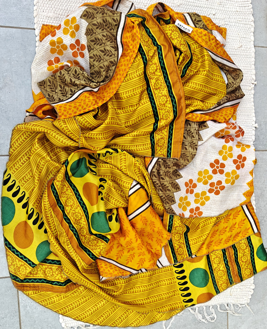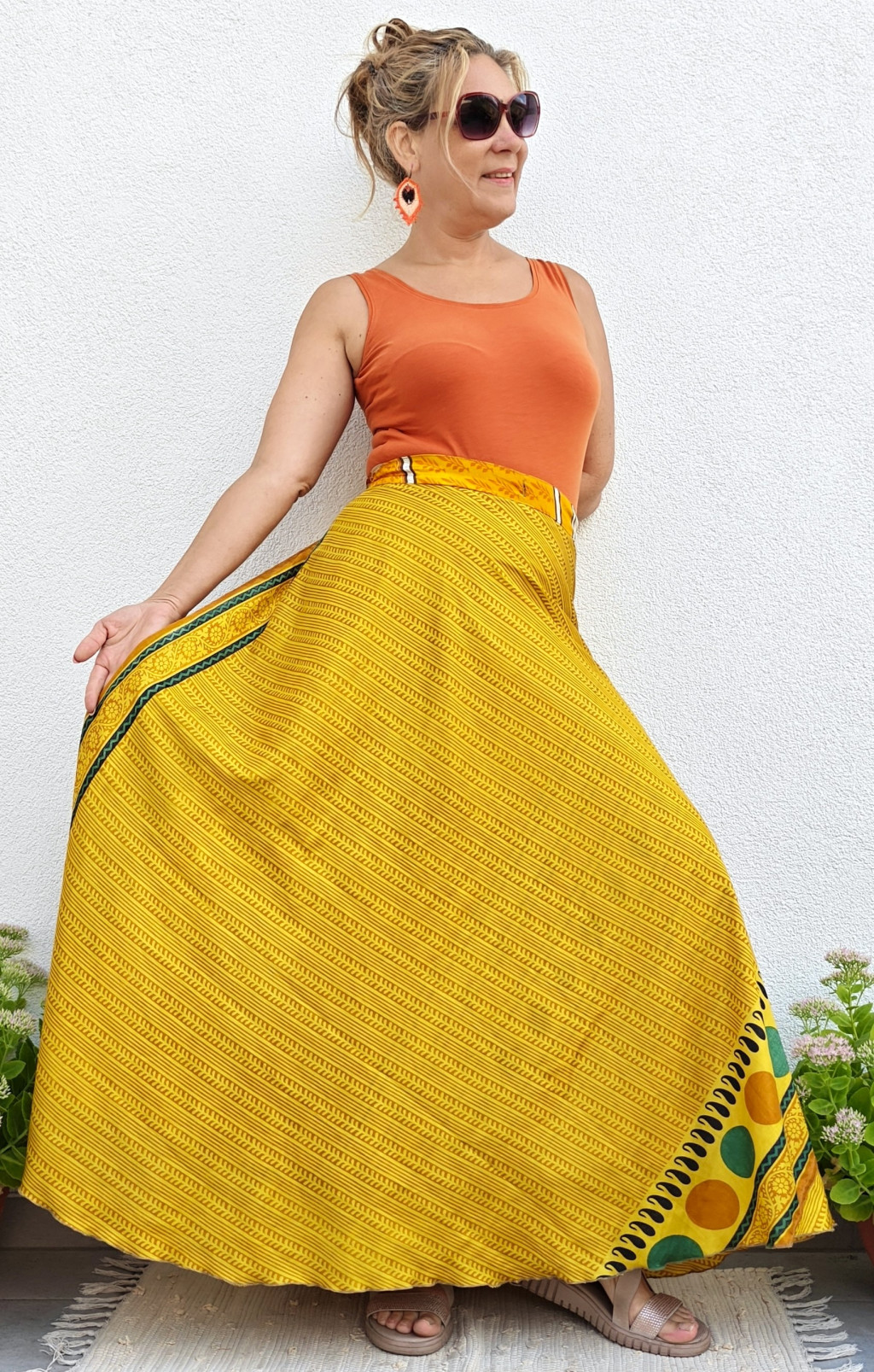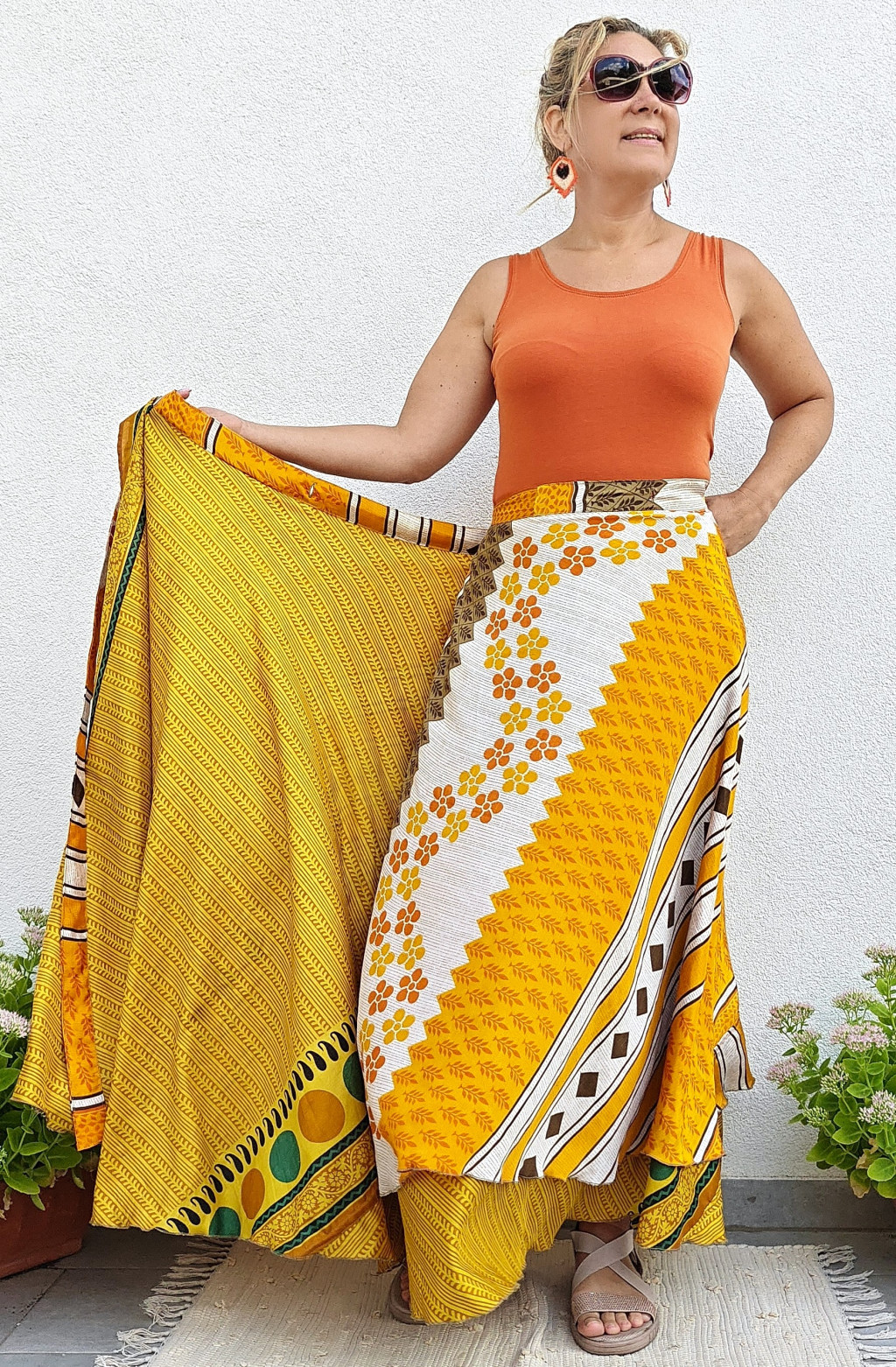 Lapszoknyáink újrahasznosított szárikból készülnek Indiában, egy hosszabb és egy rövidebb anyag derékban összevarrva! Két oldalú, kifordítható, mindkét oldala hordható, sokféleképpen köthető, variálható. Szoknyáinkból nincs két egyforma, mindegyikből csak EGY darab van, ha megtetszik, csapj le rá!