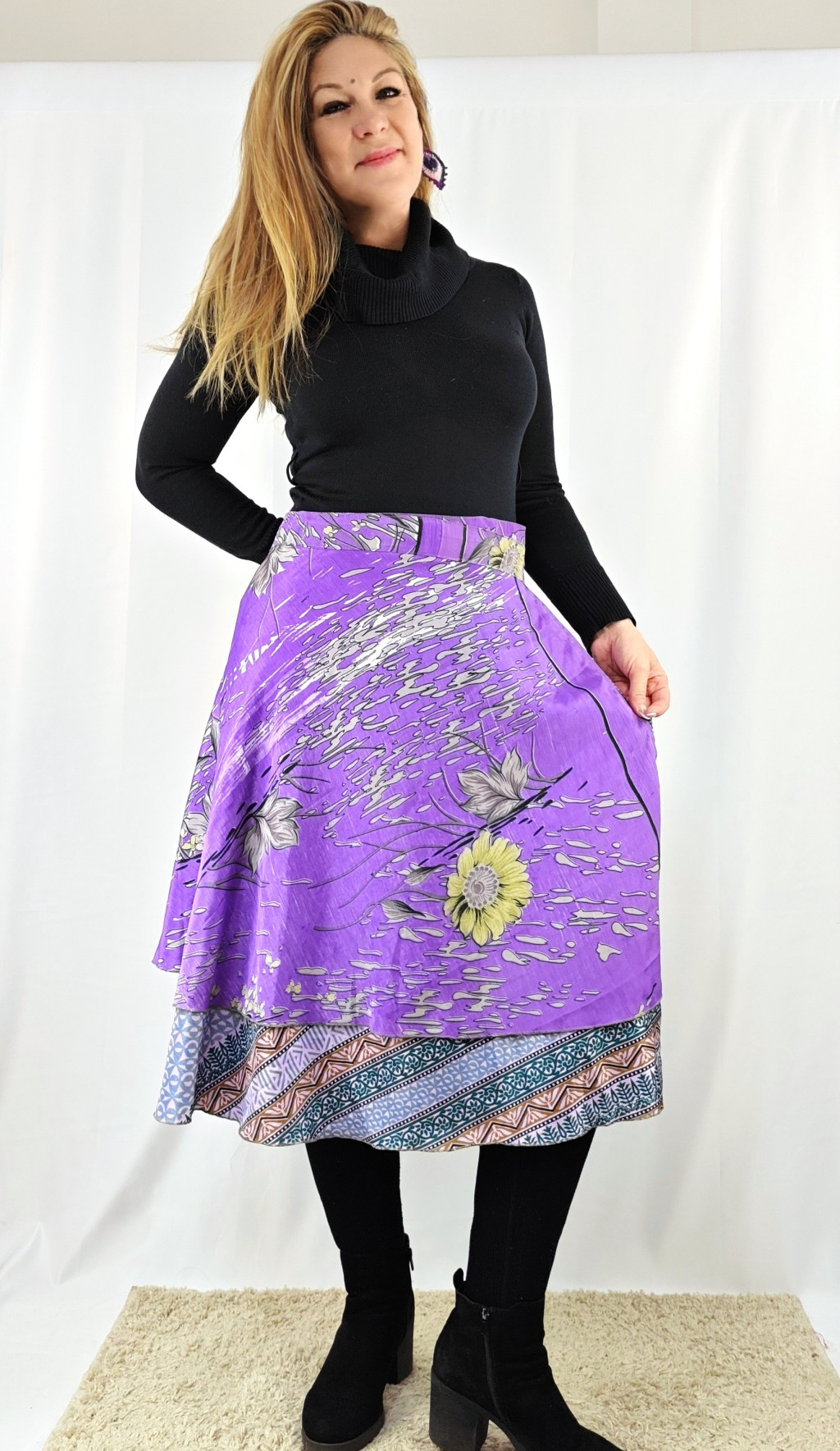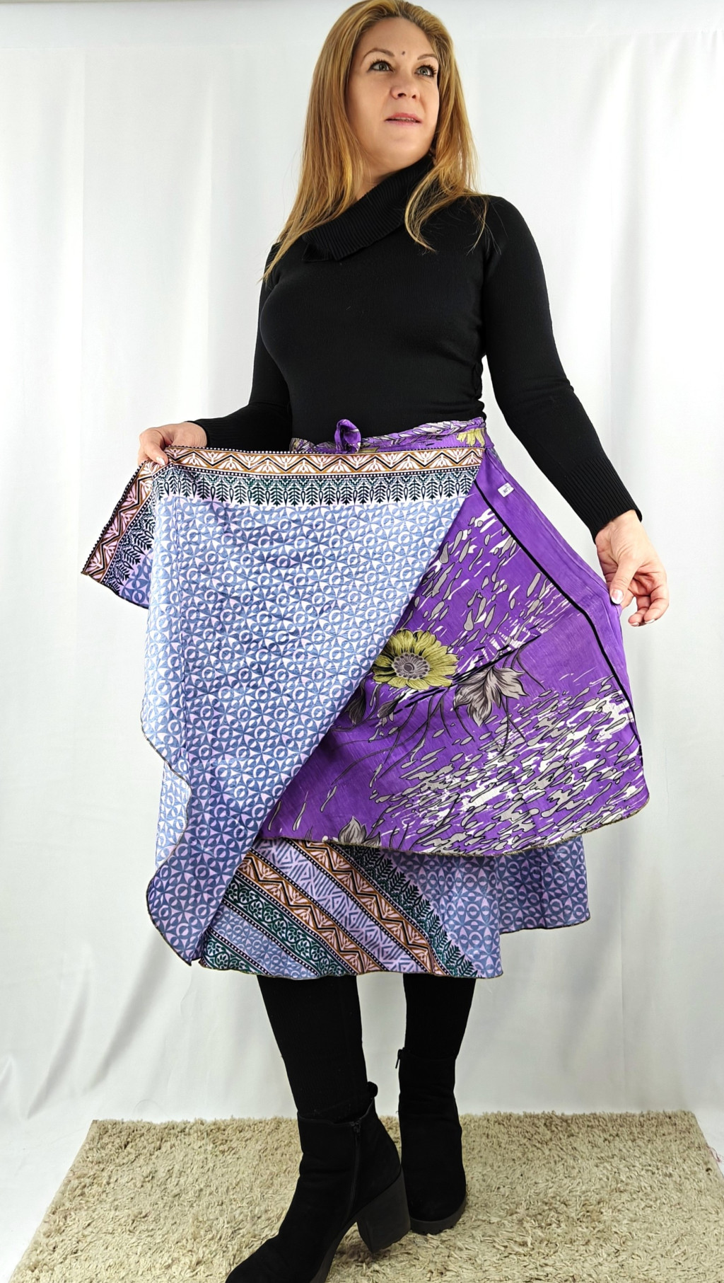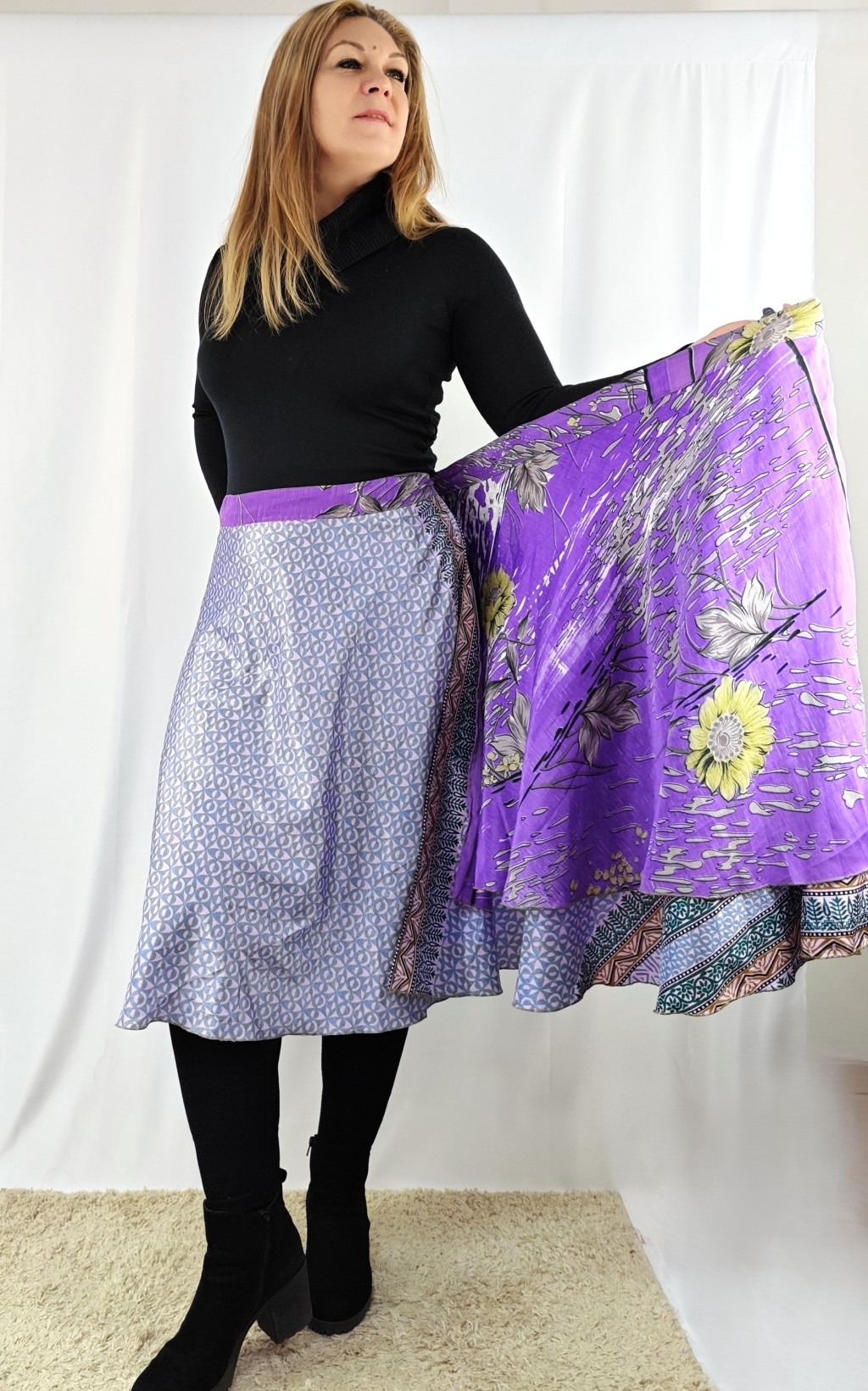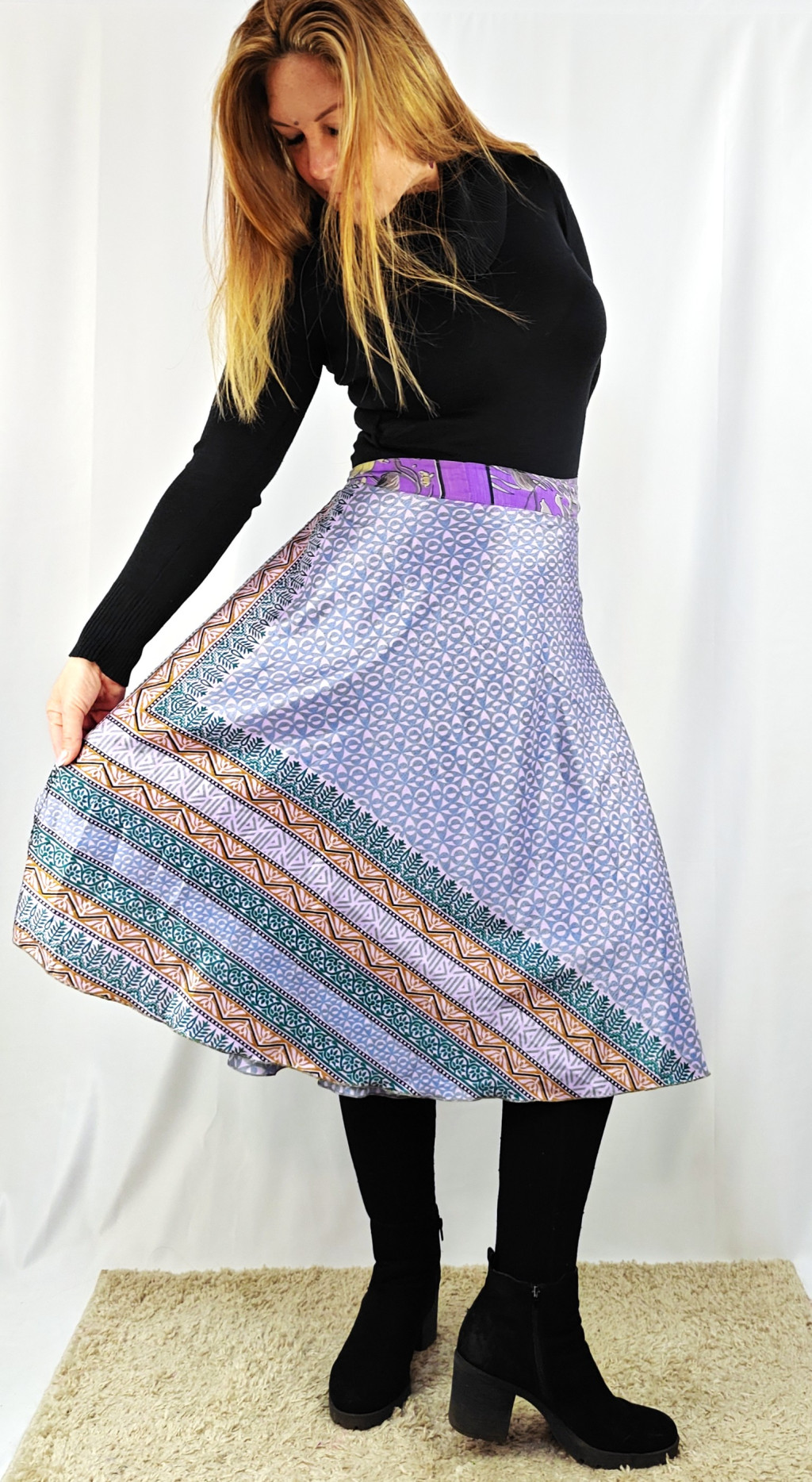 Lapszoknyáink újrahasznosított szárikból készülnek Indiában, egy hosszabb és egy rövidebb anyag derékban összevarrva! Két oldalú, kifordítható, mindkét oldala hordható, sokféleképpen köthető, variálható. Szoknyáinkból nincs két egyforma, mindegyikből csak EGY darab van, ha megtetszik, csapj le rá!