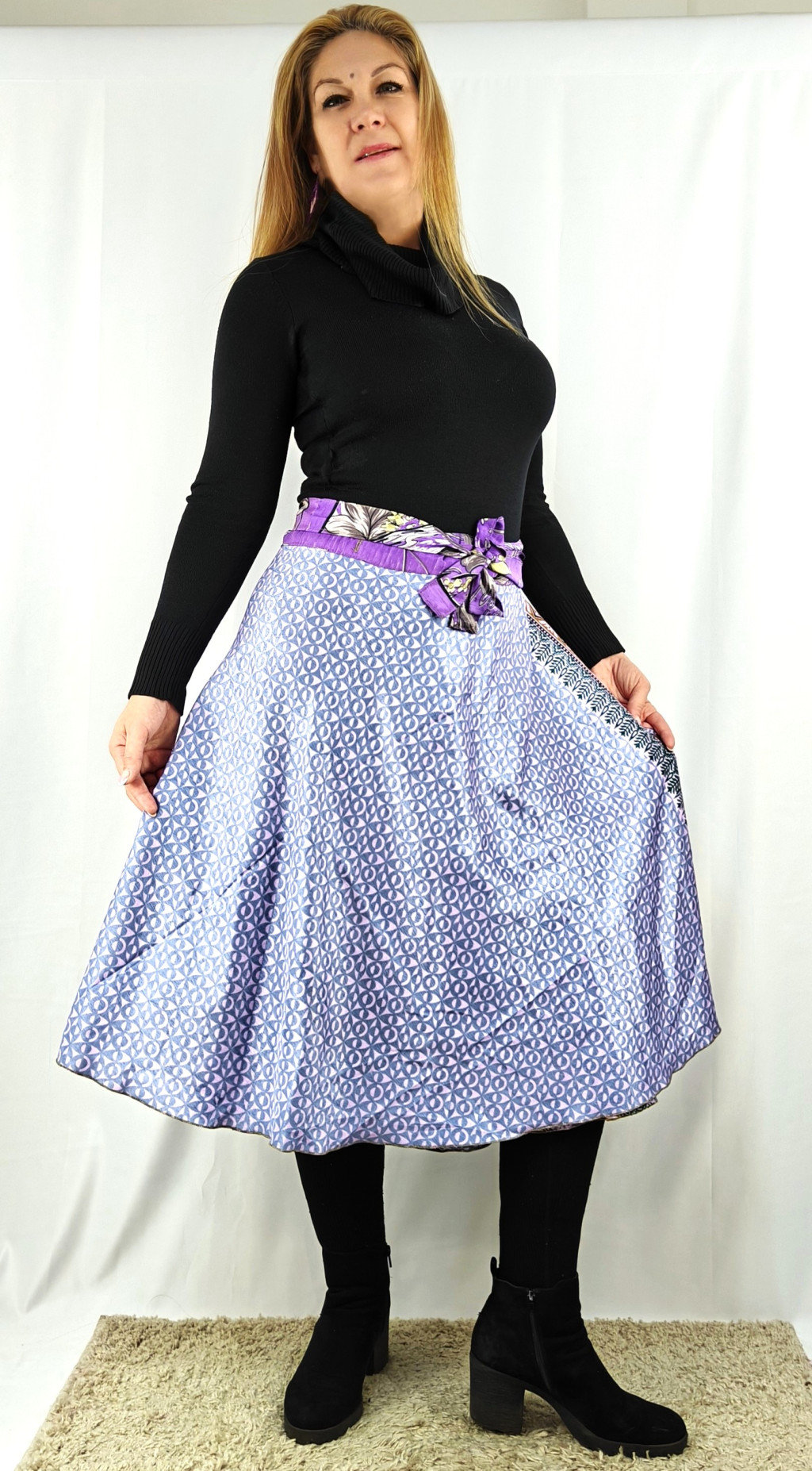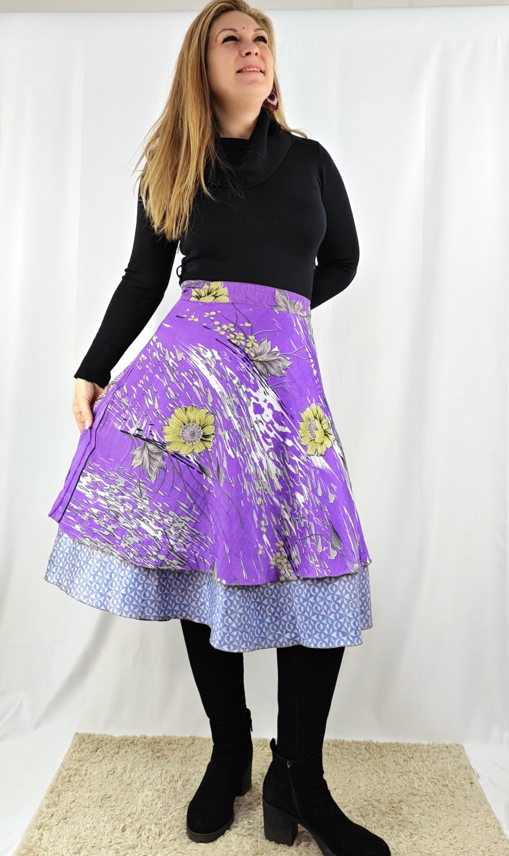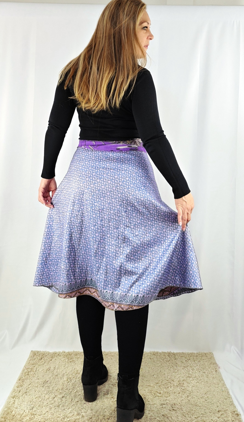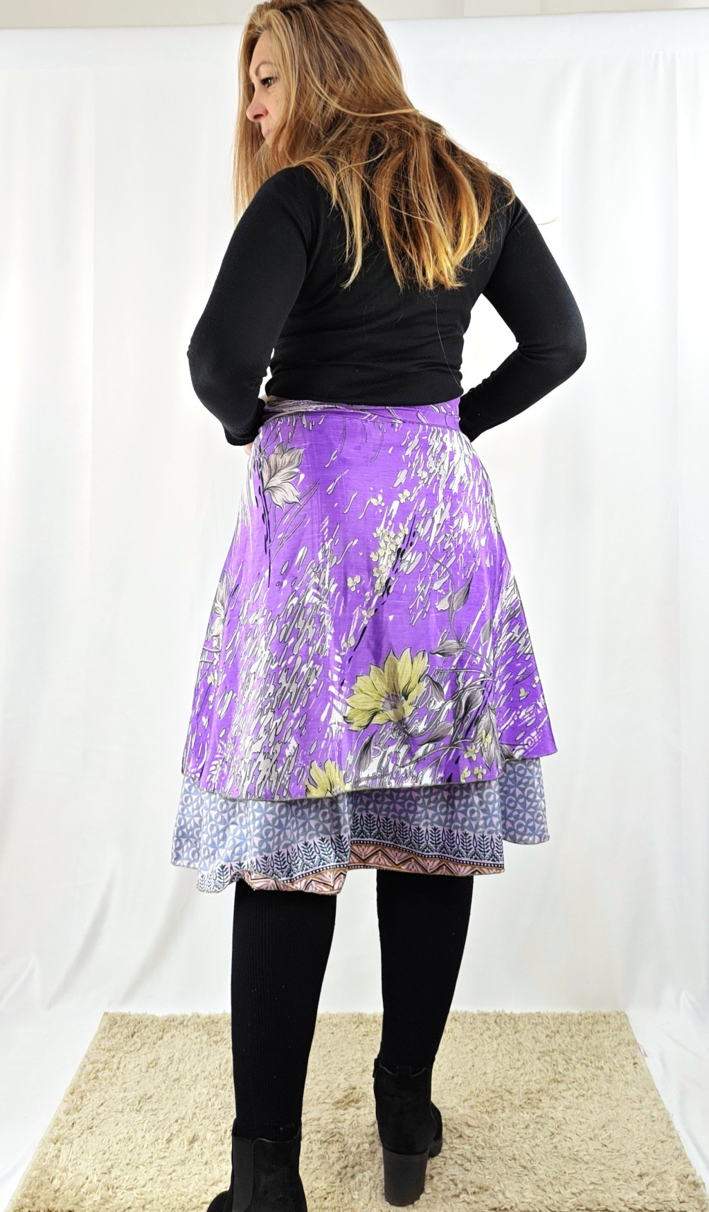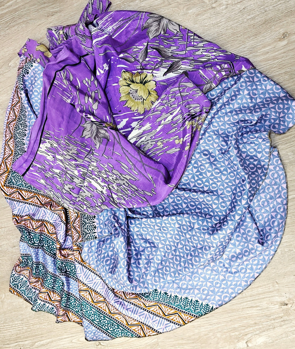 Lapszoknyáink újrahasznosított szárikból készülnek Indiában, egy hosszabb és egy rövidebb anyag derékban összevarrva! Két oldalú, kifordítható, mindkét oldala hordható, sokféleképpen köthető, variálható. Szoknyáinkból nincs két egyforma, mindegyikből csak EGY darab van, ha megtetszik, csapj le rá!