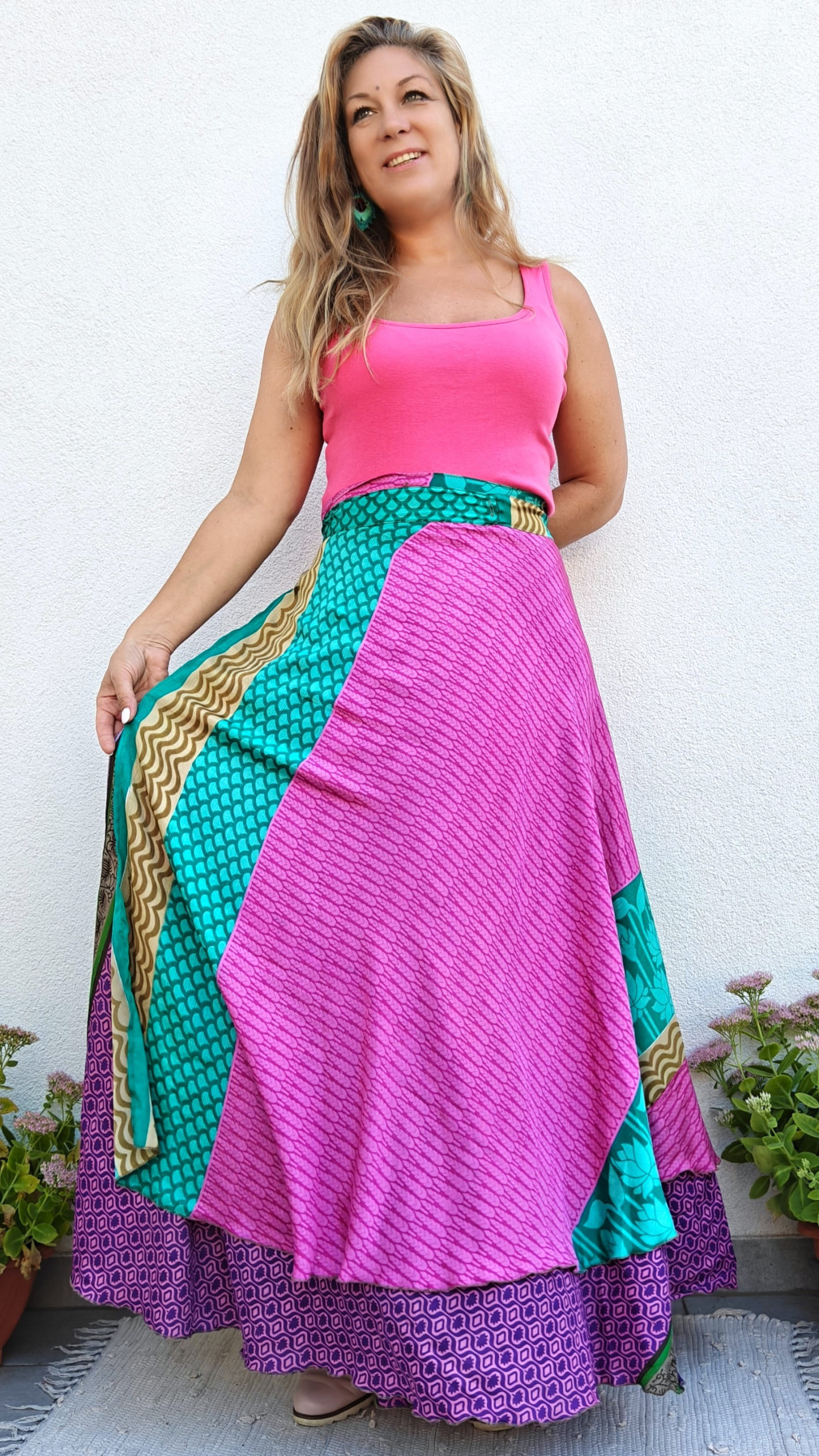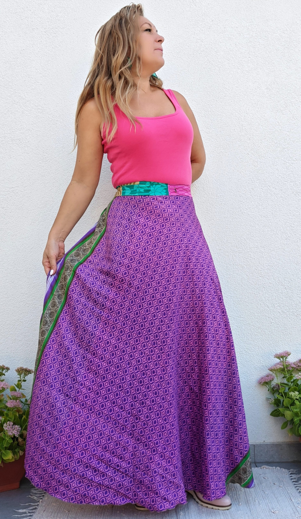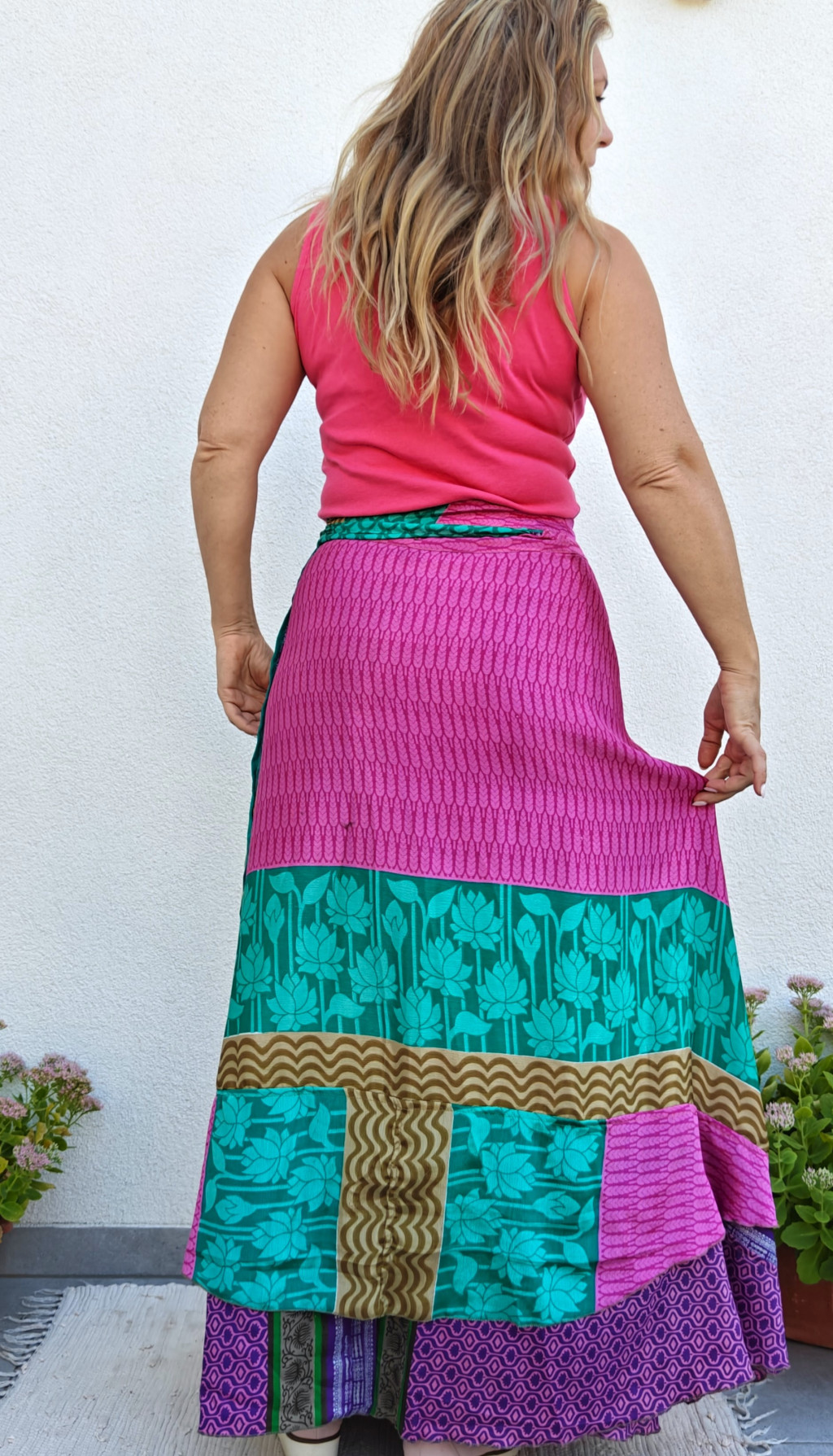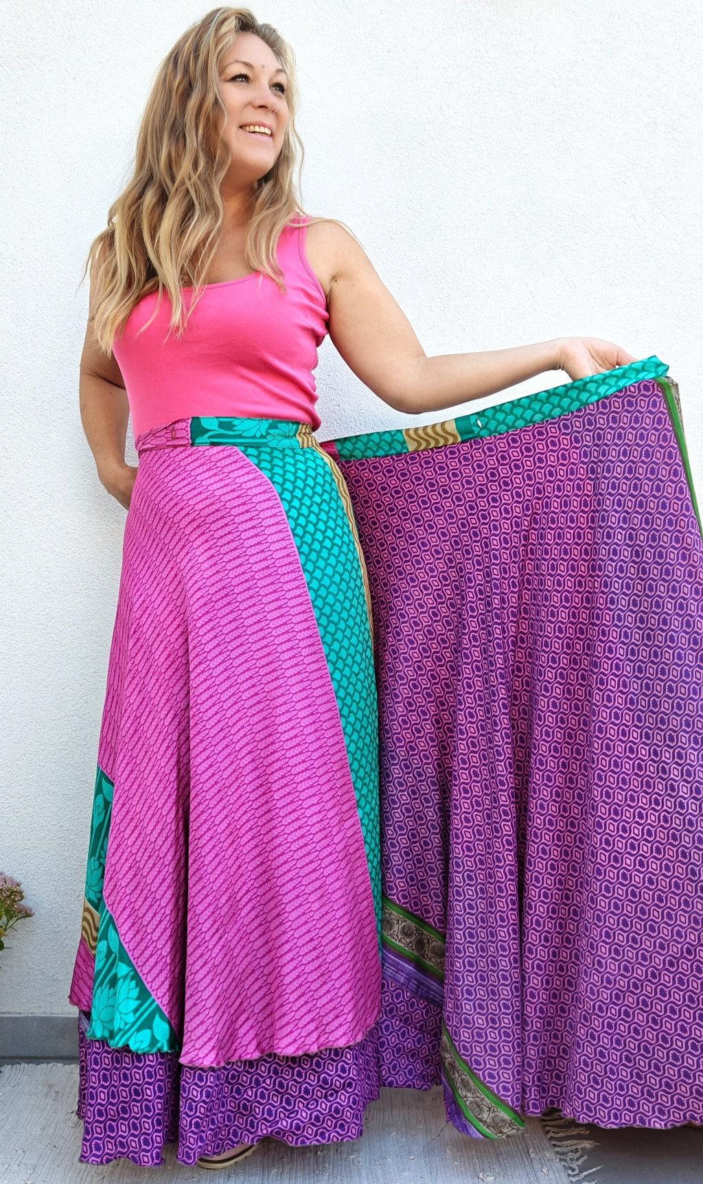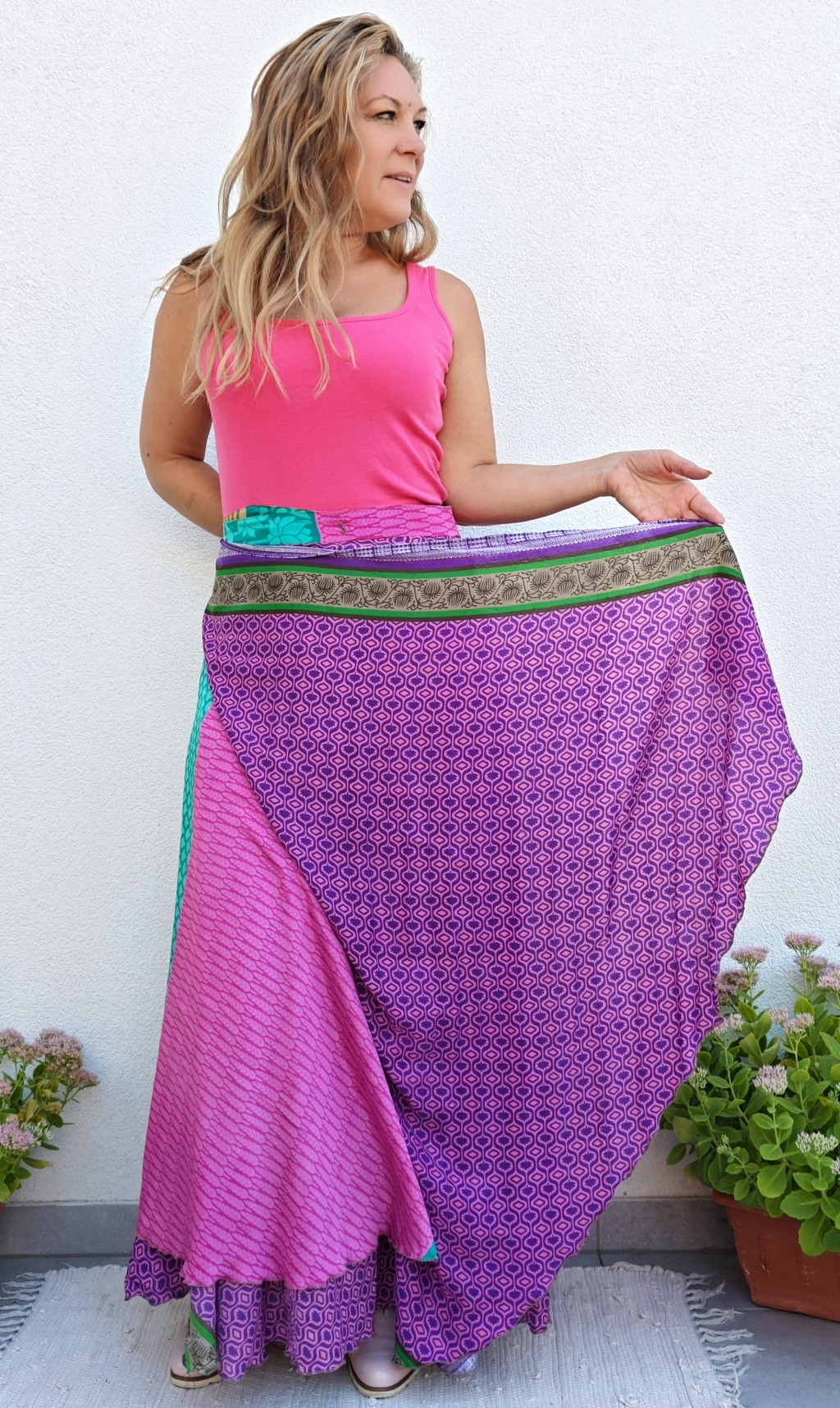 Lapszoknyáink újrahasznosított szárikból készülnek Indiában, egy hosszabb és egy rövidebb anyag derékban összevarrva! Két oldalú, kifordítható, mindkét oldala hordható, sokféleképpen köthető, variálható. Szoknyáinkból nincs két egyforma, mindegyikből csak EGY darab van, ha megtetszik, csapj le rá!