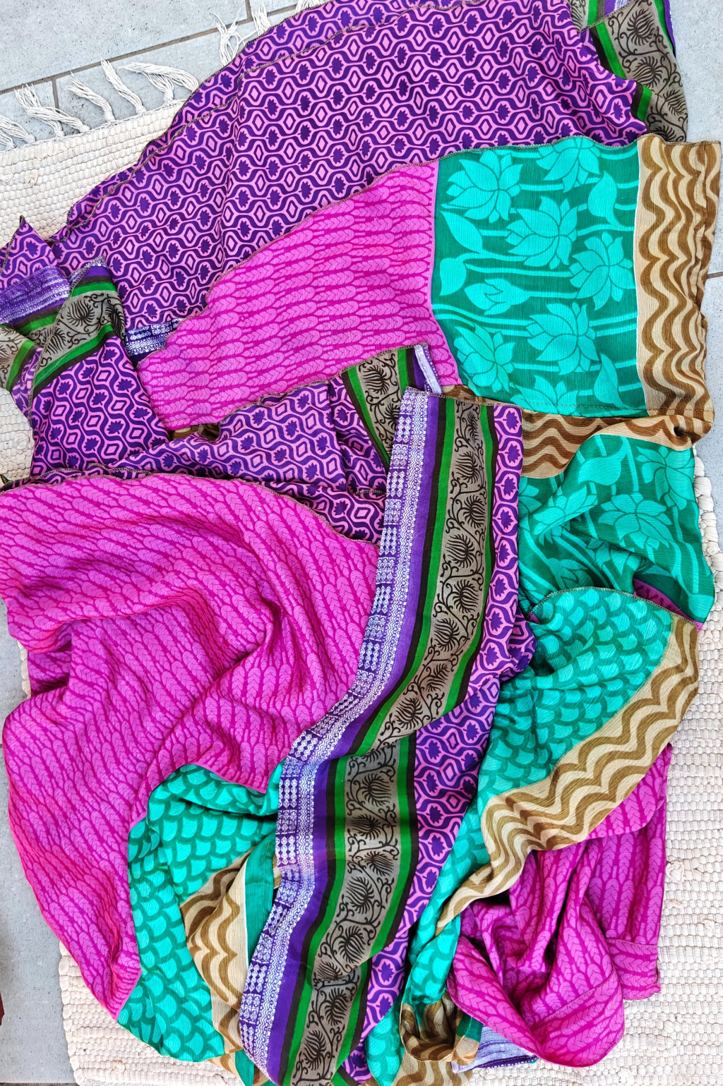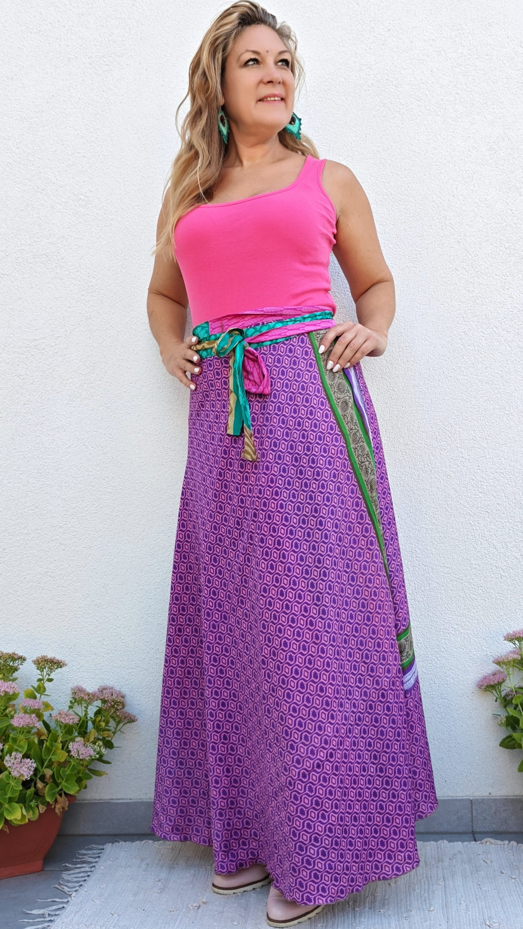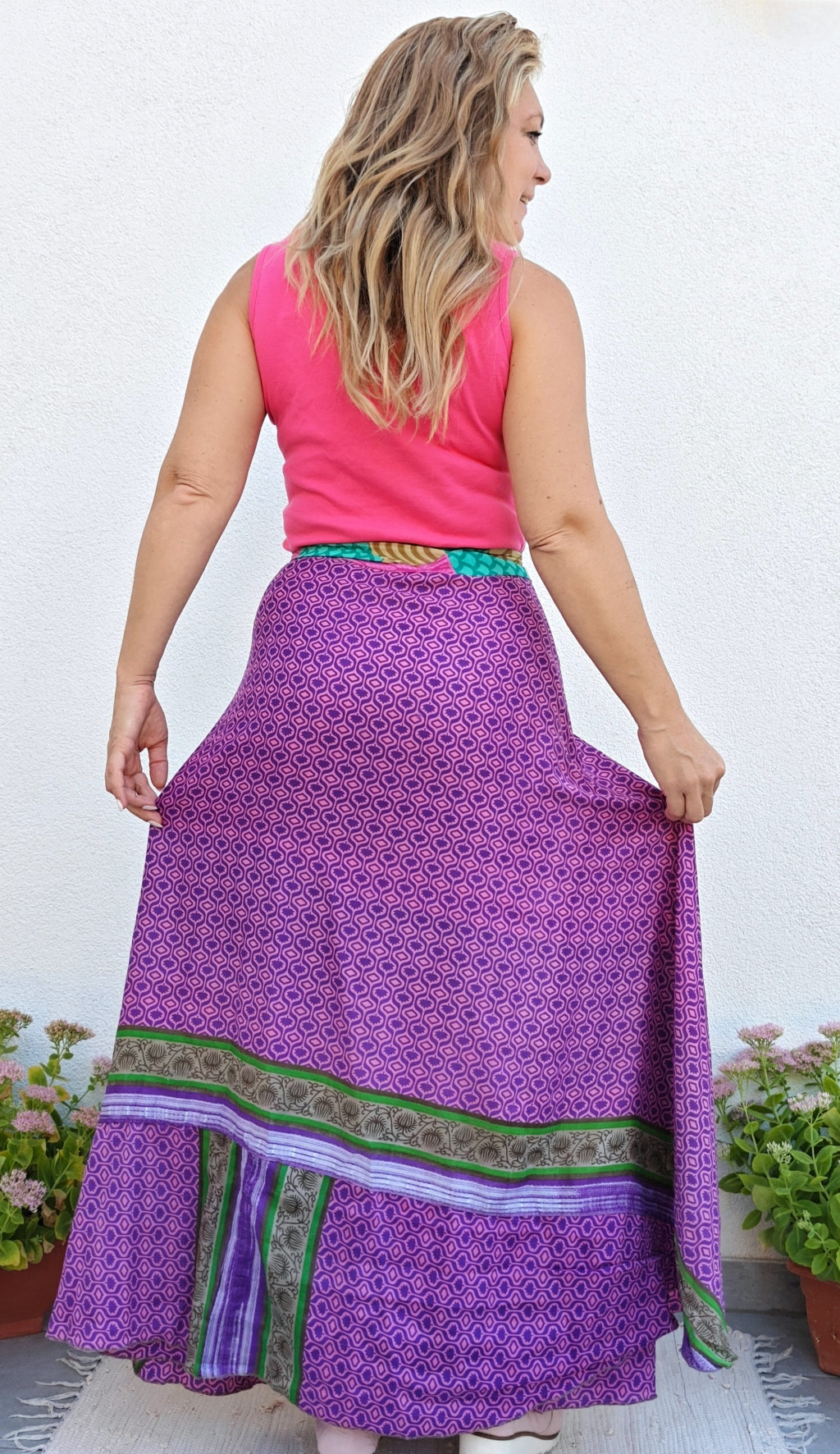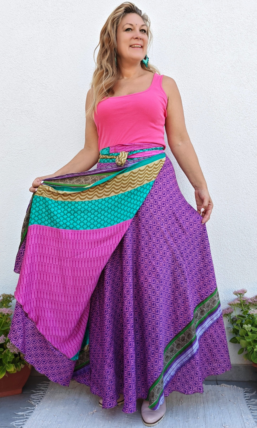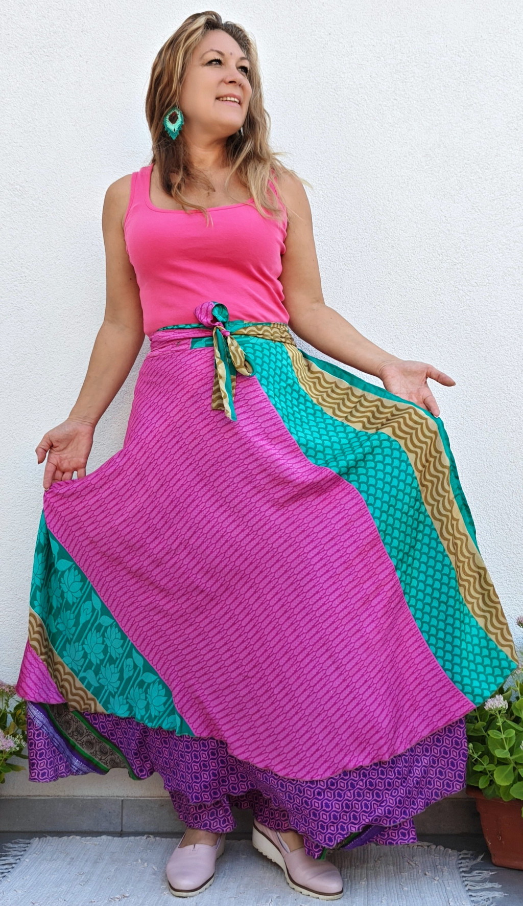 Lapszoknyáink újrahasznosított szárikból készülnek Indiában, egy hosszabb és egy rövidebb anyag derékban összevarrva! Két oldalú, kifordítható, mindkét oldala hordható, sokféleképpen köthető, variálható. Szoknyáinkból nincs két egyforma, mindegyikből csak EGY darab van, ha megtetszik, csapj le rá!