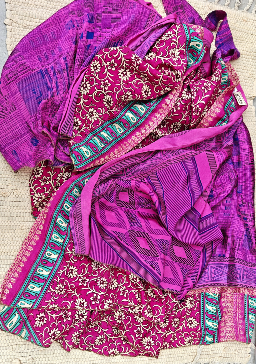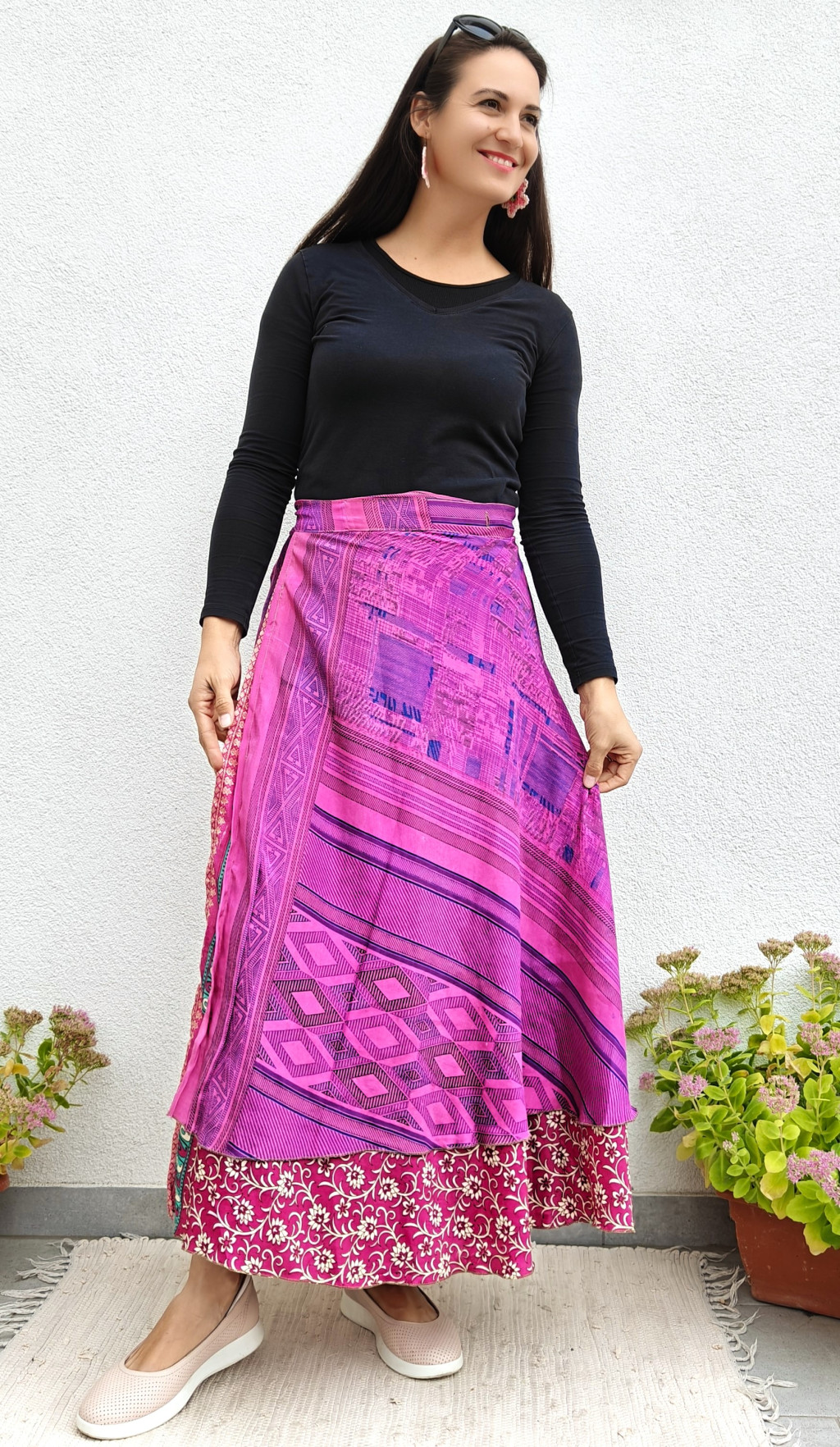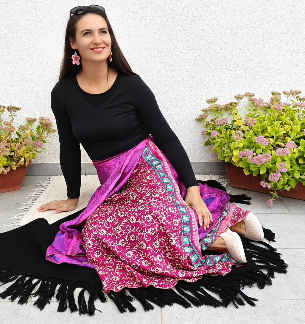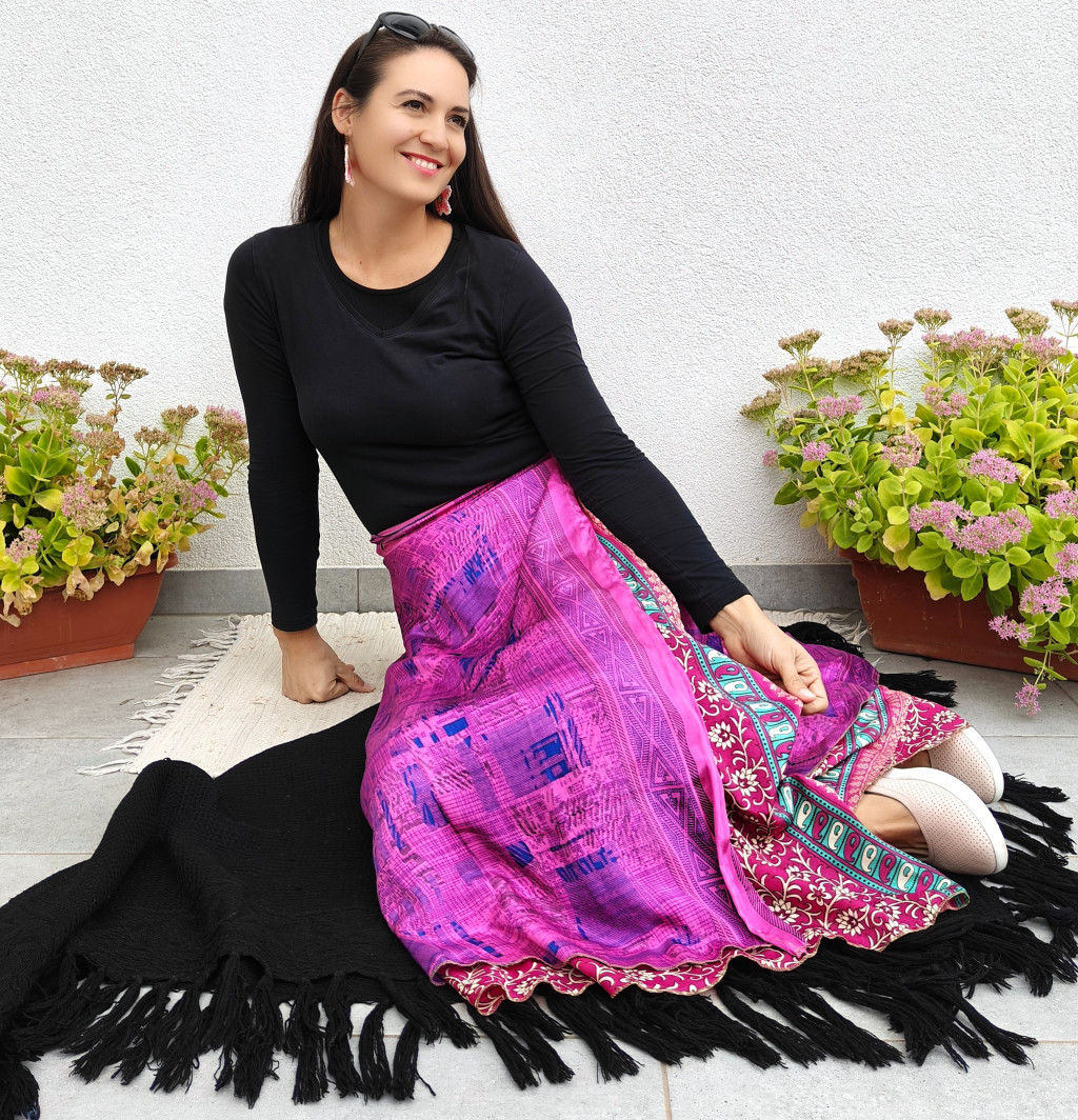 Lapszoknyáink újrahasznosított szárikból készülnek Indiában, egy hosszabb és egy rövidebb anyag derékban összevarrva! Két oldalú, kifordítható, mindkét oldala hordható, sokféleképpen köthető, variálható. Szoknyáinkból nincs két egyforma, mindegyikből csak EGY darab van, ha megtetszik, csapj le rá!