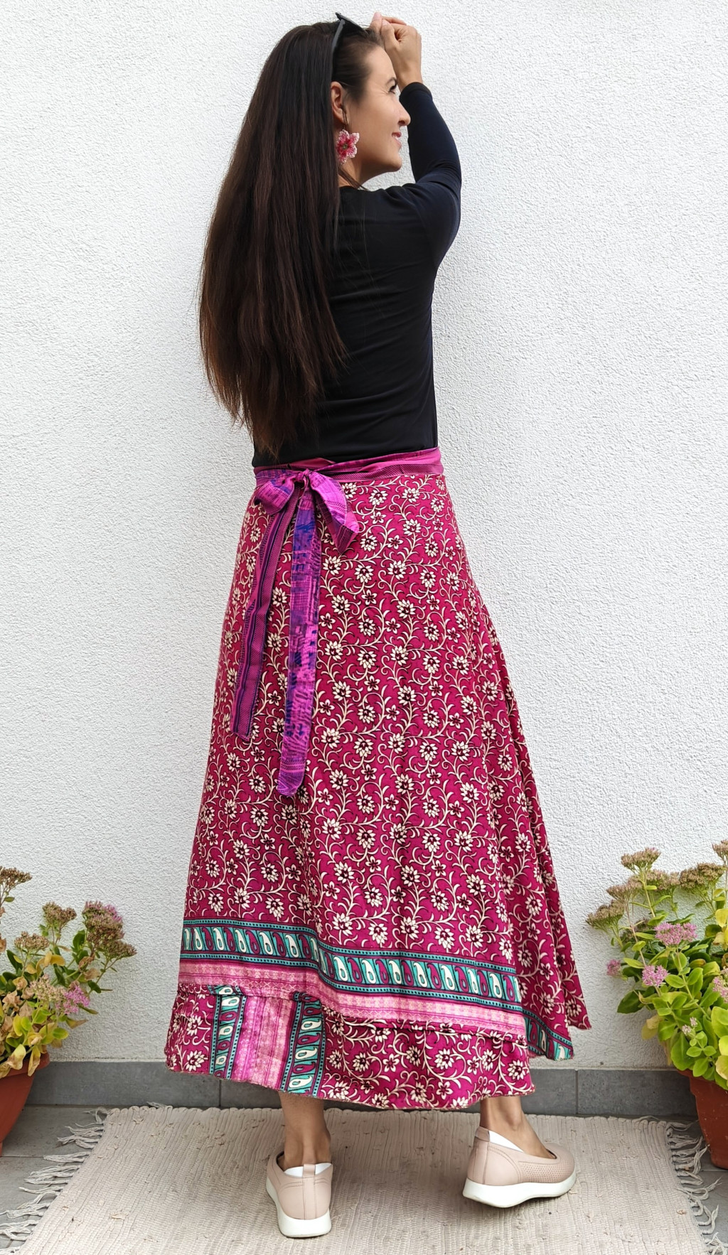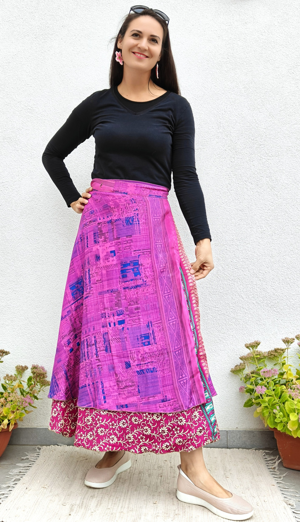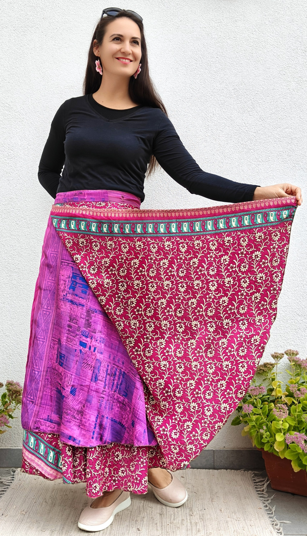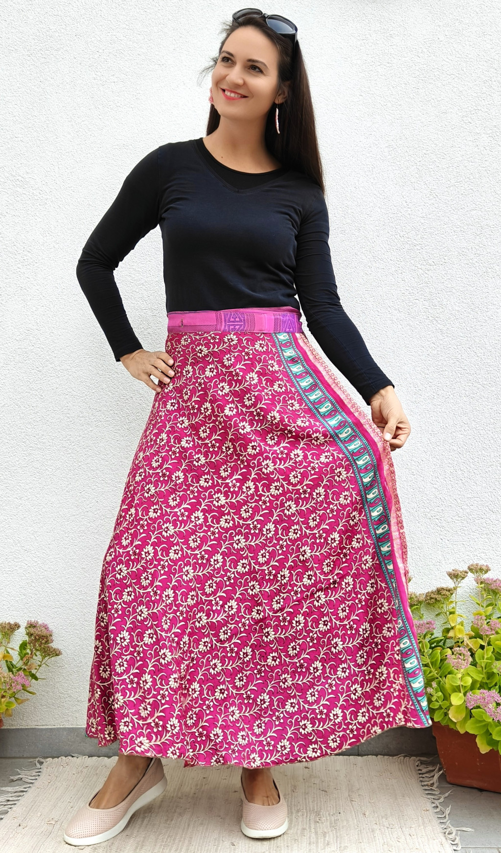 Lapszoknyáink újrahasznosított szárikból készülnek Indiában, egy hosszabb és egy rövidebb anyag derékban összevarrva! Két oldalú, kifordítható, mindkét oldala hordható, sokféleképpen köthető, variálható. Szoknyáinkból nincs két egyforma, mindegyikből csak EGY darab van, ha megtetszik, csapj le rá!