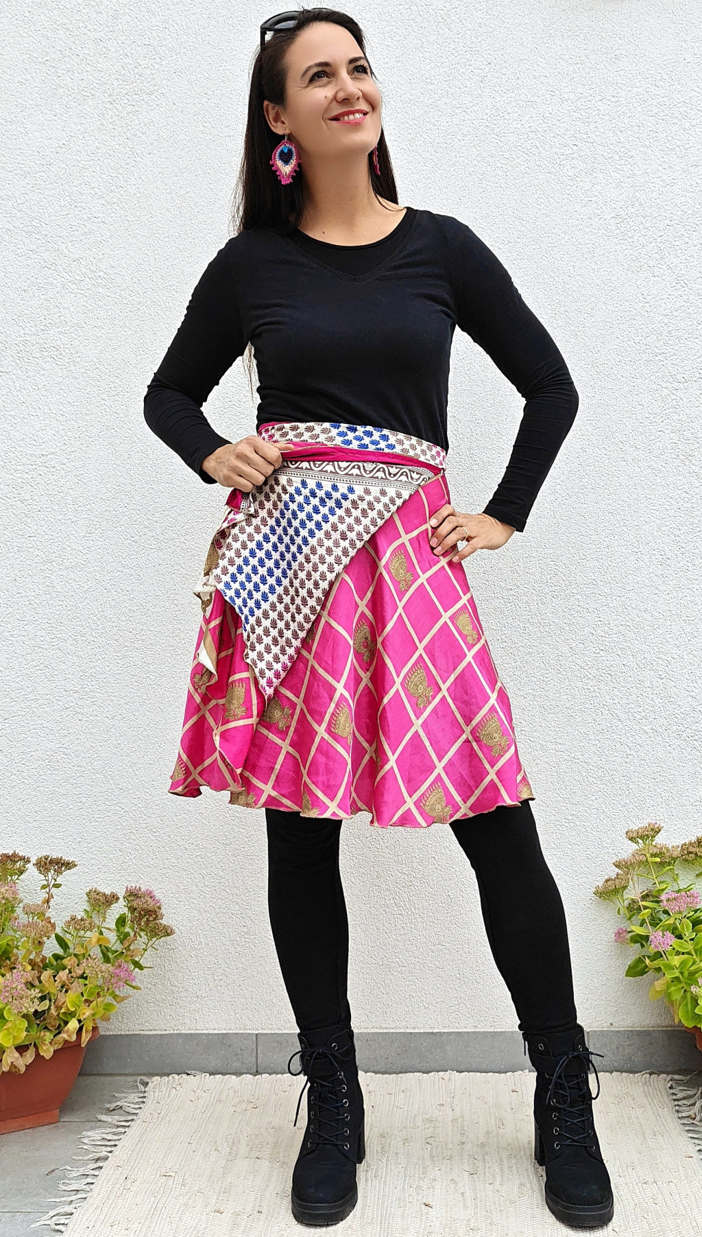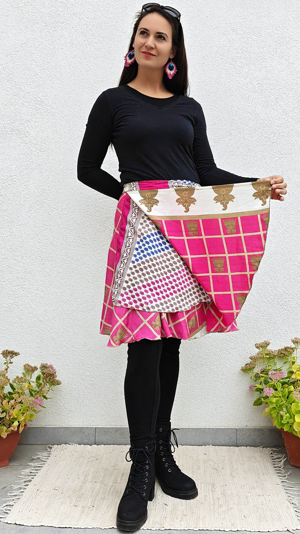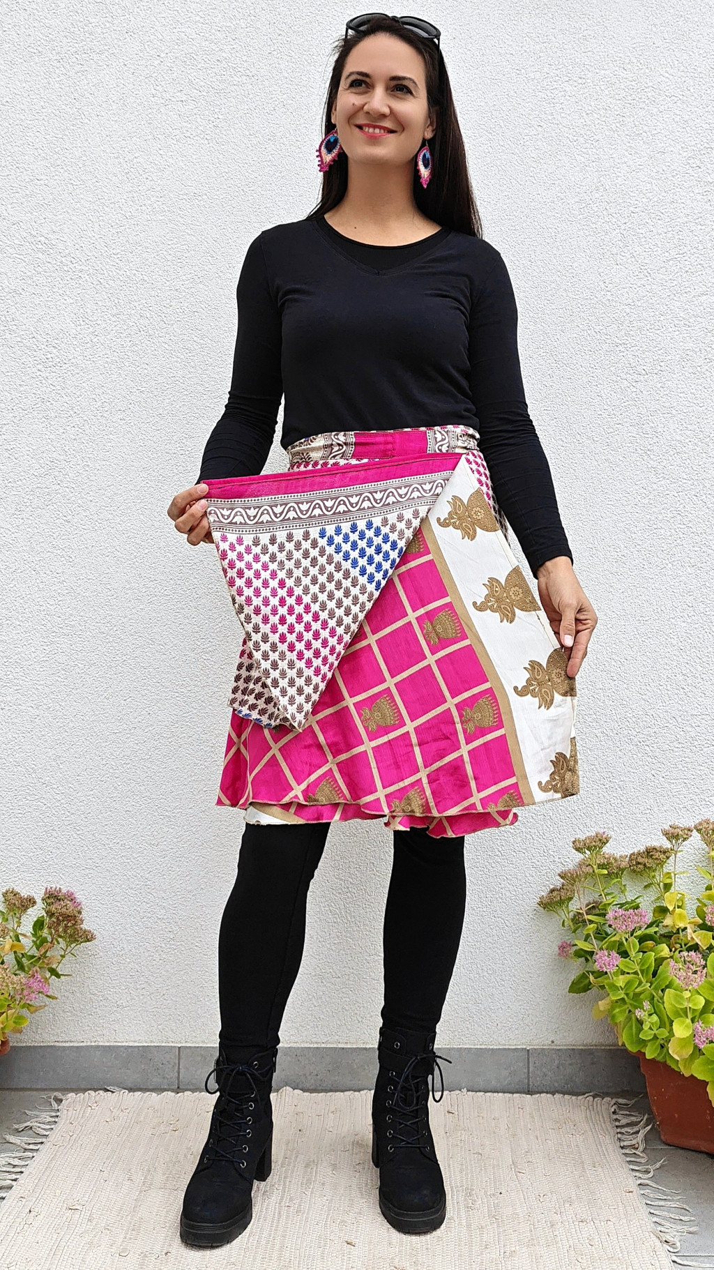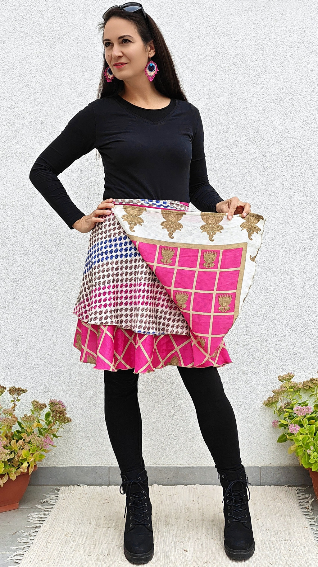 Lapszoknyáink újrahasznosított szárikból készülnek Indiában, egy hosszabb és egy rövidebb anyag derékban összevarrva! Két oldalú, kifordítható, mindkét oldala hordható, sokféleképpen köthető, variálható. Szoknyáinkból nincs két egyforma, mindegyikből csak EGY darab van, ha megtetszik, csapj le rá!