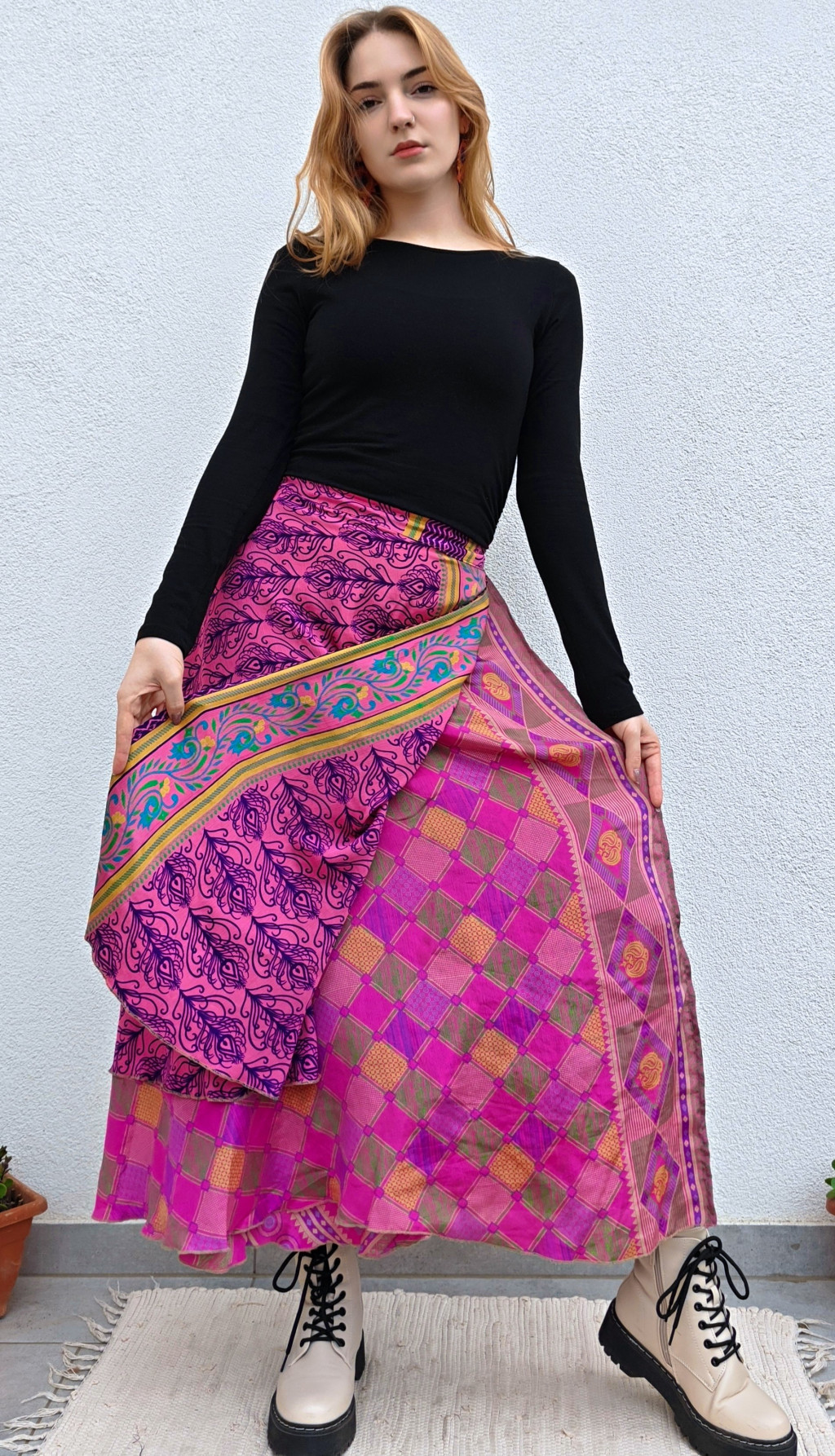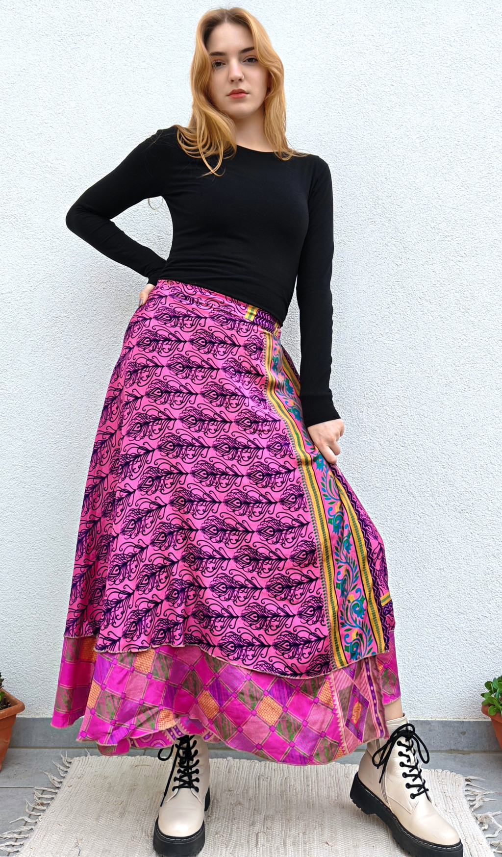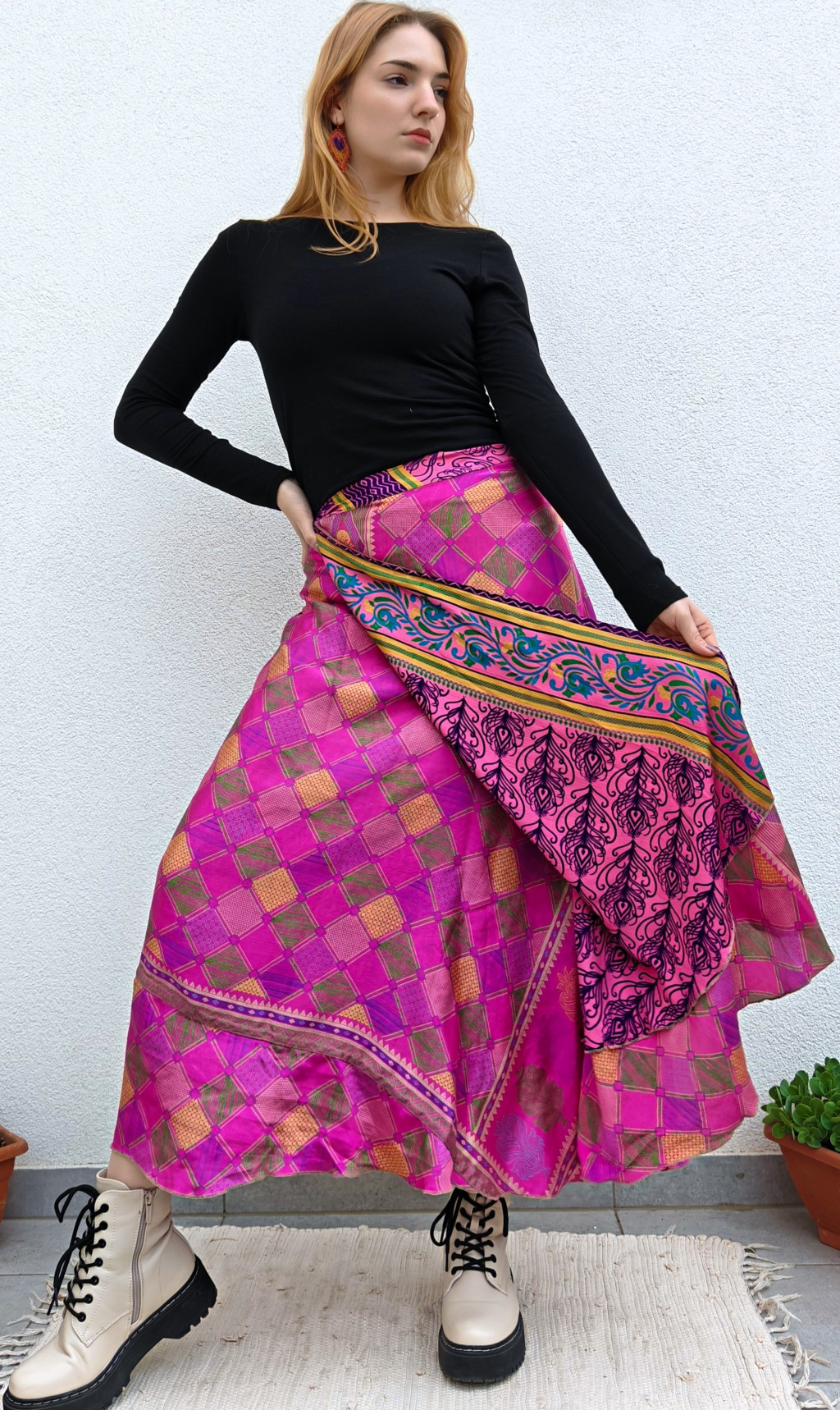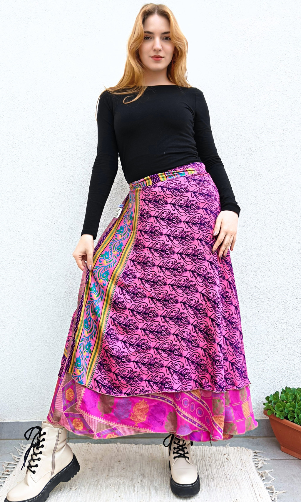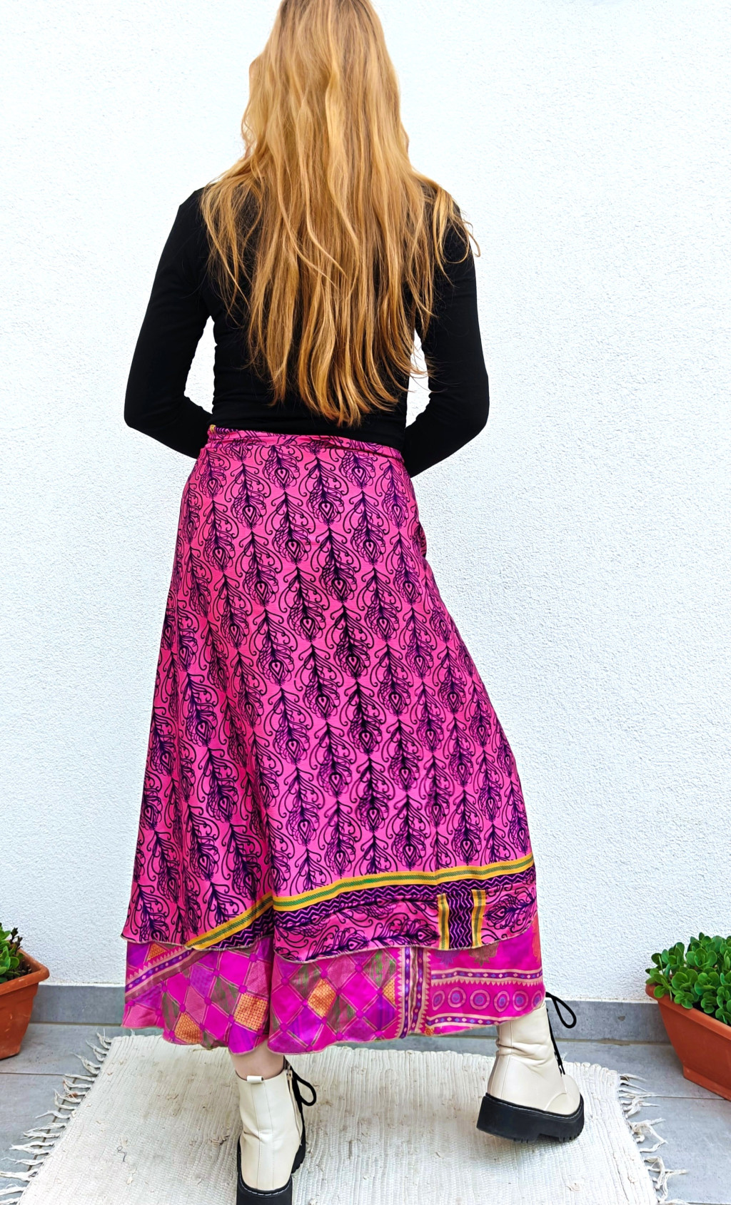 Lapszoknyáink újrahasznosított szárikból készülnek Indiában, egy hosszabb és egy rövidebb anyag derékban összevarrva! Két oldalú, kifordítható, mindkét oldala hordható, sokféleképpen köthető, variálható. Szoknyáinkból nincs két egyforma, mindegyikből csak EGY darab van, ha megtetszik, csapj le rá!