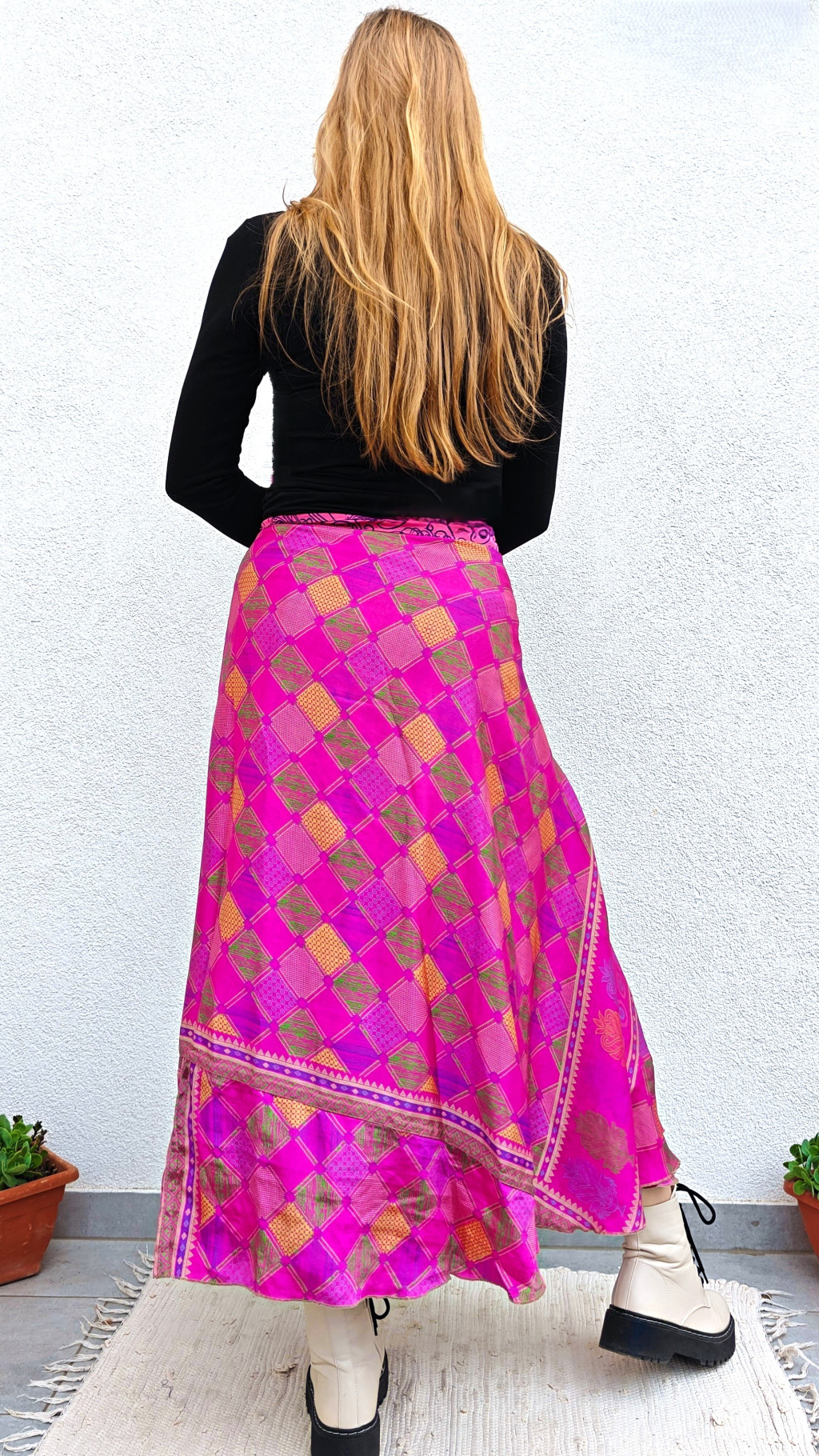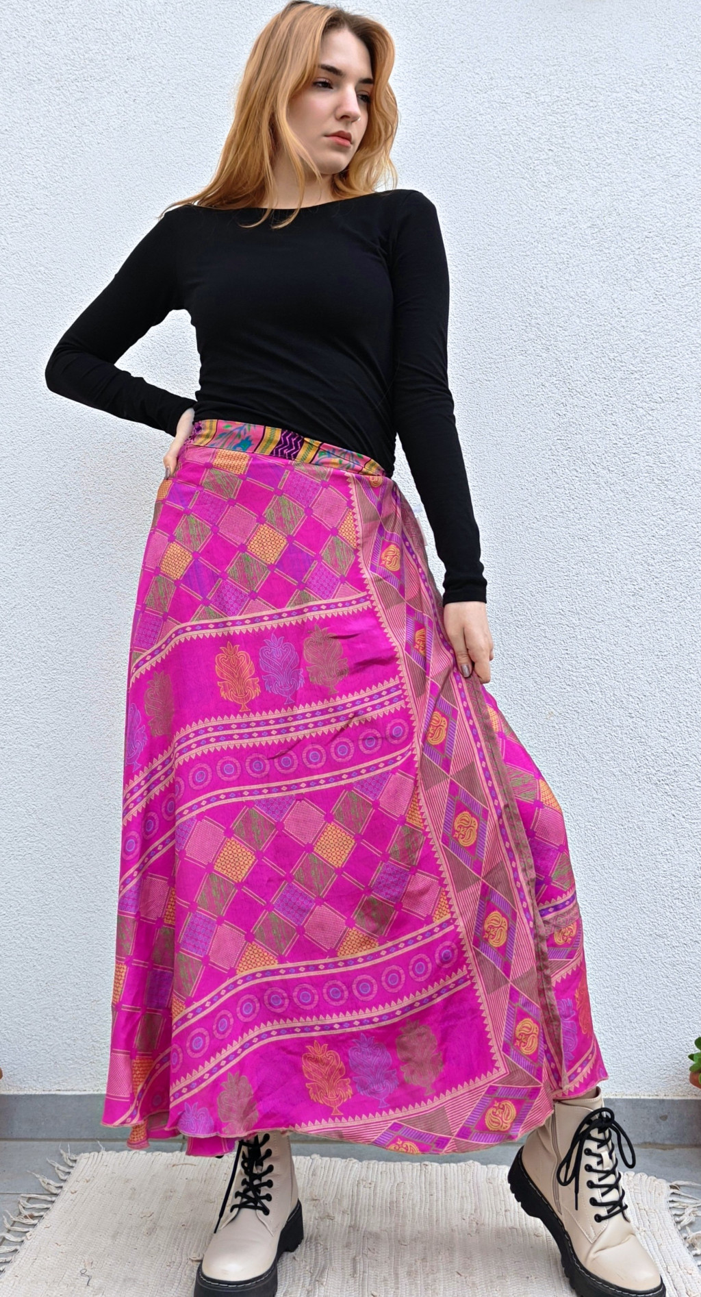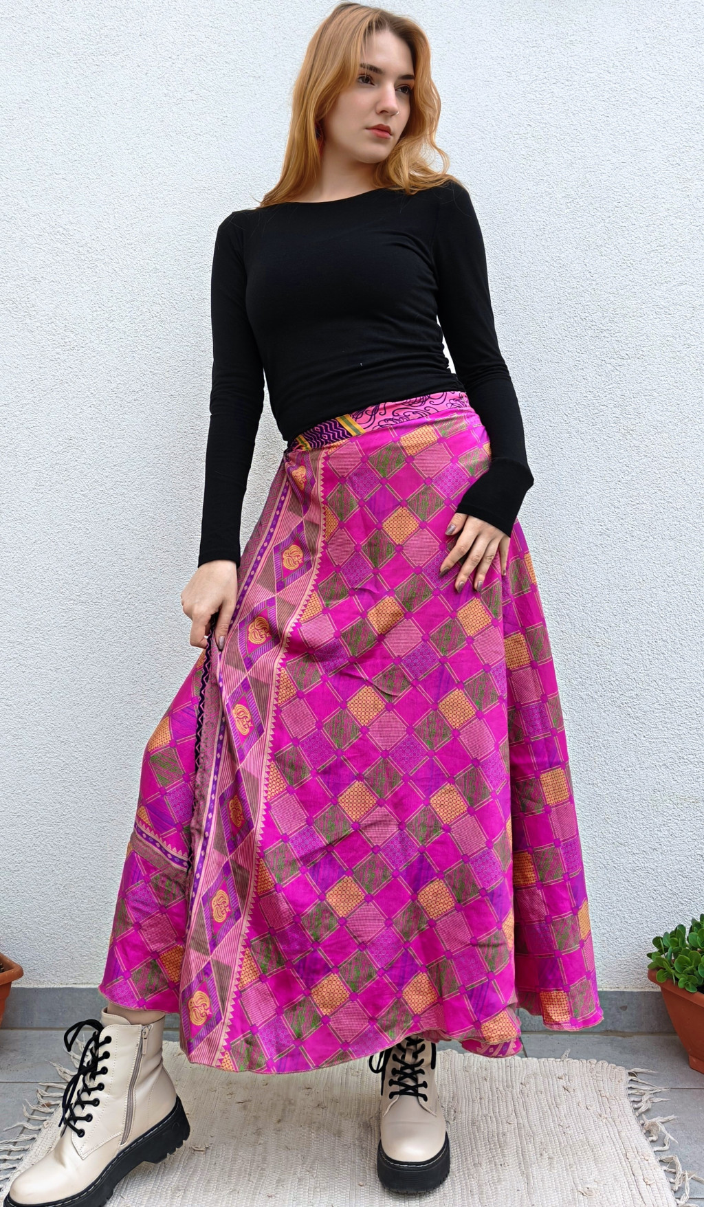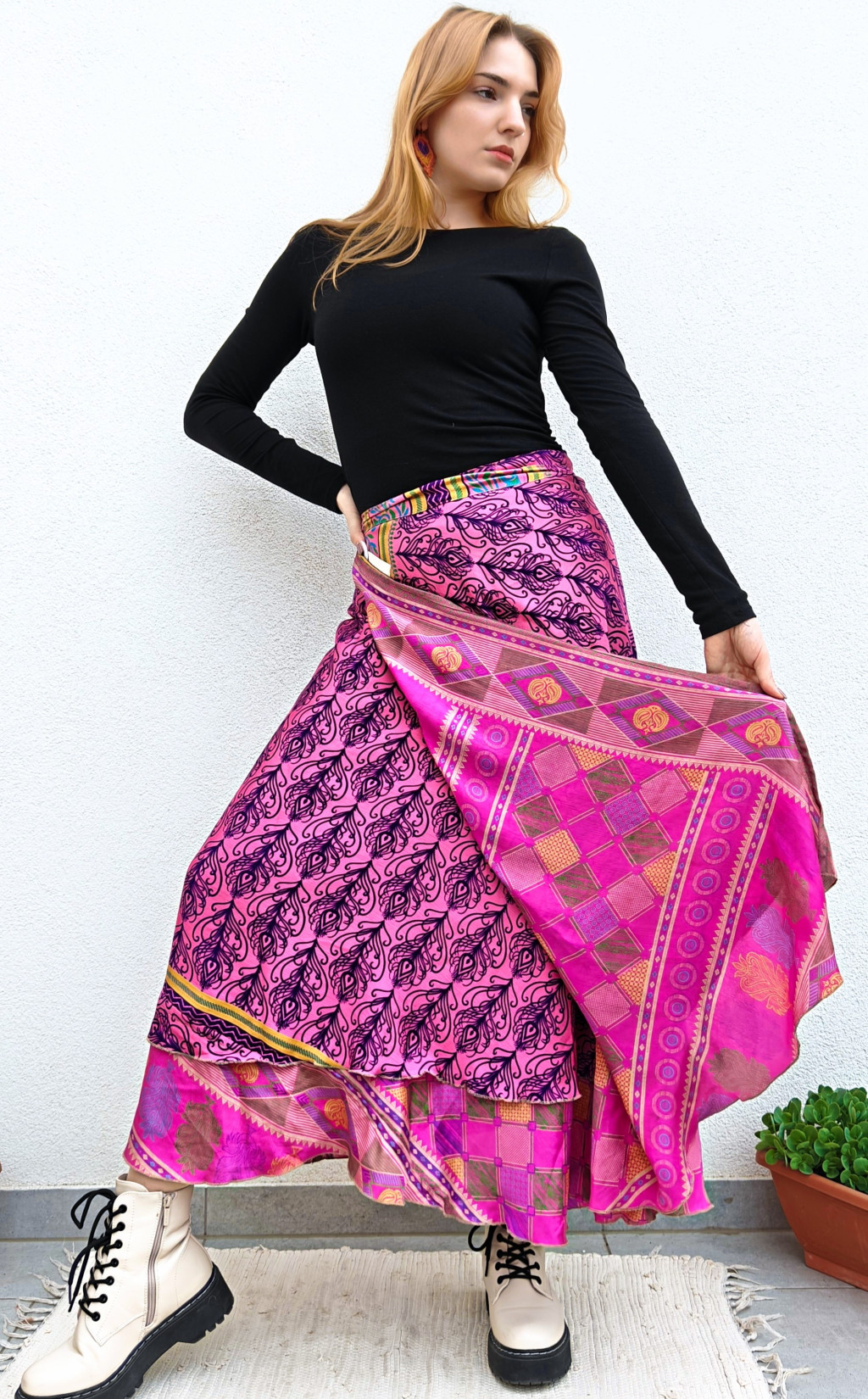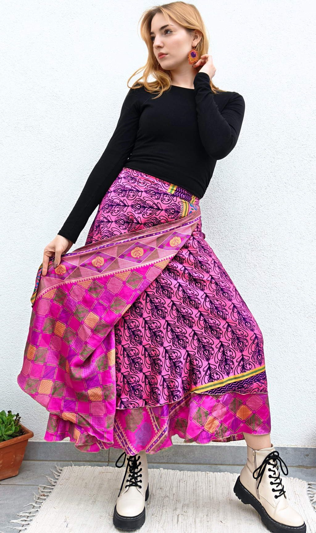 Lapszoknyáink újrahasznosított szárikból készülnek Indiában, egy hosszabb és egy rövidebb anyag derékban összevarrva! Két oldalú, kifordítható, mindkét oldala hordható, sokféleképpen köthető, variálható. Szoknyáinkból nincs két egyforma, mindegyikből csak EGY darab van, ha megtetszik, csapj le rá!