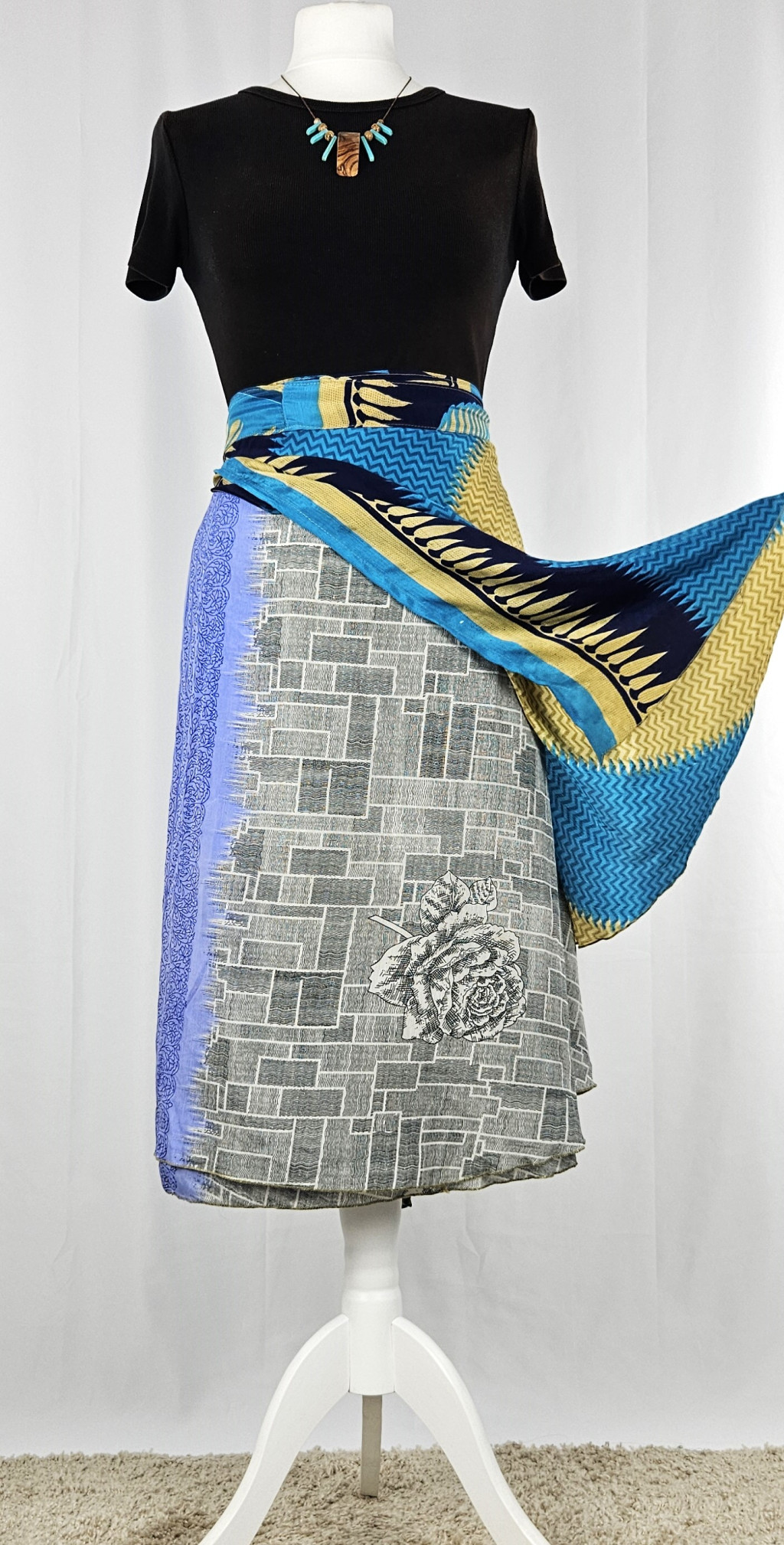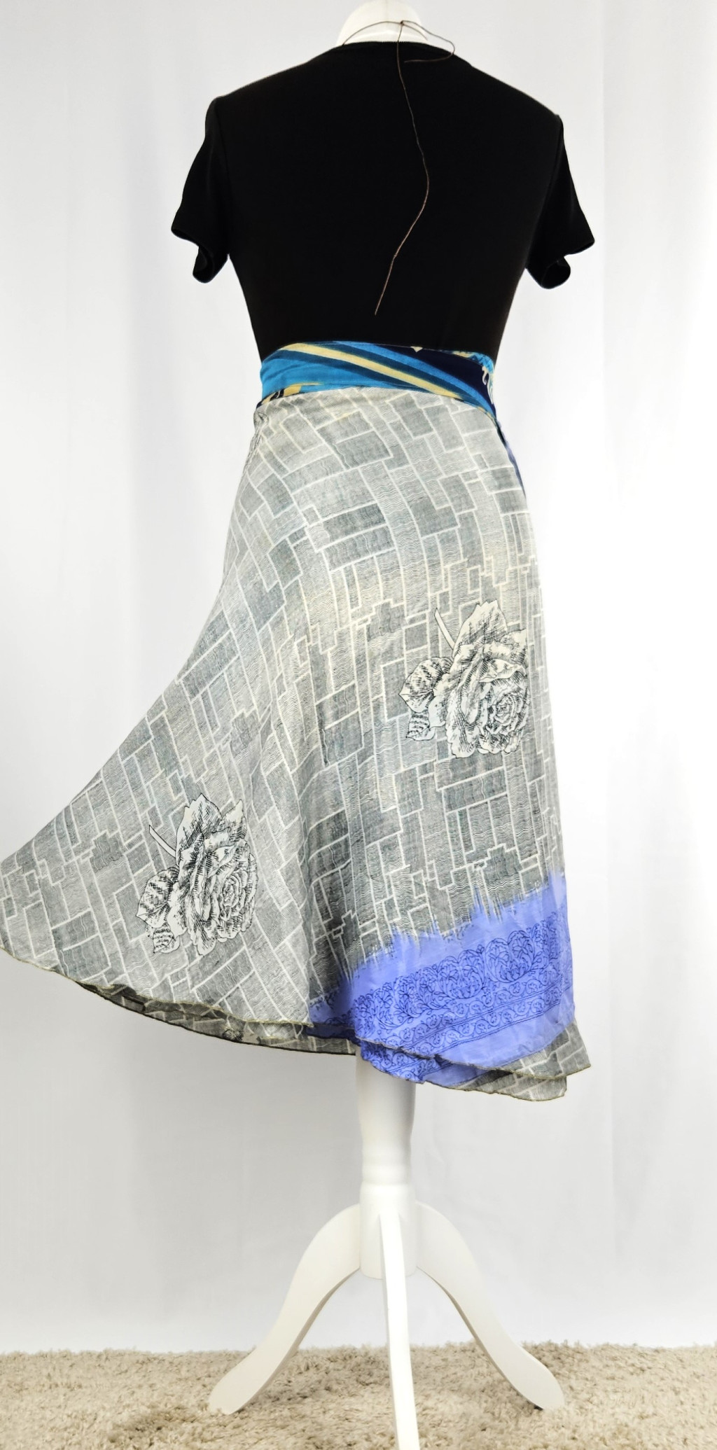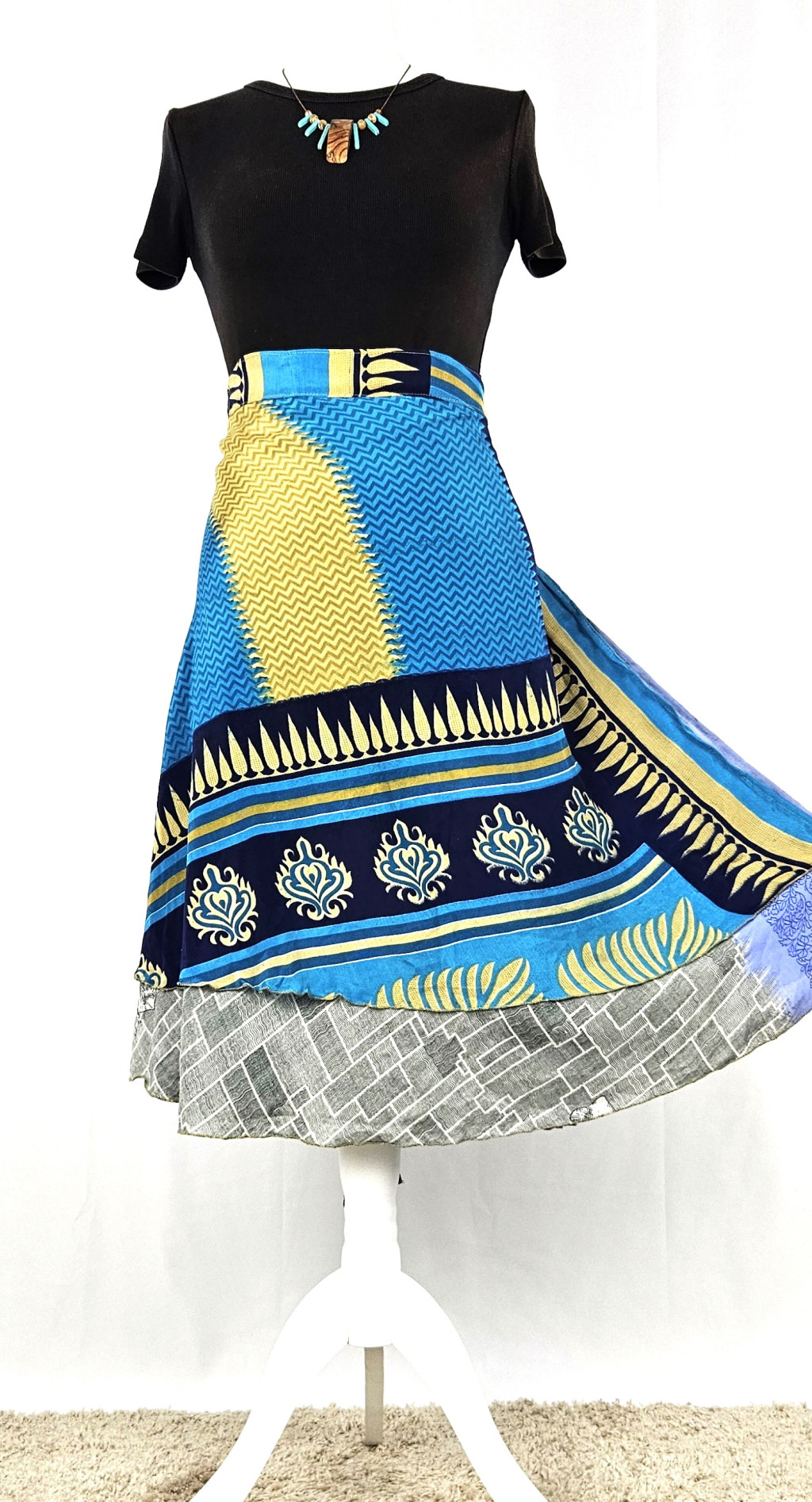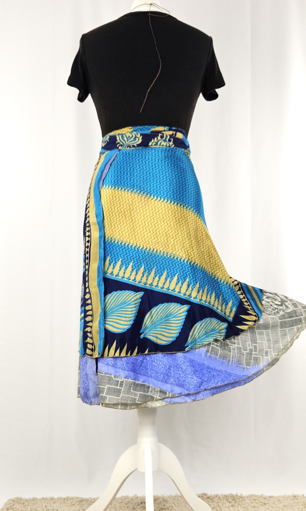 Lapszoknyáink újrahasznosított szárikból készülnek Indiában, egy hosszabb és egy rövidebb anyag derékban összevarrva! Kifordítható, mindkét oldala hordható, sokféleképpen köthető, variálható. Szoknyáinkból nincs két egyforma, mindegyikből csak EGY darab van, ha megtetszik, csapj le rá!
