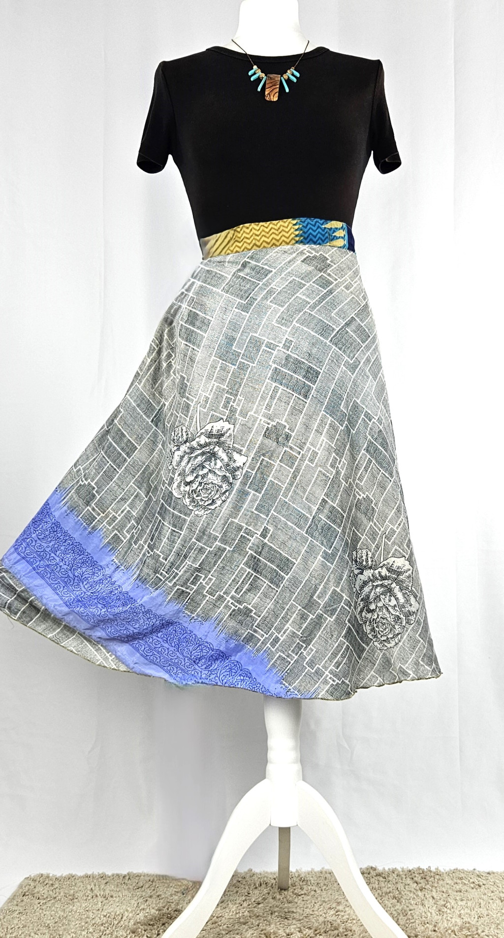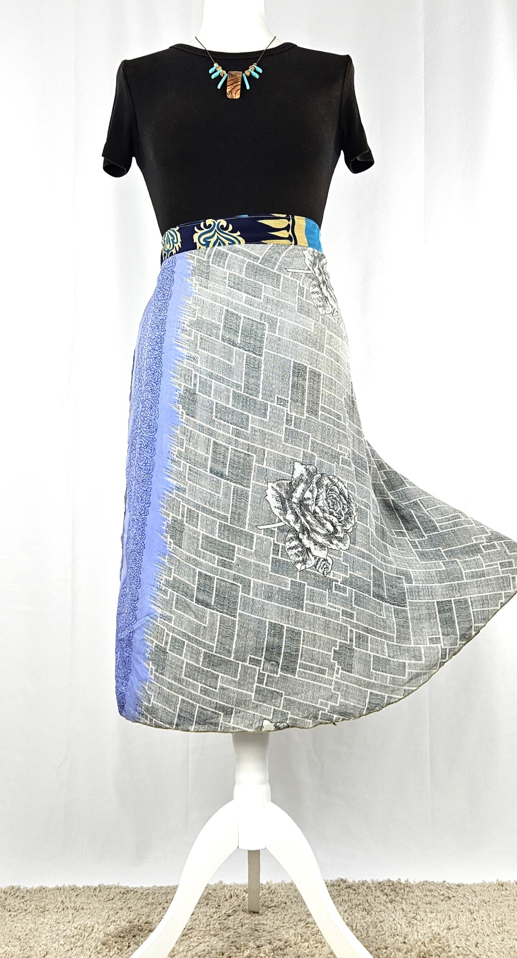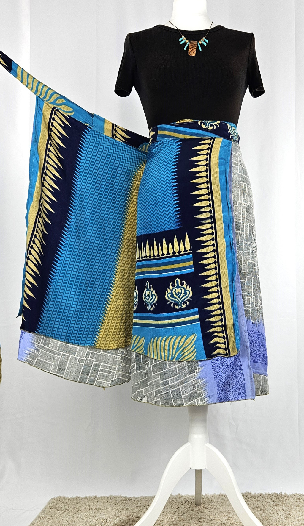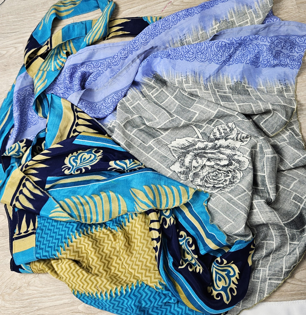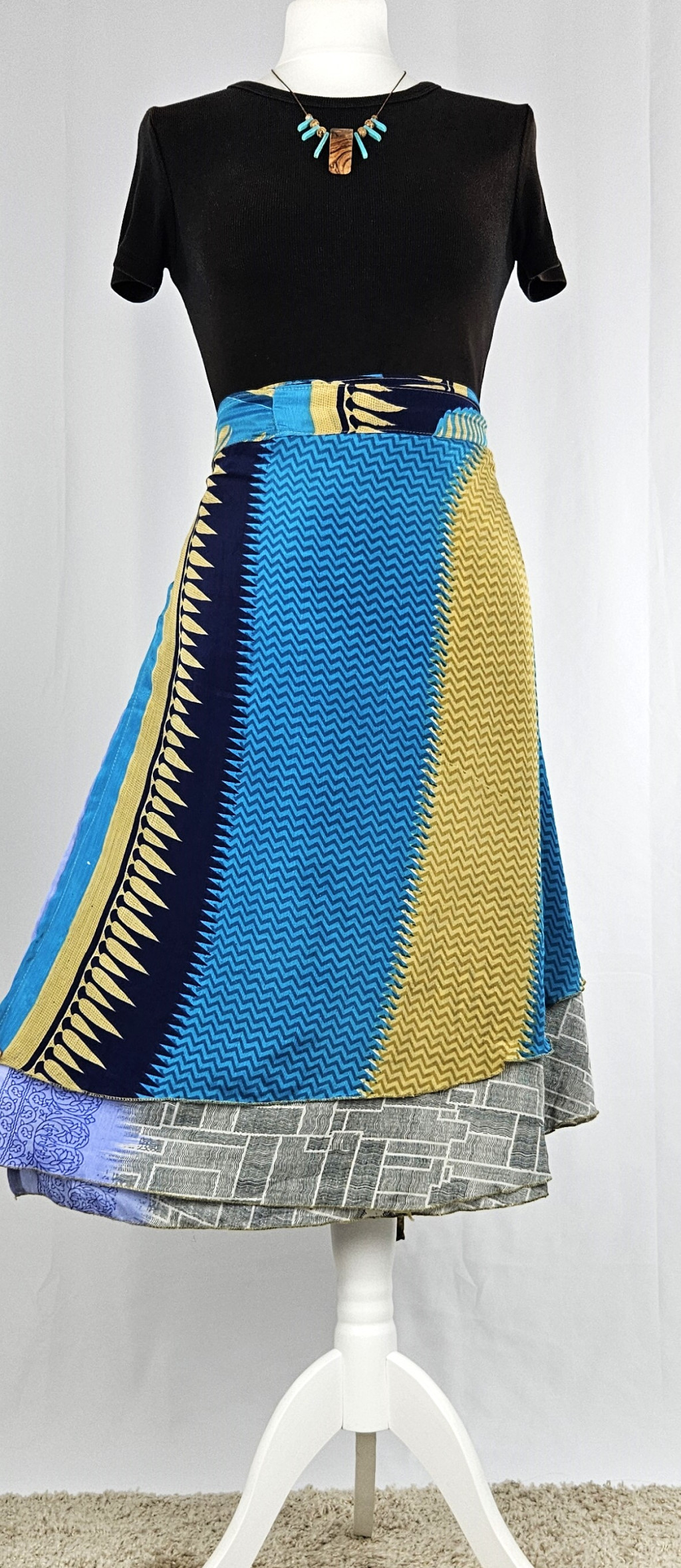 Lapszoknyáink újrahasznosított szárikból készülnek Indiában, egy hosszabb és egy rövidebb anyag derékban összevarrva! Kifordítható, mindkét oldala hordható, sokféleképpen köthető, variálható. Szoknyáinkból nincs két egyforma, mindegyikből csak EGY darab van, ha megtetszik, csapj le rá!
