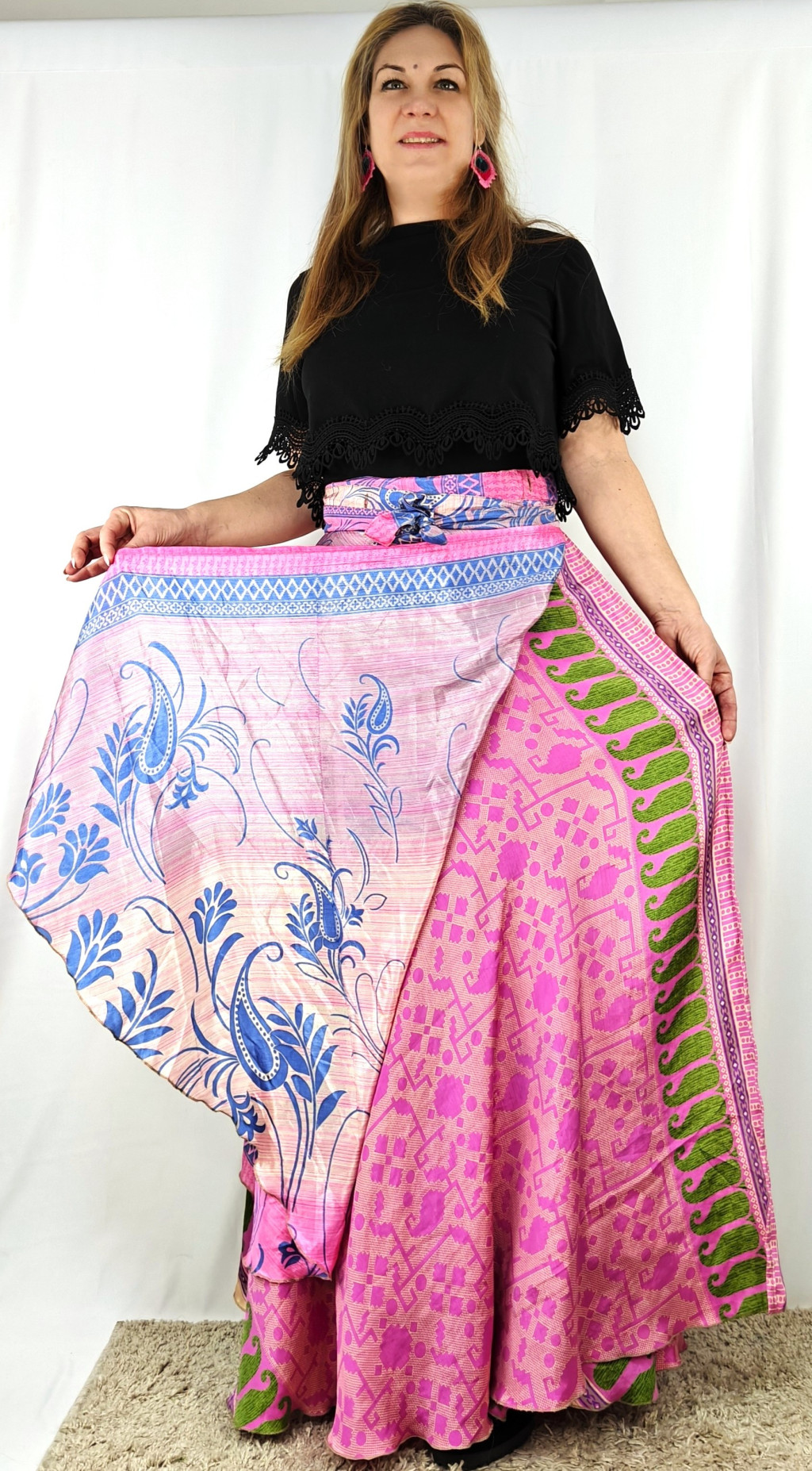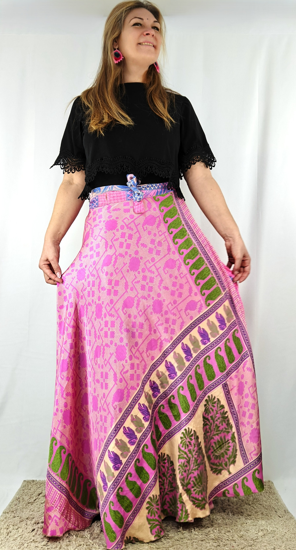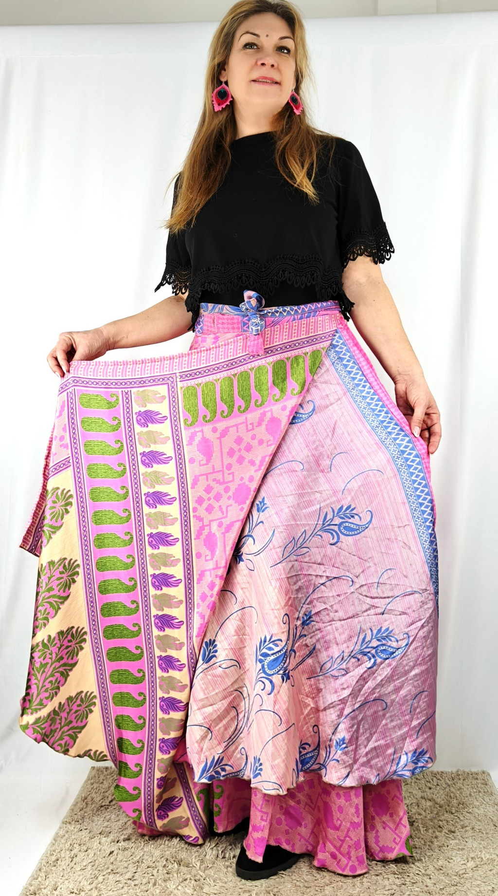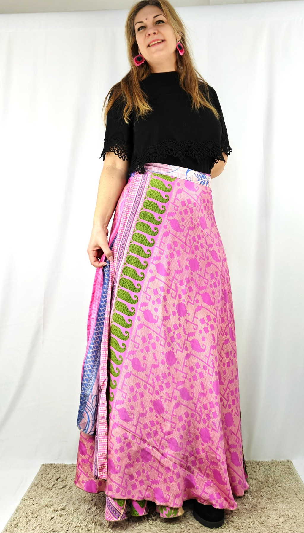 Lapszoknyáink újrahasznosított szárikból készülnek Indiában, egy hosszabb és egy rövidebb anyag derékban összevarrva! Két oldalú, kifordítható, mindkét oldala hordható, sokféleképpen köthető, variálható. Szoknyáinkból nincs két egyforma, mindegyikből csak EGY darab van, ha megtetszik, csapj le rá!