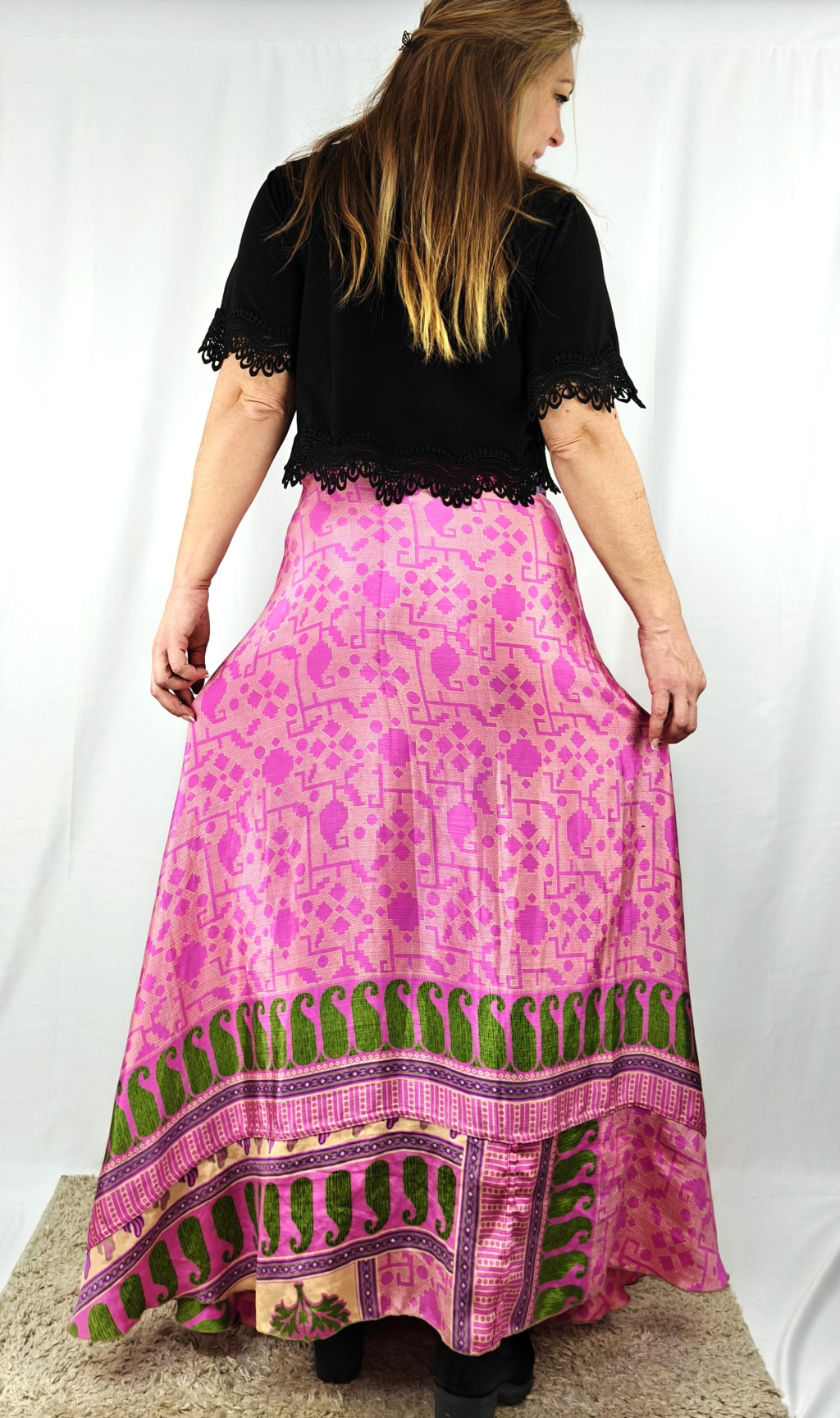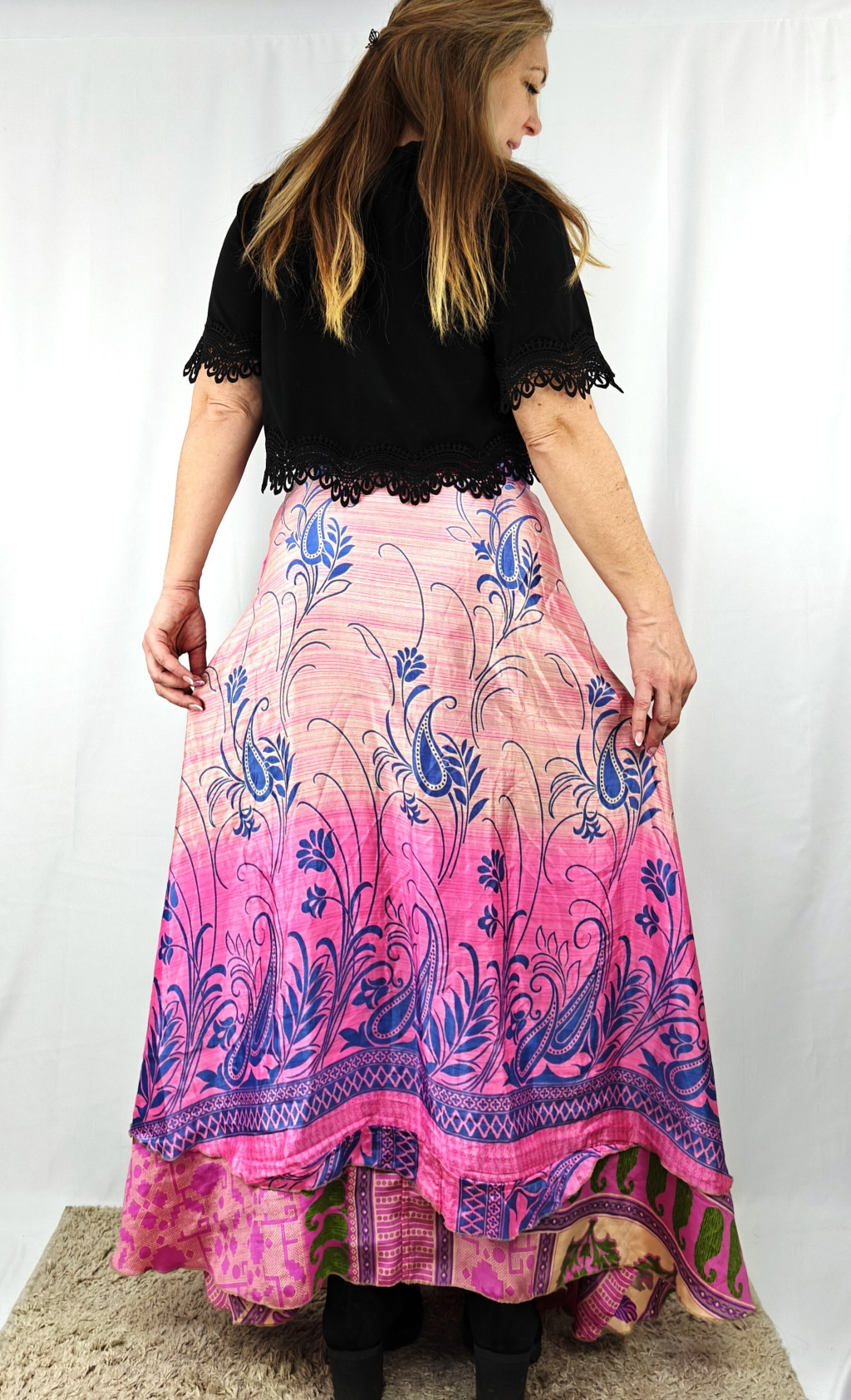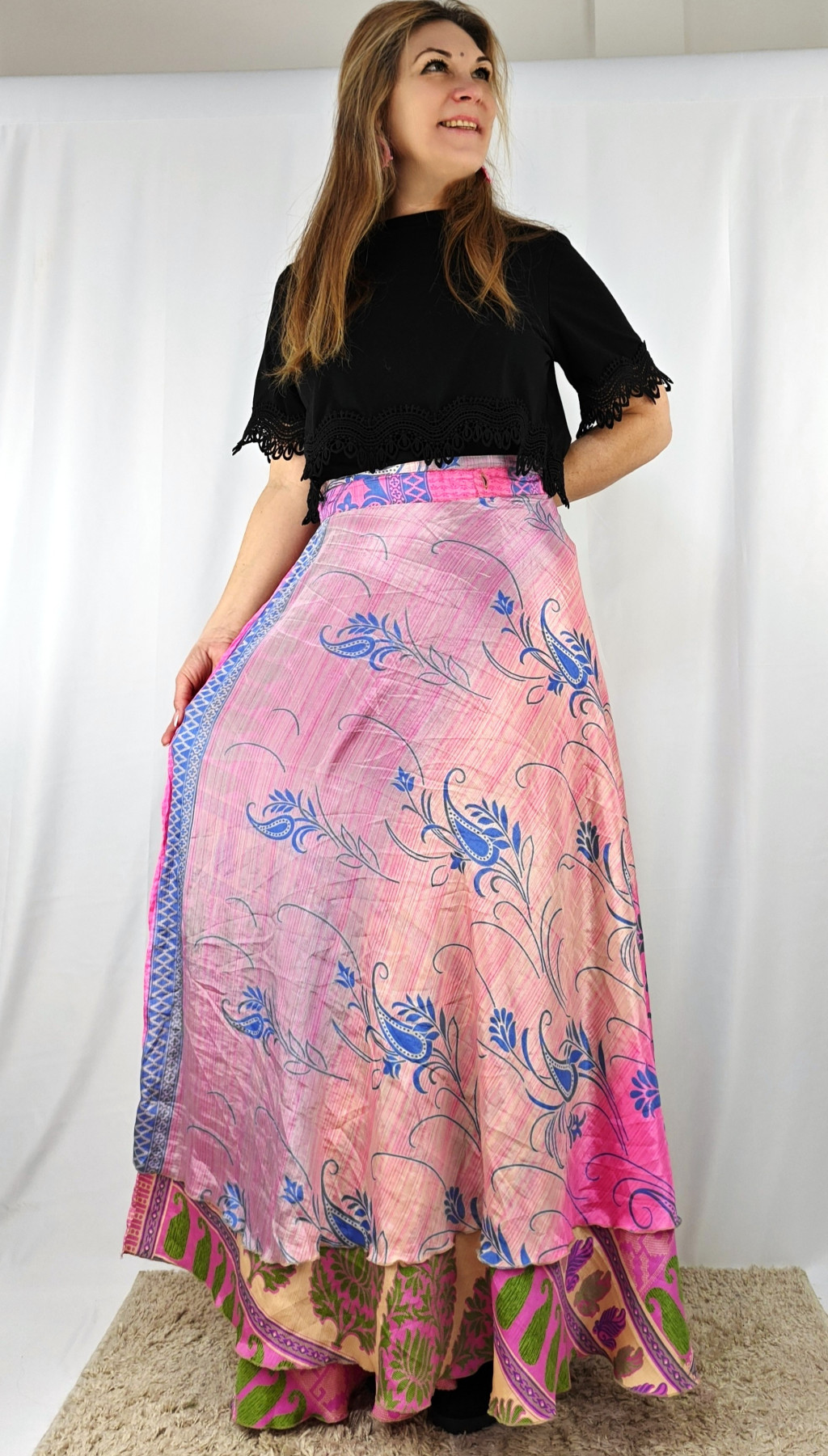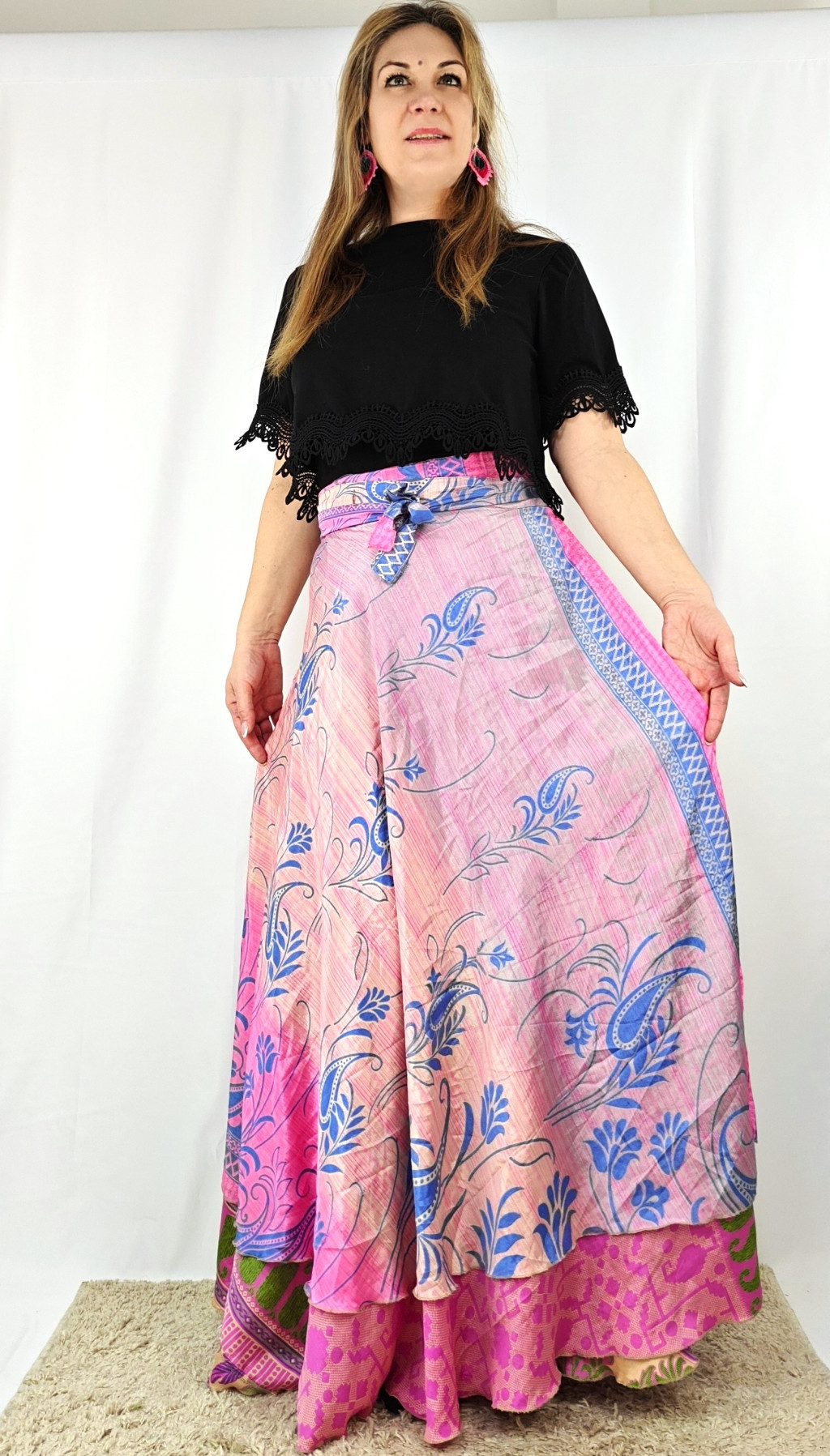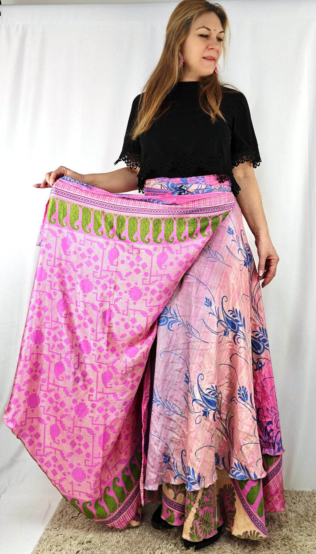 Lapszoknyáink újrahasznosított szárikból készülnek Indiában, egy hosszabb és egy rövidebb anyag derékban összevarrva! Két oldalú, kifordítható, mindkét oldala hordható, sokféleképpen köthető, variálható. Szoknyáinkból nincs két egyforma, mindegyikből csak EGY darab van, ha megtetszik, csapj le rá!