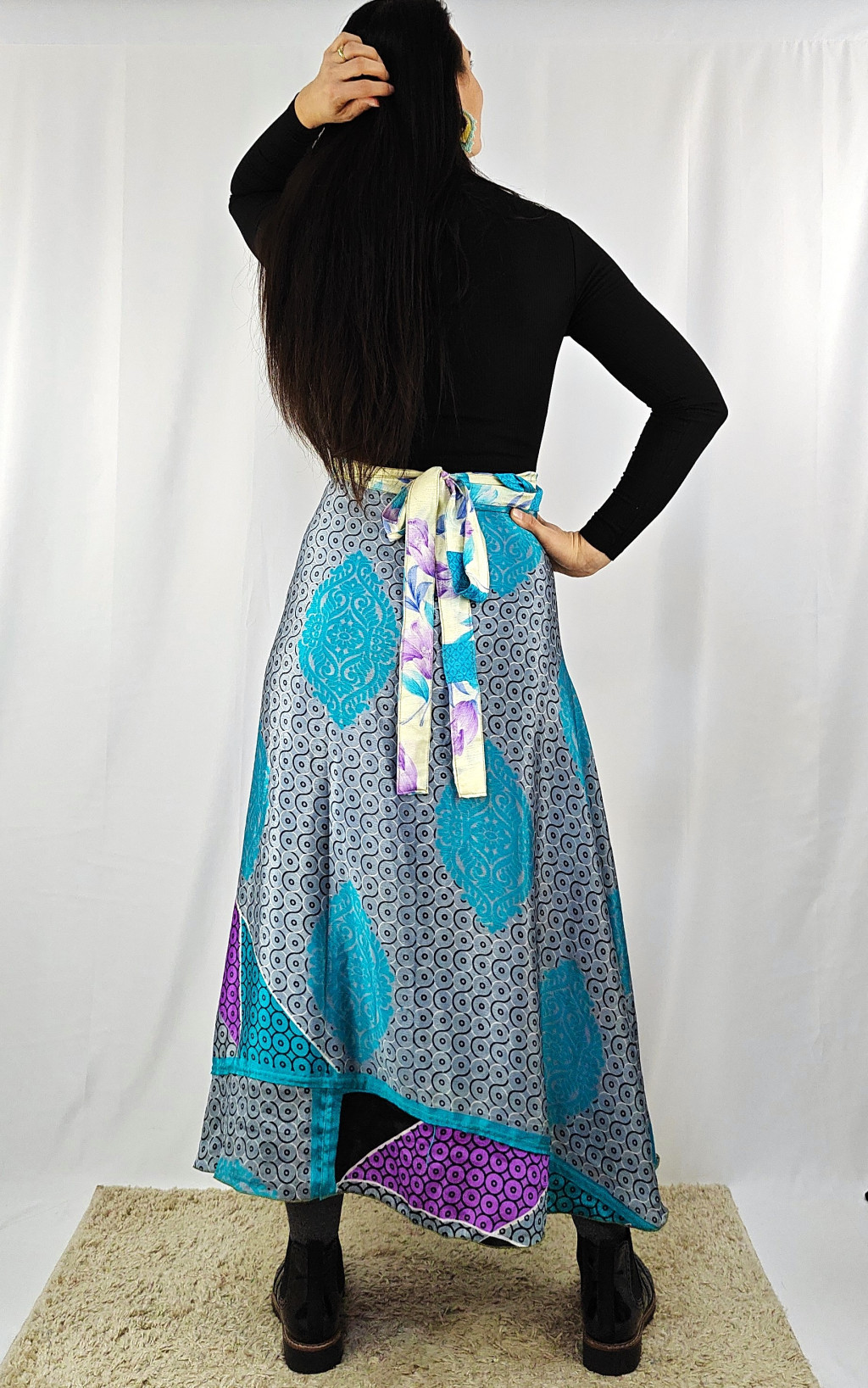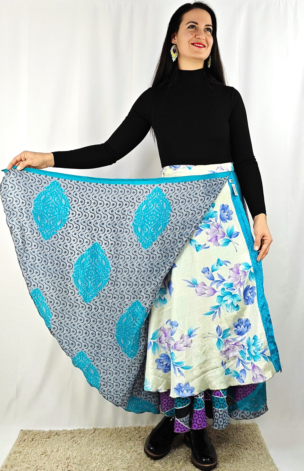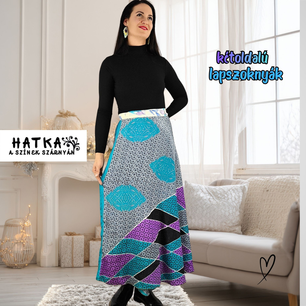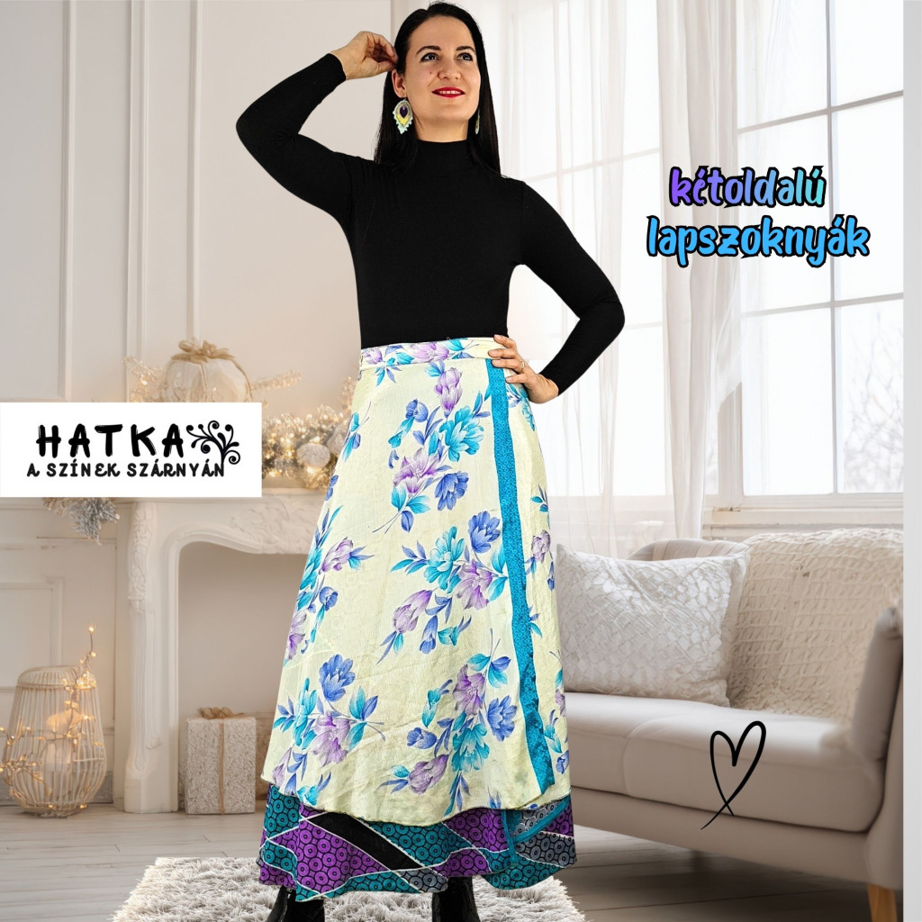 Lapszoknyáink újrahasznosított szárikból készülnek Indiában, egy hosszabb és egy rövidebb anyag derékban összevarrva! Két oldalú, kifordítható, mindkét oldala hordható, sokféleképpen köthető, variálható. Szoknyáinkból nincs két egyforma, mindegyikből csak EGY darab van, ha megtetszik, csapj le rá!