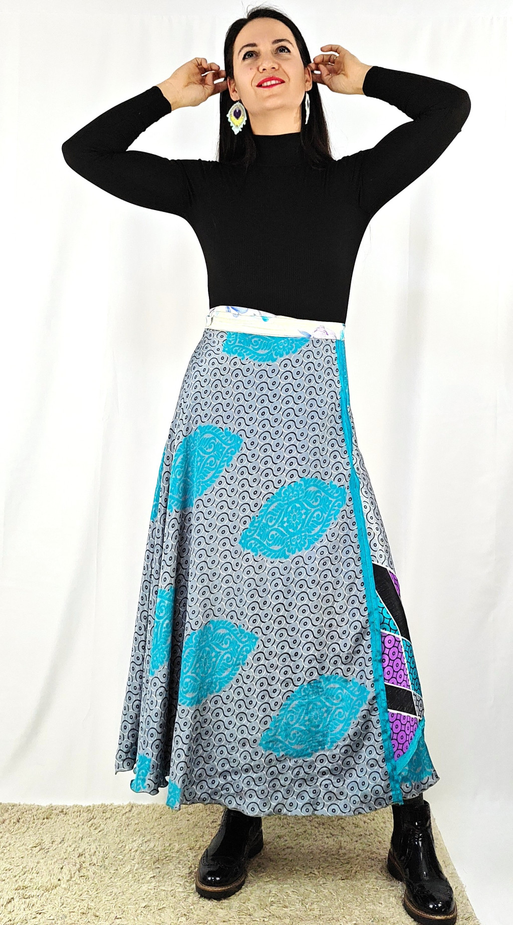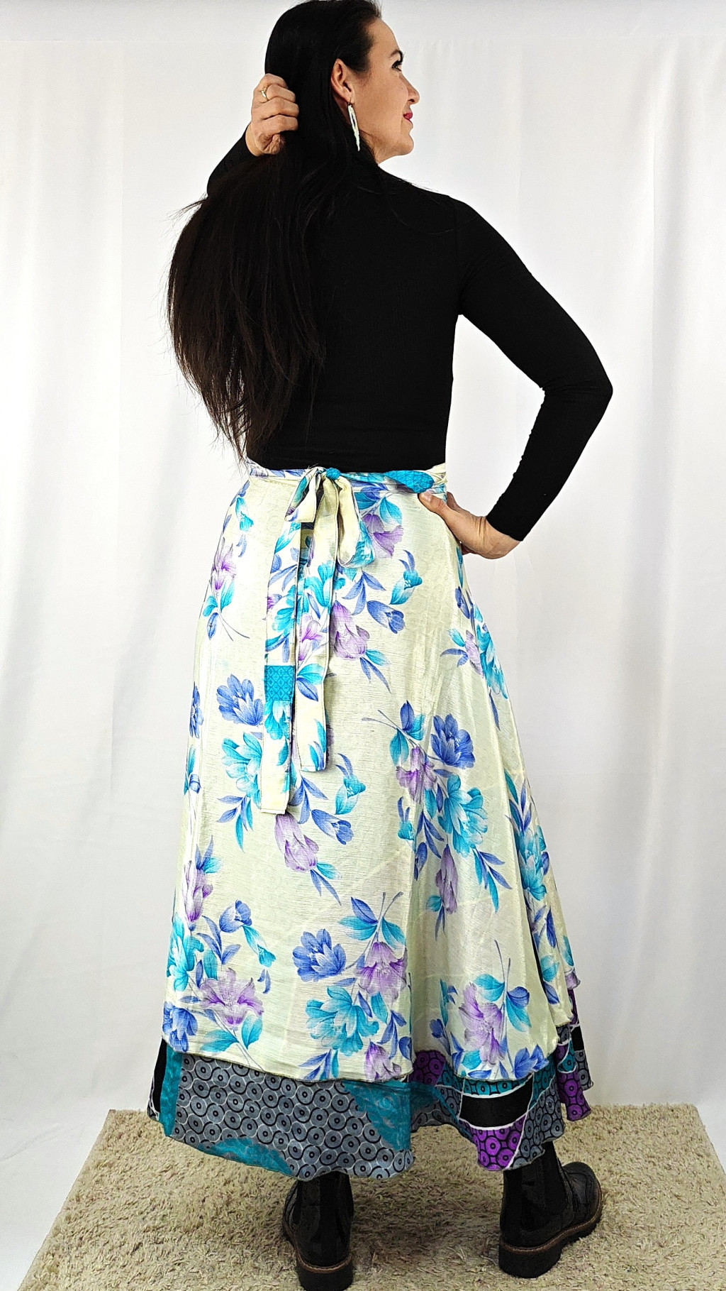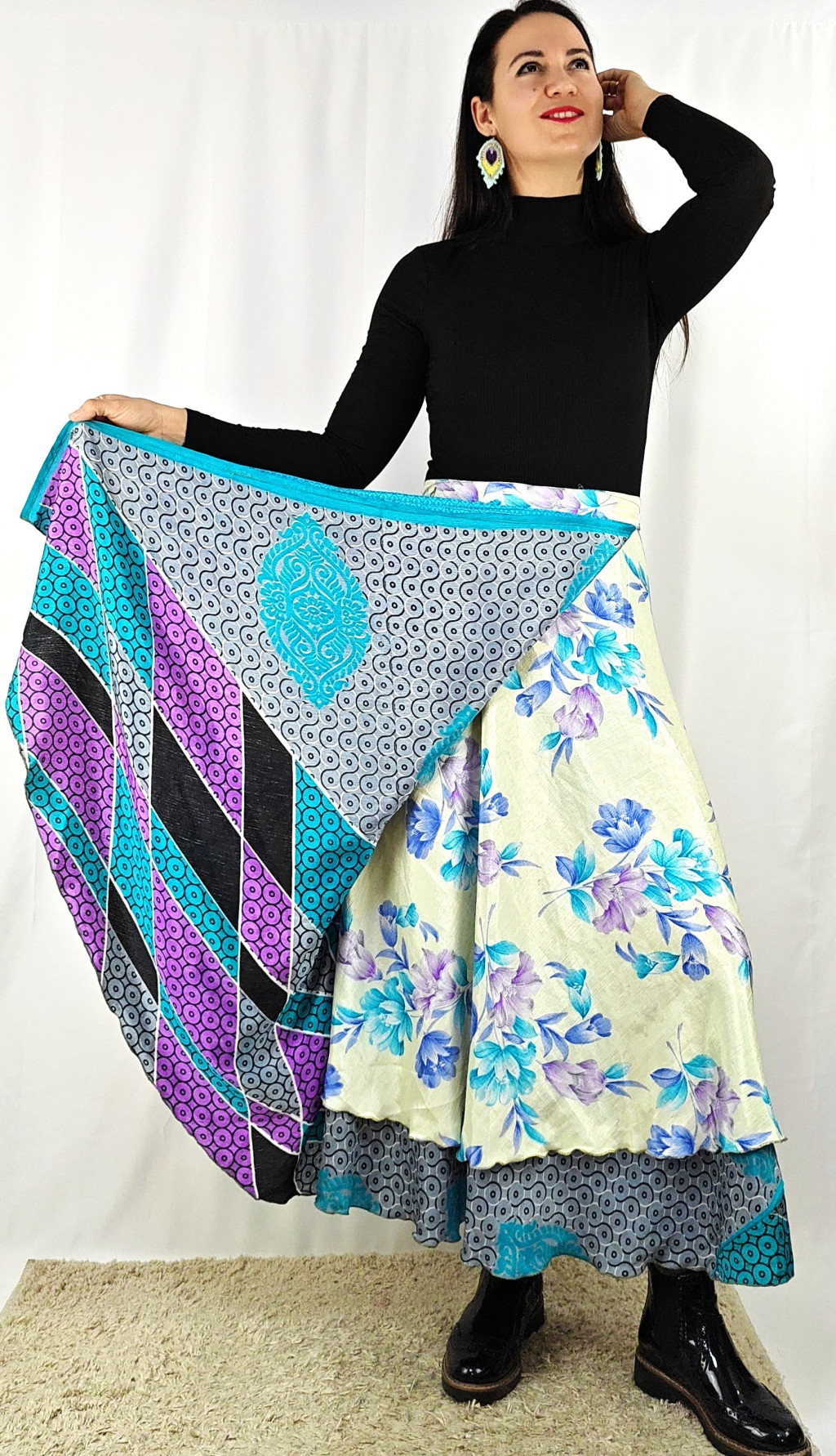 Lapszoknyáink újrahasznosított szárikból készülnek Indiában, egy hosszabb és egy rövidebb anyag derékban összevarrva! Két oldalú, kifordítható, mindkét oldala hordható, sokféleképpen köthető, variálható. Szoknyáinkból nincs két egyforma, mindegyikből csak EGY darab van, ha megtetszik, csapj le rá!