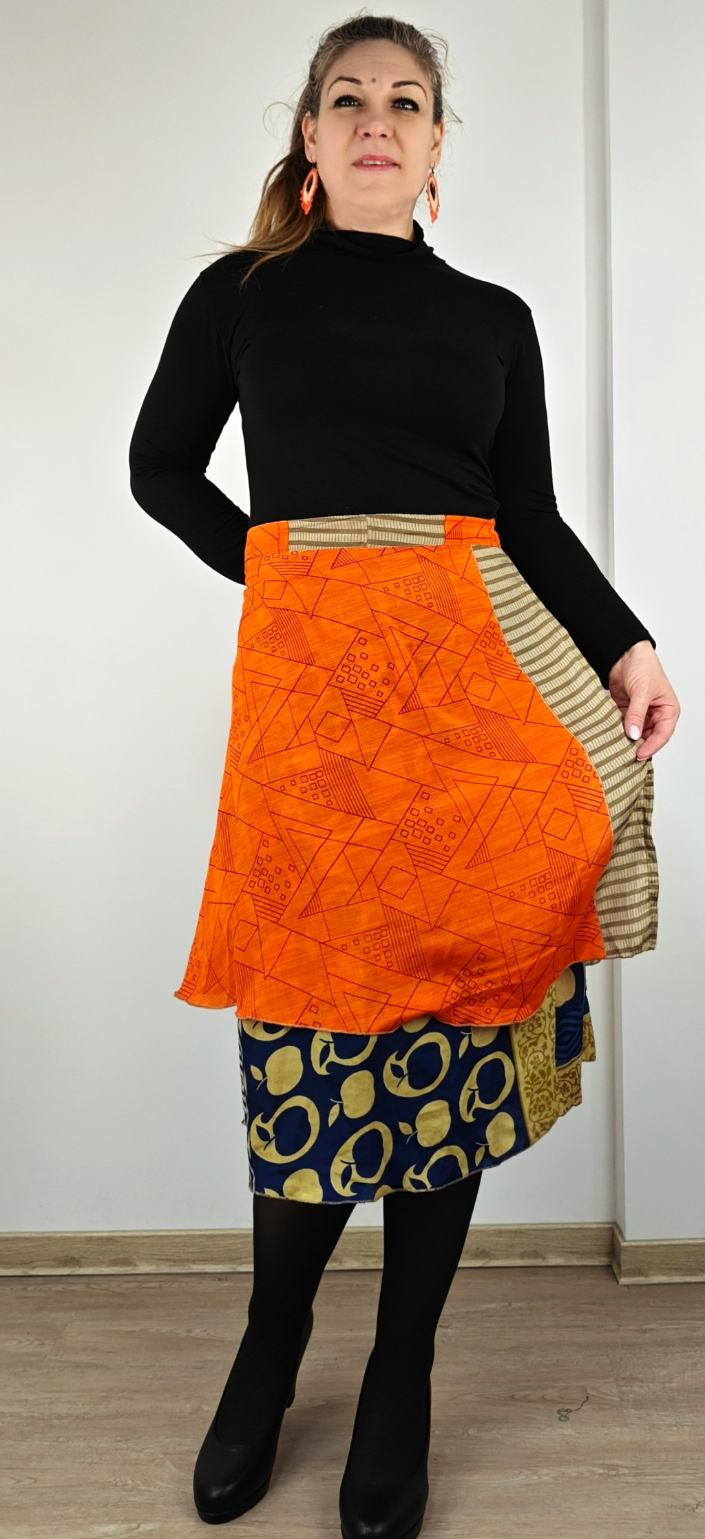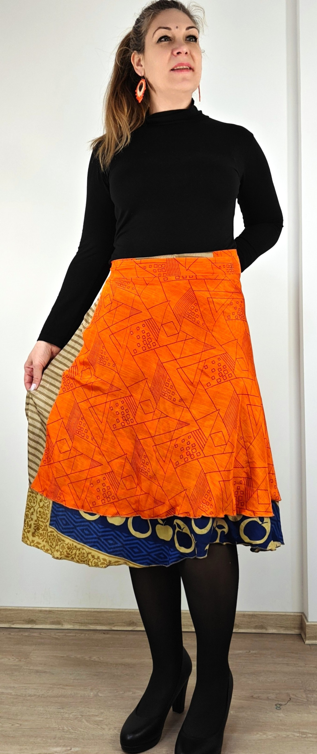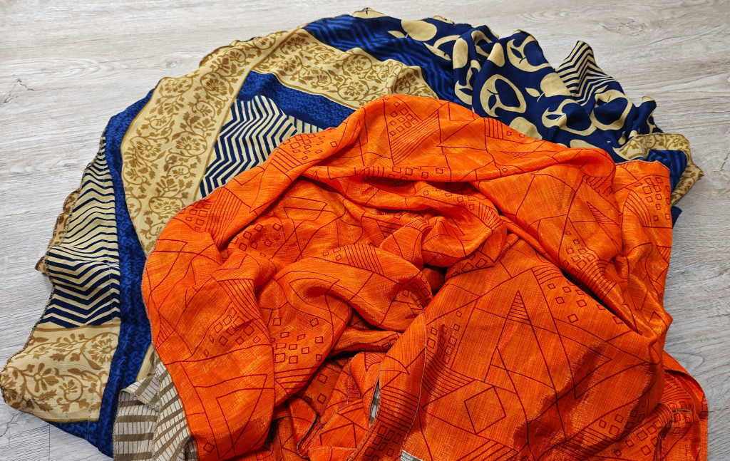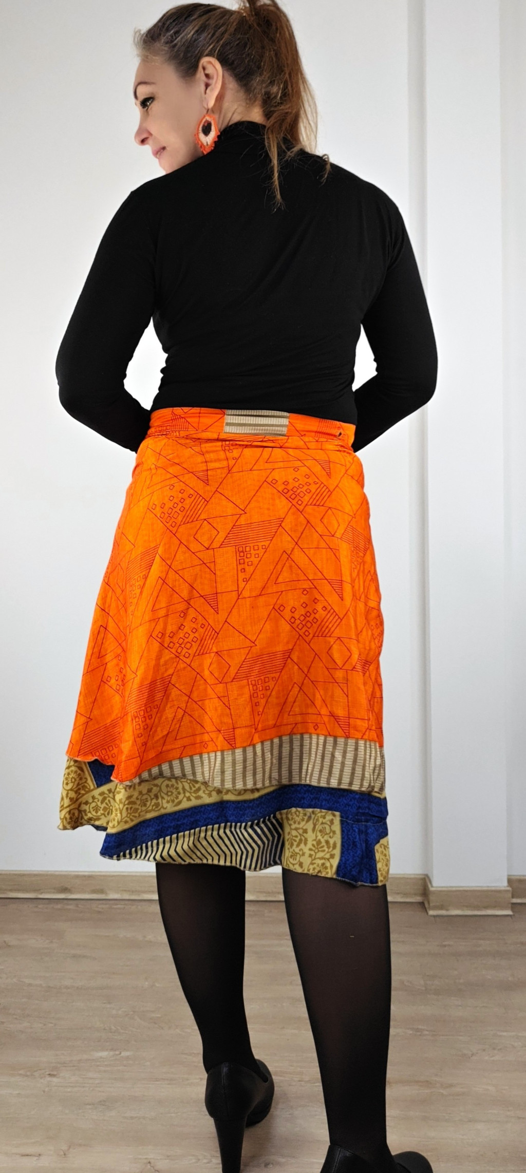 Lapszoknyáink újrahasznosított szárikból készülnek Indiában, egy hosszabb és egy rövidebb anyag derékban összevarrva! Két oldalú, kifordítható, mindkét oldala hordható, sokféleképpen köthető, variálható. Szoknyáinkból nincs két egyforma, mindegyikből csak EGY darab van, ha megtetszik, csapj le rá!
