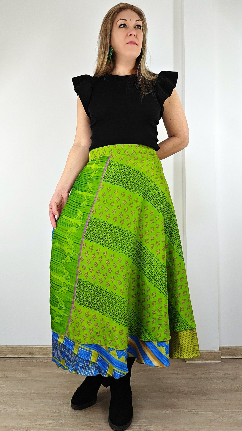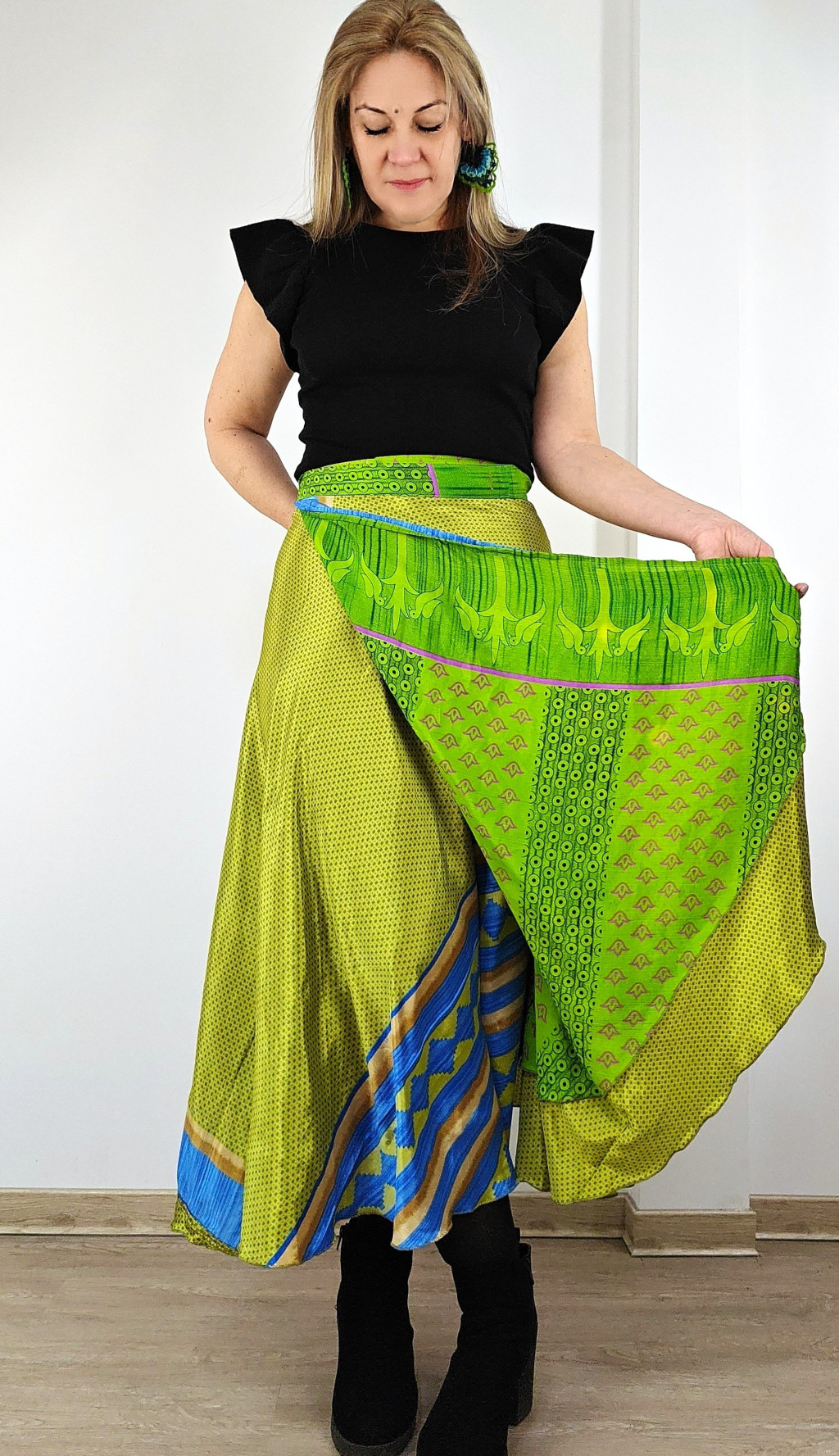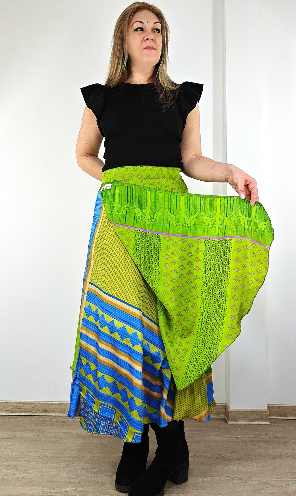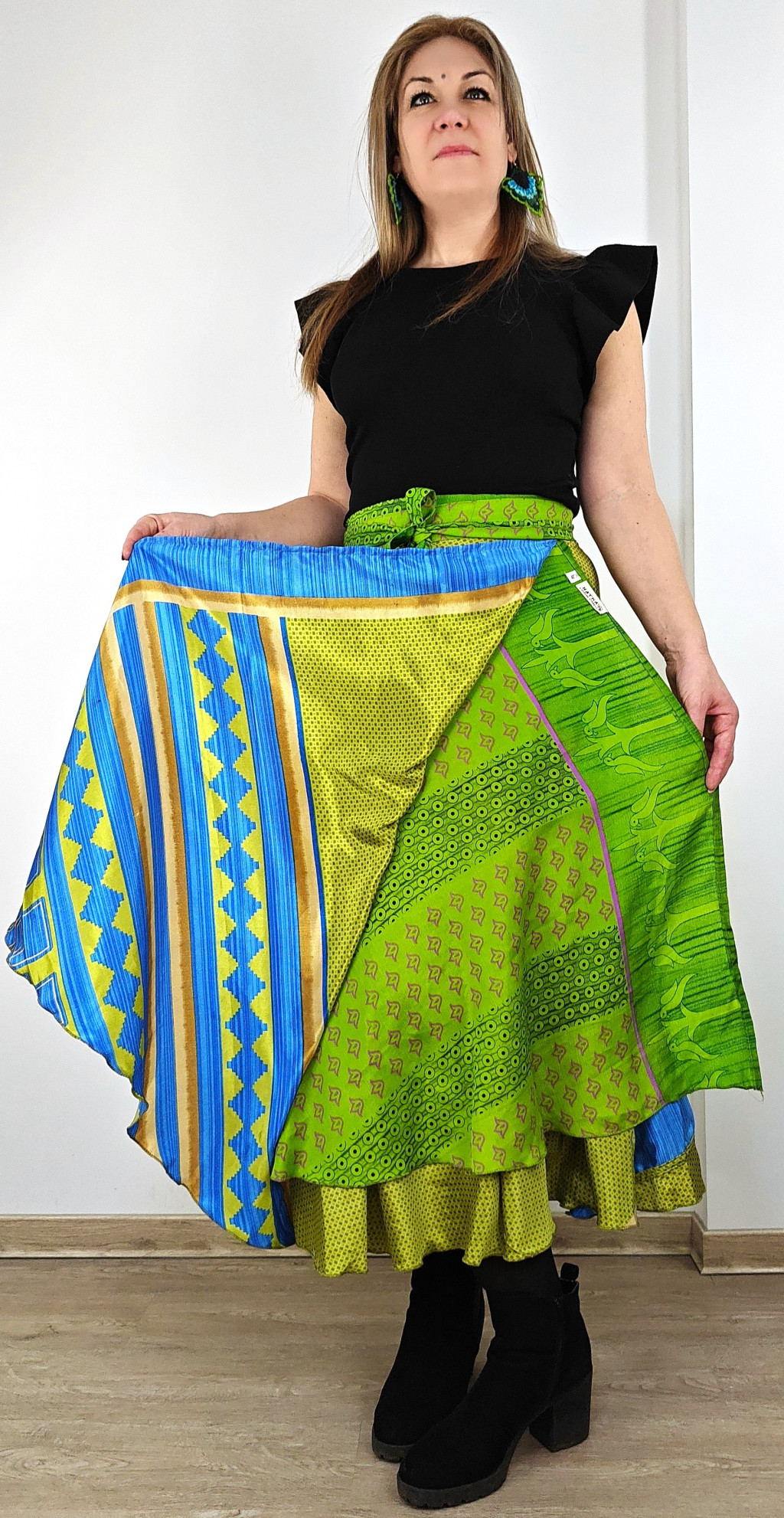 Lapszoknyáink újrahasznosított szárikból készülnek Indiában, egy hosszabb és egy rövidebb anyag derékban összevarrva! Két oldalú, kifordítható, mindkét oldala hordható, sokféleképpen köthető, variálható. Szoknyáinkból nincs két egyforma, mindegyikből csak EGY darab van, ha megtetszik, csapj le rá!