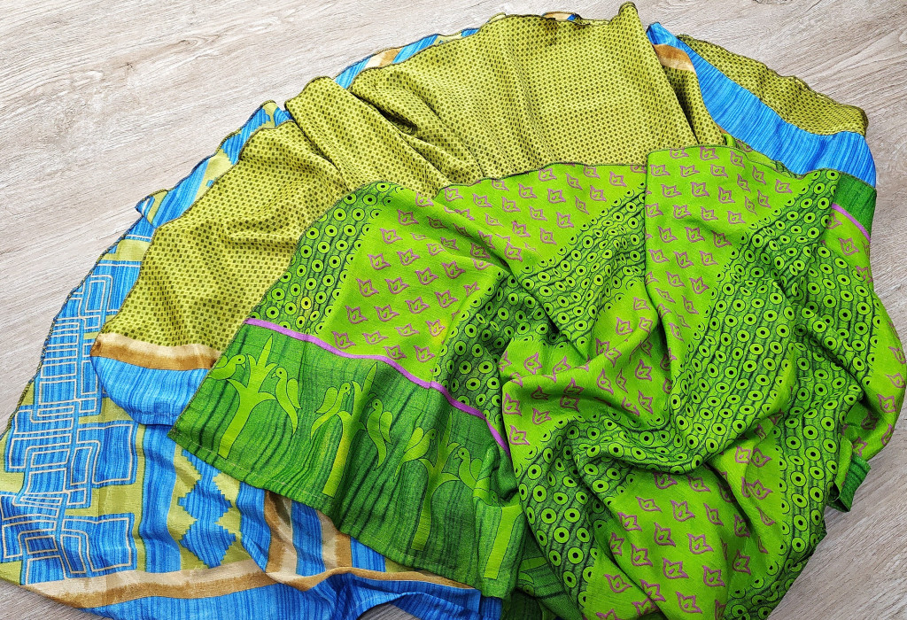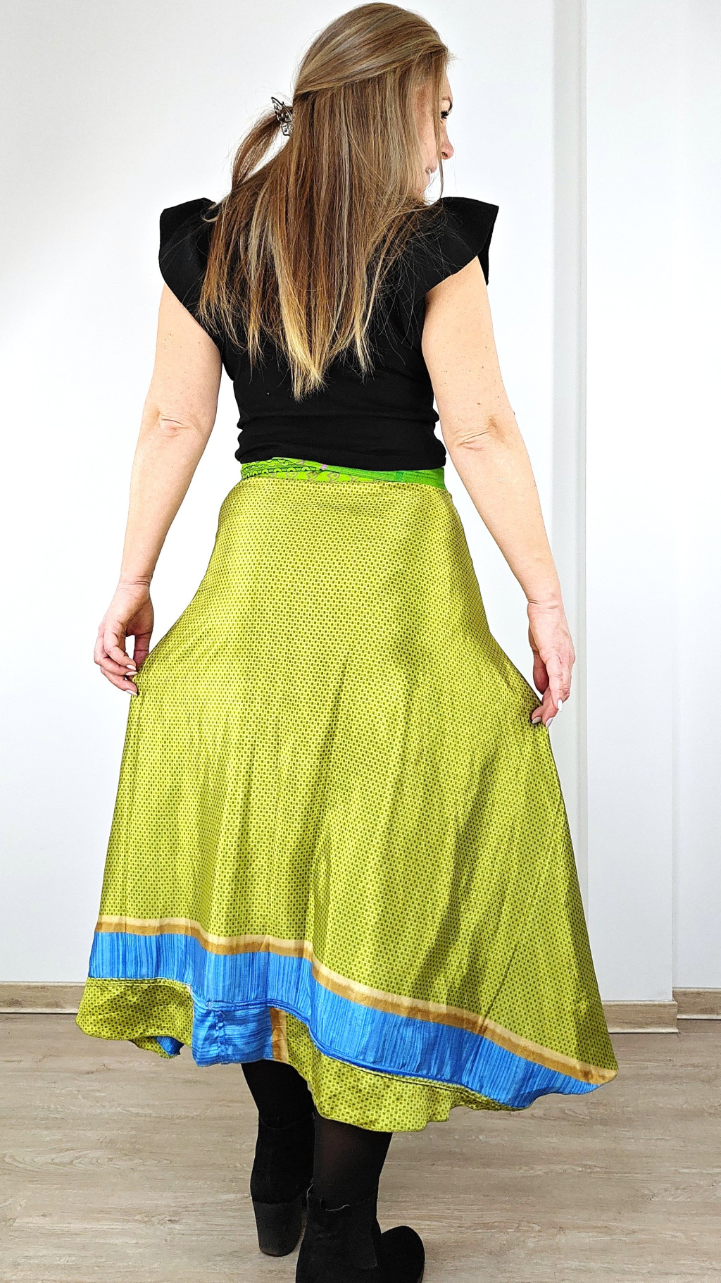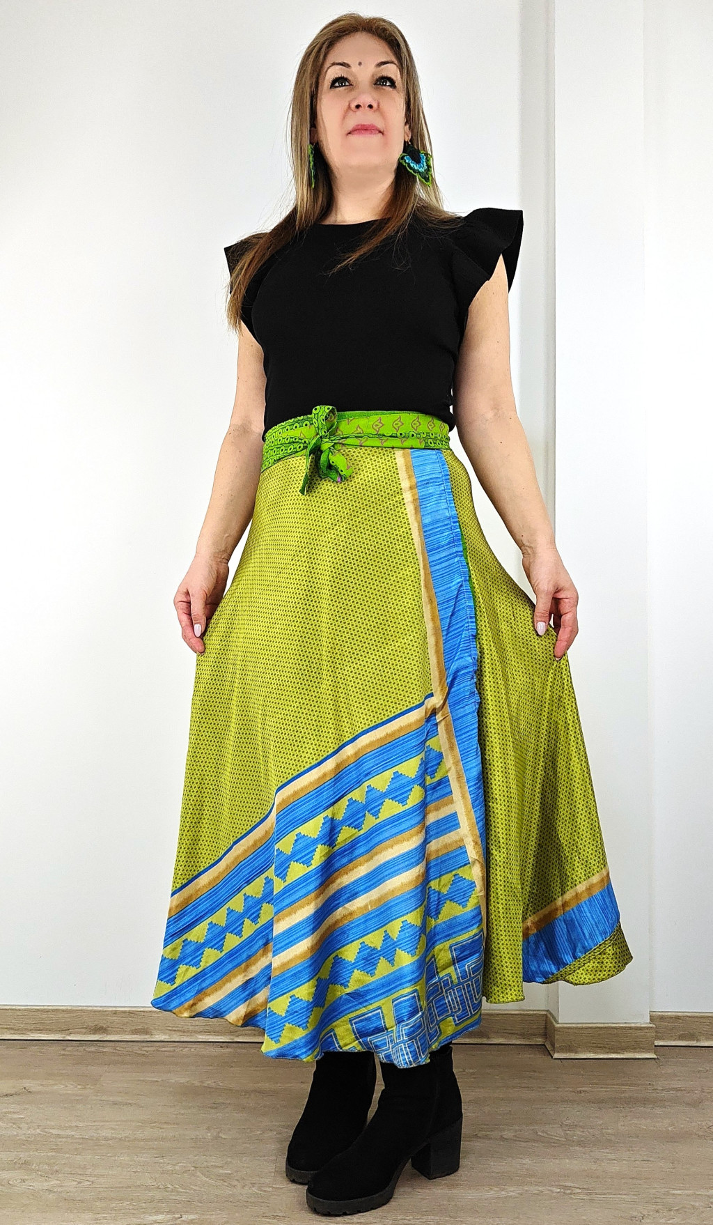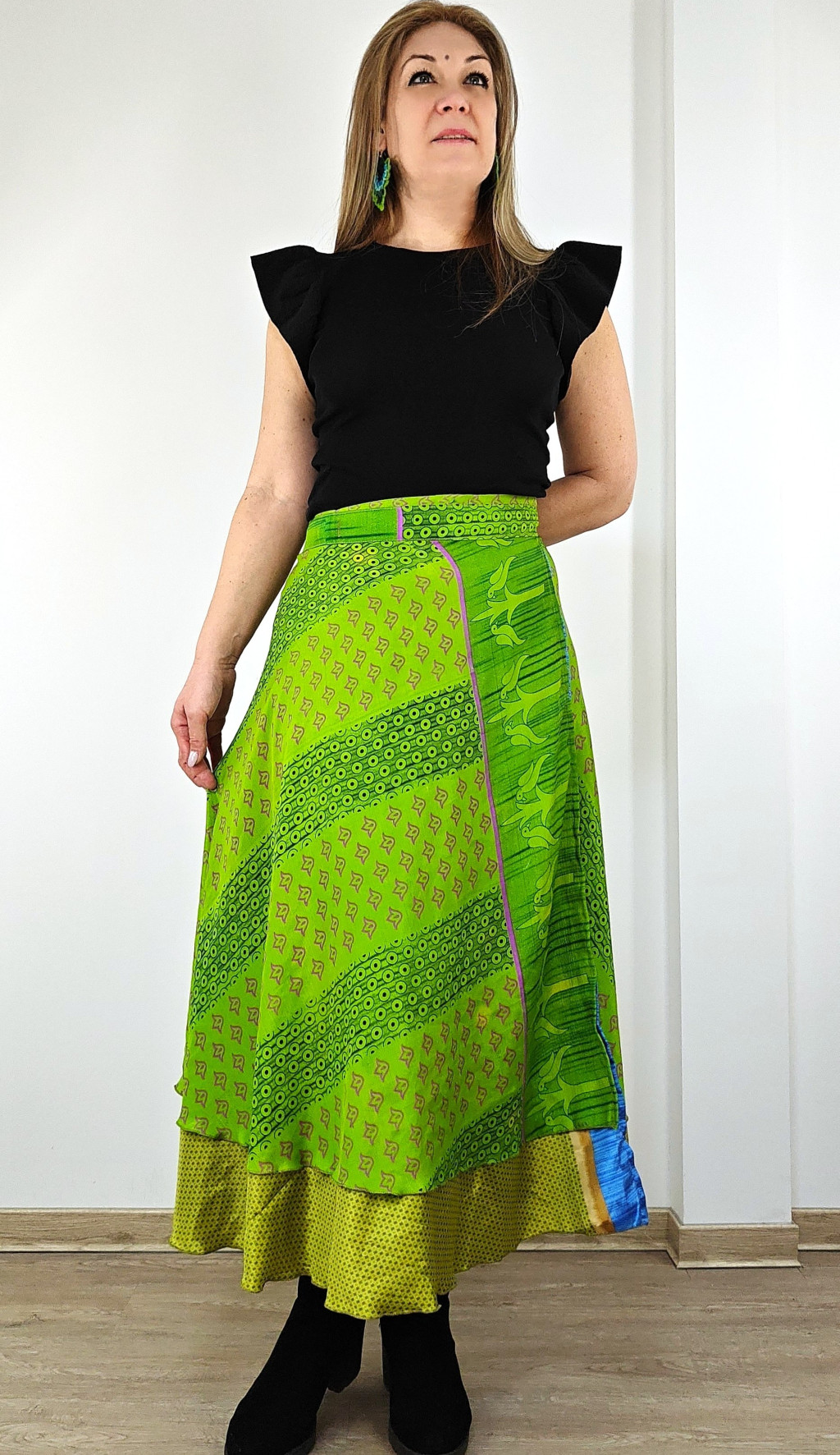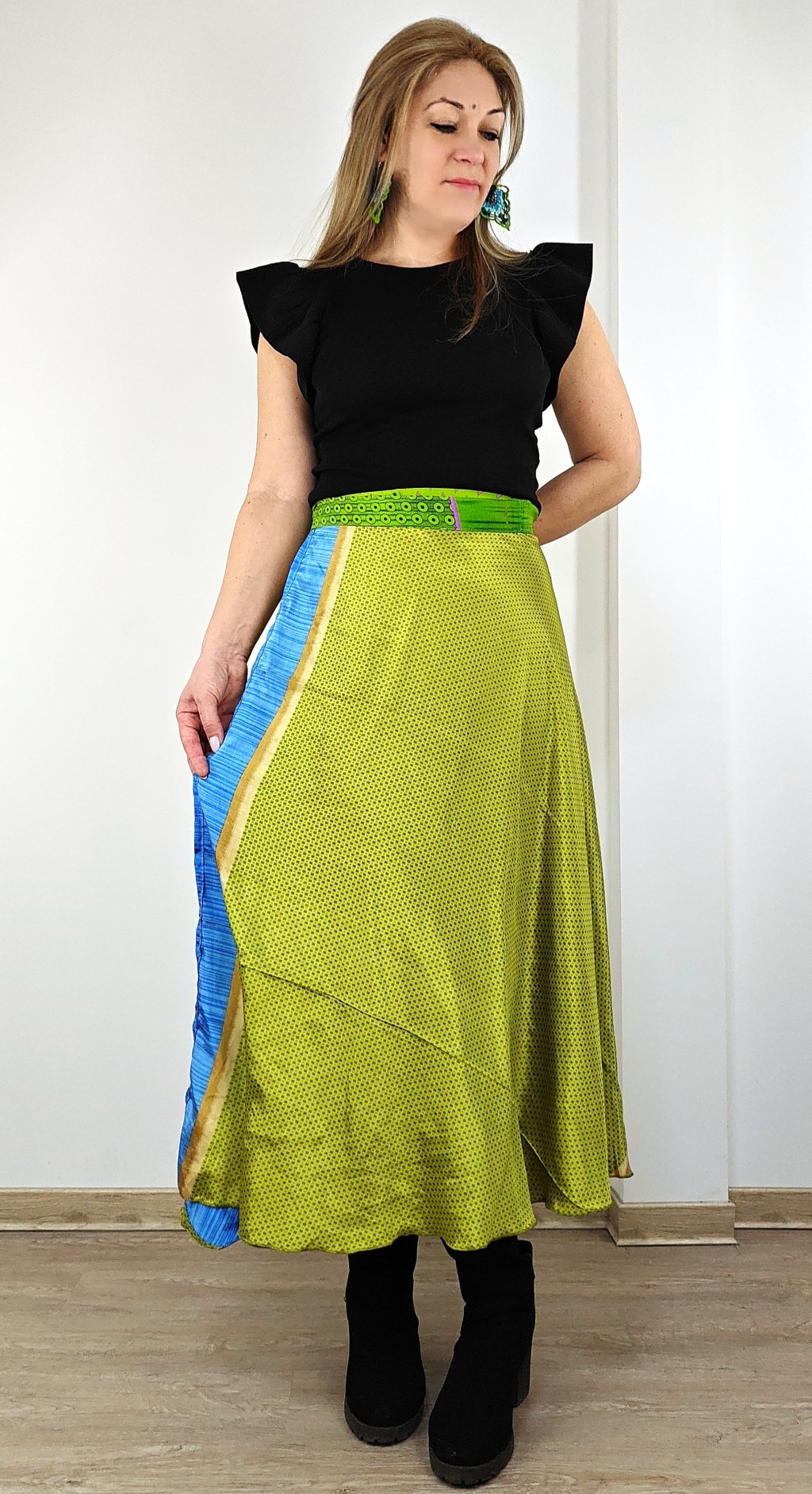 Lapszoknyáink újrahasznosított szárikból készülnek Indiában, egy hosszabb és egy rövidebb anyag derékban összevarrva! Két oldalú, kifordítható, mindkét oldala hordható, sokféleképpen köthető, variálható. Szoknyáinkból nincs két egyforma, mindegyikből csak EGY darab van, ha megtetszik, csapj le rá!