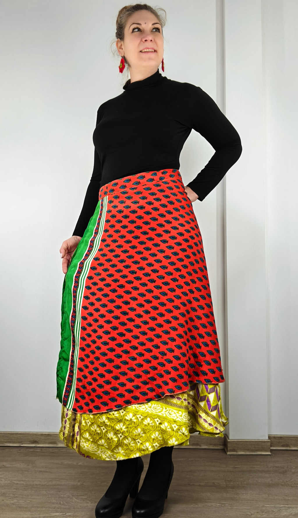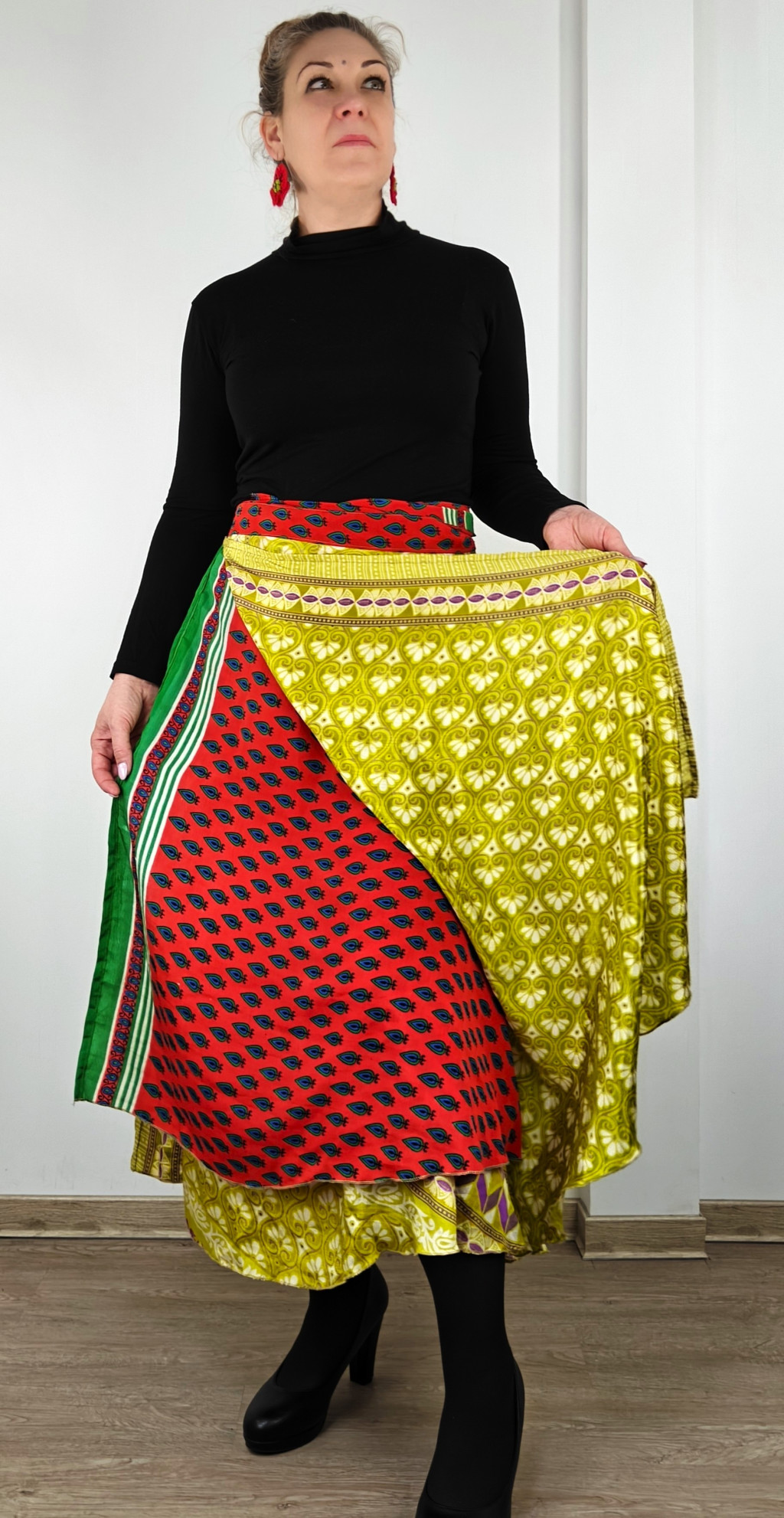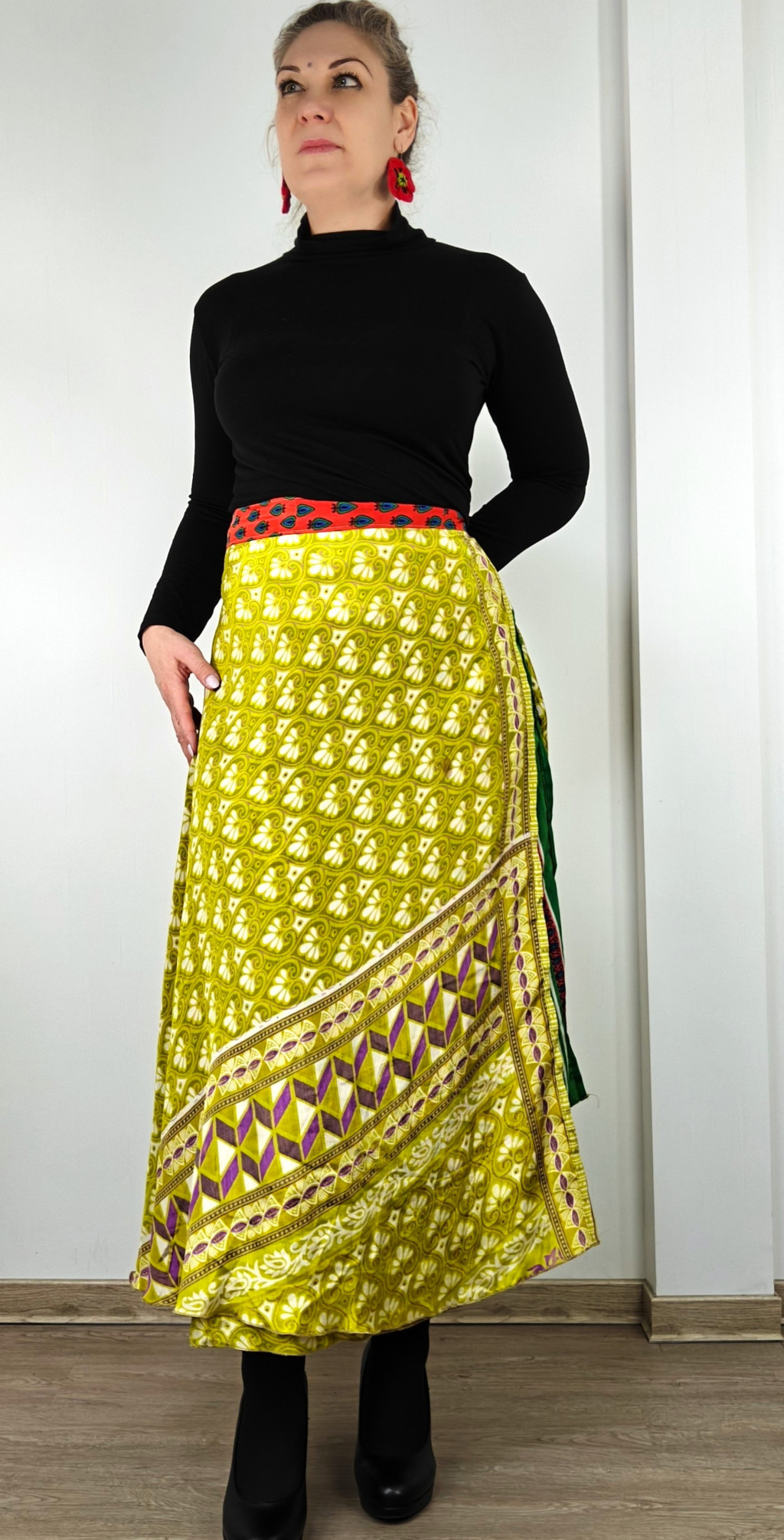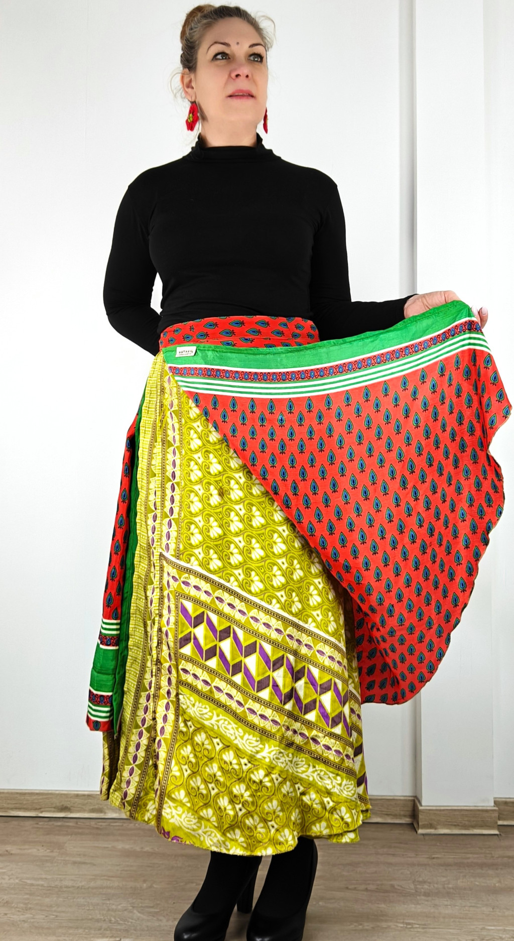 Lapszoknyáink újrahasznosított szárikból készülnek Indiában, egy hosszabb és egy rövidebb anyag derékban összevarrva! Két oldalú, kifordítható, mindkét oldala hordható, sokféleképpen köthető, variálható. Szoknyáinkból nincs két egyforma, mindegyikből csak EGY darab van, ha megtetszik, csapj le rá!