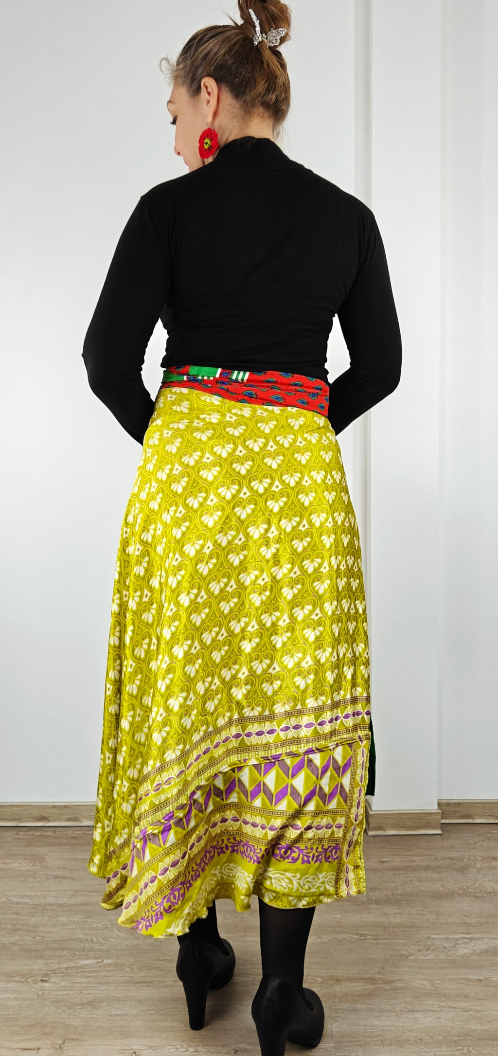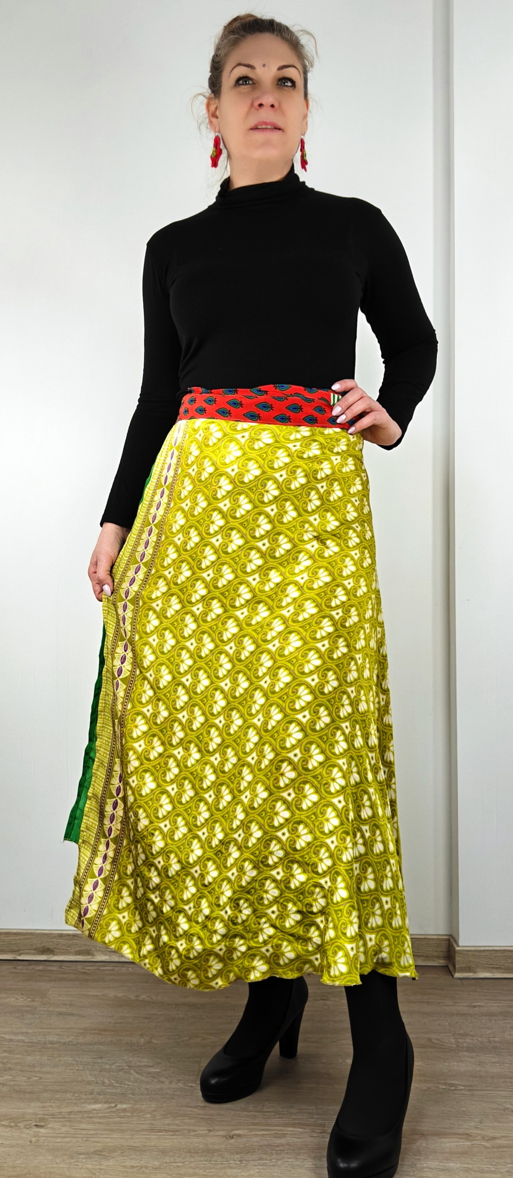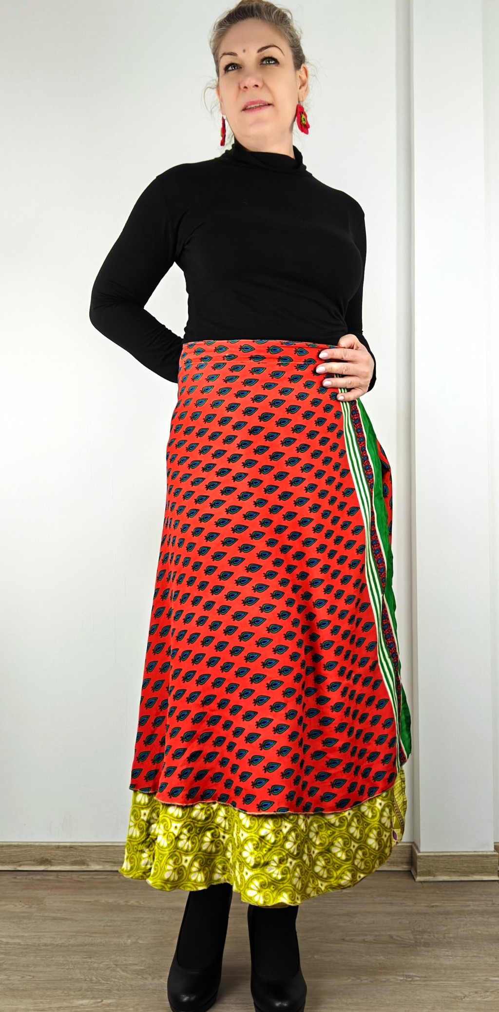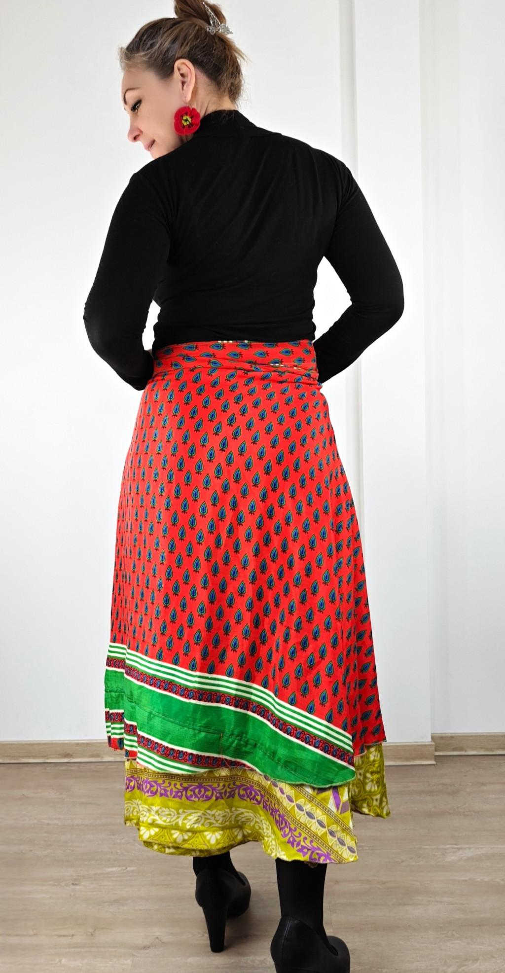 Lapszoknyáink újrahasznosított szárikból készülnek Indiában, egy hosszabb és egy rövidebb anyag derékban összevarrva! Két oldalú, kifordítható, mindkét oldala hordható, sokféleképpen köthető, variálható. Szoknyáinkból nincs két egyforma, mindegyikből csak EGY darab van, ha megtetszik, csapj le rá!