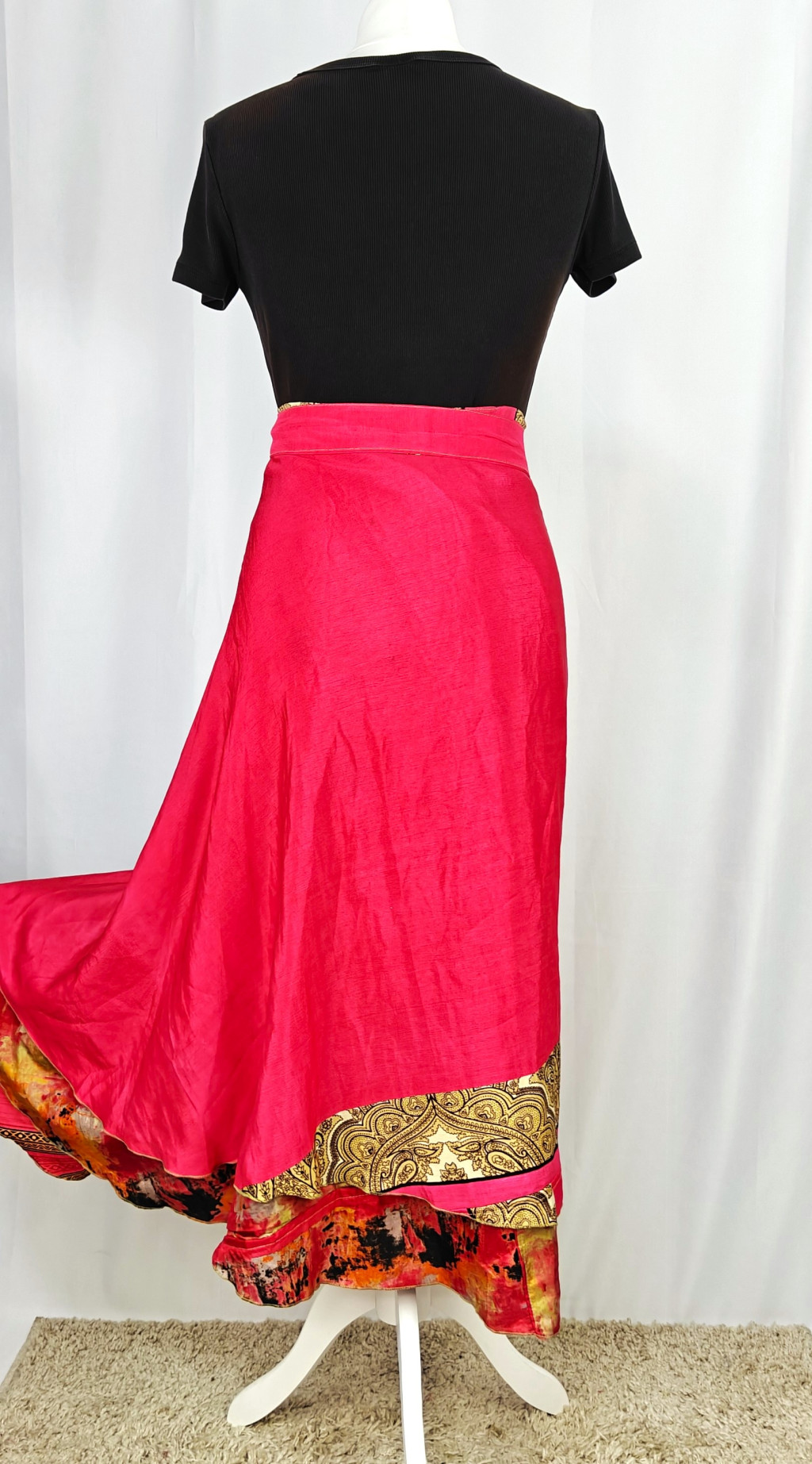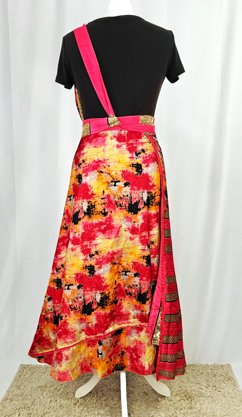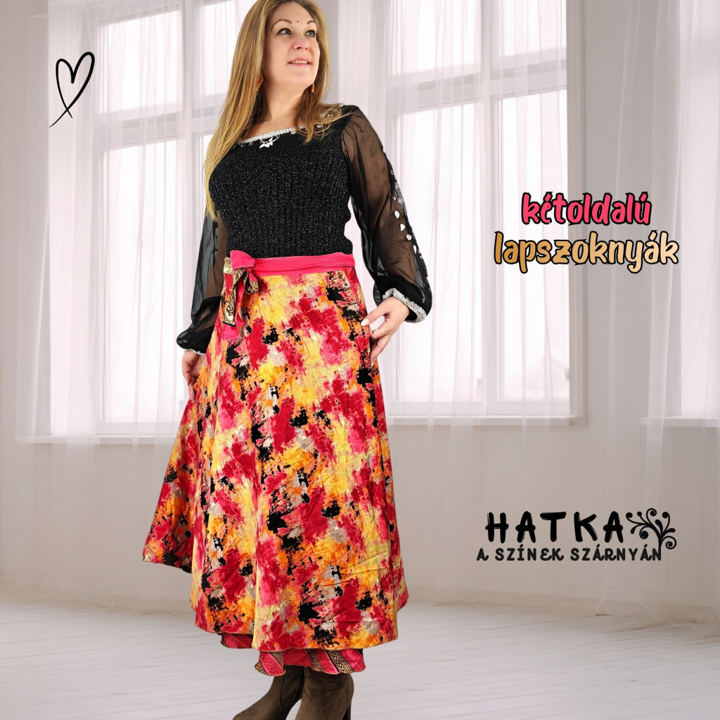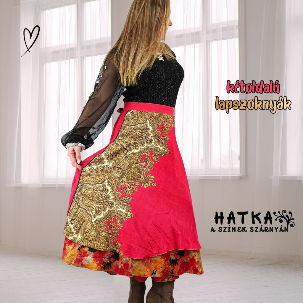 Lapszoknyáink újrahasznosított szárikból készülnek Indiában, egy hosszabb és egy rövidebb anyag derékban összevarrva! Két oldalú, kifordítható, mindkét oldala hordható, sokféleképpen köthető, variálható. Szoknyáinkból nincs két egyforma, mindegyikből csak EGY darab van, ha megtetszik, csapj le rá!