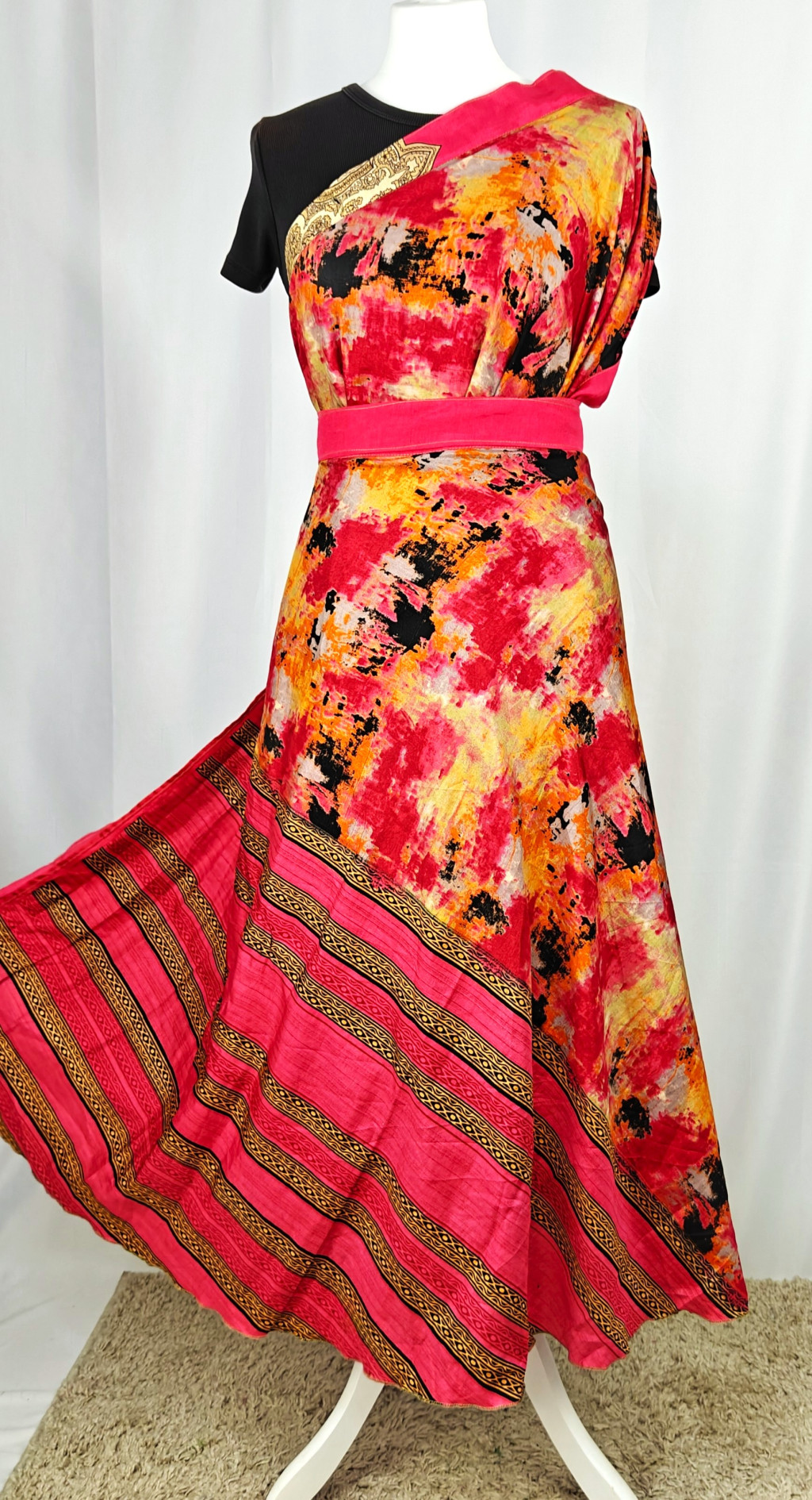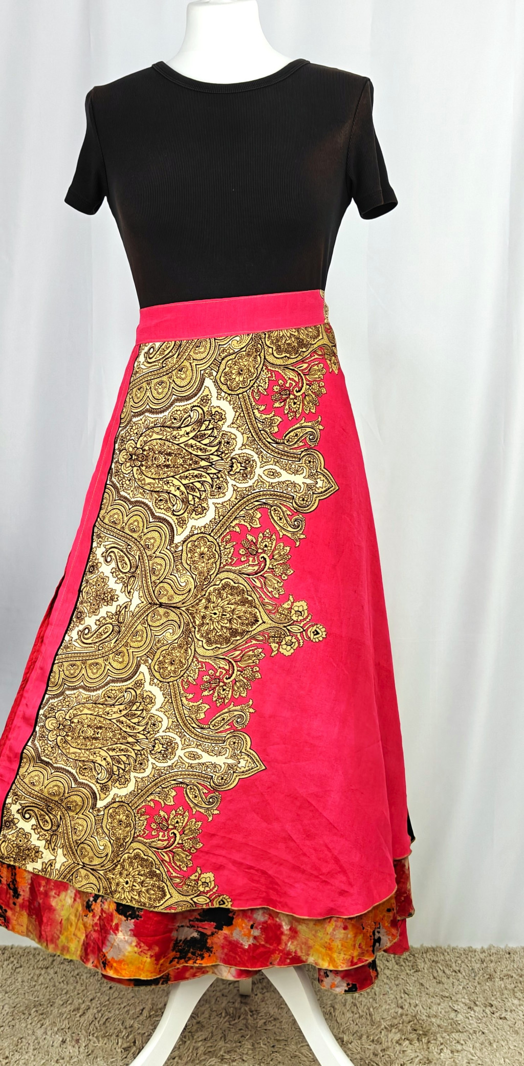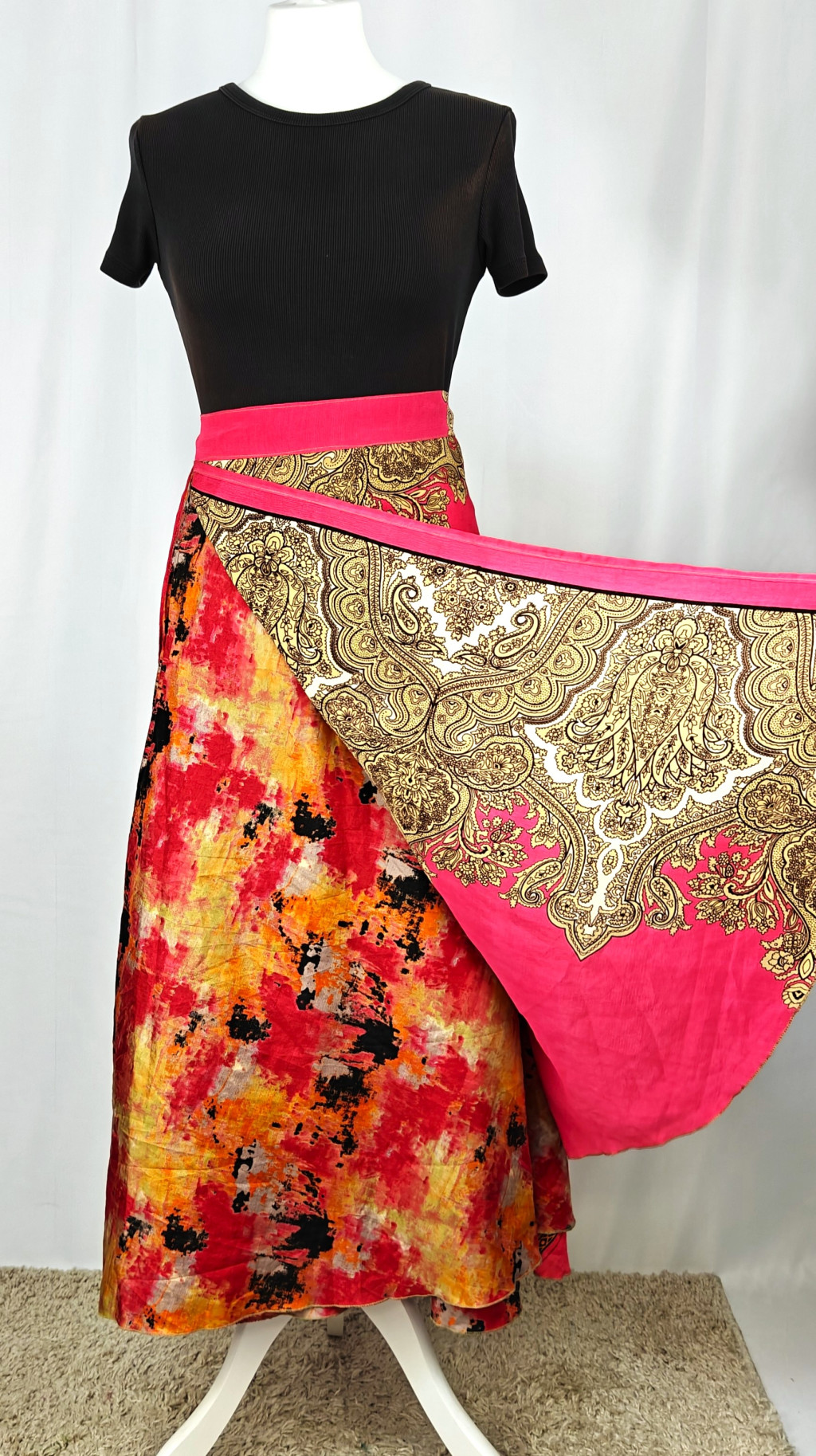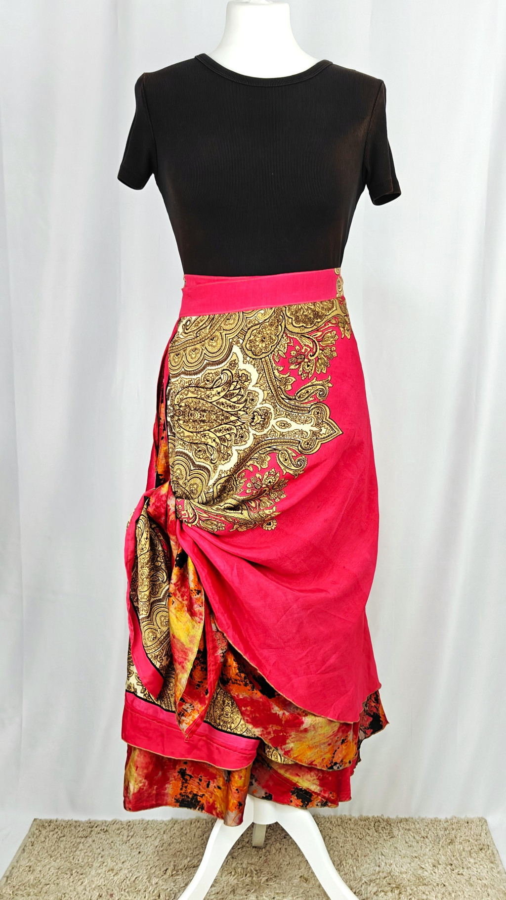 Lapszoknyáink újrahasznosított szárikból készülnek Indiában, egy hosszabb és egy rövidebb anyag derékban összevarrva! Két oldalú, kifordítható, mindkét oldala hordható, sokféleképpen köthető, variálható. Szoknyáinkból nincs két egyforma, mindegyikből csak EGY darab van, ha megtetszik, csapj le rá!