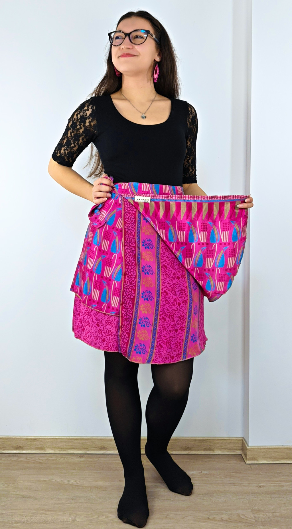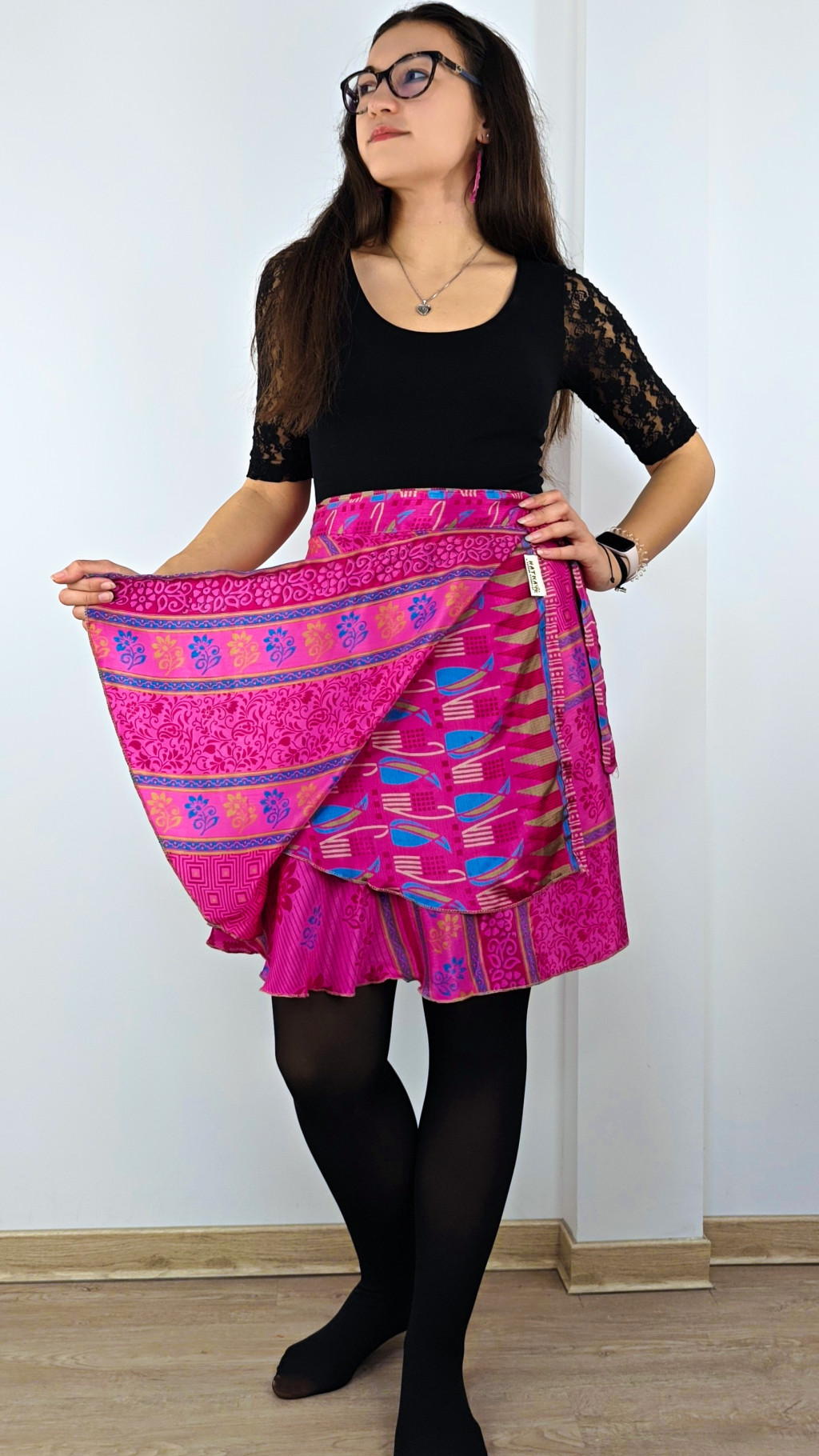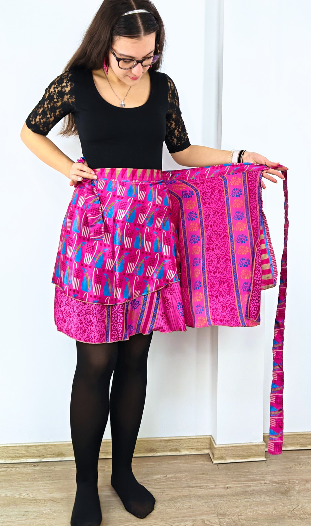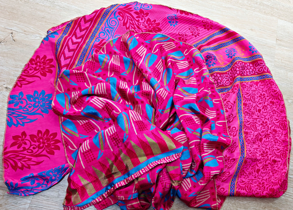 Lapszoknyáink újrahasznosított szárikból készülnek Indiában, egy hosszabb és egy rövidebb anyag derékban összevarrva! Két oldalú, kifordítható, mindkét oldala hordható, sokféleképpen köthető, variálható. Szoknyáinkból nincs két egyforma, mindegyikből csak EGY darab van, ha megtetszik, csapj le rá!