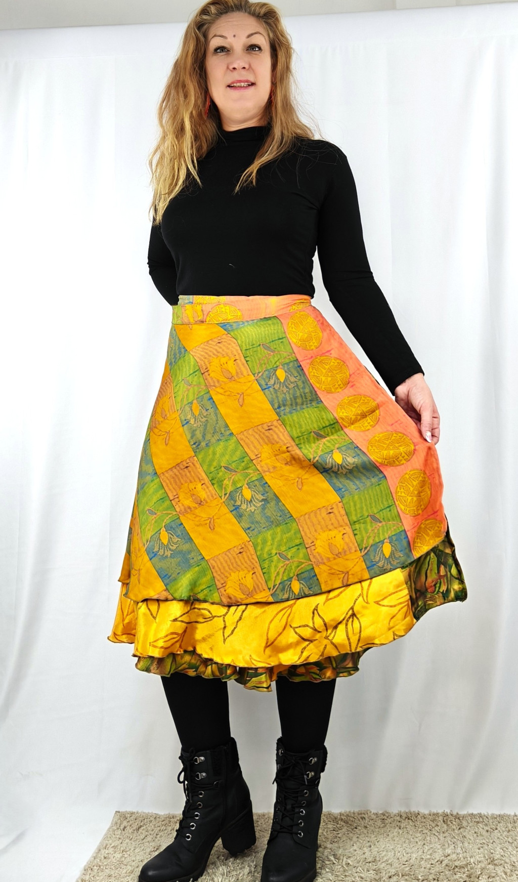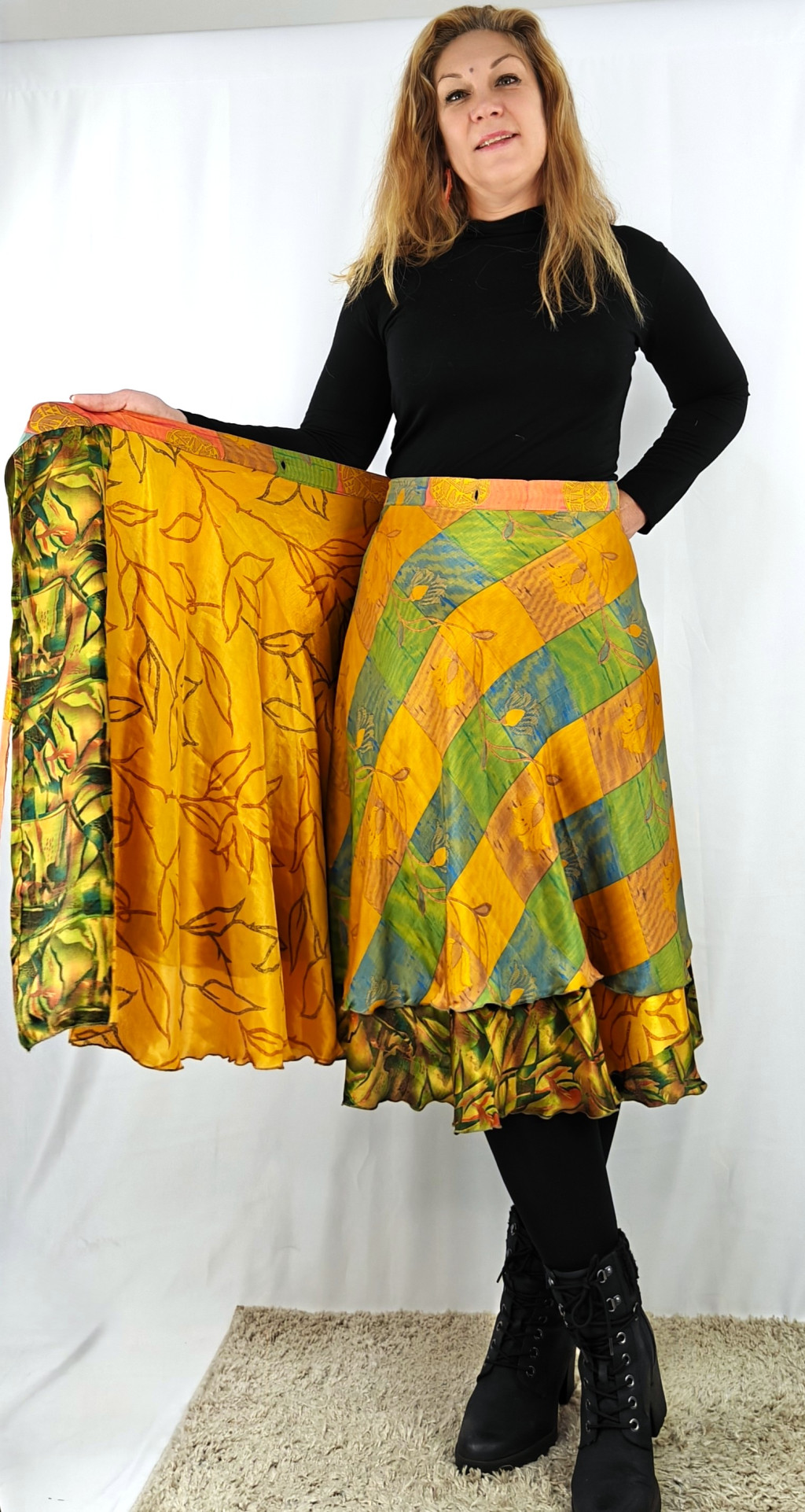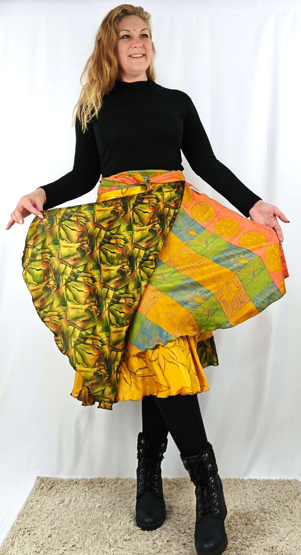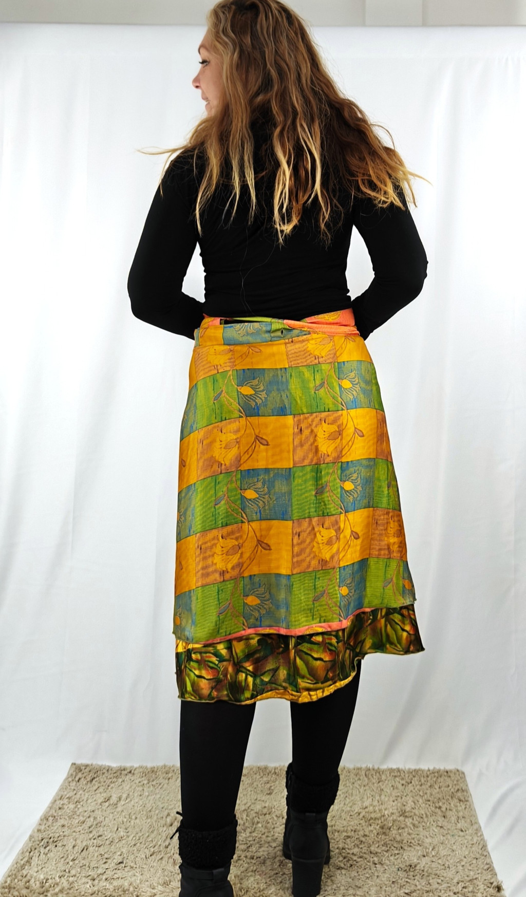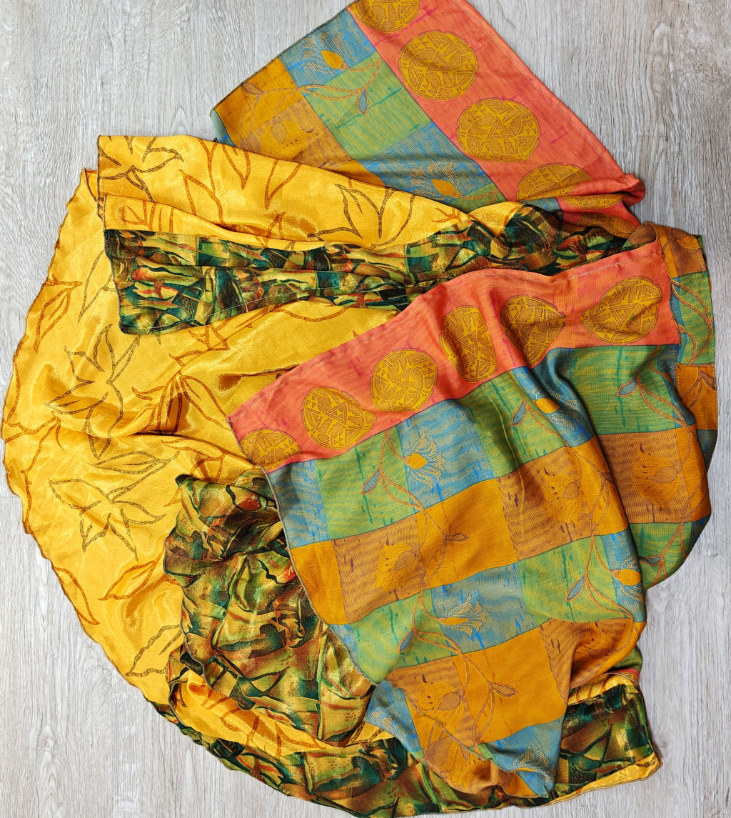 Lapszoknyáink újrahasznosított szárikból készülnek Indiában, egy hosszabb és egy rövidebb anyag derékban összevarrva! Két oldalú, kifordítható, mindkét oldala hordható, sokféleképpen köthető, variálható. Szoknyáinkból nincs két egyforma, mindegyikből csak EGY darab van, ha megtetszik, csapj le rá!
