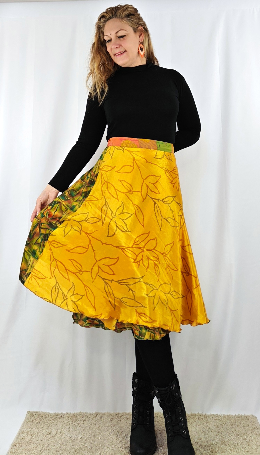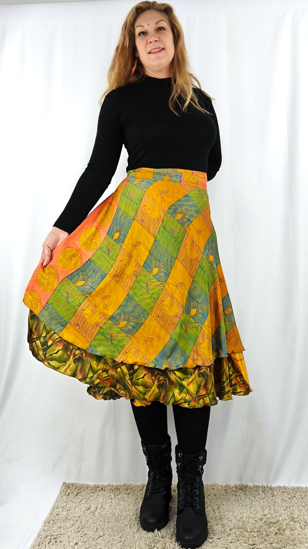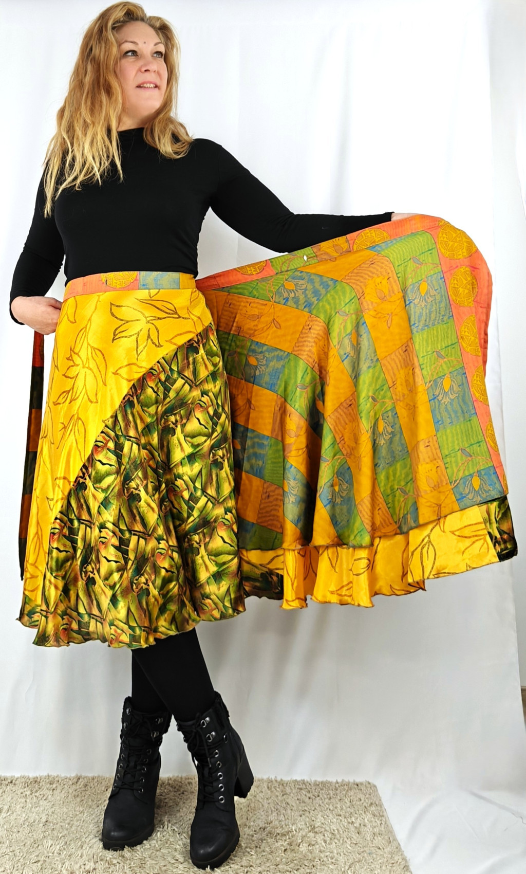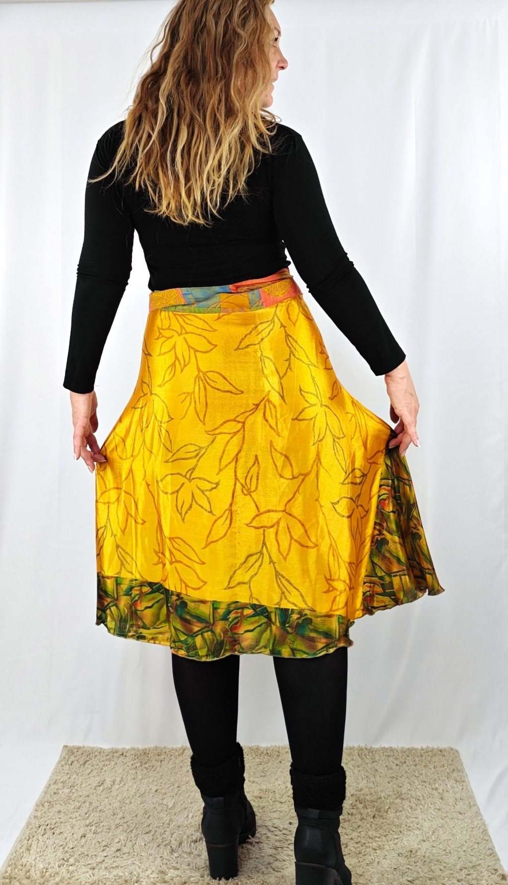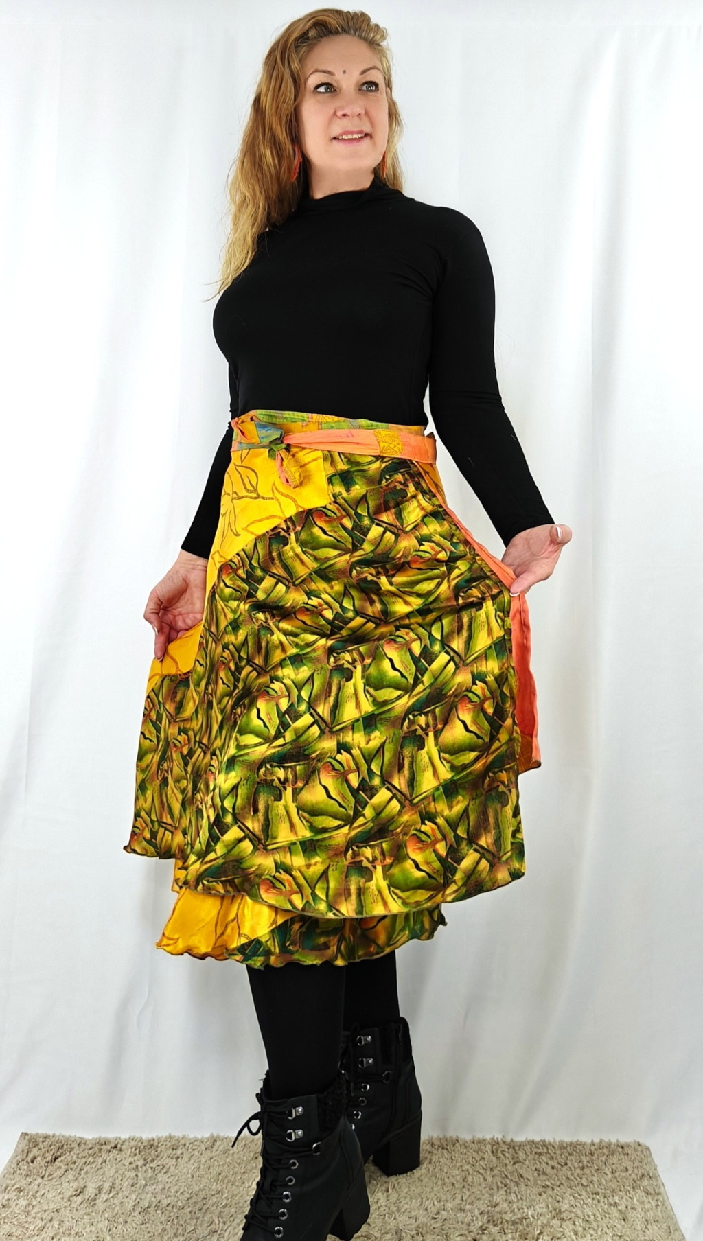 Lapszoknyáink újrahasznosított szárikból készülnek Indiában, egy hosszabb és egy rövidebb anyag derékban összevarrva! Két oldalú, kifordítható, mindkét oldala hordható, sokféleképpen köthető, variálható. Szoknyáinkból nincs két egyforma, mindegyikből csak EGY darab van, ha megtetszik, csapj le rá!