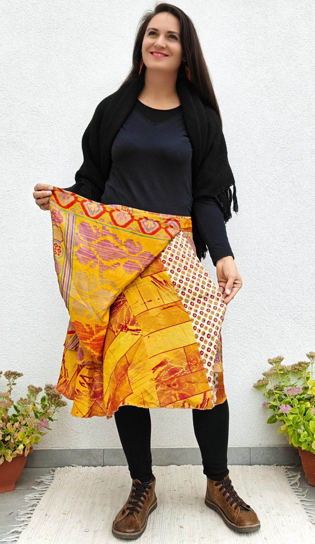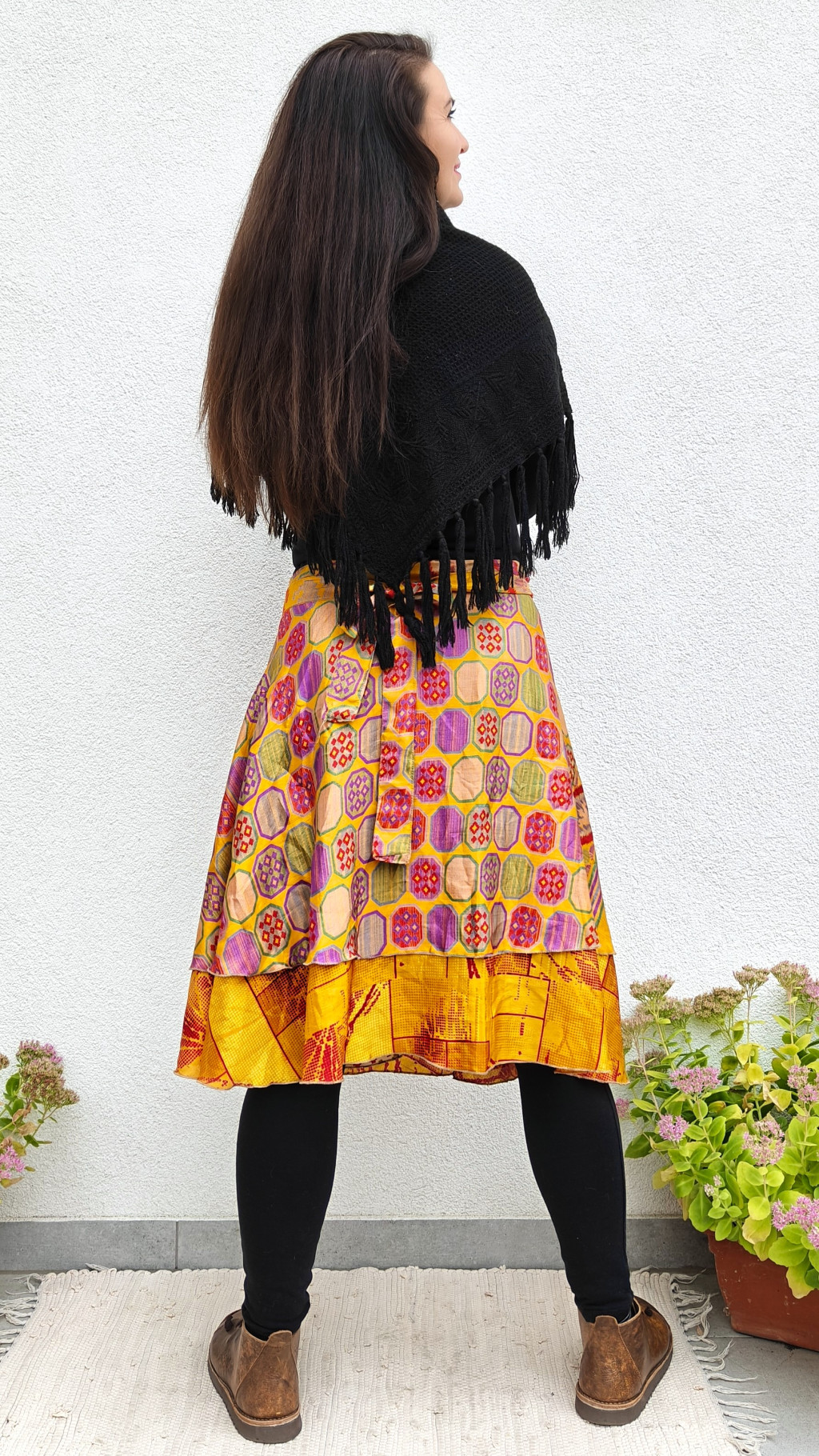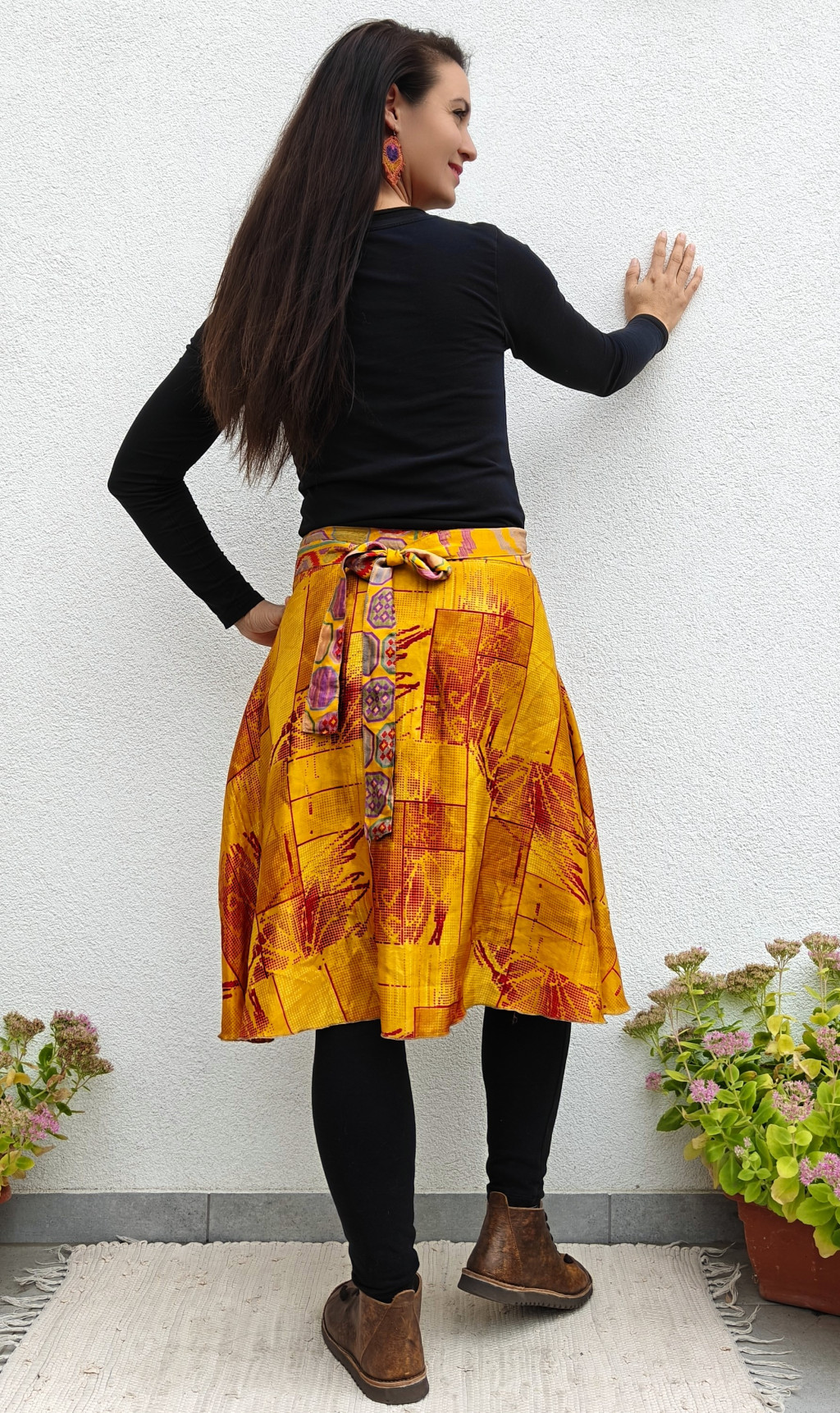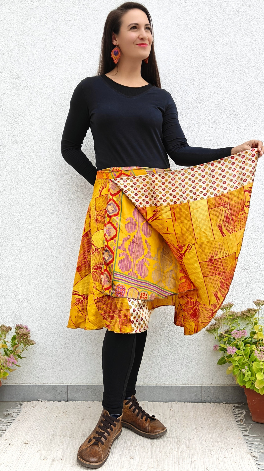 Lapszoknyáink újrahasznosított szárikból készülnek Indiában, egy hosszabb és egy rövidebb anyag derékban összevarrva! Két oldalú, kifordítható, mindkét oldala hordható, sokféleképpen köthető, variálható. Szoknyáinkból nincs két egyforma, mindegyikből csak EGY darab van, ha megtetszik, csapj le rá!