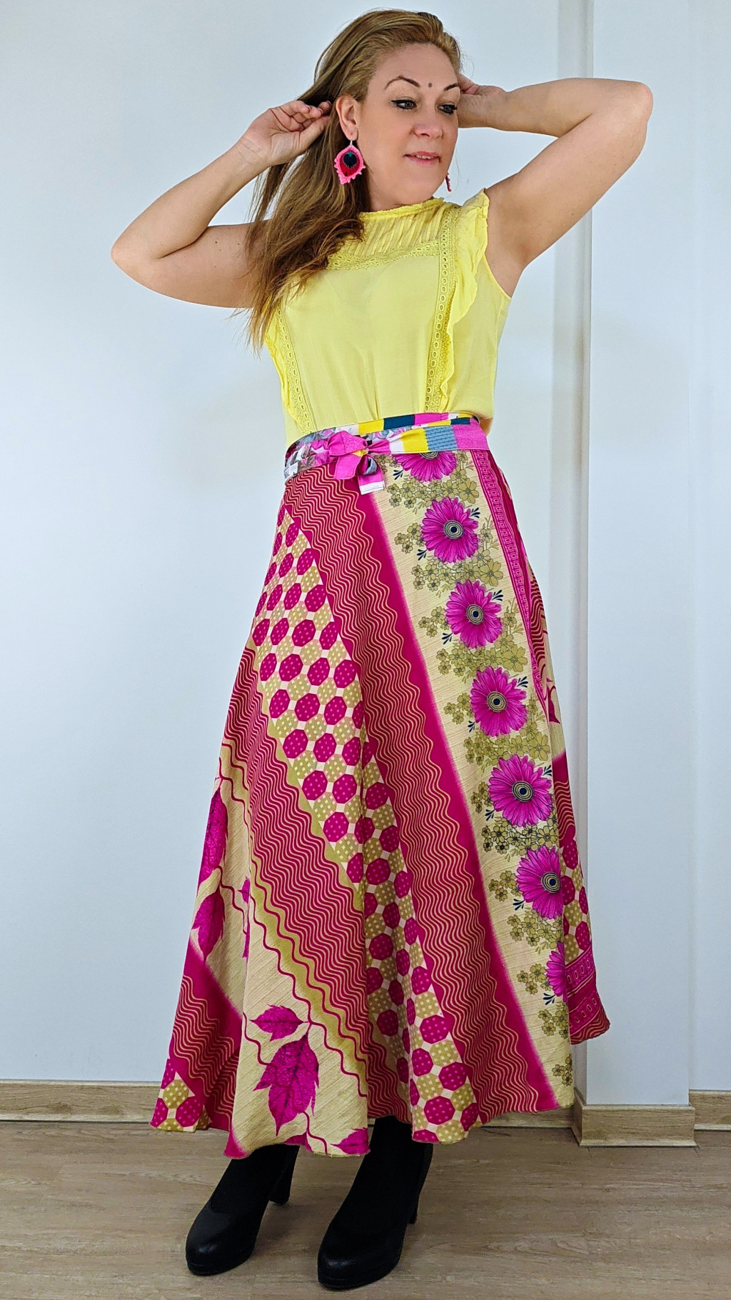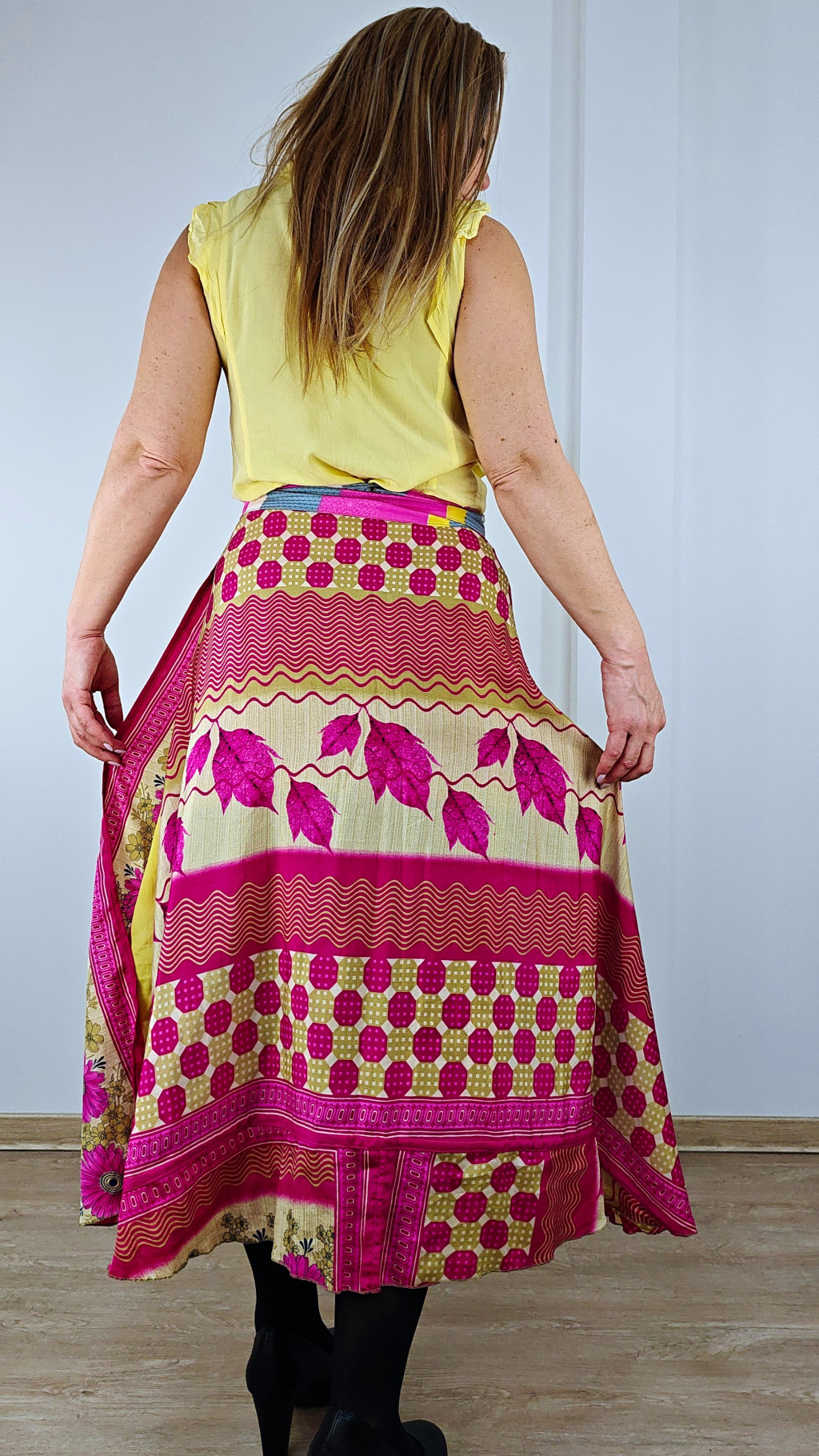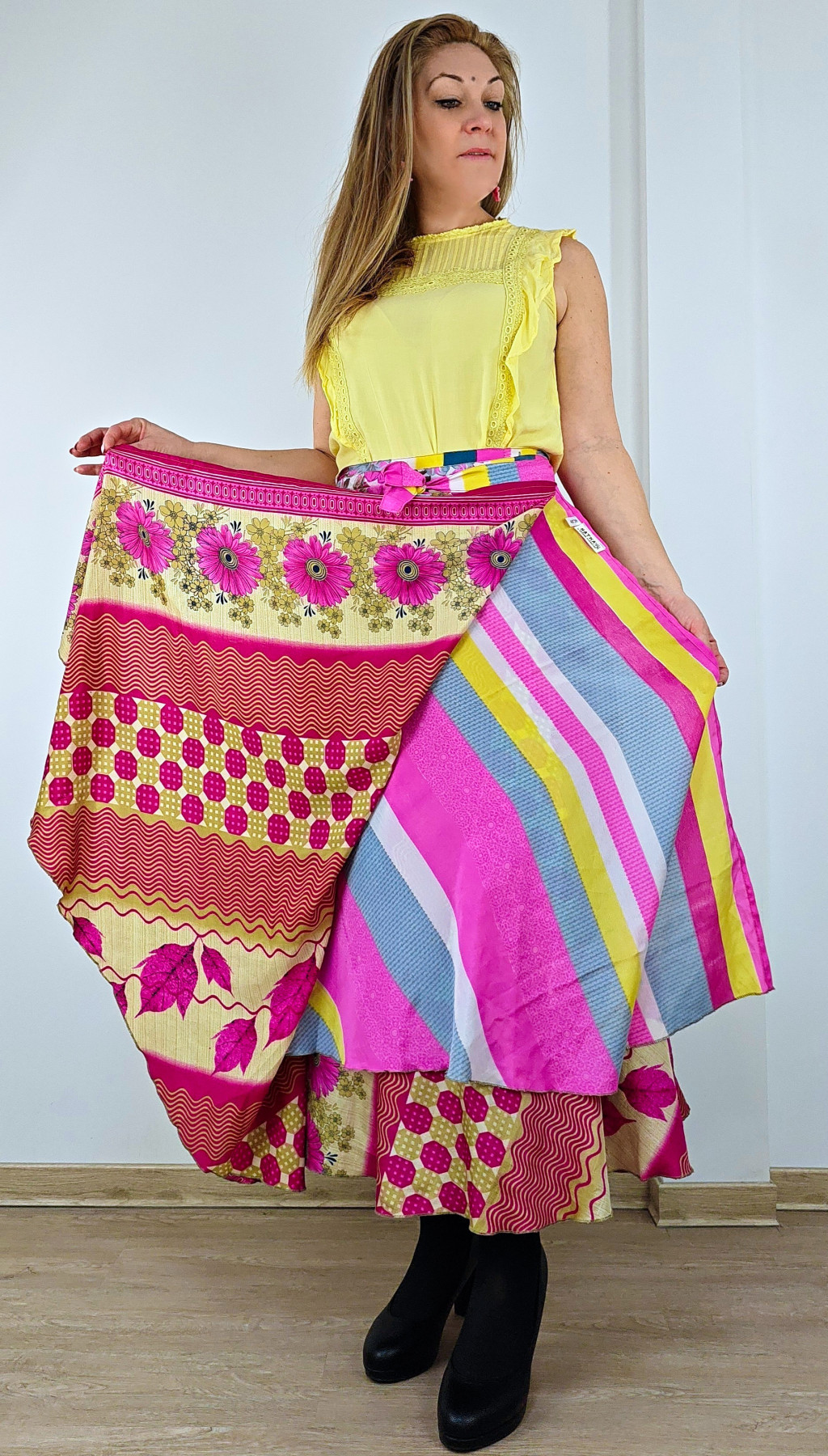 Lapszoknyáink újrahasznosított szárikból készülnek Indiában, egy hosszabb és egy rövidebb anyag derékban összevarrva! Két oldalú, kifordítható, mindkét oldala hordható, sokféleképpen köthető, variálható. Szoknyáinkból nincs két egyforma, mindegyikből csak EGY darab van, ha megtetszik, csapj le rá!