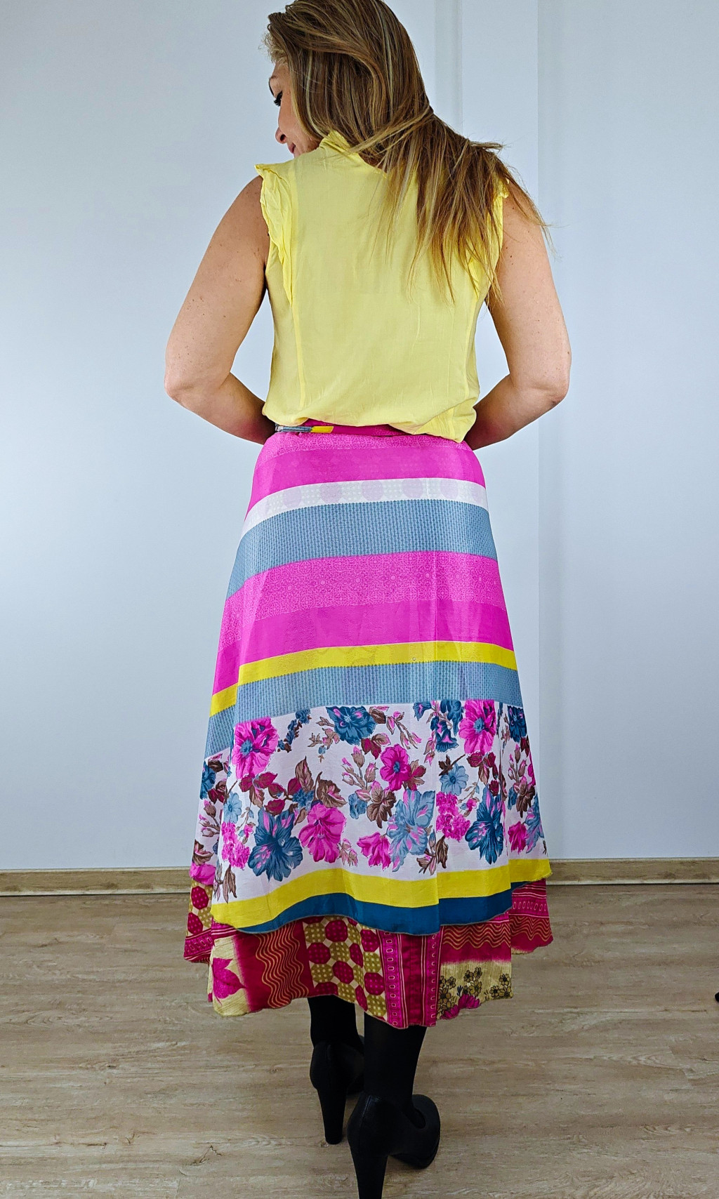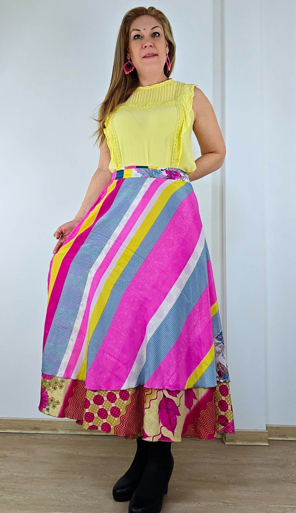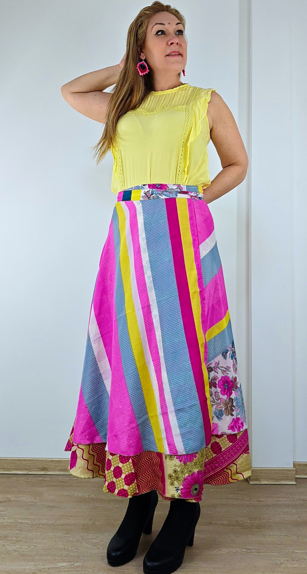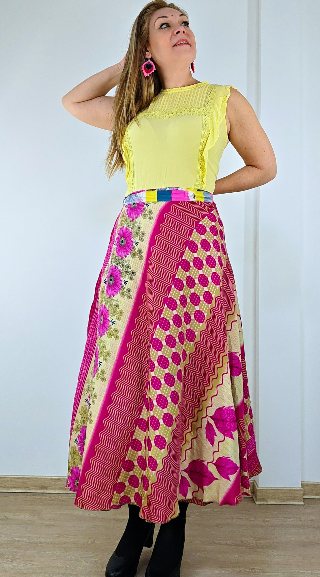 Lapszoknyáink újrahasznosított szárikból készülnek Indiában, egy hosszabb és egy rövidebb anyag derékban összevarrva! Két oldalú, kifordítható, mindkét oldala hordható, sokféleképpen köthető, variálható. Szoknyáinkból nincs két egyforma, mindegyikből csak EGY darab van, ha megtetszik, csapj le rá!