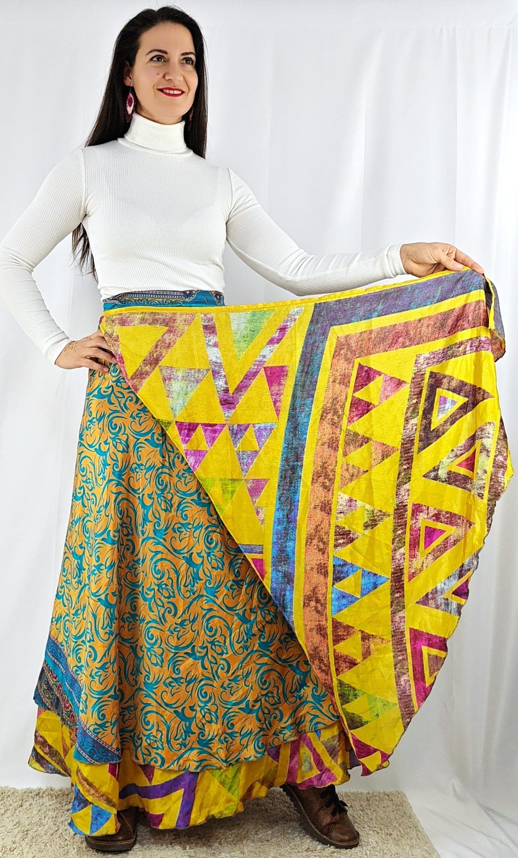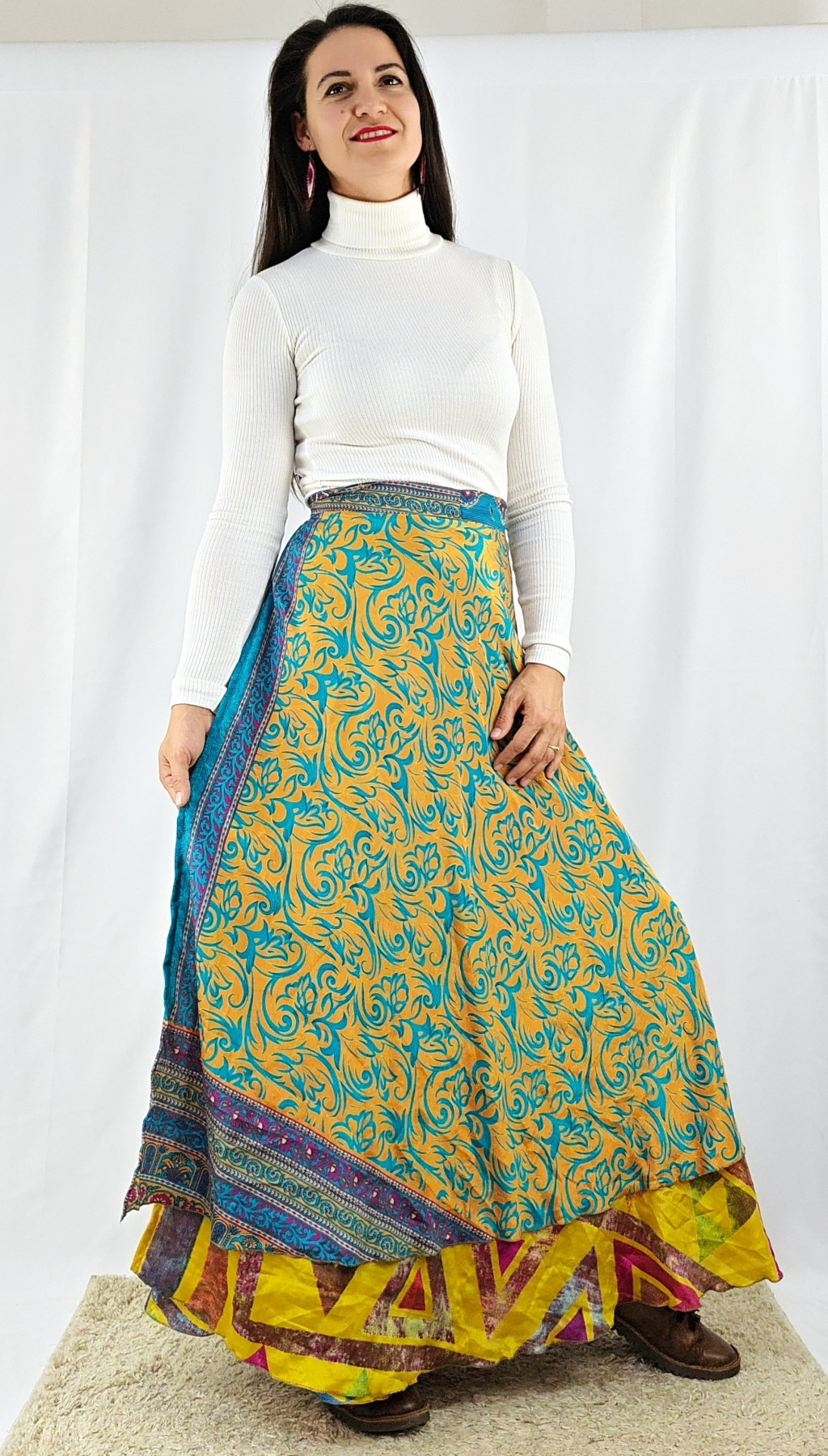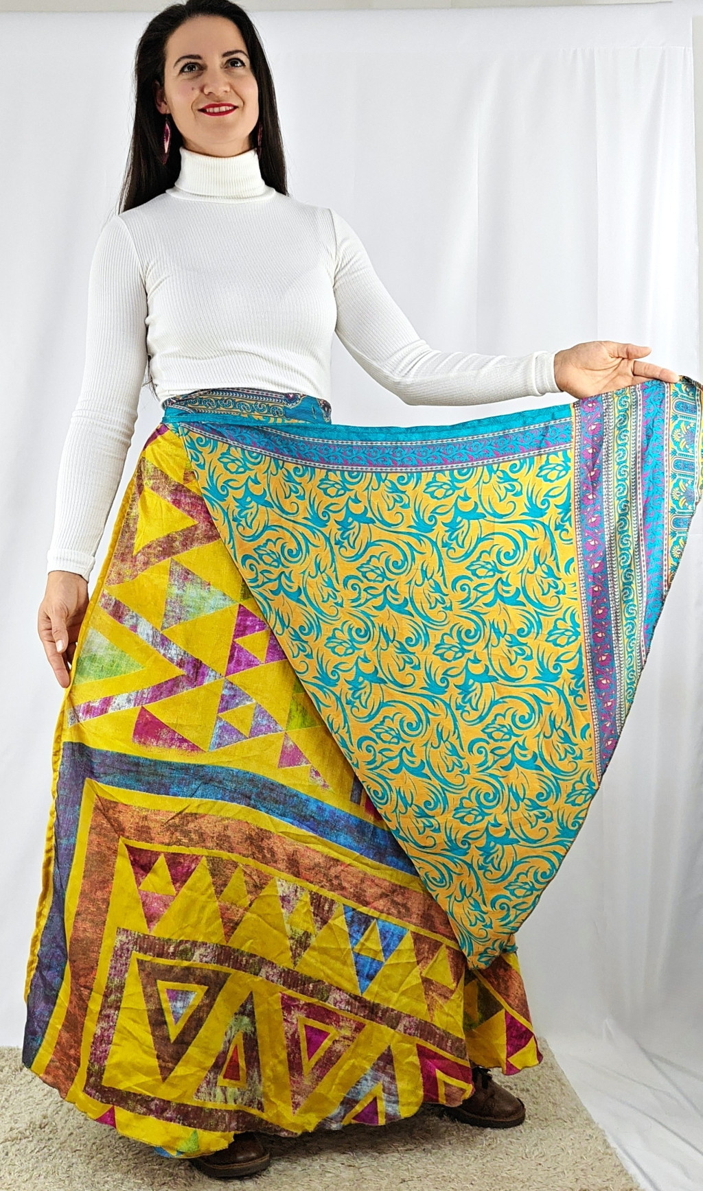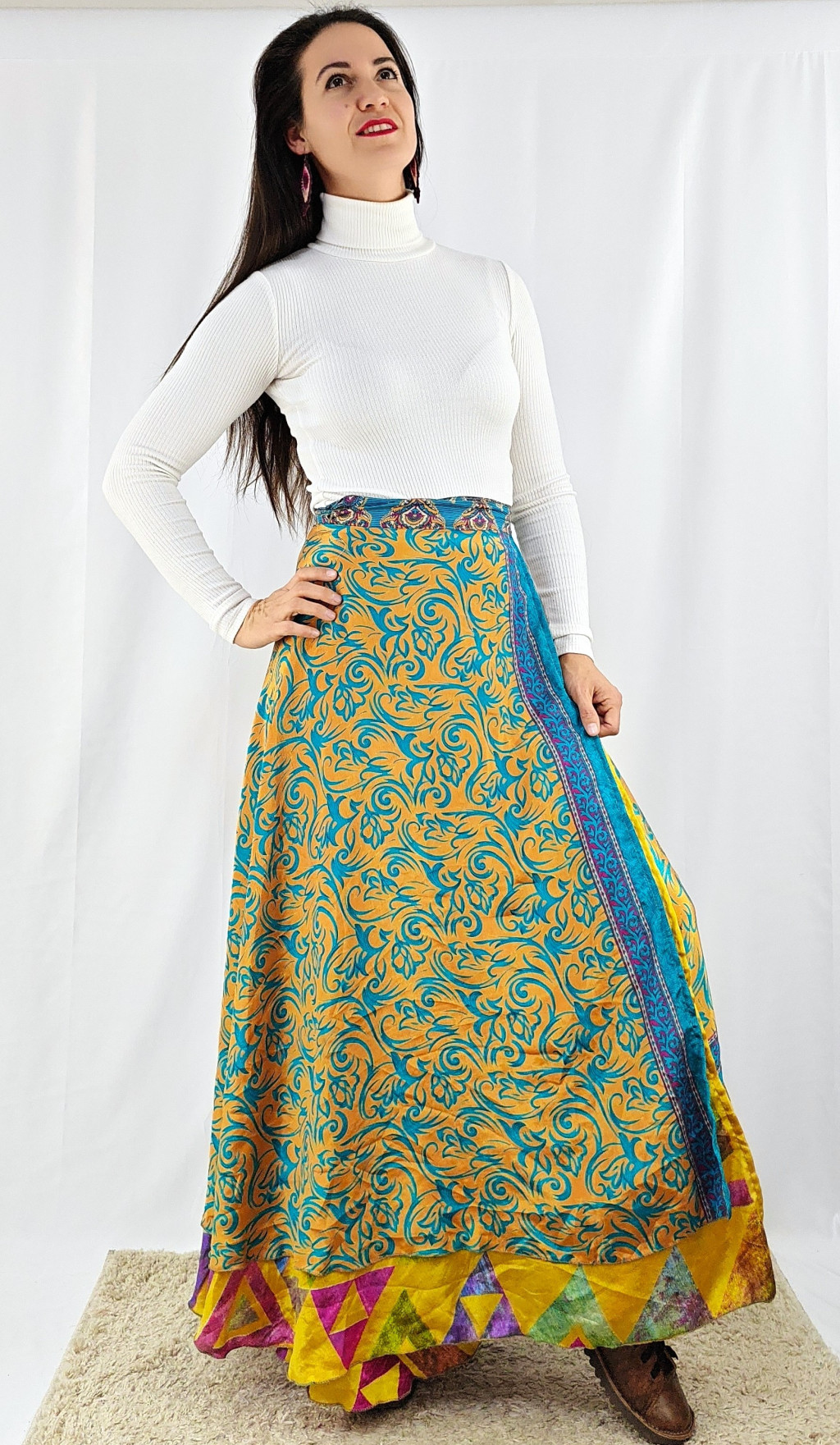 Lapszoknyáink újrahasznosított szárikból készülnek Indiában, egy hosszabb és egy rövidebb anyag derékban összevarrva! Két oldalú, kifordítható, mindkét oldala hordható, sokféleképpen köthető, variálható. Szoknyáinkból nincs két egyforma, mindegyikből csak EGY darab van, ha megtetszik, csapj le rá!