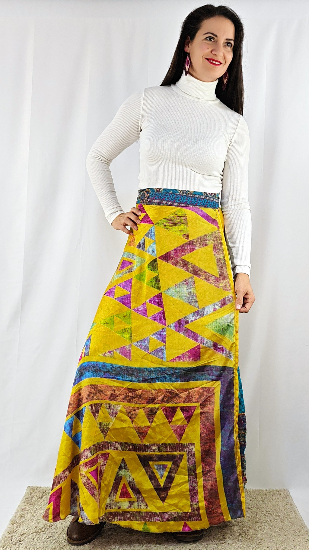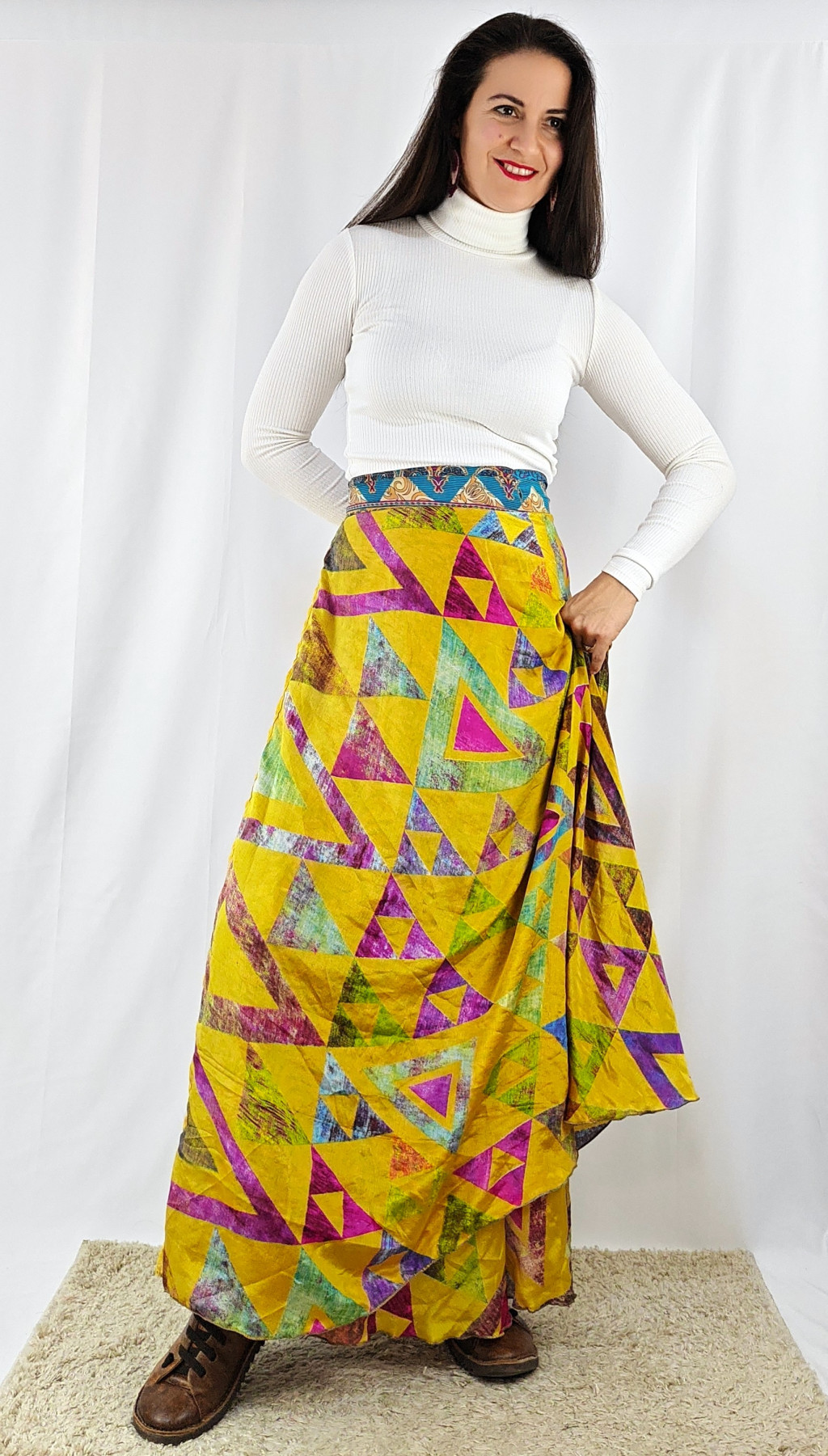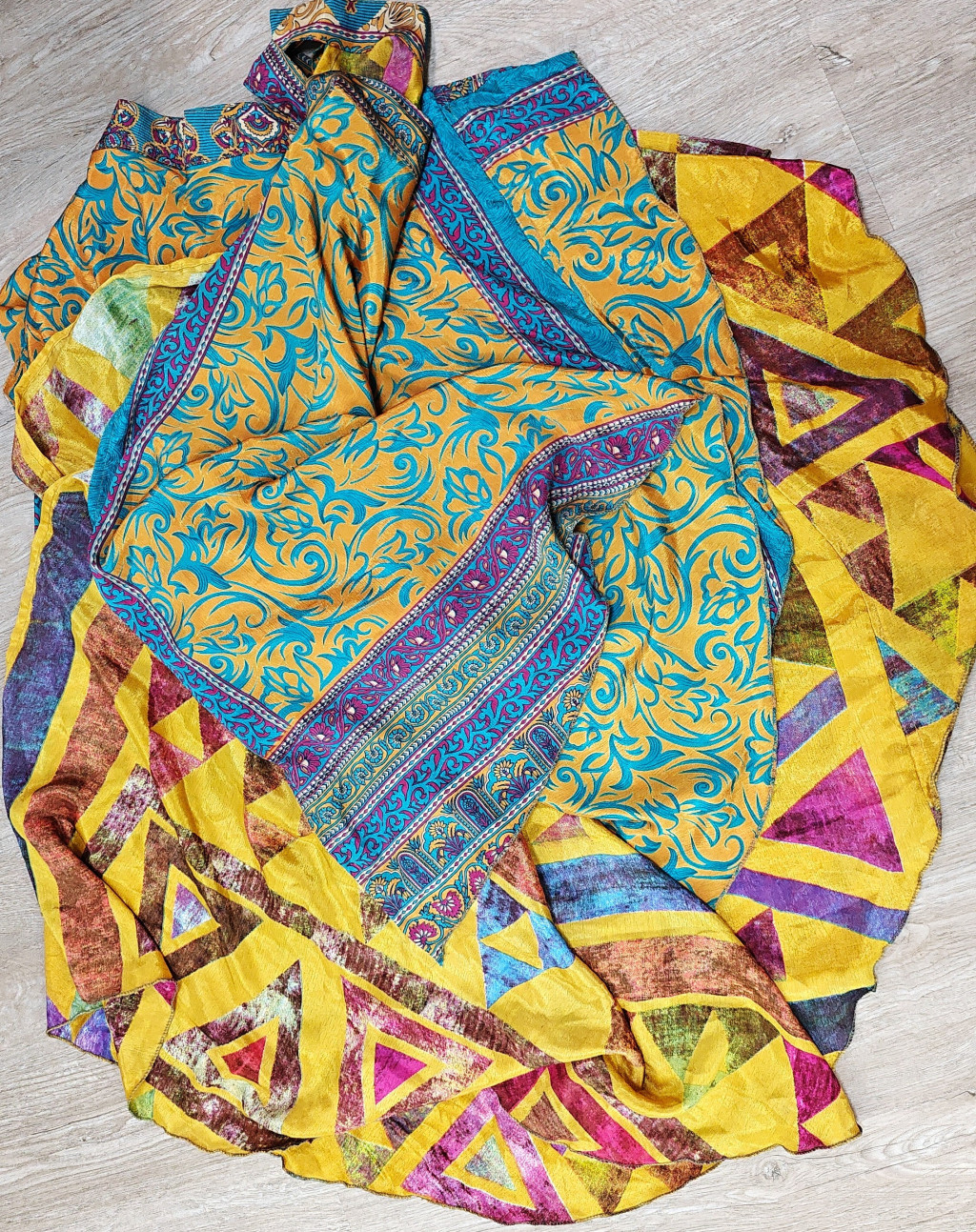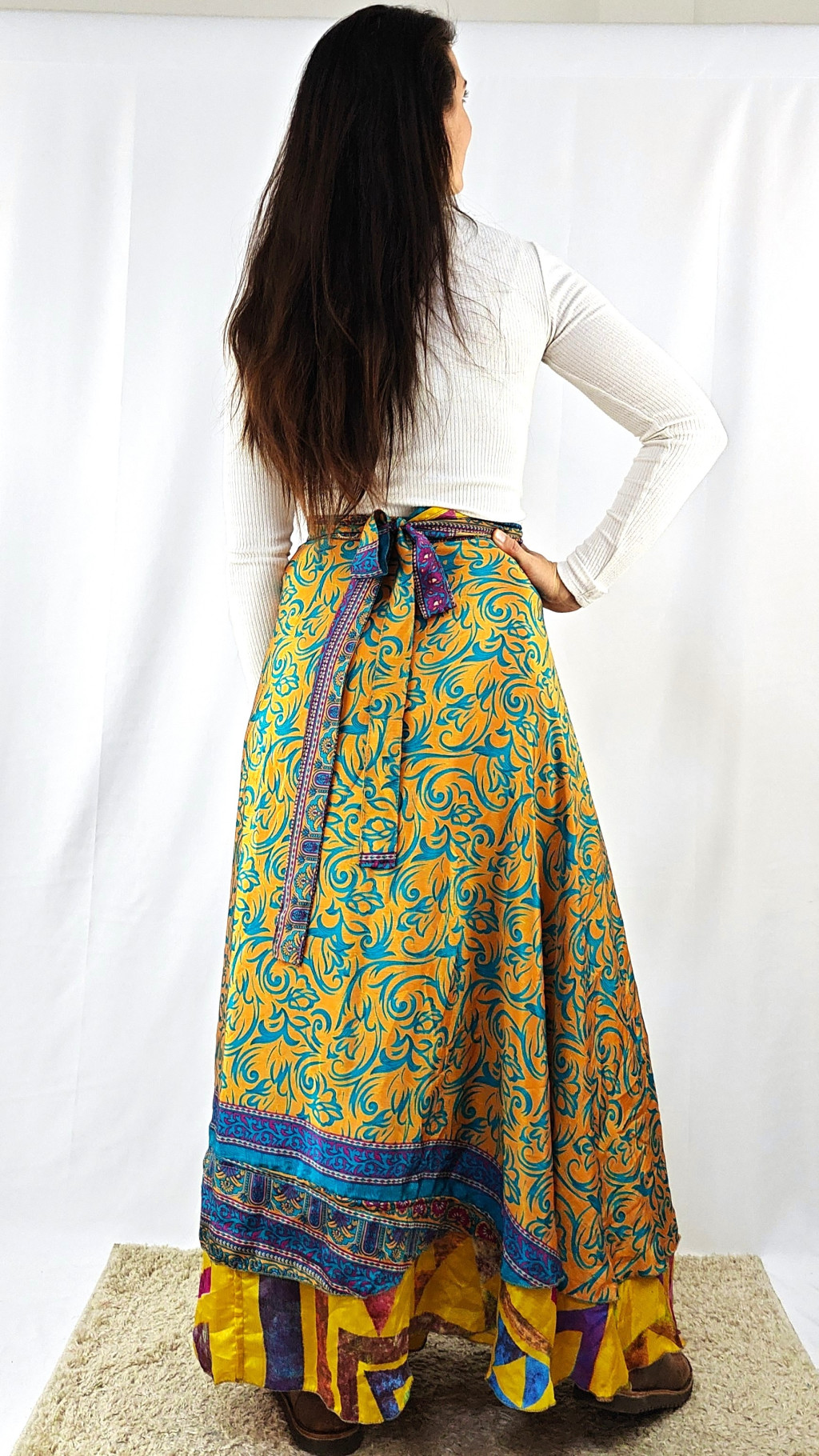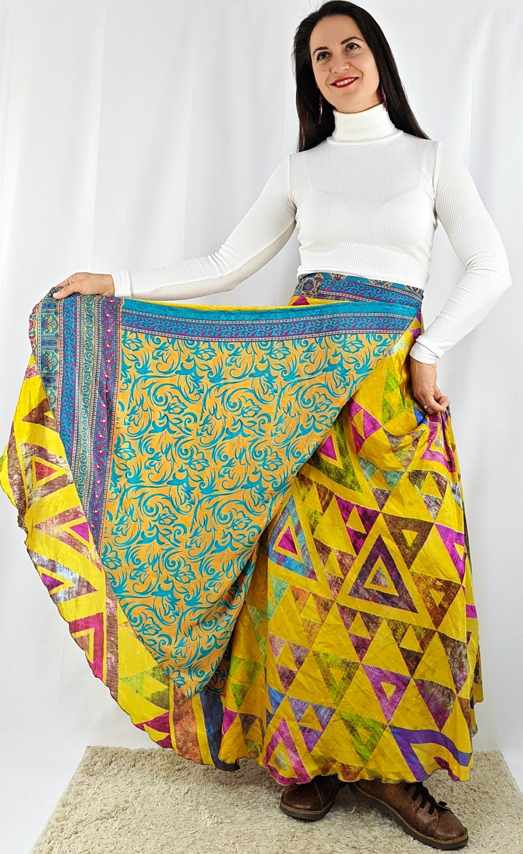 Lapszoknyáink újrahasznosított szárikból készülnek Indiában, egy hosszabb és egy rövidebb anyag derékban összevarrva! Két oldalú, kifordítható, mindkét oldala hordható, sokféleképpen köthető, variálható. Szoknyáinkból nincs két egyforma, mindegyikből csak EGY darab van, ha megtetszik, csapj le rá!