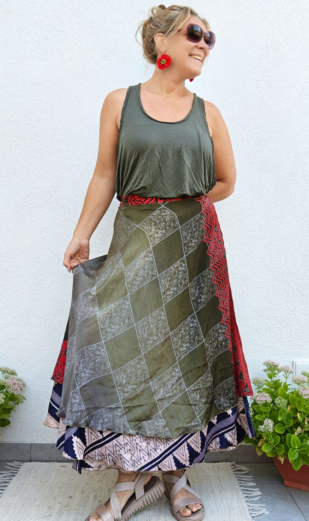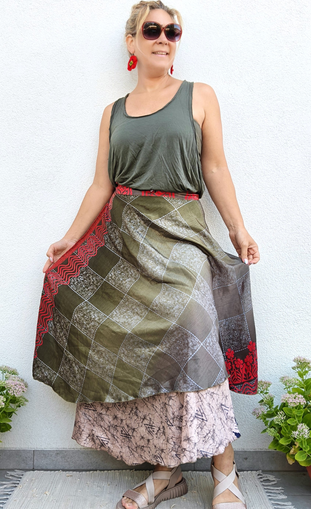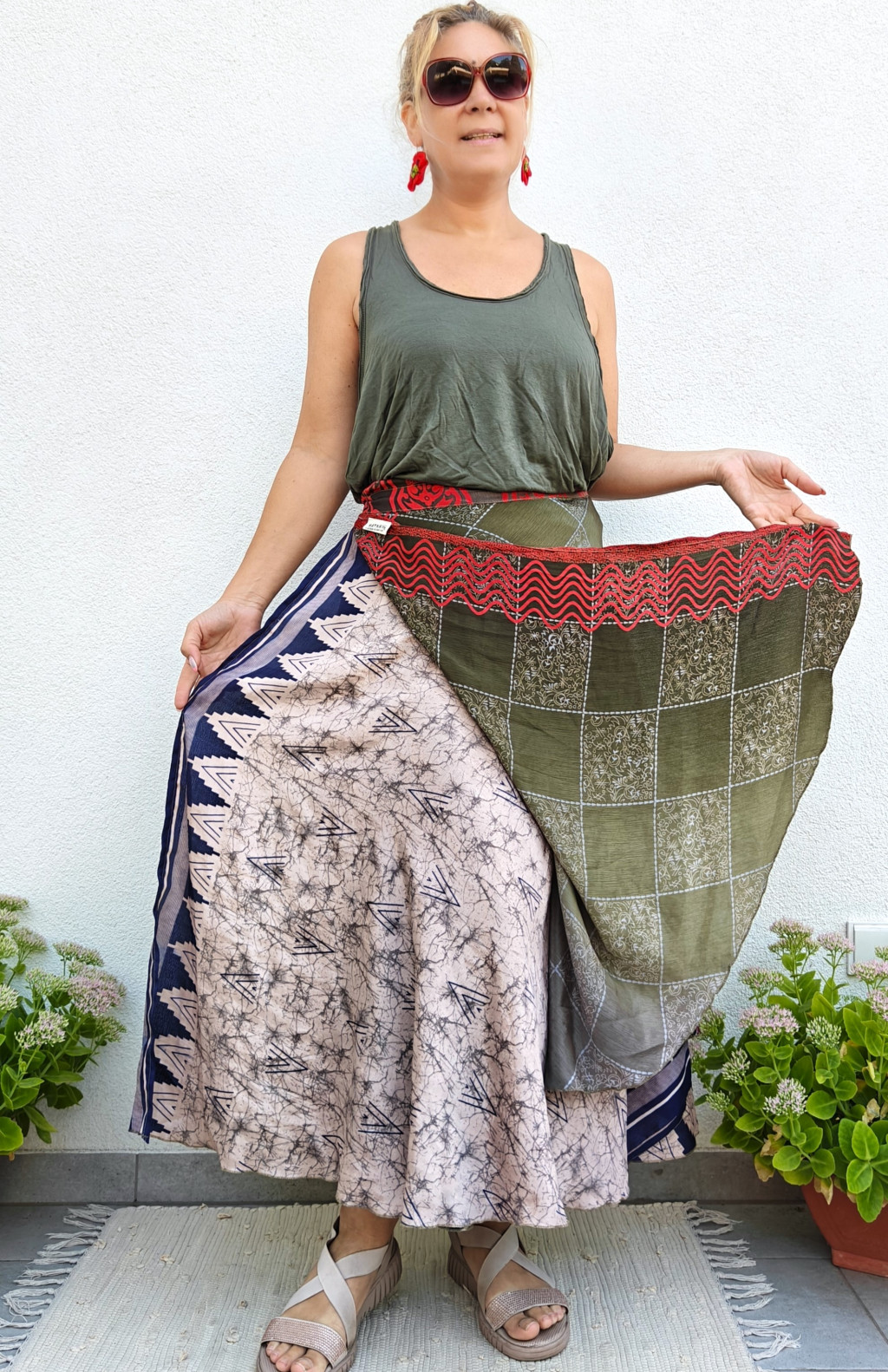 Lapszoknyáink újrahasznosított szárikból készülnek Indiában, egy hosszabb és egy rövidebb anyag derékban összevarrva! Két oldalú, kifordítható, mindkét oldala hordható, sokféleképpen köthető, variálható. Szoknyáinkból nincs két egyforma, mindegyikből csak EGY darab van, ha megtetszik, csapj le rá!