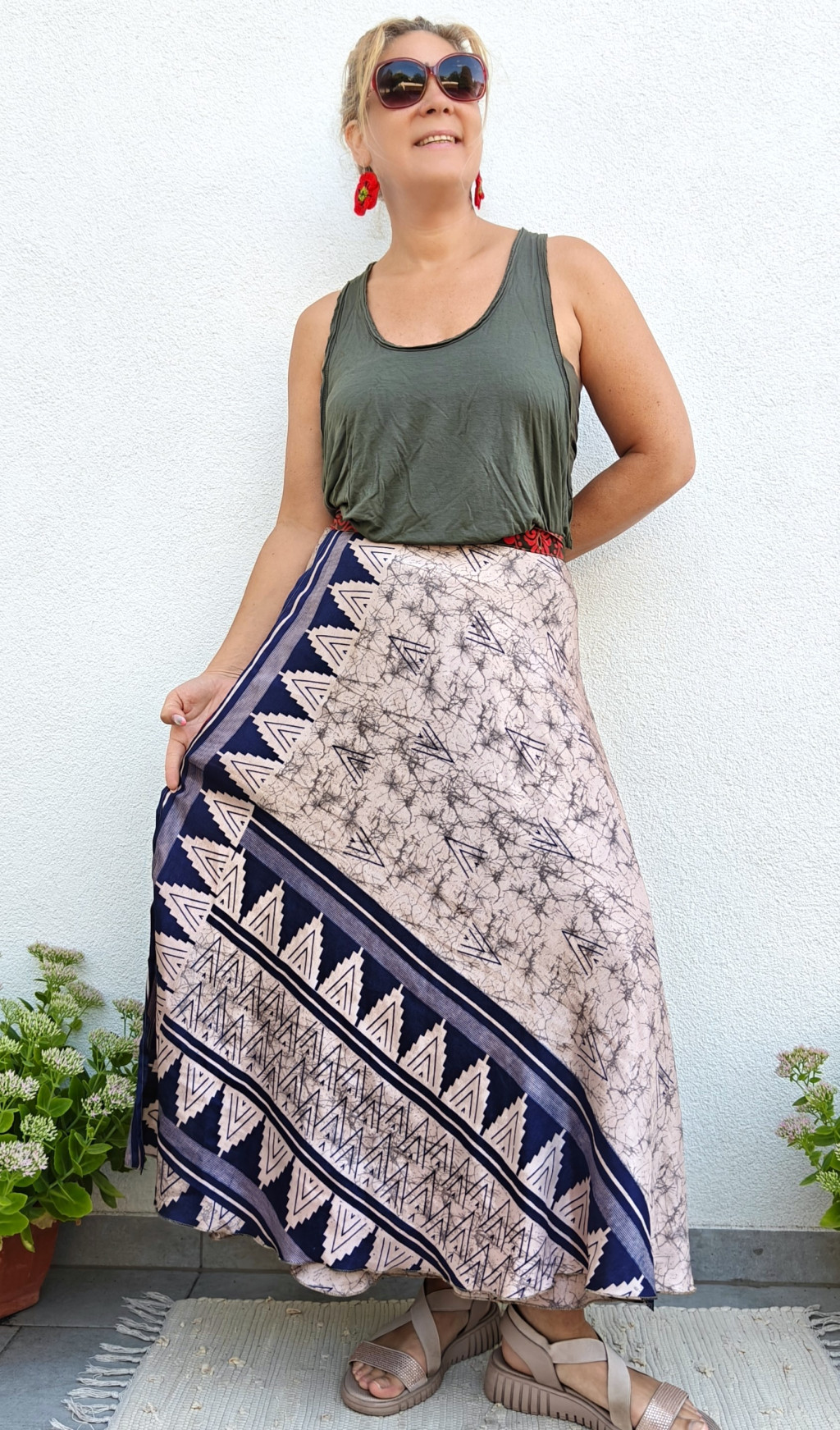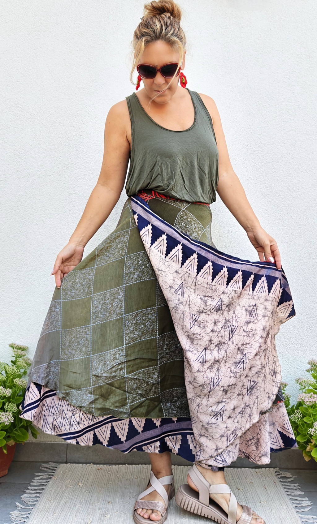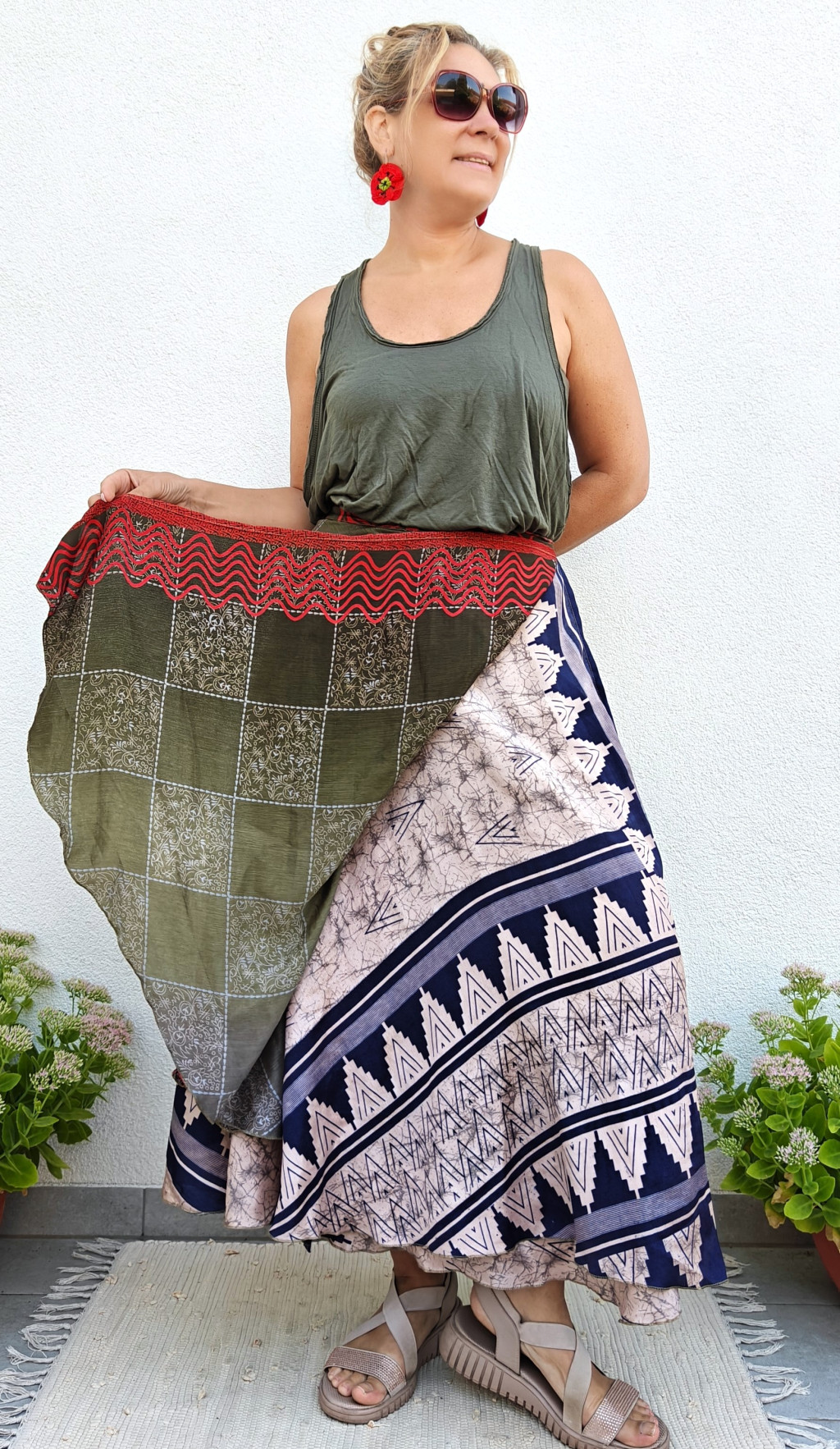 Lapszoknyáink újrahasznosított szárikból készülnek Indiában, egy hosszabb és egy rövidebb anyag derékban összevarrva! Két oldalú, kifordítható, mindkét oldala hordható, sokféleképpen köthető, variálható. Szoknyáinkból nincs két egyforma, mindegyikből csak EGY darab van, ha megtetszik, csapj le rá!
