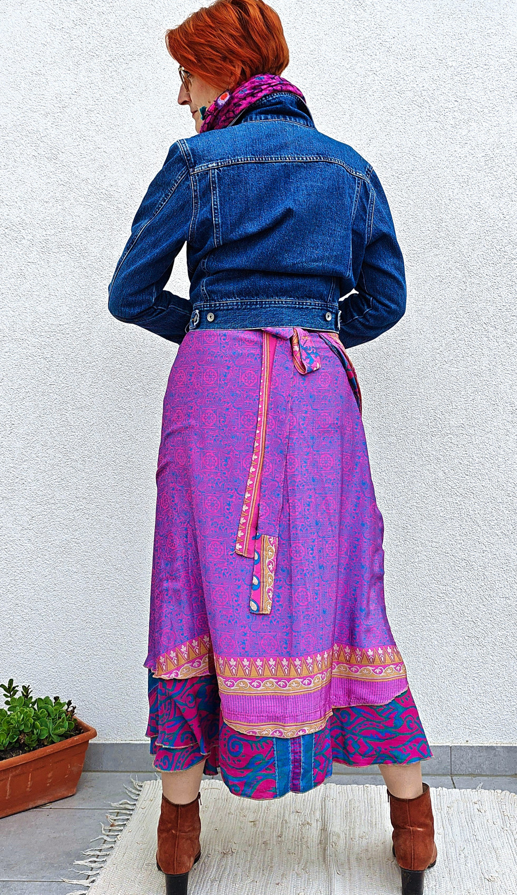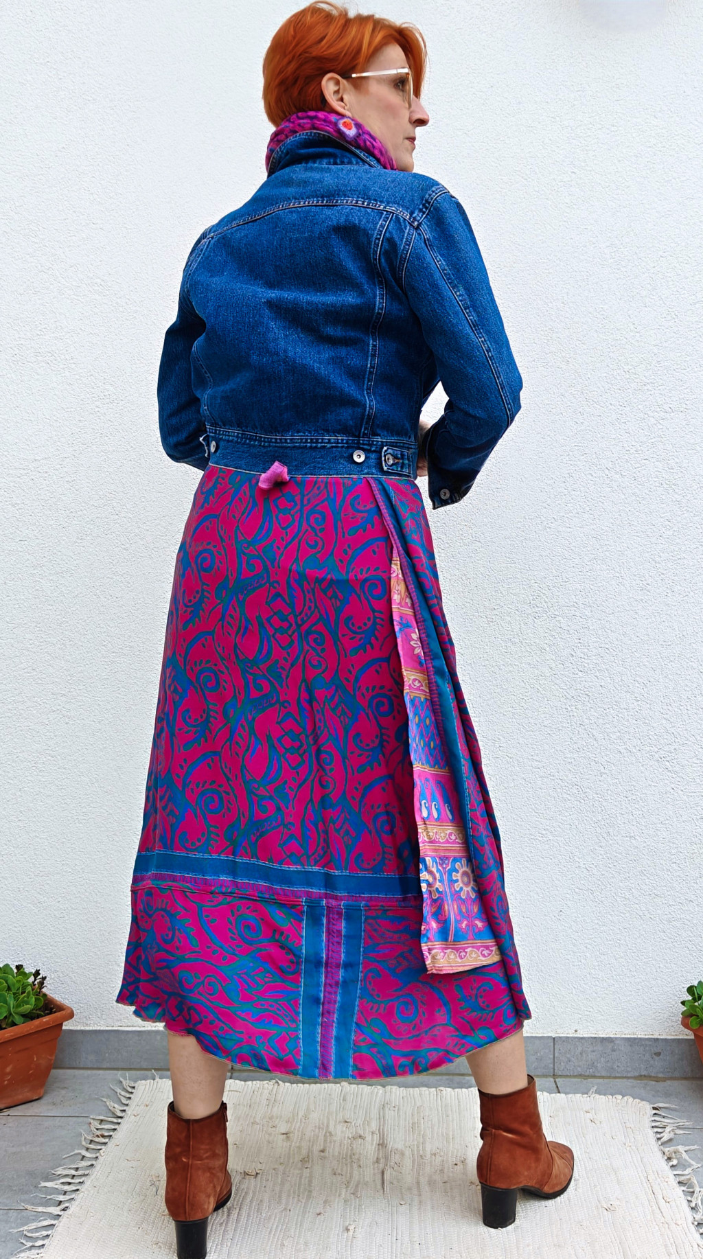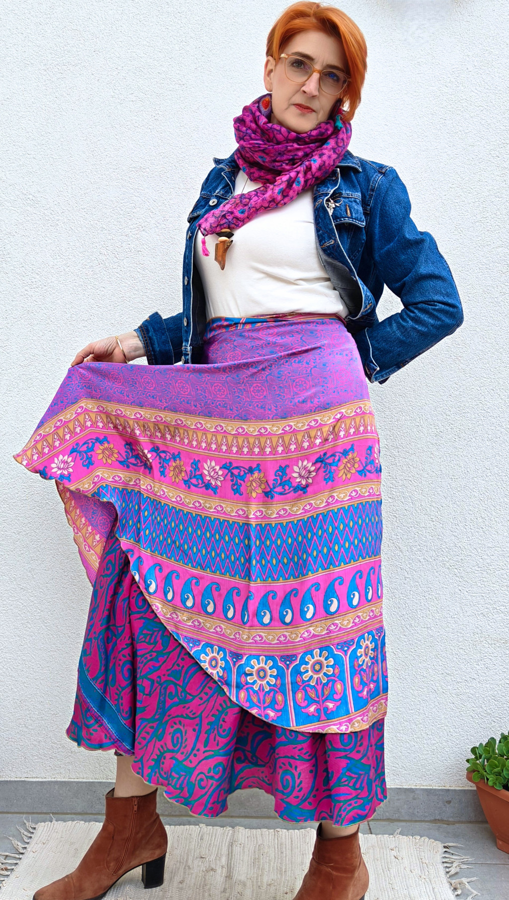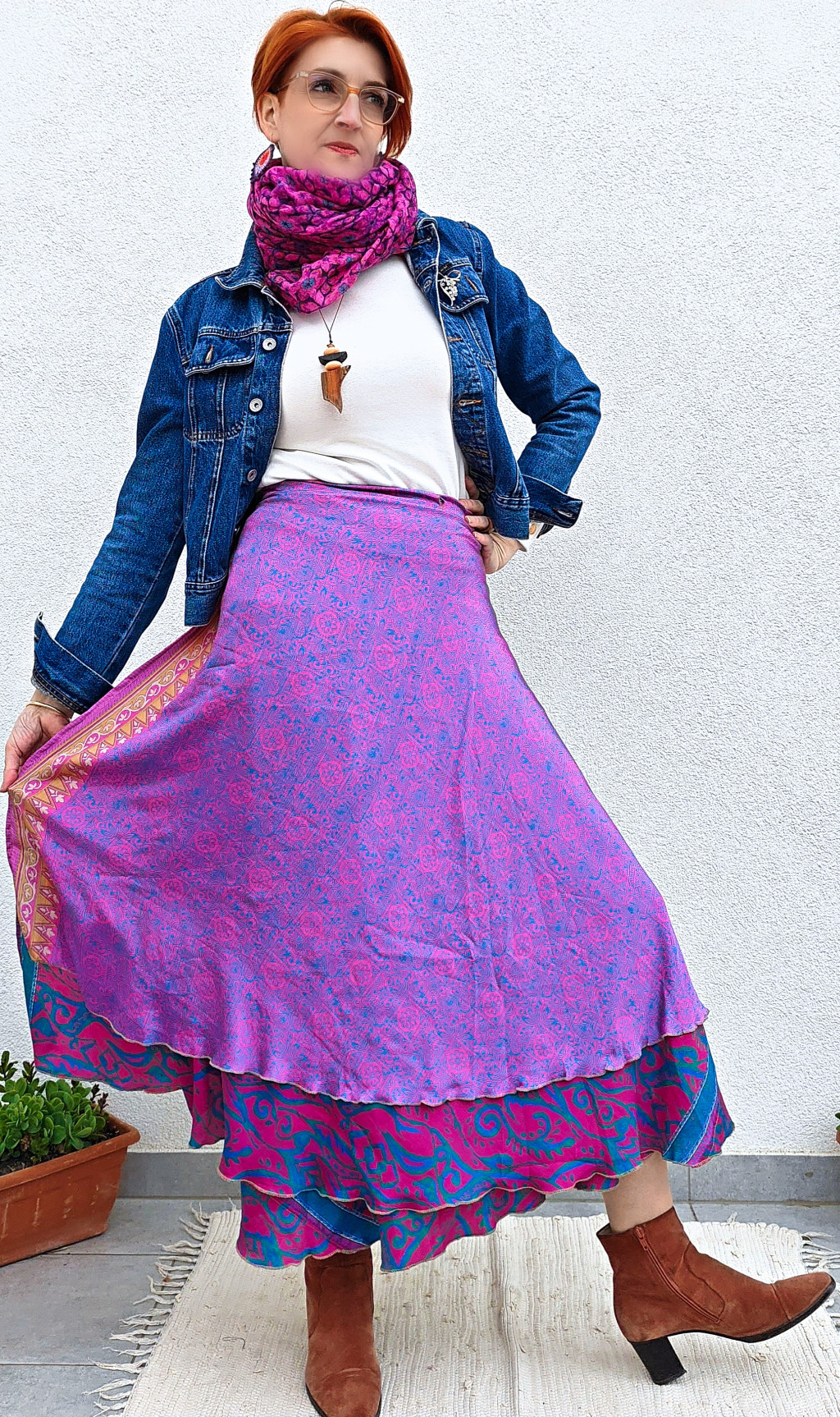 Lapszoknyáink újrahasznosított szárikból készülnek Indiában, egy hosszabb és egy rövidebb anyag derékban összevarrva! Két oldalú, kifordítható, mindkét oldala hordható, sokféleképpen köthető, variálható. Szoknyáinkból nincs két egyforma, mindegyikből csak EGY darab van, ha megtetszik, csapj le rá!