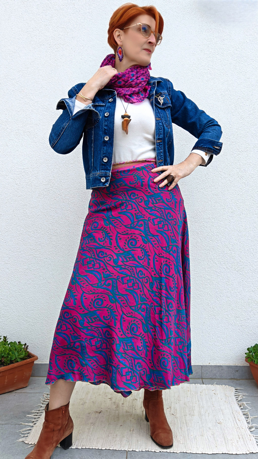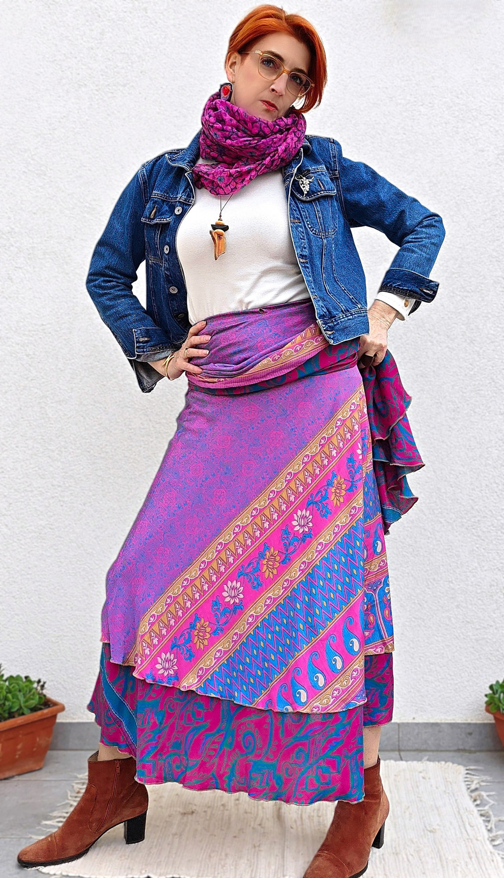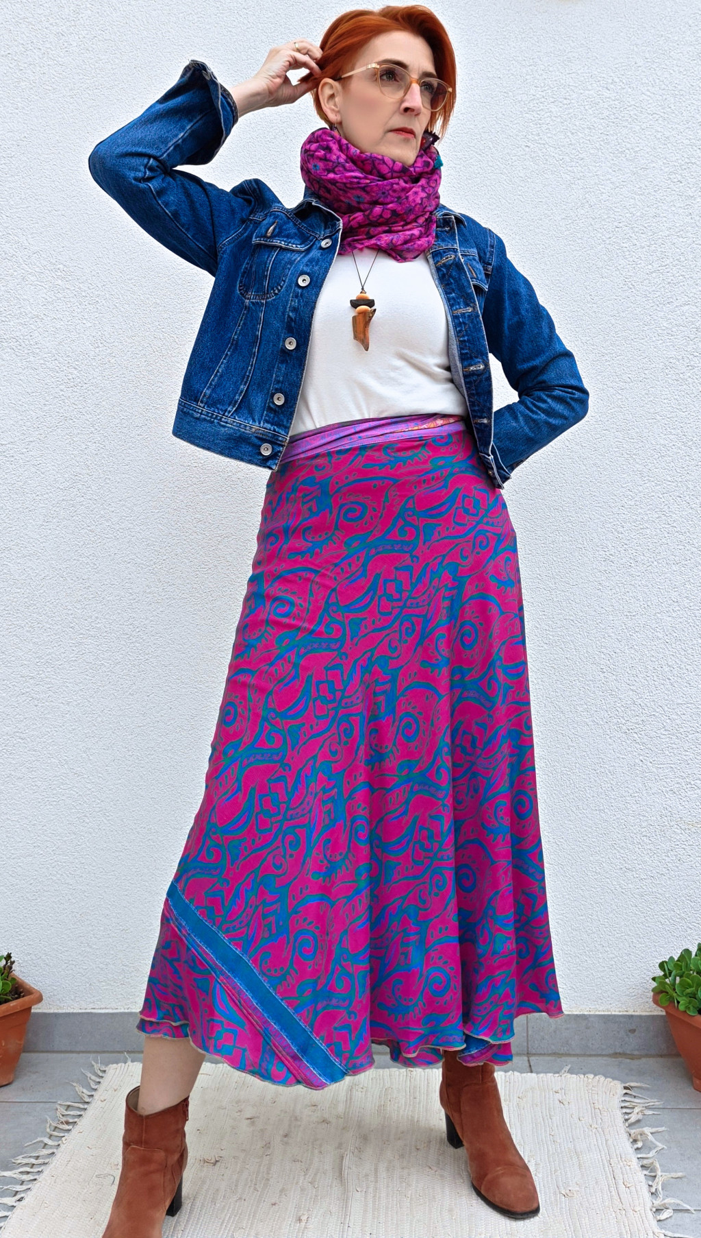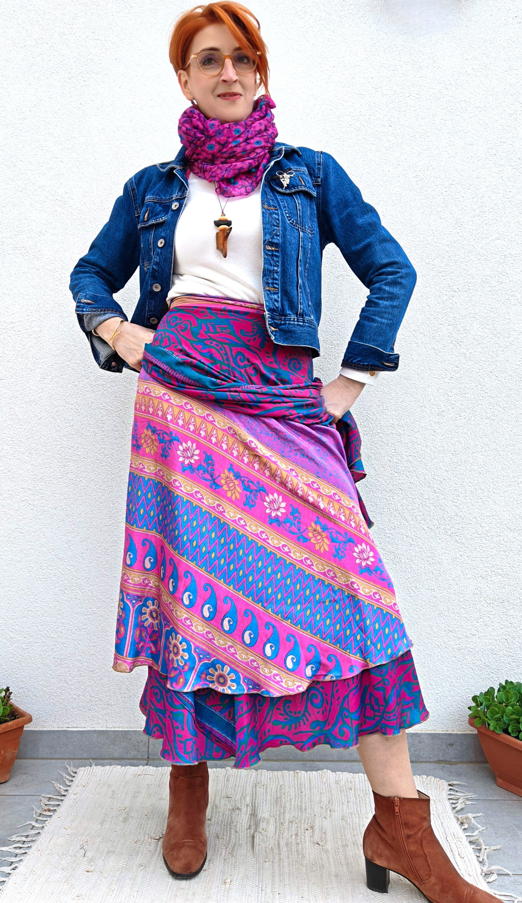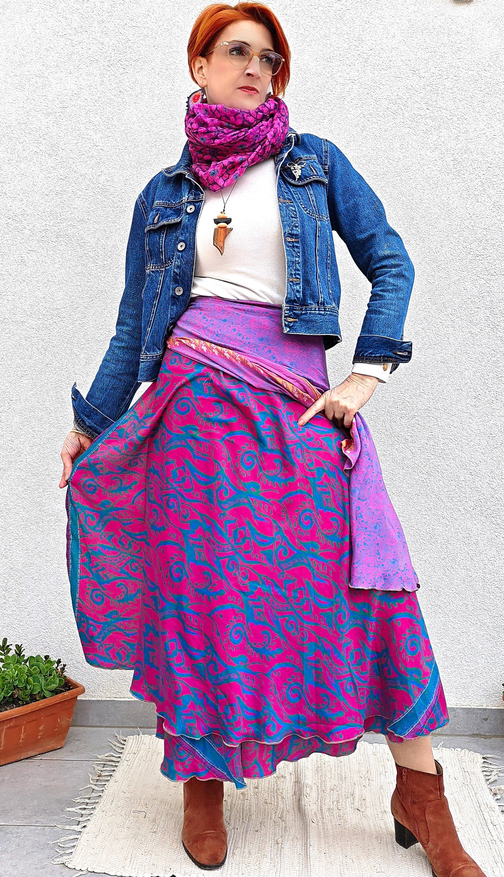Lapszoknyáink újrahasznosított szárikból készülnek Indiában, egy hosszabb és egy rövidebb anyag derékban összevarrva! Két oldalú, kifordítható, mindkét oldala hordható, sokféleképpen köthető, variálható. Szoknyáinkból nincs két egyforma, mindegyikből csak EGY darab van, ha megtetszik, csapj le rá!