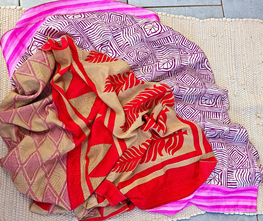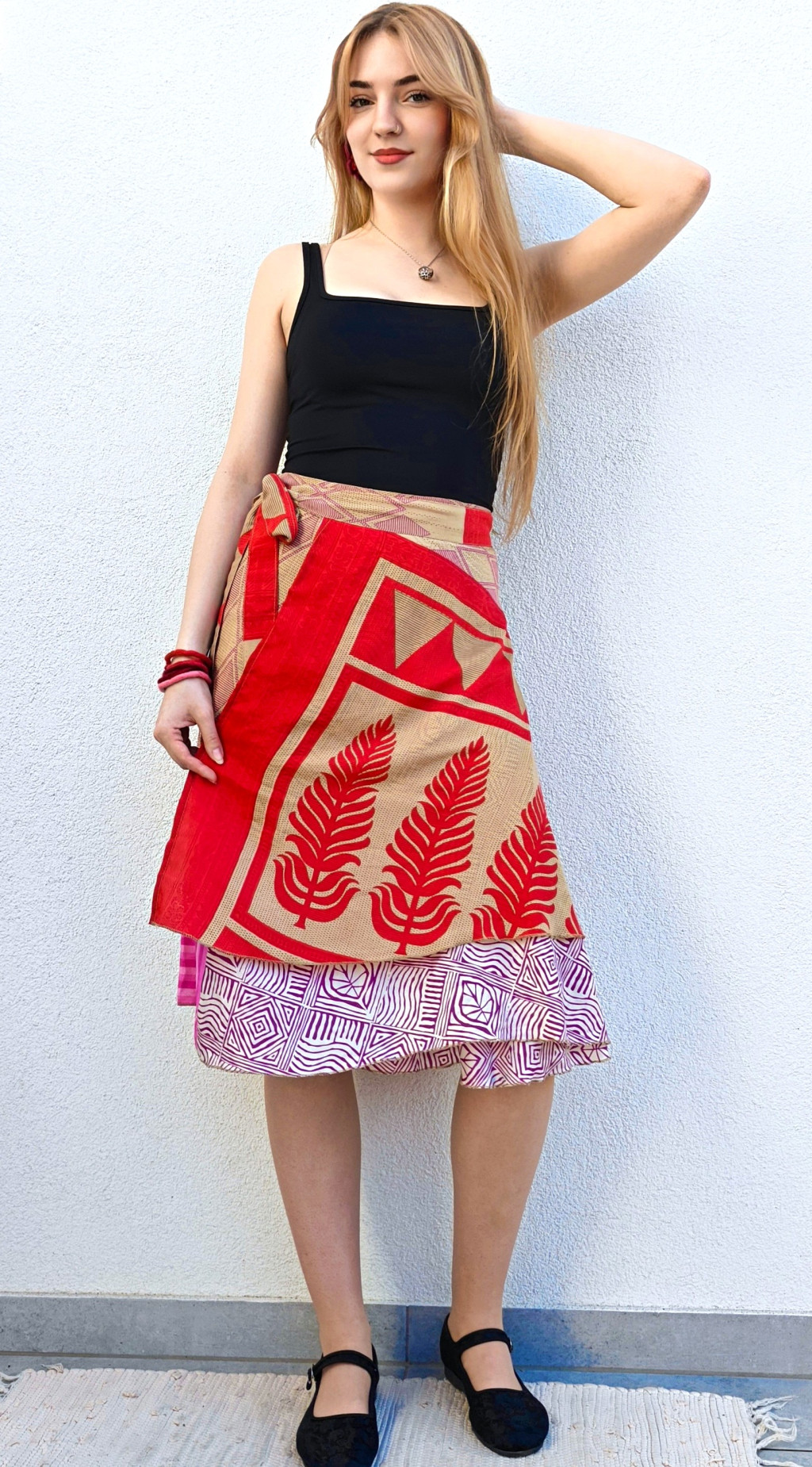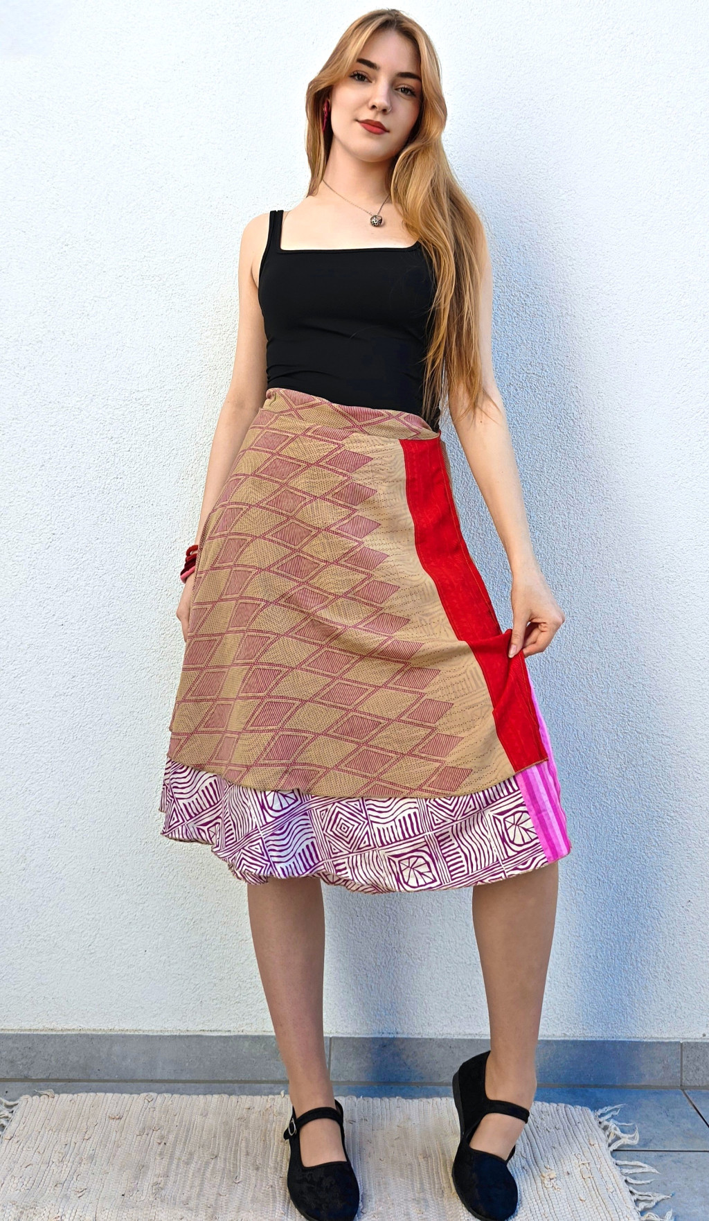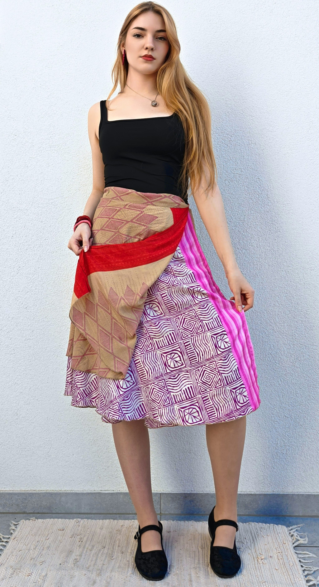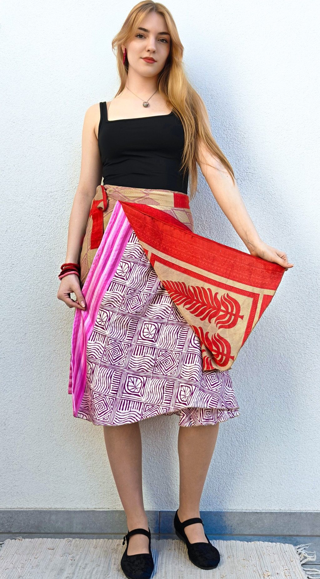 Lapszoknyáink újrahasznosított szárikból készülnek Indiában, egy hosszabb és egy rövidebb anyag derékban összevarrva! Két oldalú, kifordítható, mindkét oldala hordható, sokféleképpen köthető, variálható. Szoknyáinkból nincs két egyforma, mindegyikből csak EGY darab van, ha megtetszik, csapj le rá!