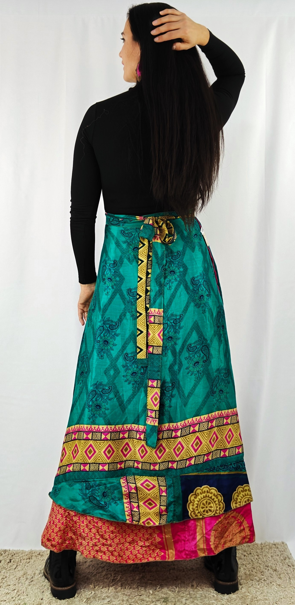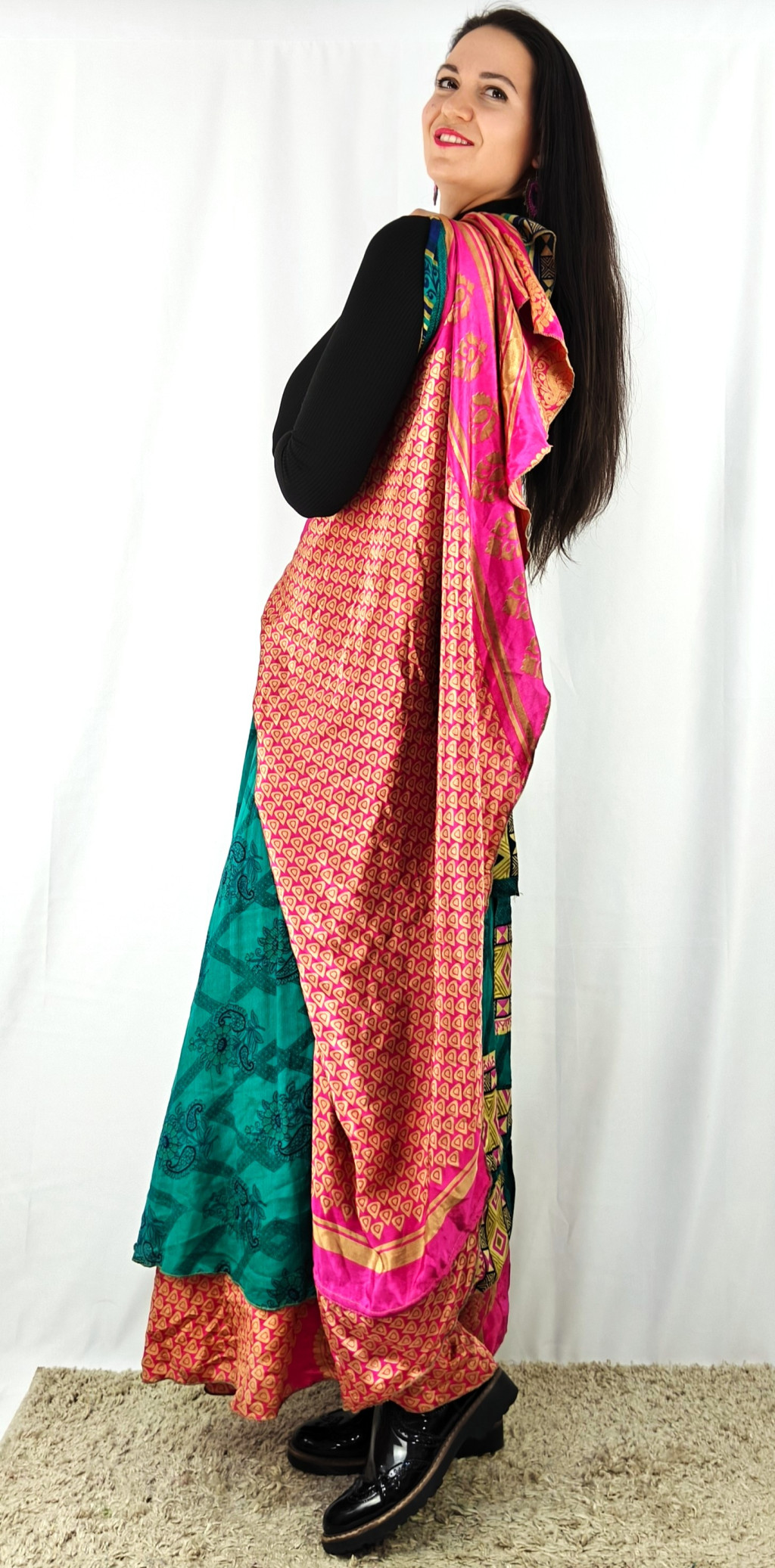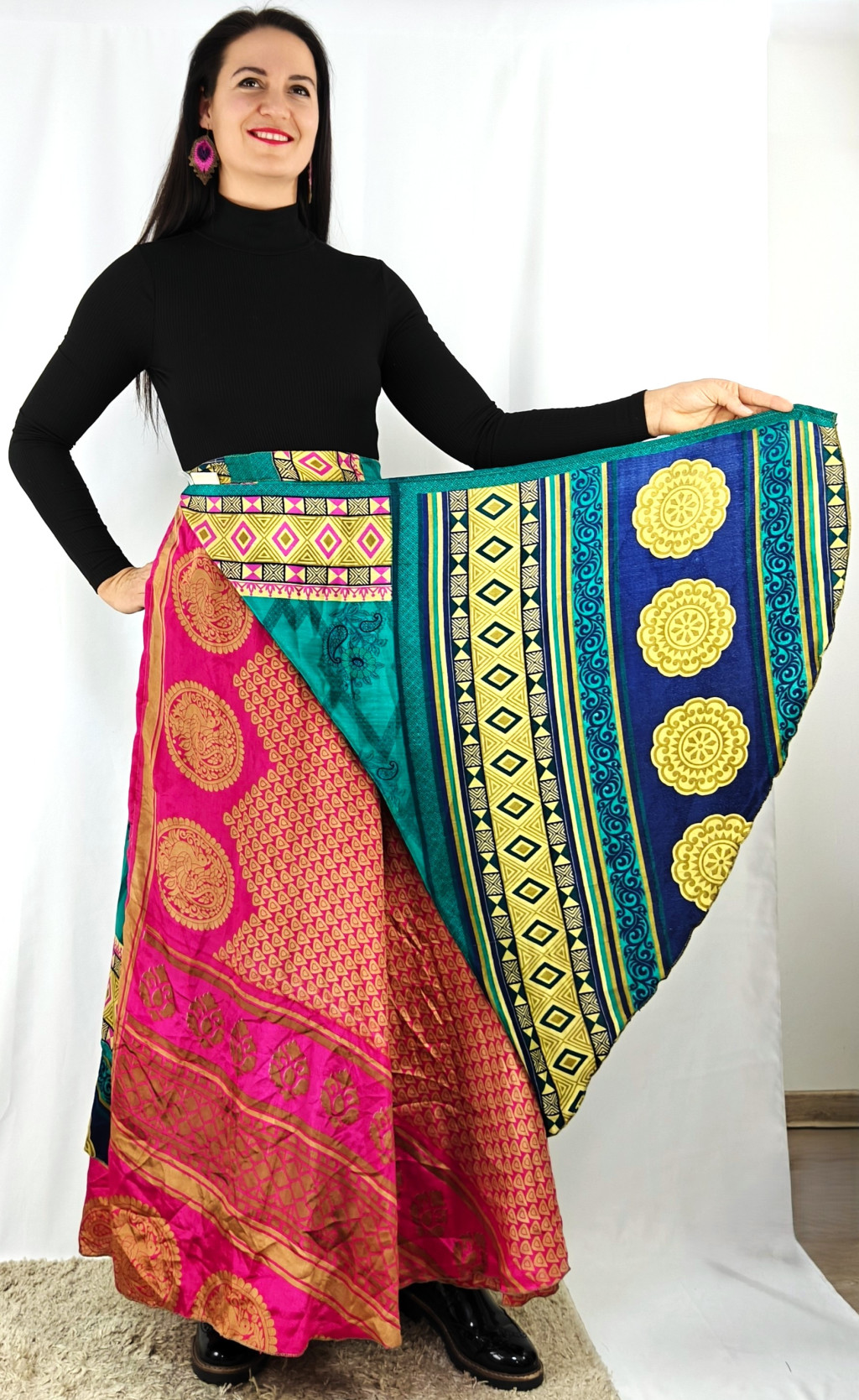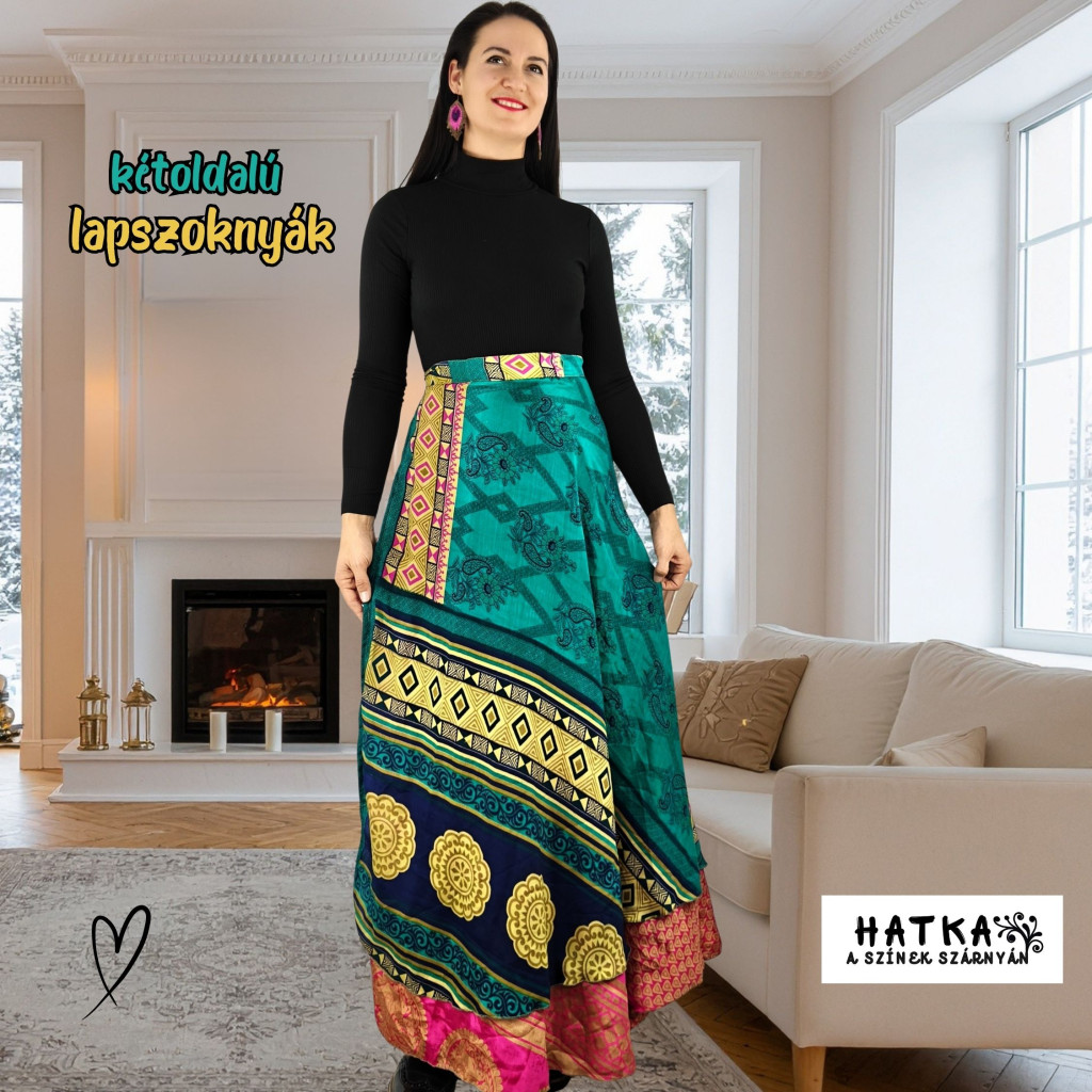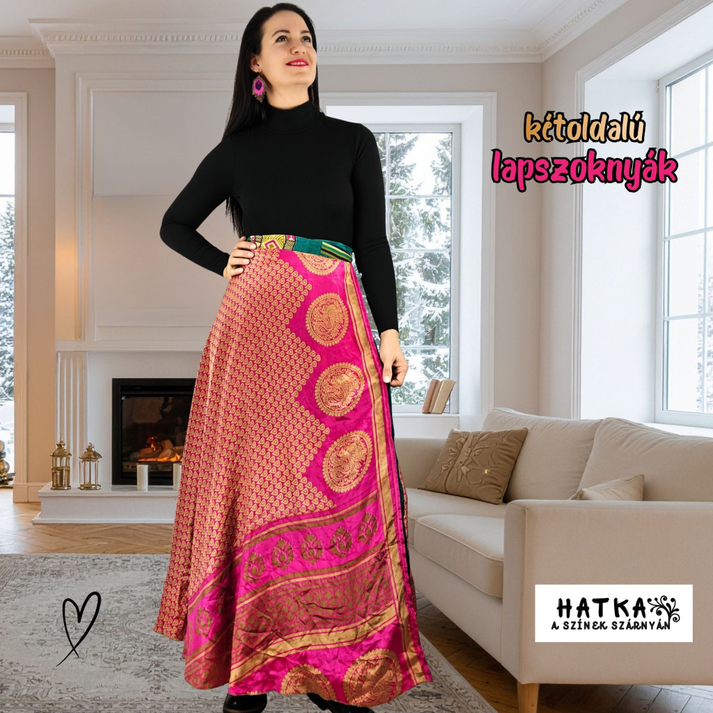 Lapszoknyáink újrahasznosított szárikból készülnek Indiában, egy hosszabb és egy rövidebb anyag derékban összevarrva! Két oldalú, kifordítható, mindkét oldala hordható, sokféleképpen köthető, variálható. Szoknyáinkból nincs két egyforma, mindegyikből csak EGY darab van, ha megtetszik, csapj le rá!