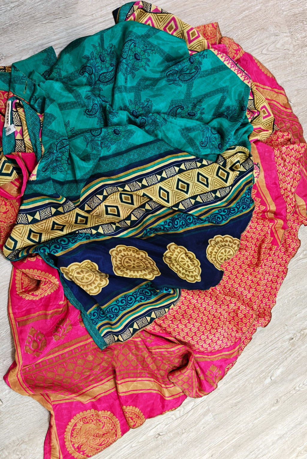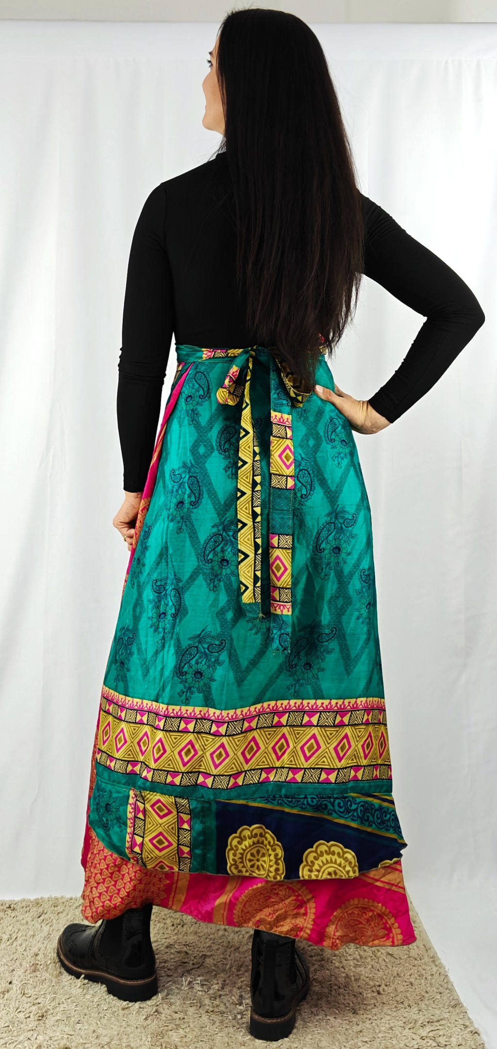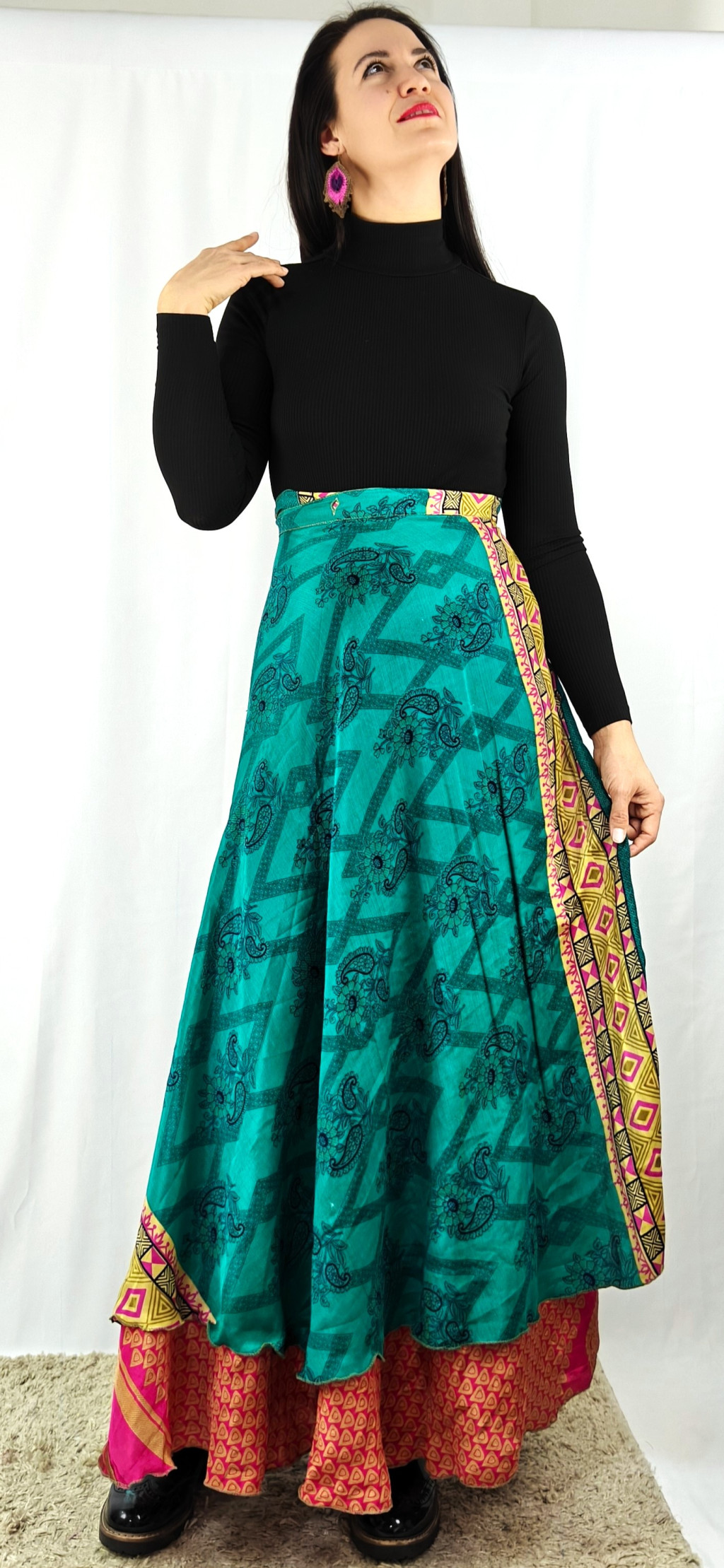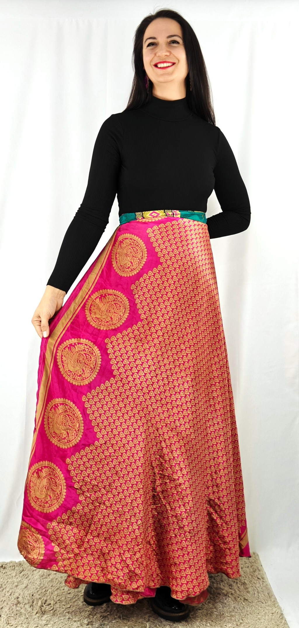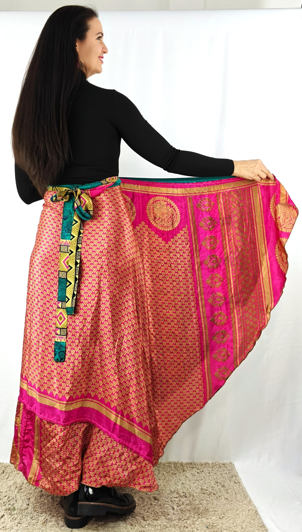 Lapszoknyáink újrahasznosított szárikból készülnek Indiában, egy hosszabb és egy rövidebb anyag derékban összevarrva! Két oldalú, kifordítható, mindkét oldala hordható, sokféleképpen köthető, variálható. Szoknyáinkból nincs két egyforma, mindegyikből csak EGY darab van, ha megtetszik, csapj le rá!