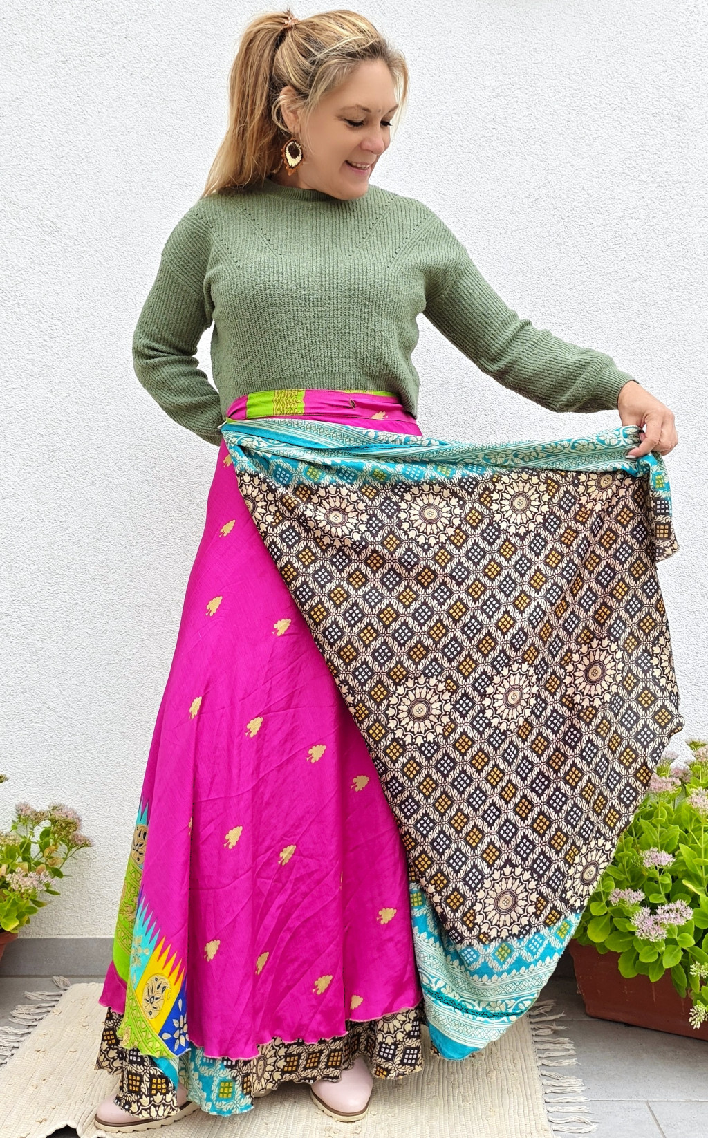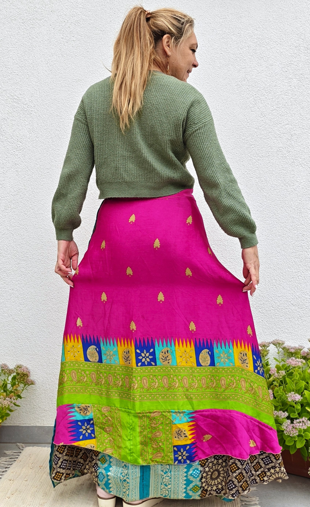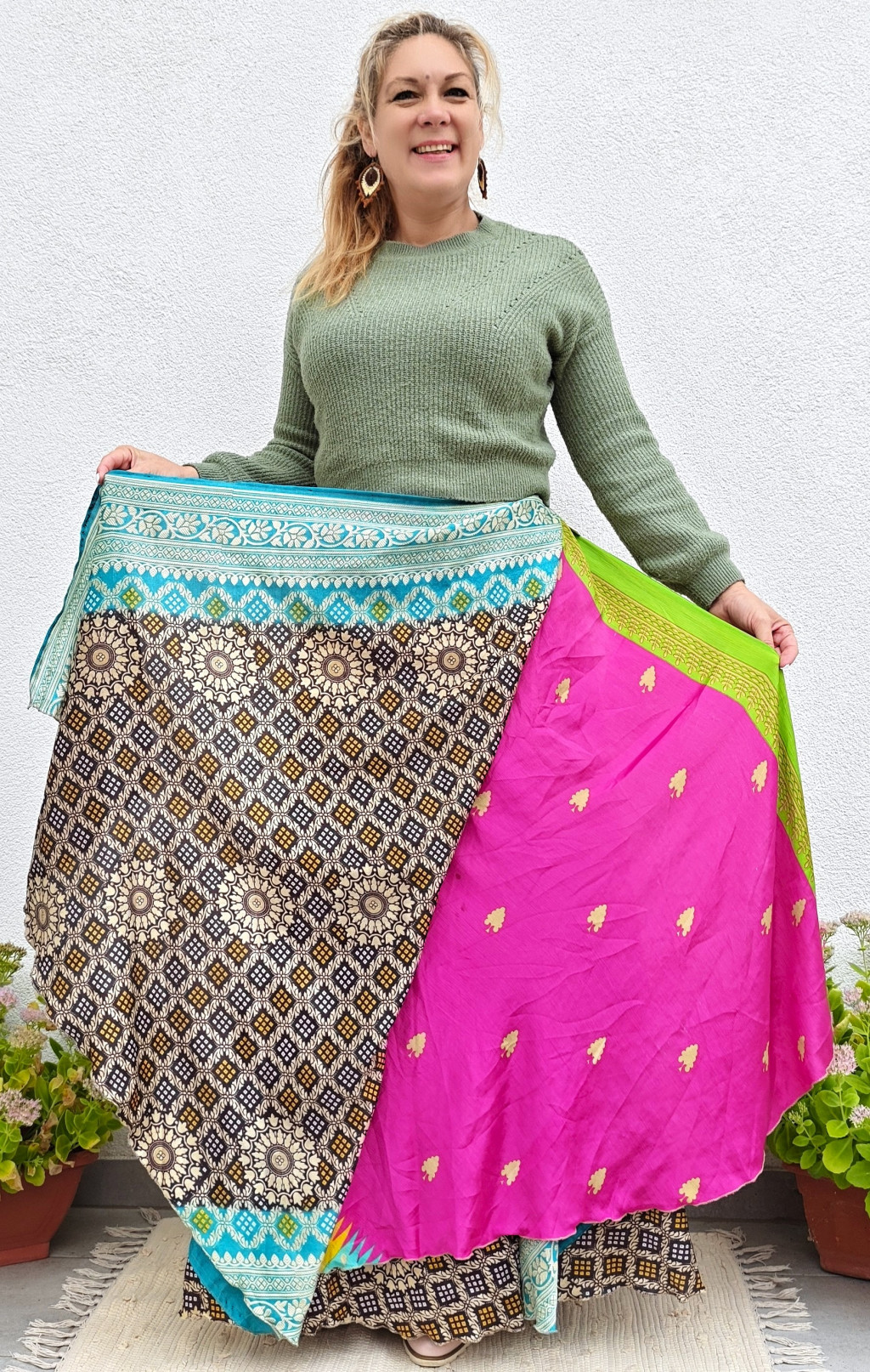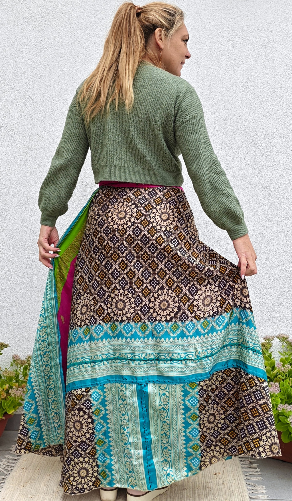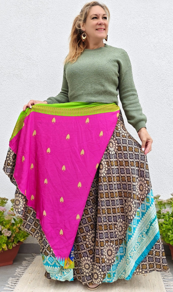 Lapszoknyáink újrahasznosított szárikból készülnek Indiában, egy hosszabb és egy rövidebb anyag derékban összevarrva! Két oldalú, kifordítható, mindkét oldala hordható, sokféleképpen köthető, variálható. Szoknyáinkból nincs két egyforma, mindegyikből csak EGY darab van, ha megtetszik, csapj le rá!