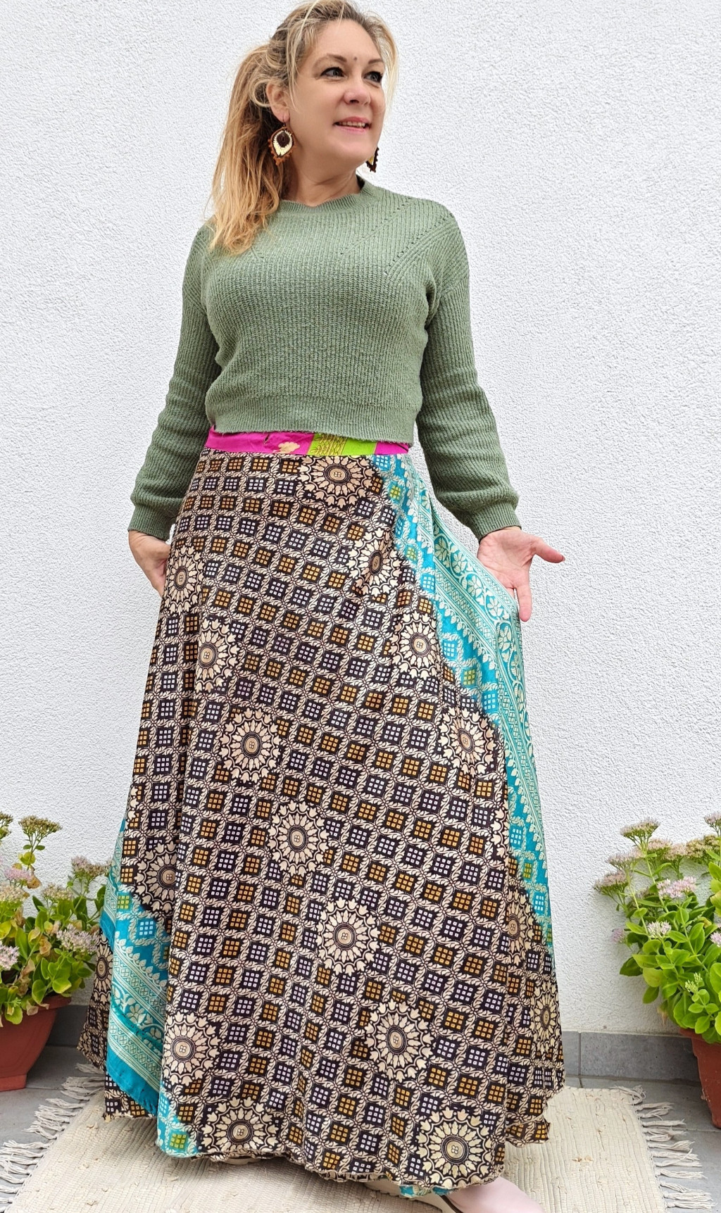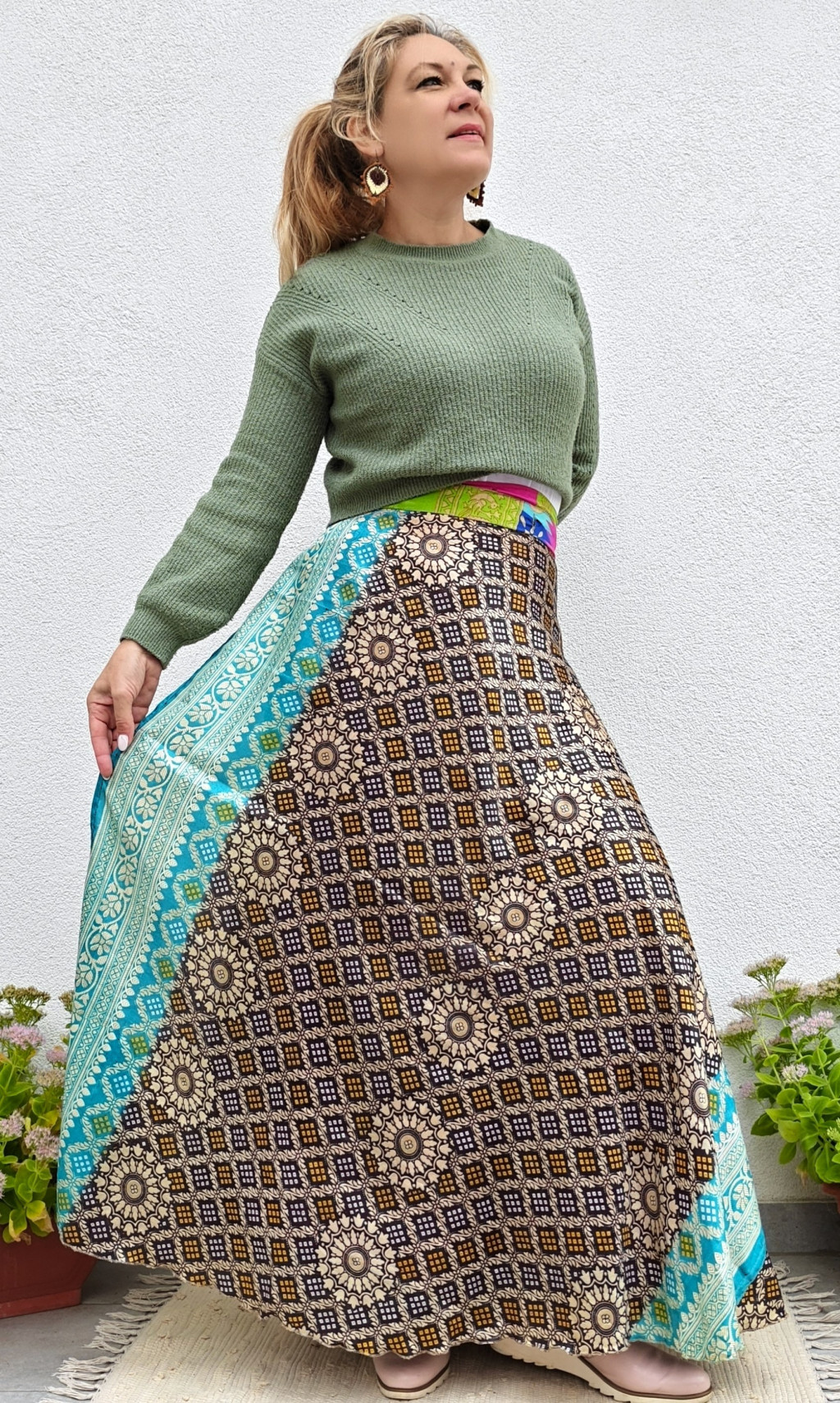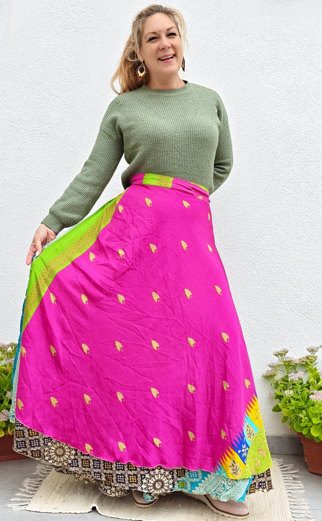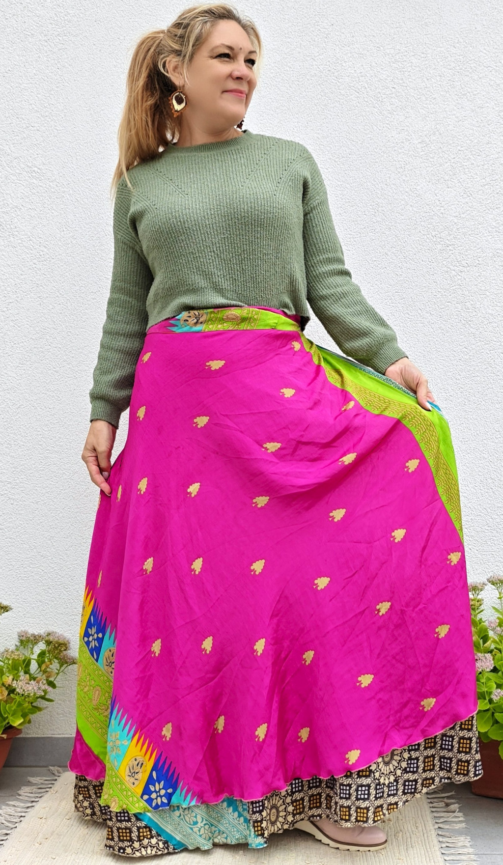Lapszoknyáink újrahasznosított szárikból készülnek Indiában, egy hosszabb és egy rövidebb anyag derékban összevarrva! Két oldalú, kifordítható, mindkét oldala hordható, sokféleképpen köthető, variálható. Szoknyáinkból nincs két egyforma, mindegyikből csak EGY darab van, ha megtetszik, csapj le rá!