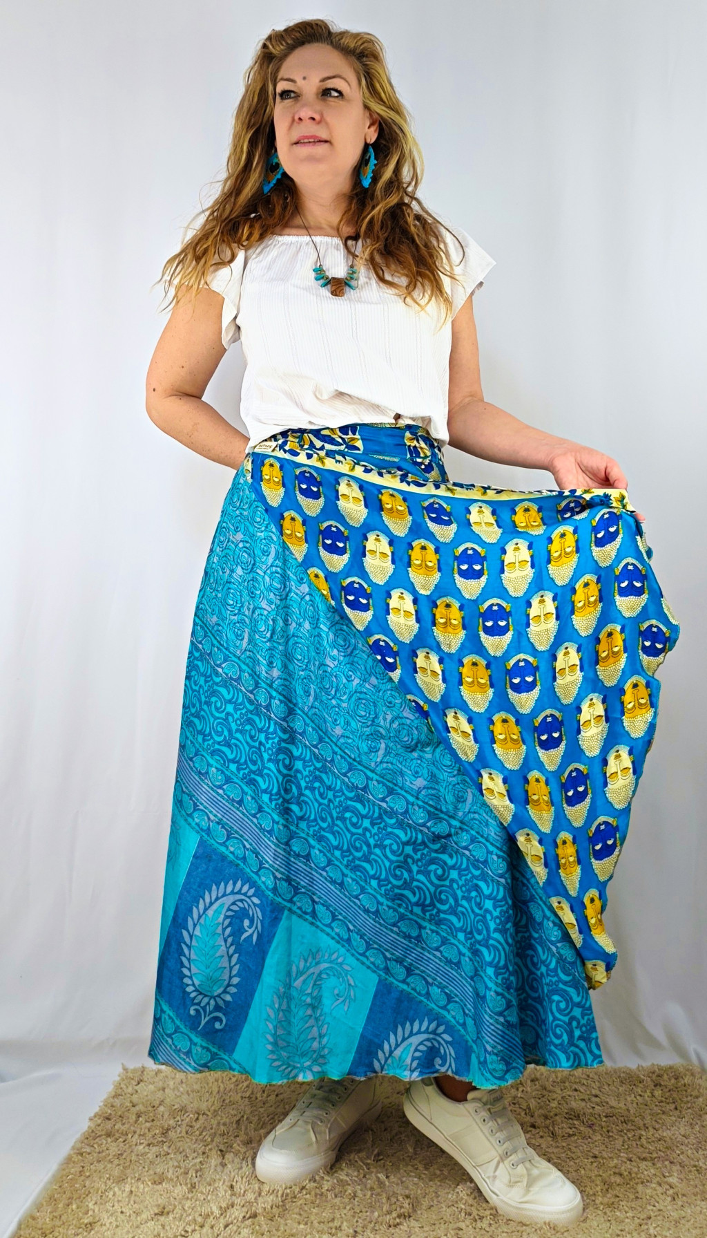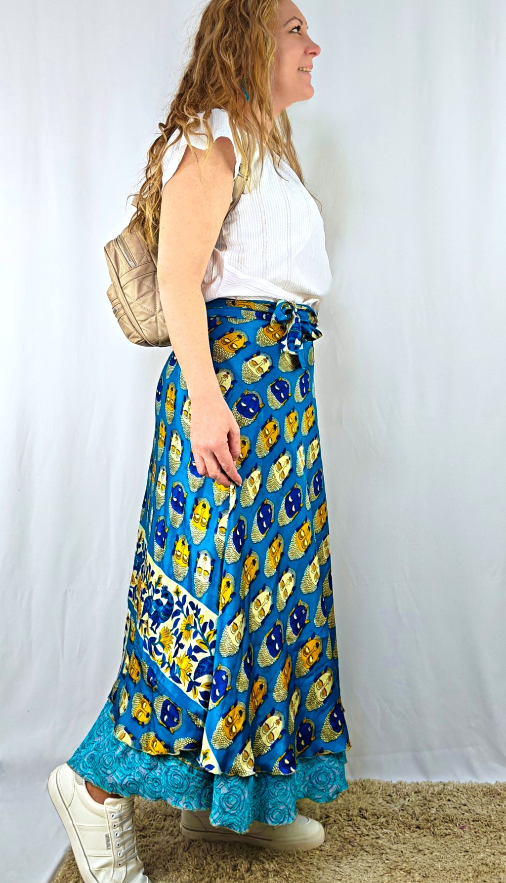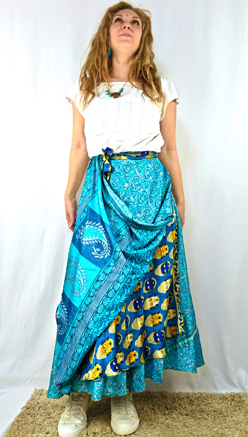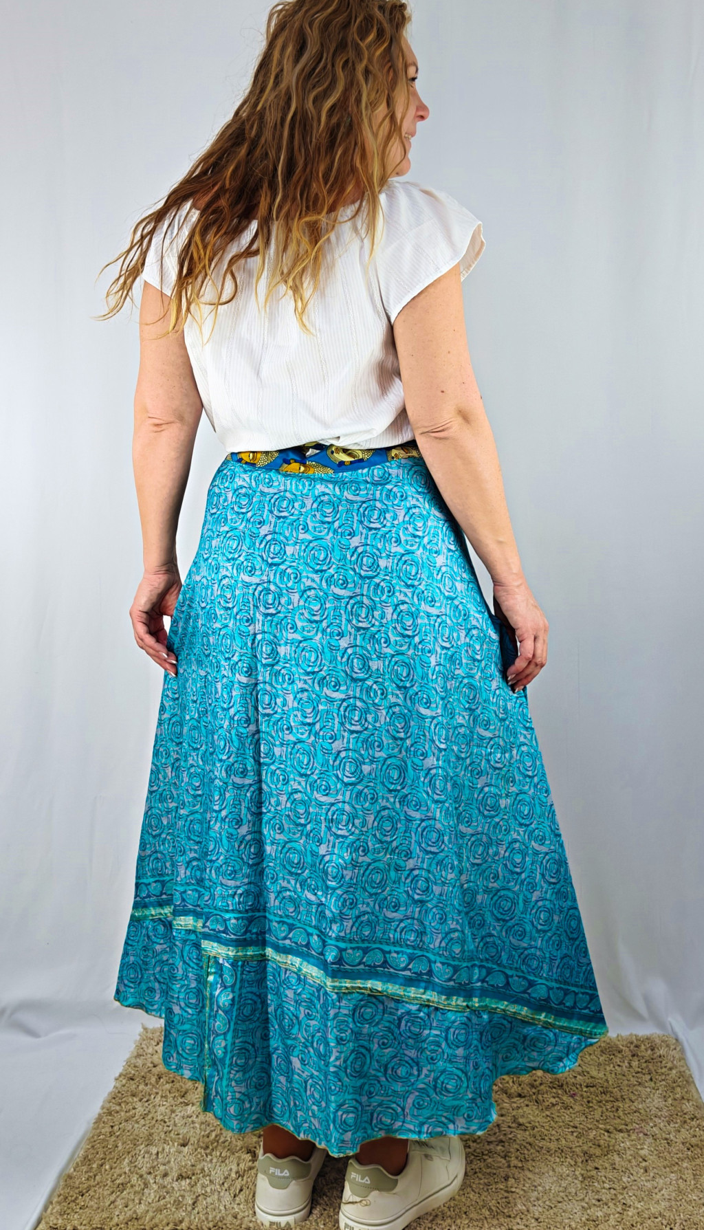 Lapszoknyáink újrahasznosított szárikból készülnek Indiában, egy hosszabb és egy rövidebb anyag derékban összevarrva! Két oldalú, kifordítható, mindkét oldala hordható, sokféleképpen köthető, variálható. Szoknyáinkból nincs két egyforma, mindegyikből csak EGY darab van, ha megtetszik, csapj le rá!