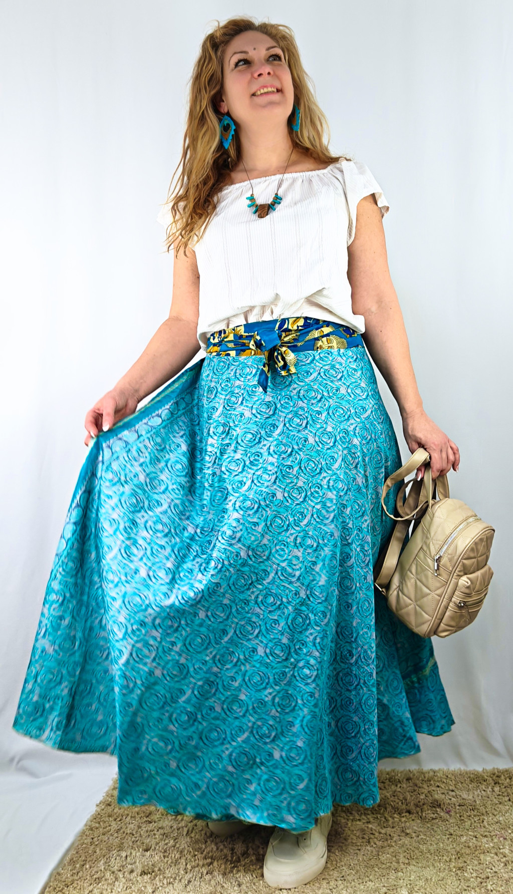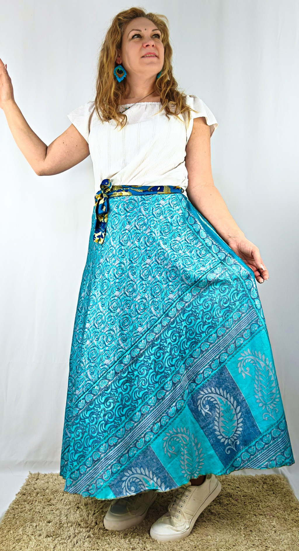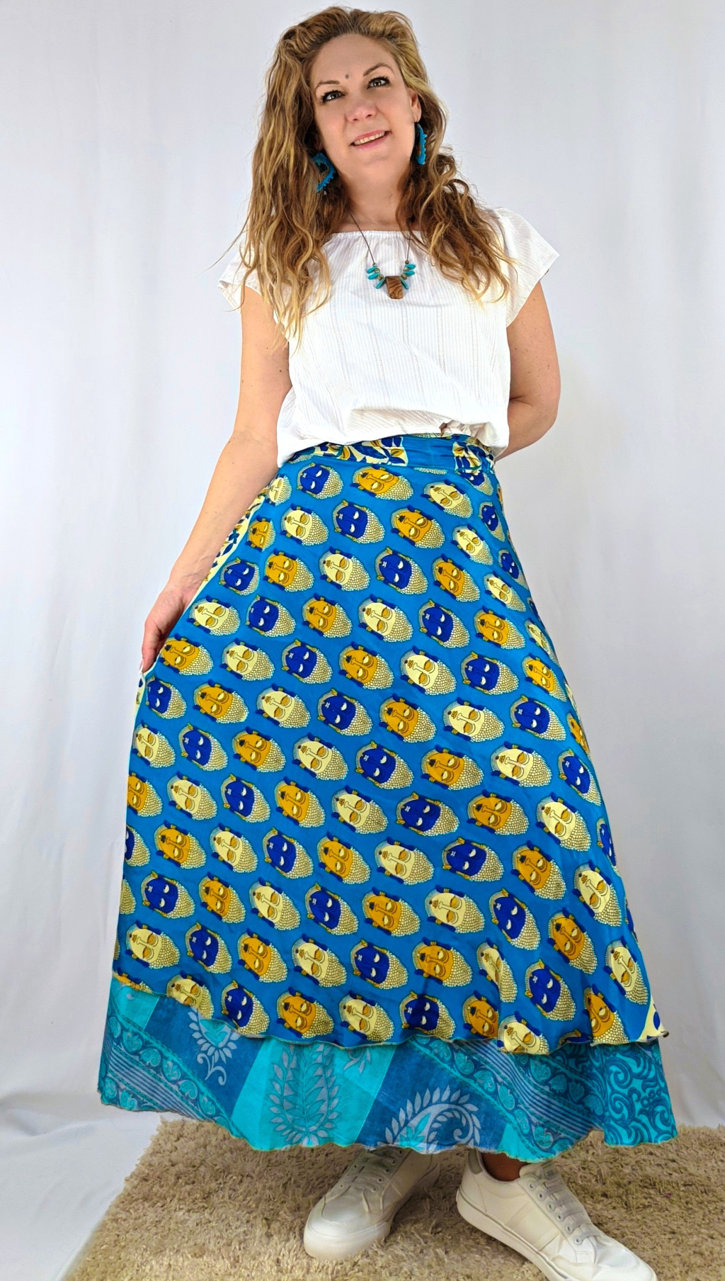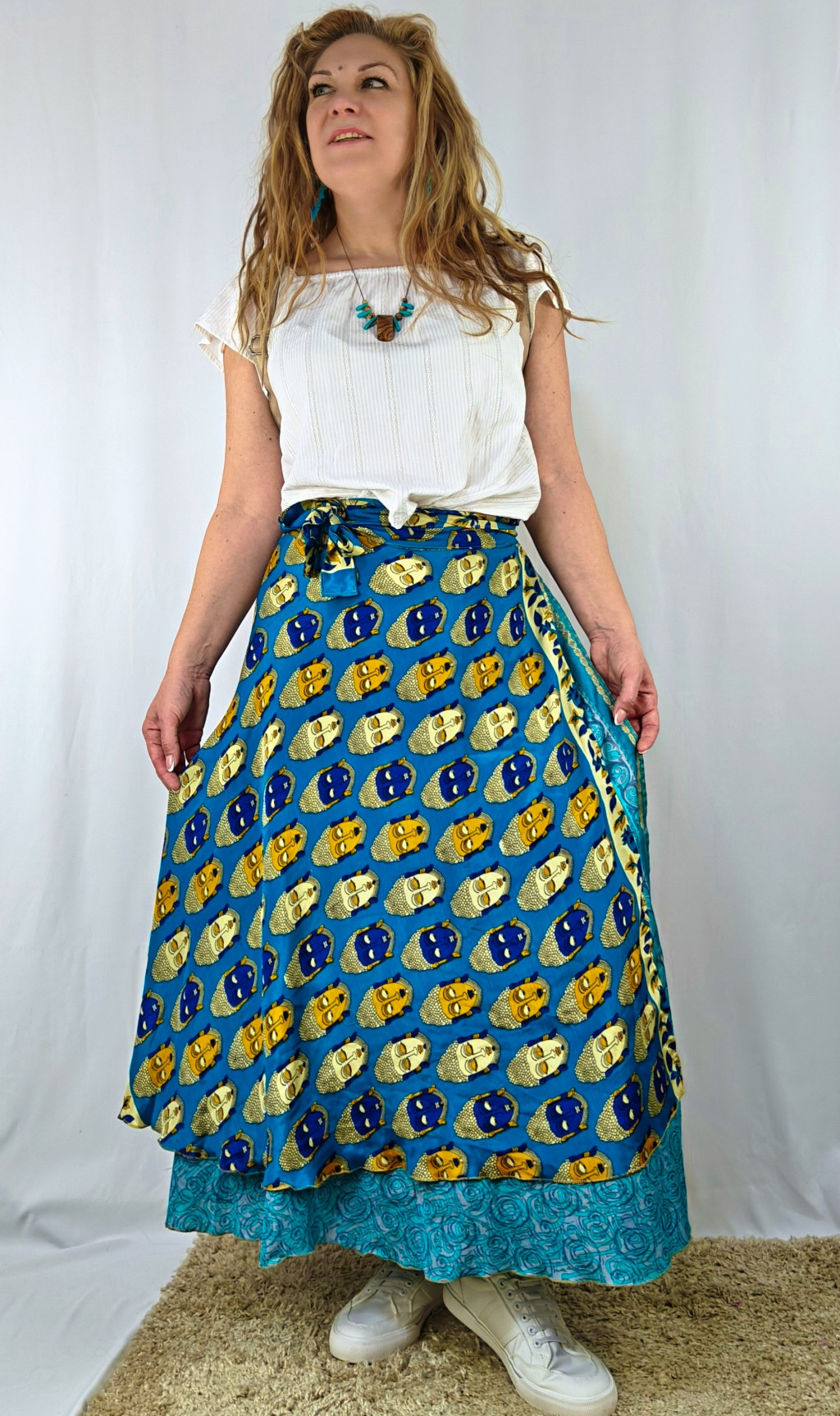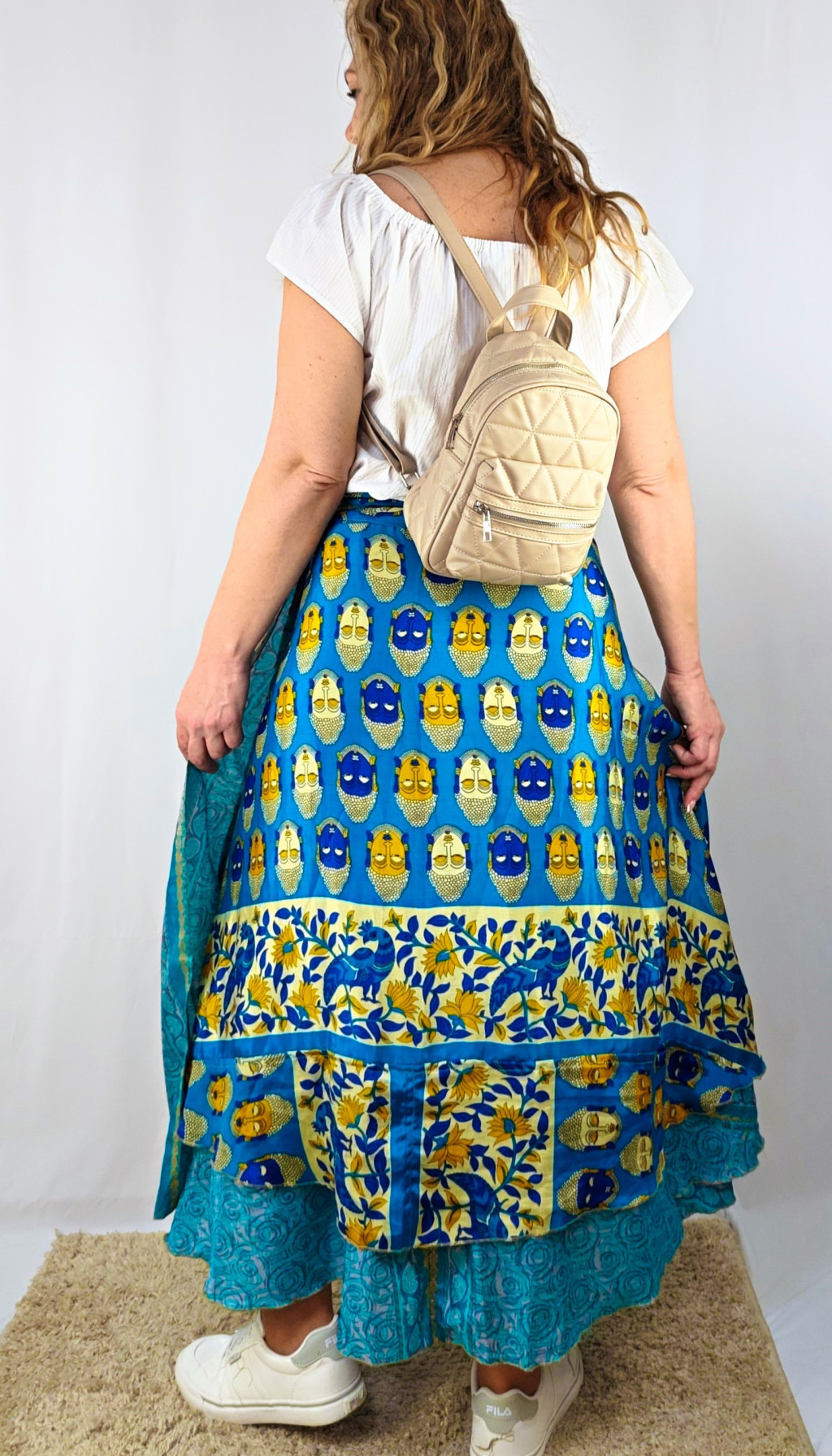 Lapszoknyáink újrahasznosított szárikból készülnek Indiában, egy hosszabb és egy rövidebb anyag derékban összevarrva! Két oldalú, kifordítható, mindkét oldala hordható, sokféleképpen köthető, variálható. Szoknyáinkból nincs két egyforma, mindegyikből csak EGY darab van, ha megtetszik, csapj le rá!