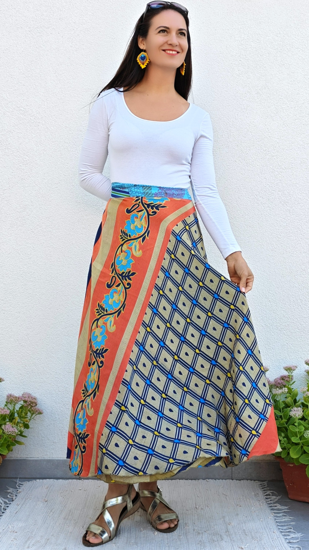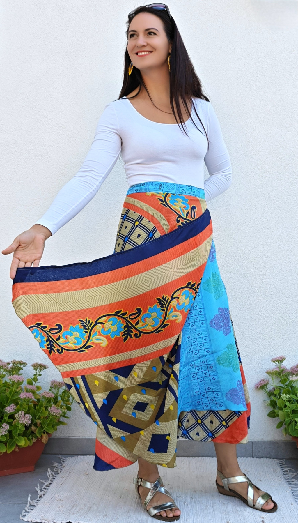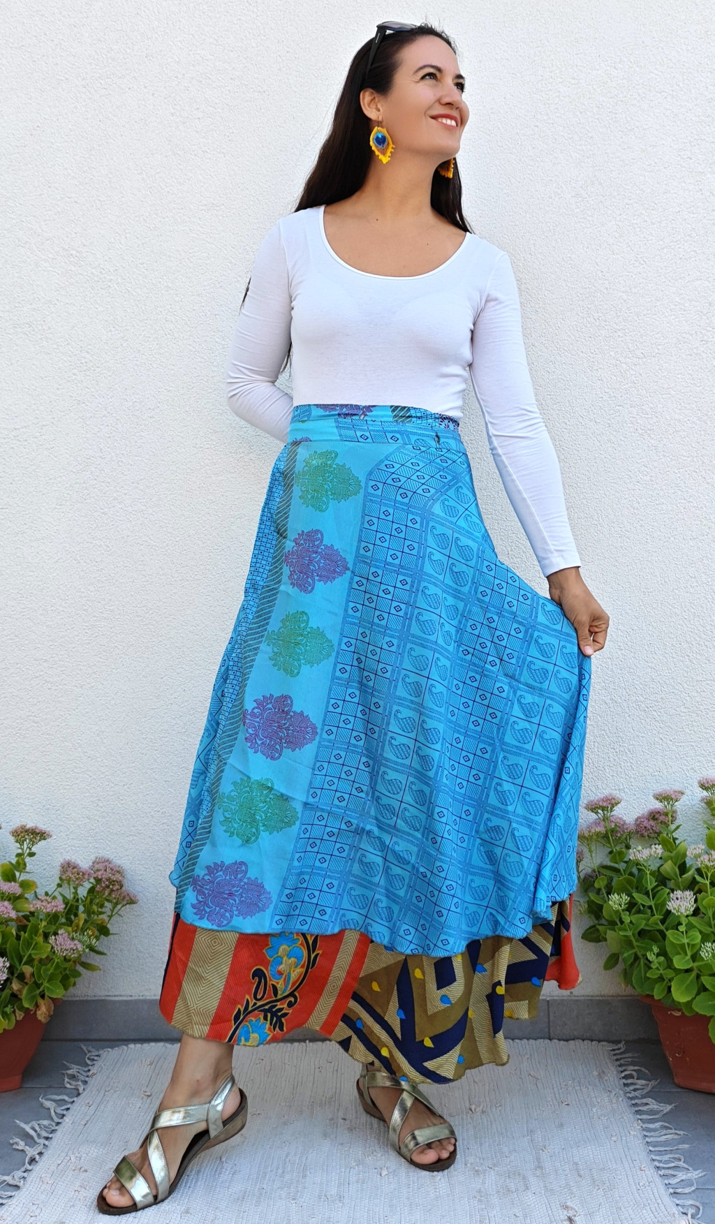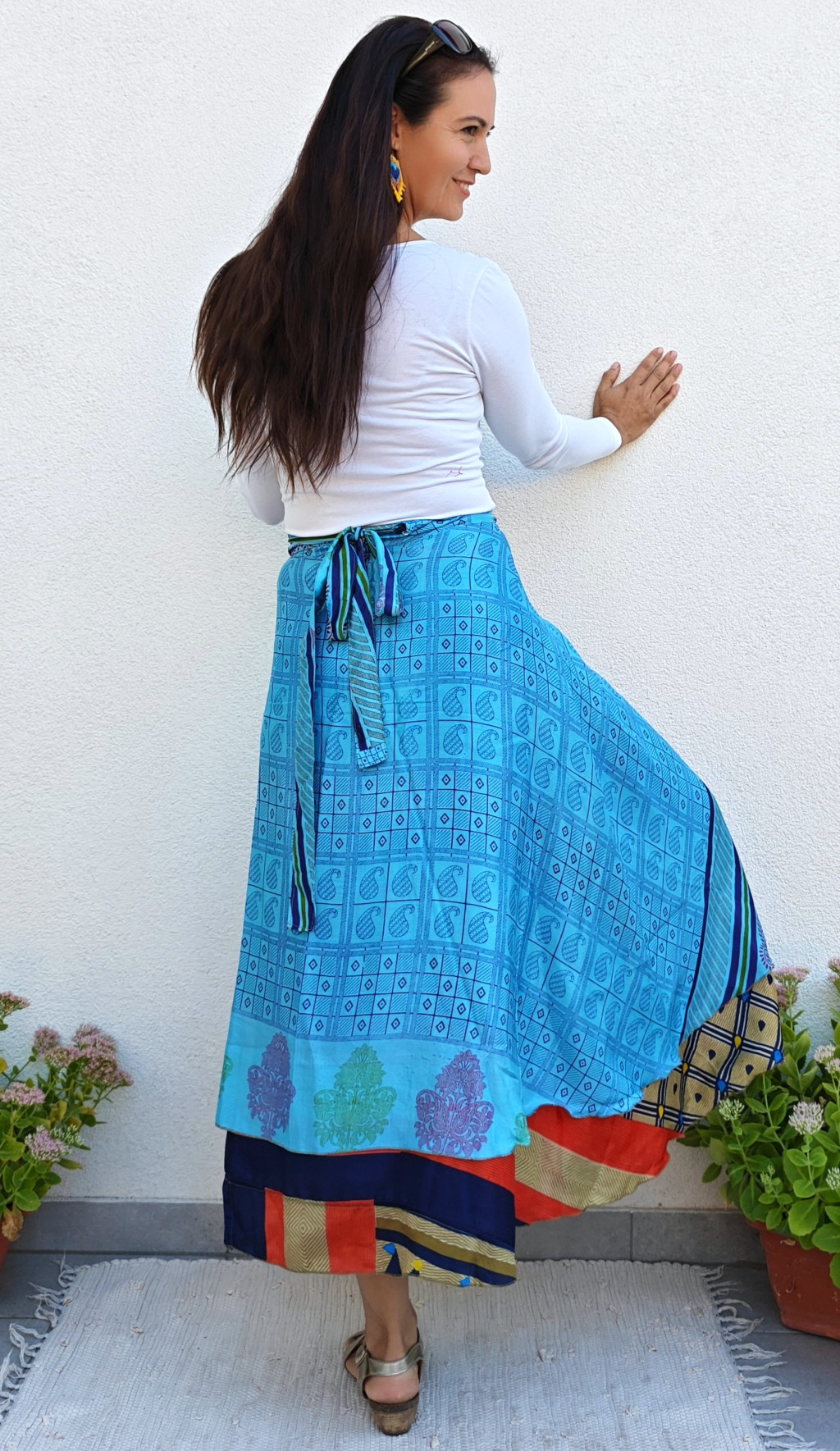 Lapszoknyáink újrahasznosított szárikból készülnek Indiában, egy hosszabb és egy rövidebb anyag derékban összevarrva! Két oldalú, kifordítható, mindkét oldala hordható, sokféleképpen köthető, variálható. Szoknyáinkból nincs két egyforma, mindegyikből csak EGY darab van, ha megtetszik, csapj le rá!