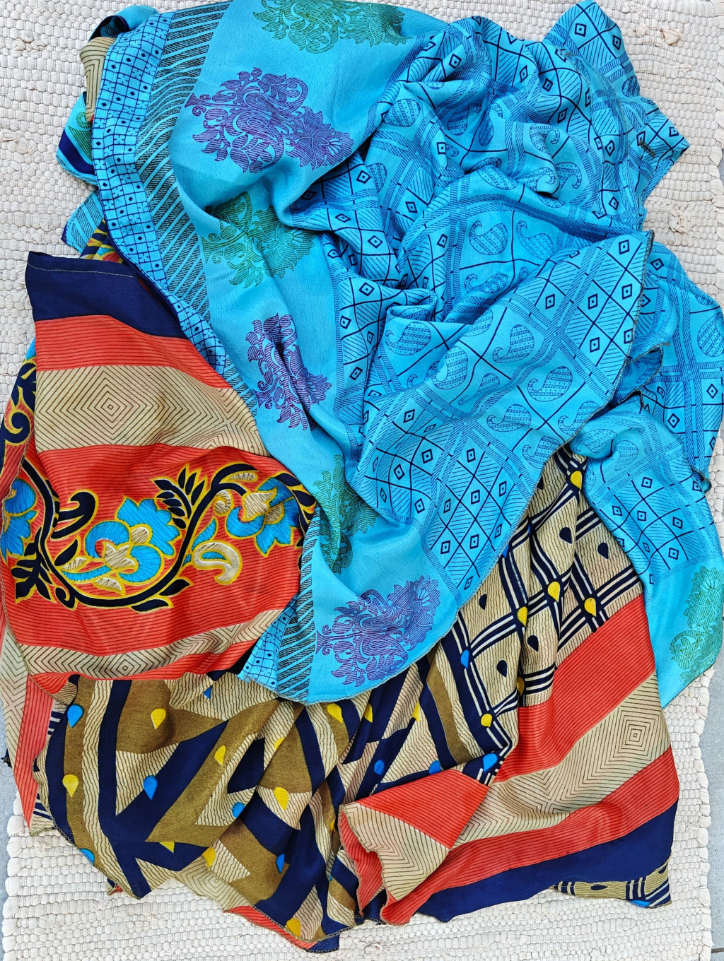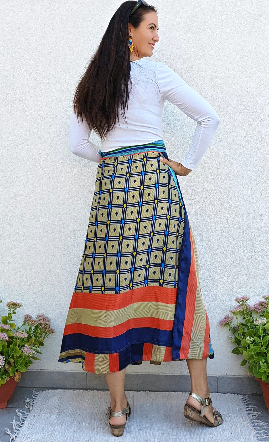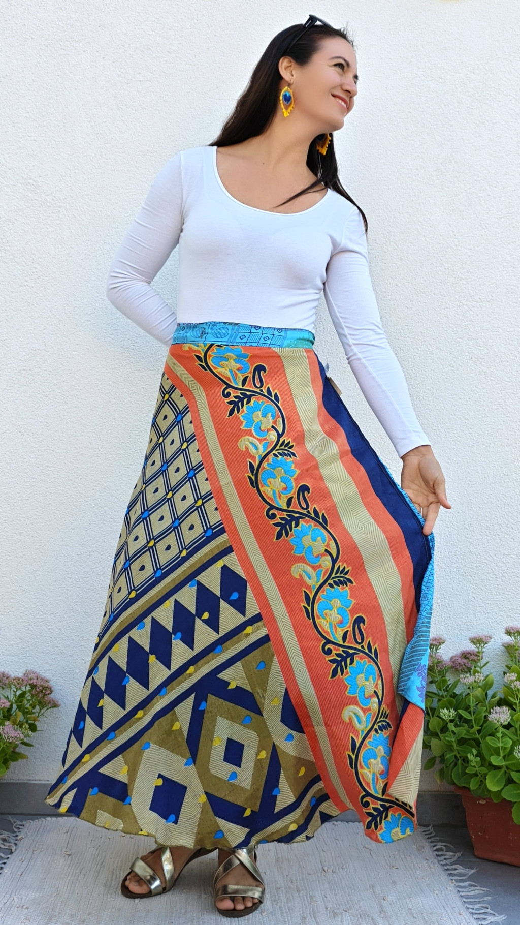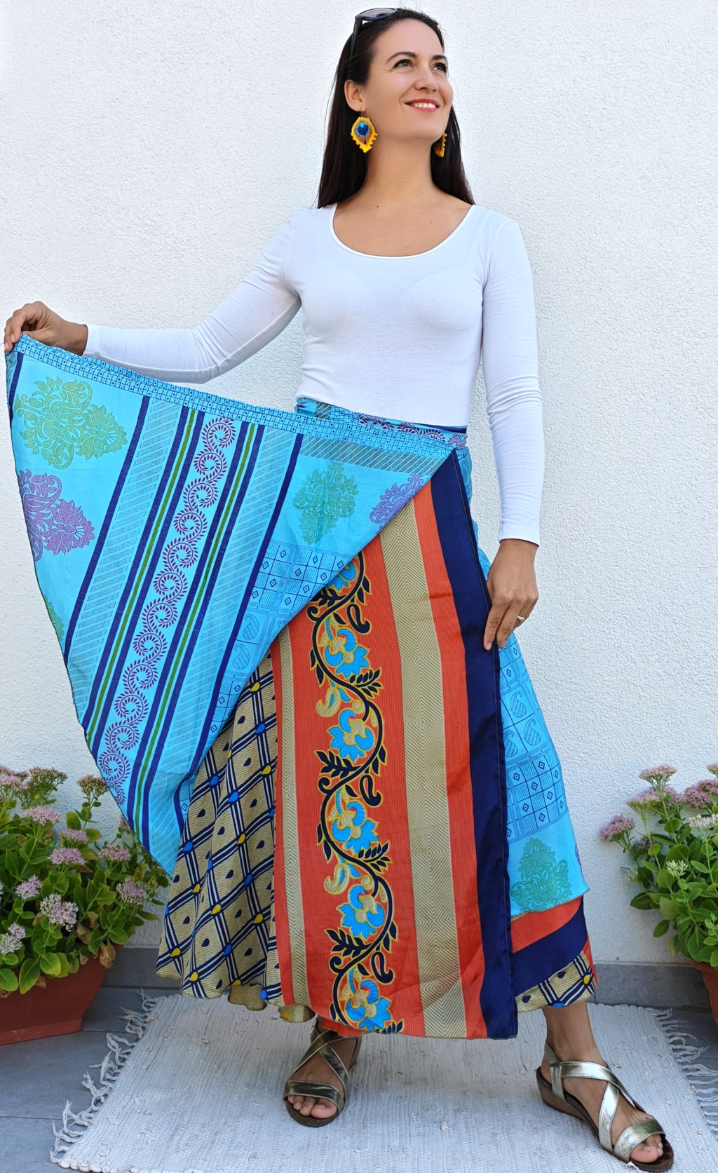 Lapszoknyáink újrahasznosított szárikból készülnek Indiában, egy hosszabb és egy rövidebb anyag derékban összevarrva! Két oldalú, kifordítható, mindkét oldala hordható, sokféleképpen köthető, variálható. Szoknyáinkból nincs két egyforma, mindegyikből csak EGY darab van, ha megtetszik, csapj le rá!